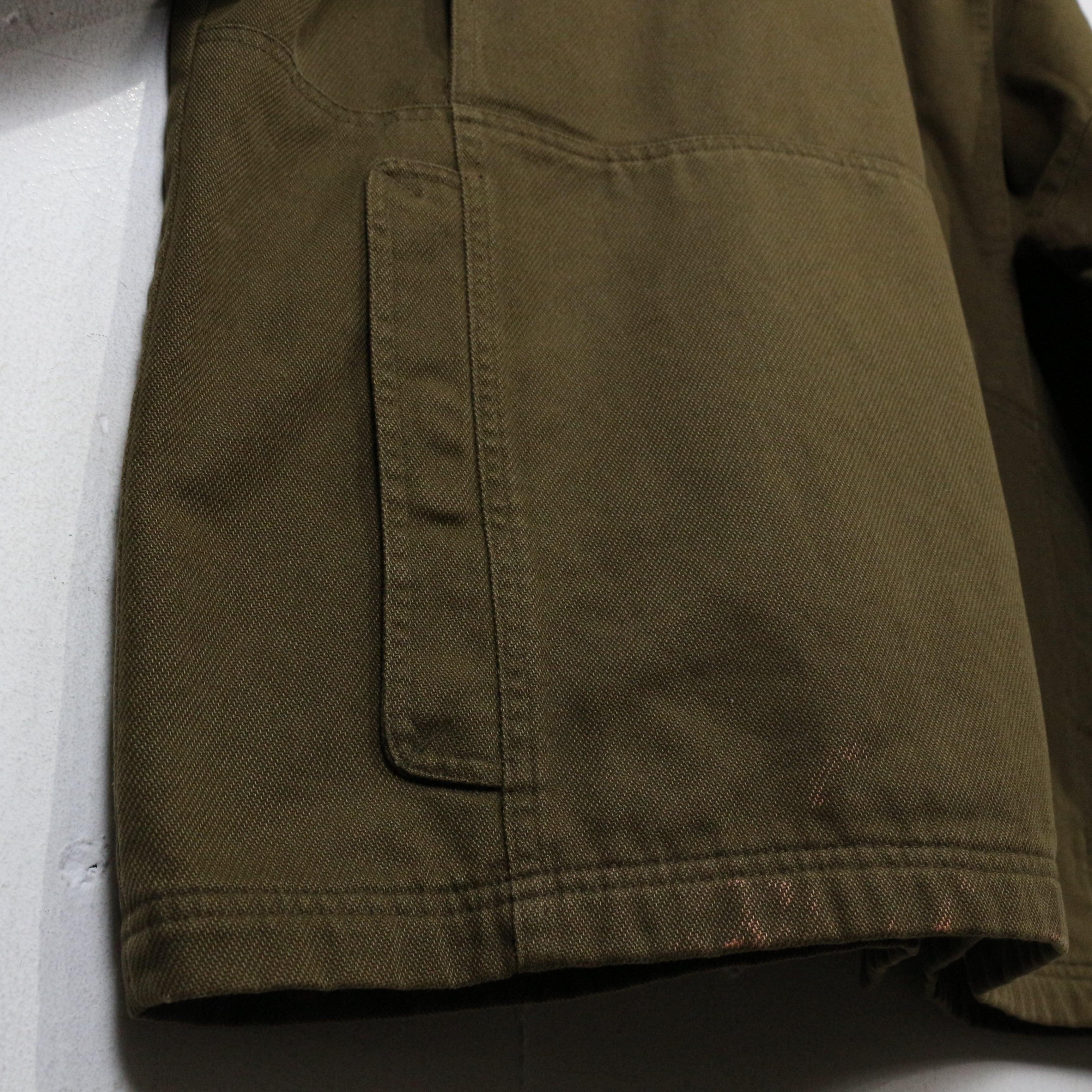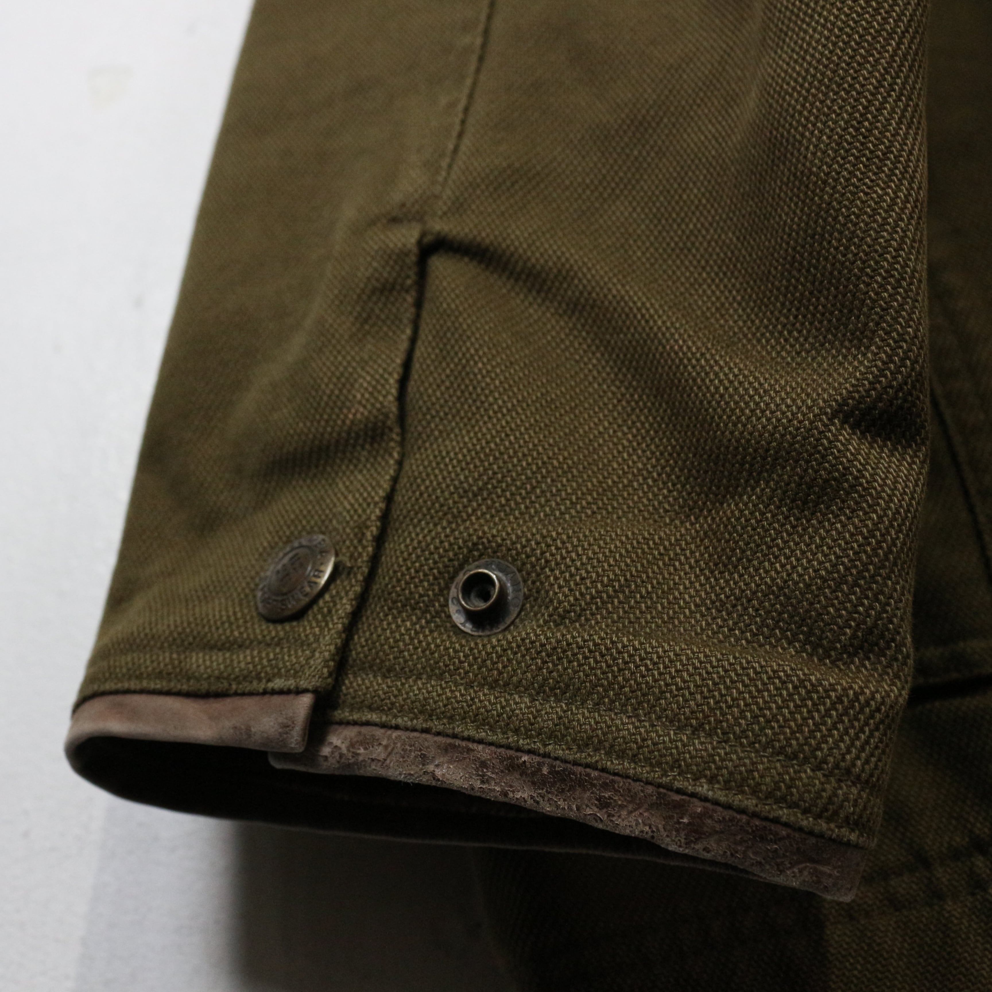 オリーブブラウンの無骨なボディに、襟、ポケット、袖縁へレザーを切り替えた1着。タフなコットン地とレザーのコンビネーションが、アウトドア由来の機能美とクラシカルな雰囲気を両立し、ブランドらしい実用性の高さを感じさせる仕上がりとなっています。