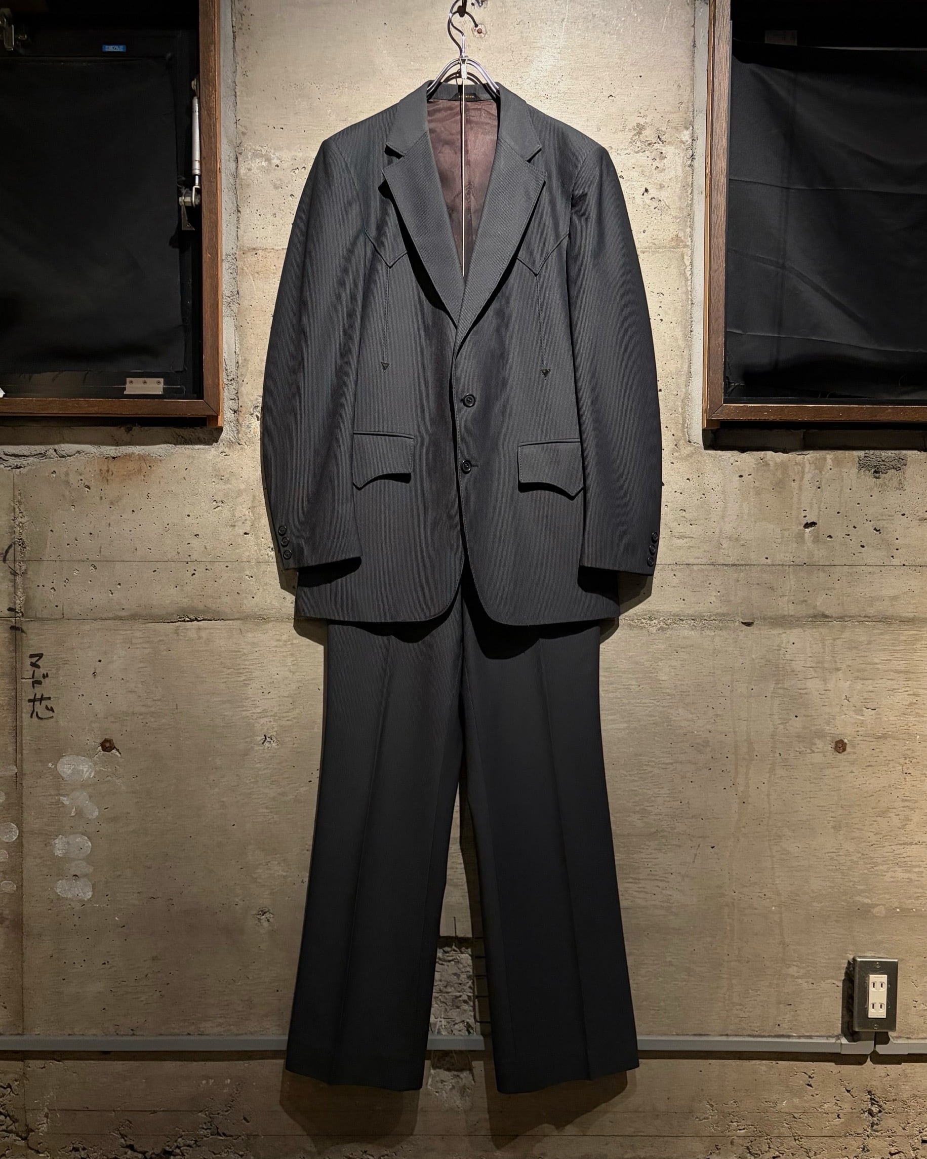 落ち着きのあるダークグレーのストライプで仕立てた、稀有なウエスタン仕様の1着。