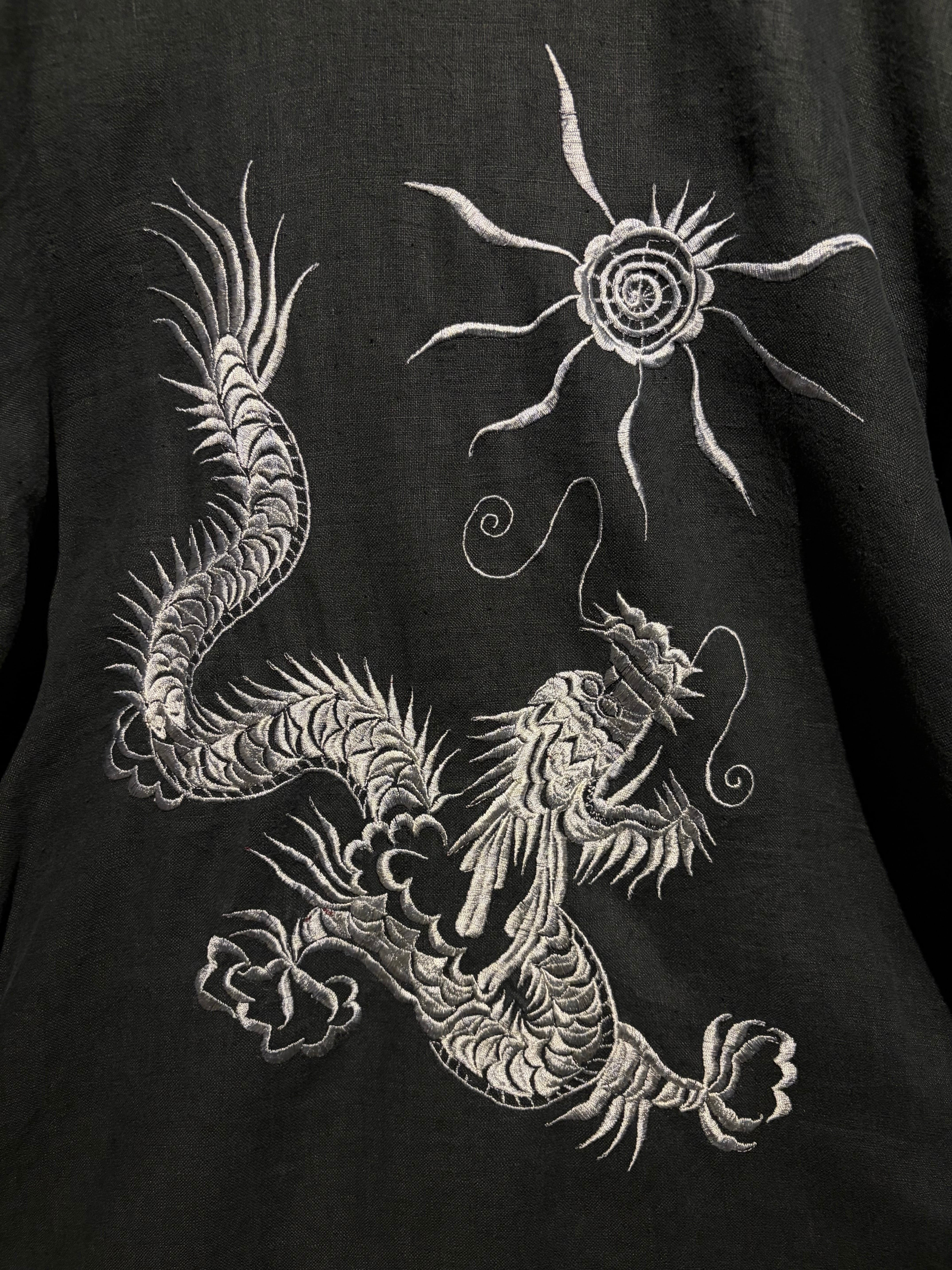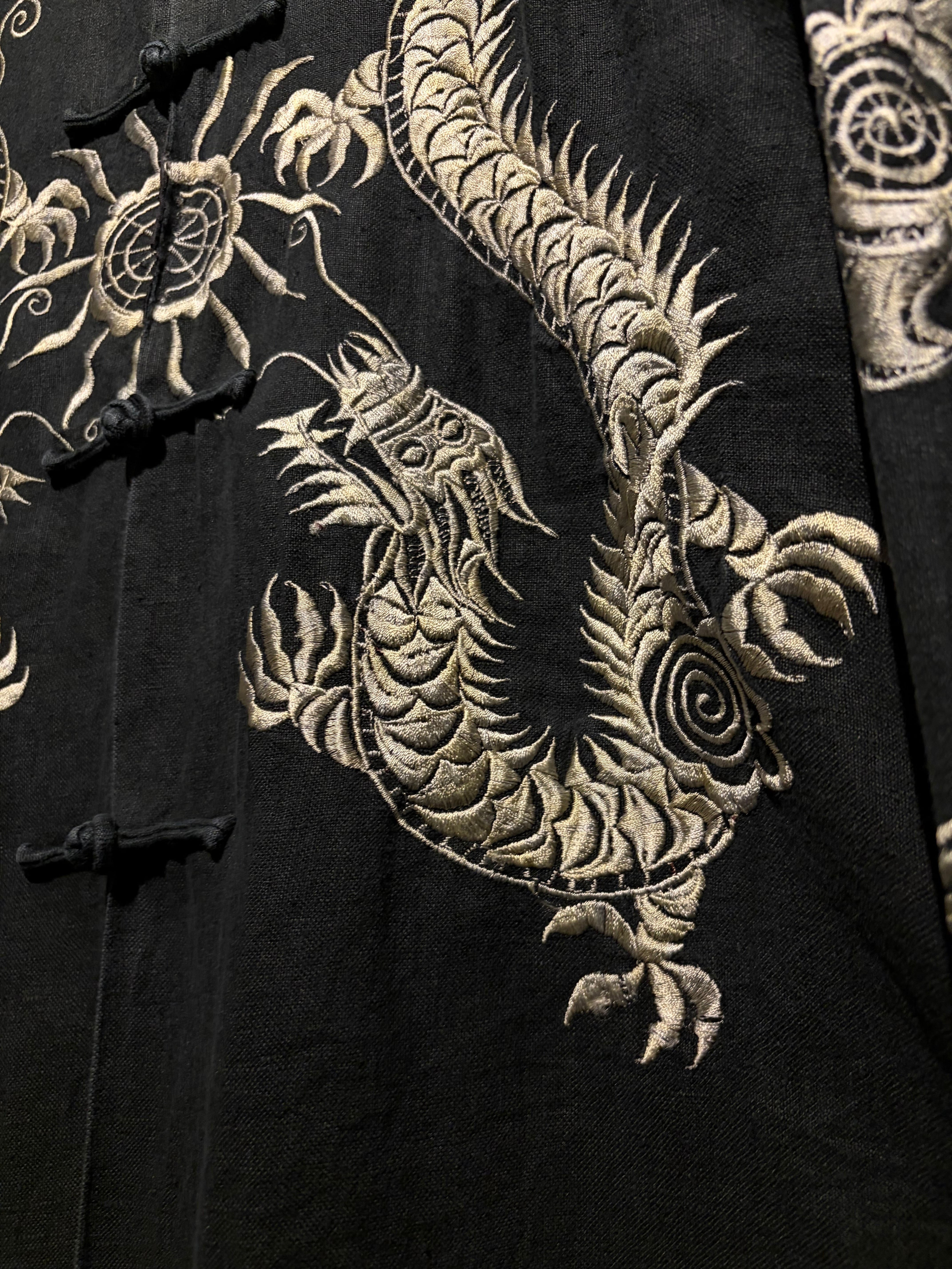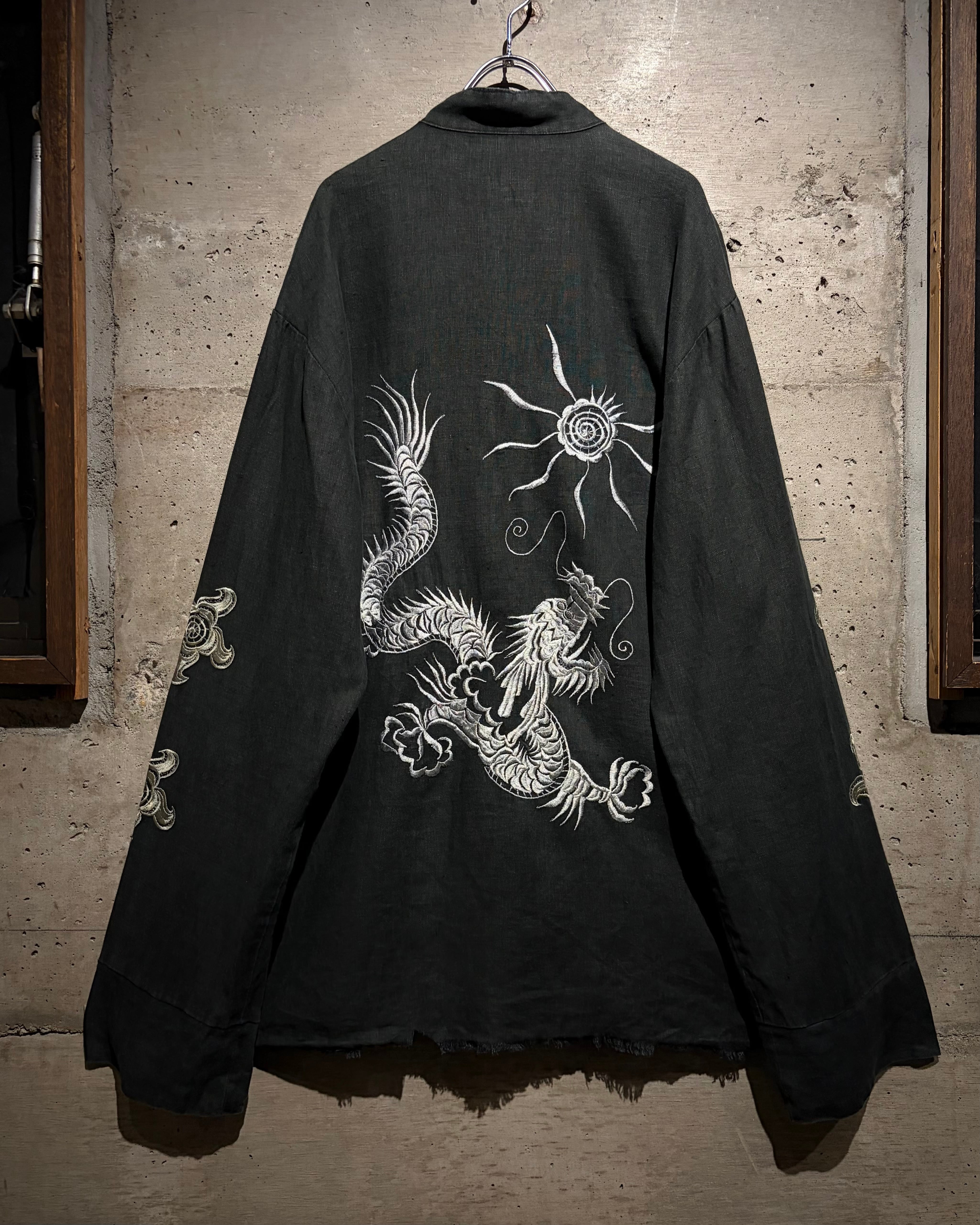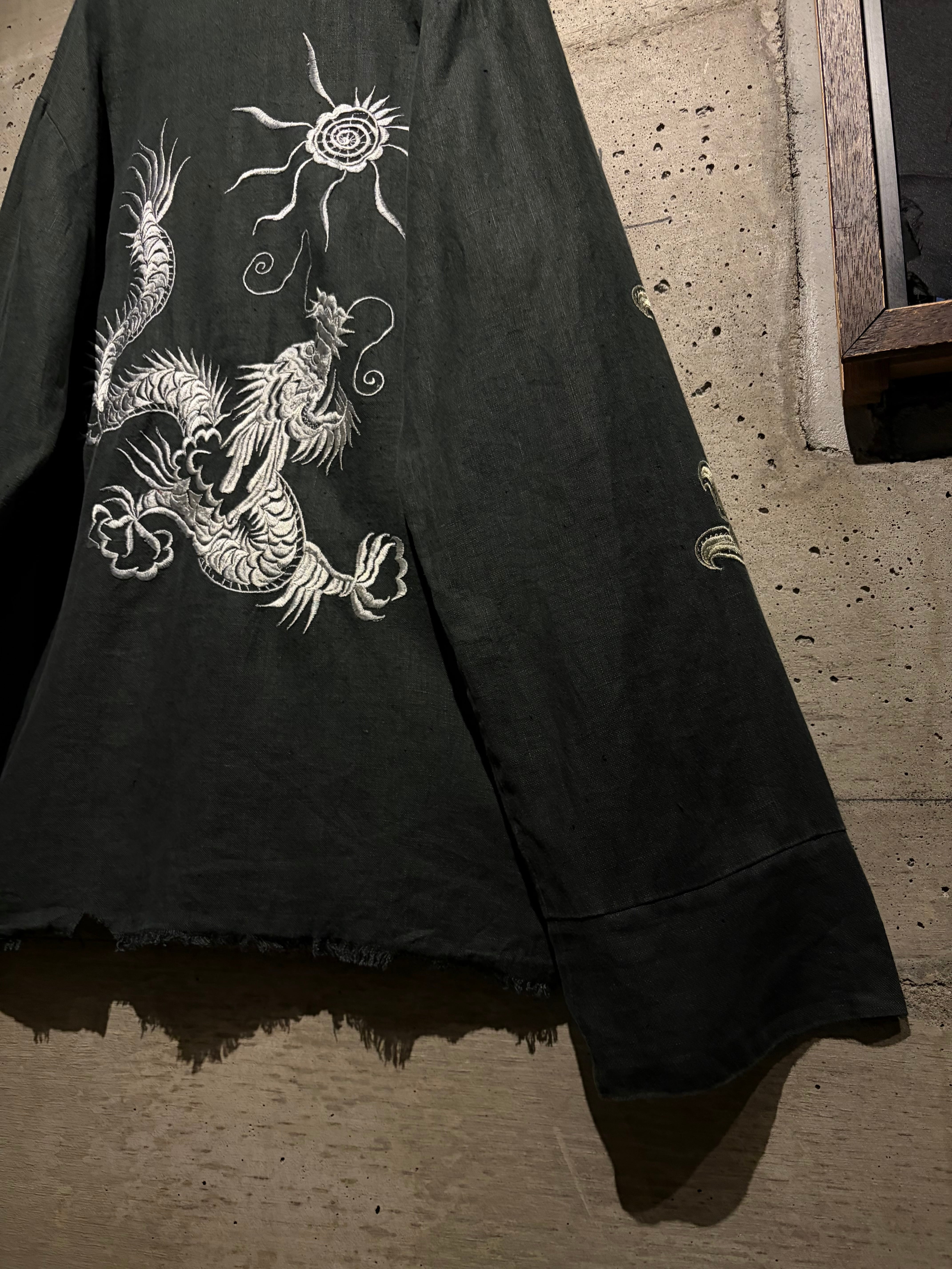 フェードが効いたブラックのリネンボディに、前後に緻密な龍の刺繍を刻んだ1着。