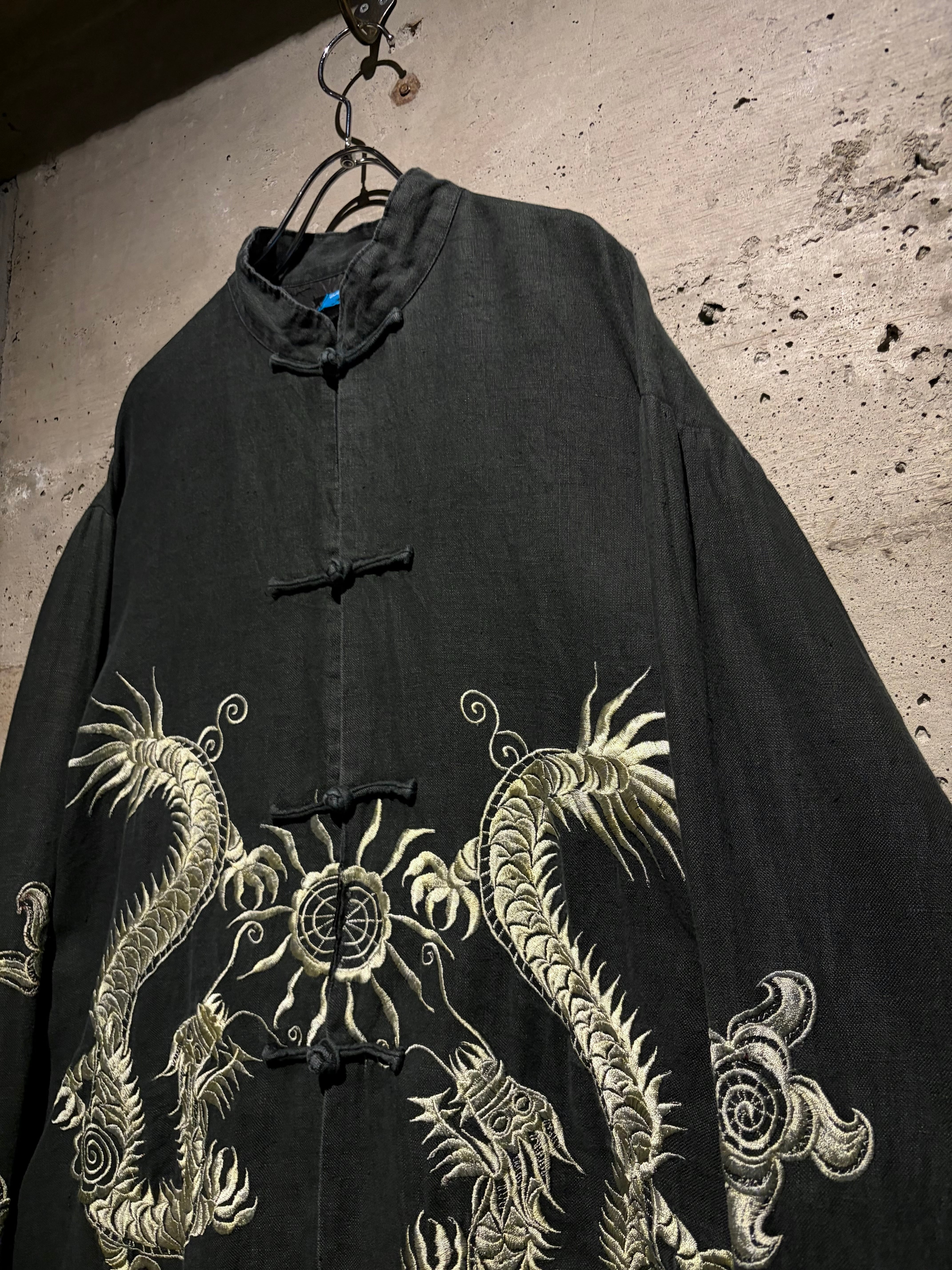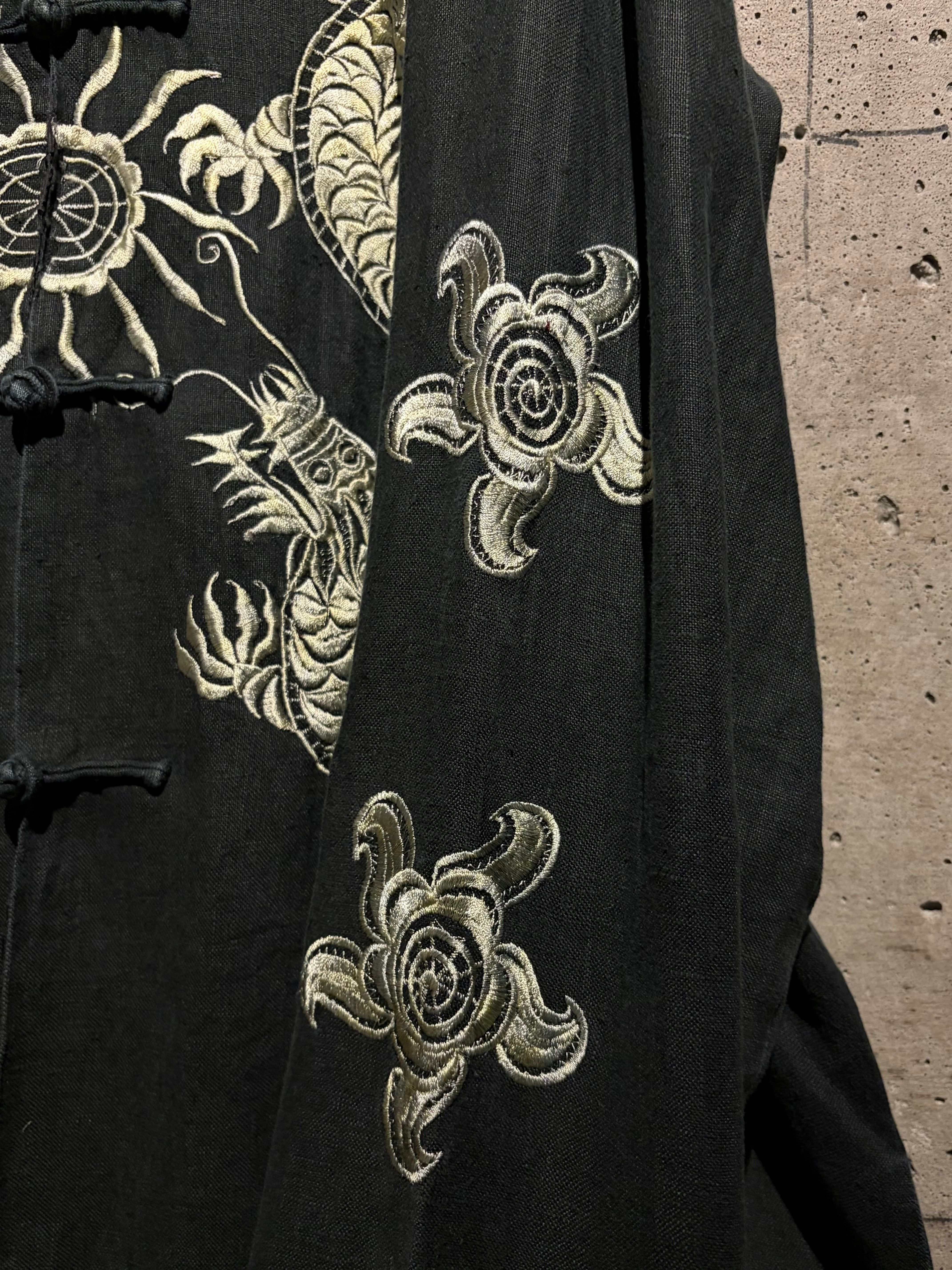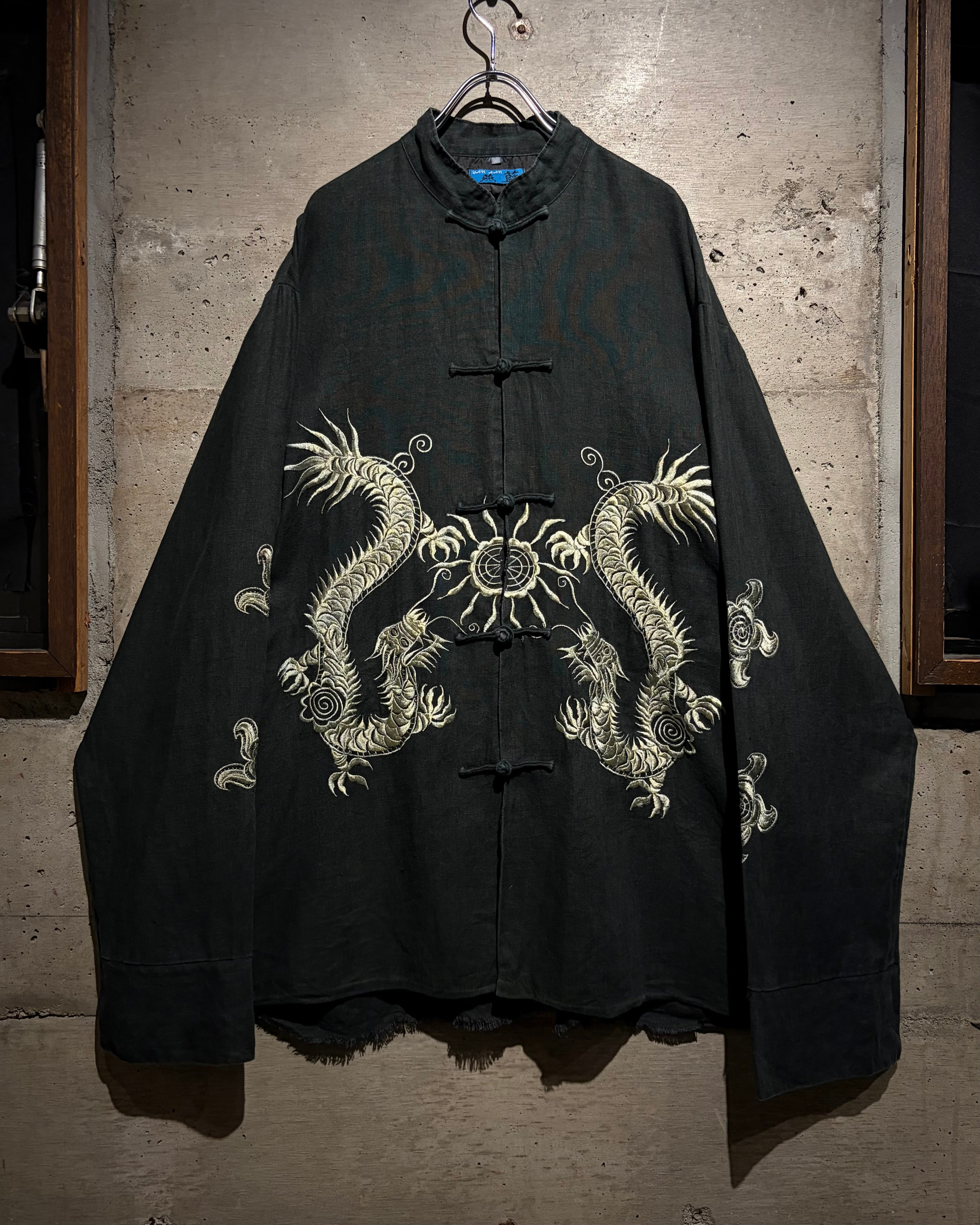 フェードが効いたブラックのリネンボディに、前後に緻密な龍の刺繍を刻んだ1着。