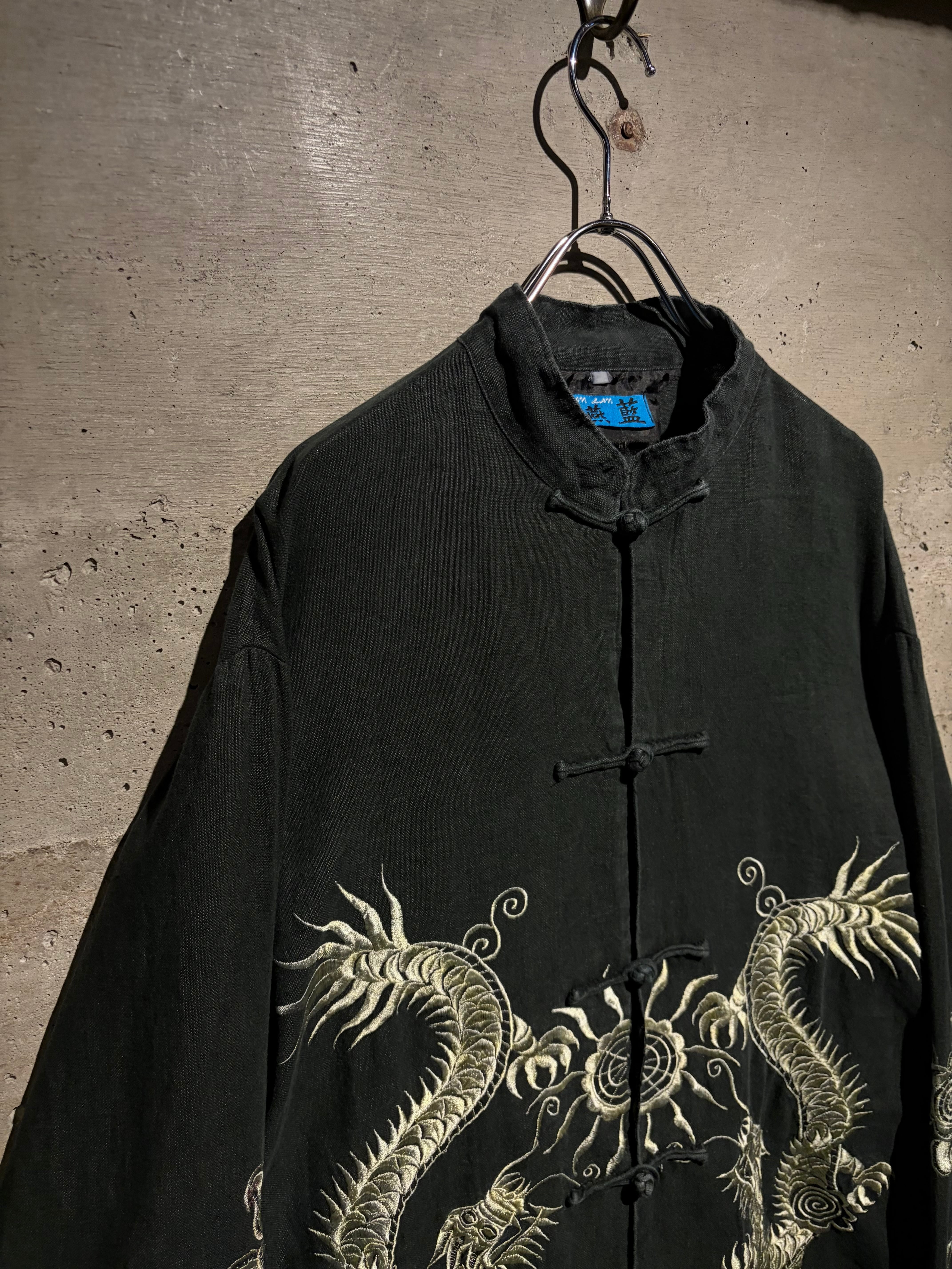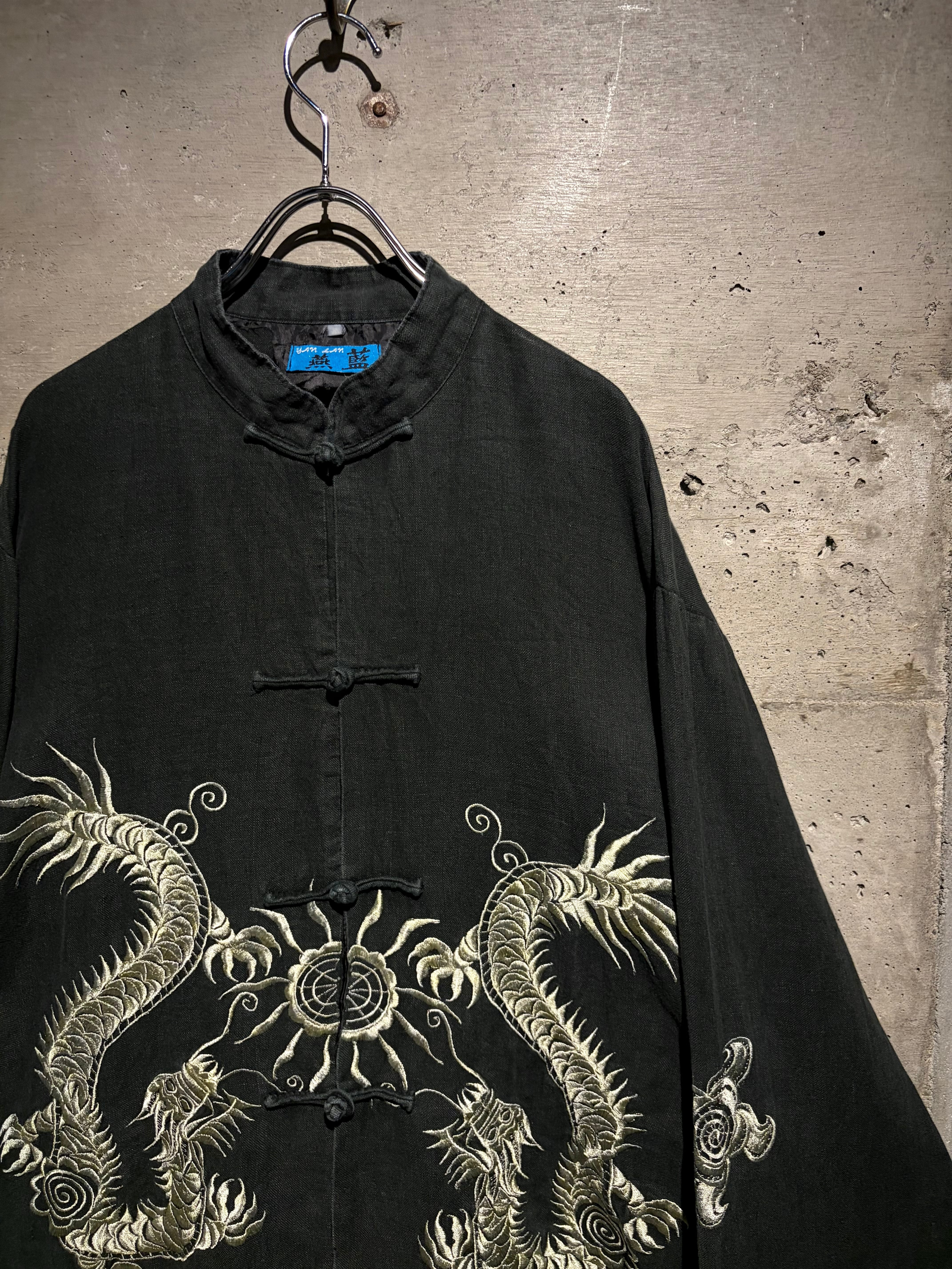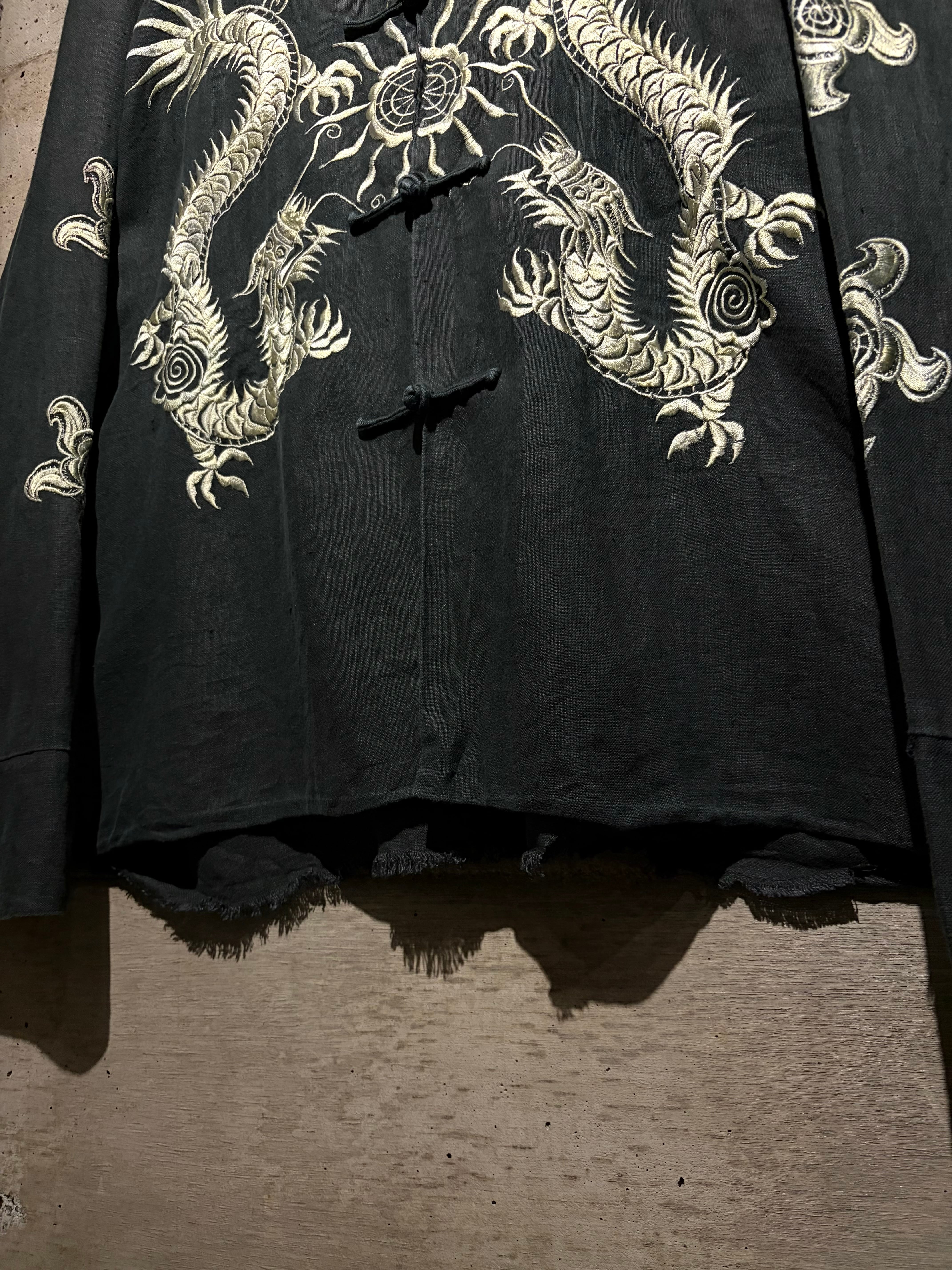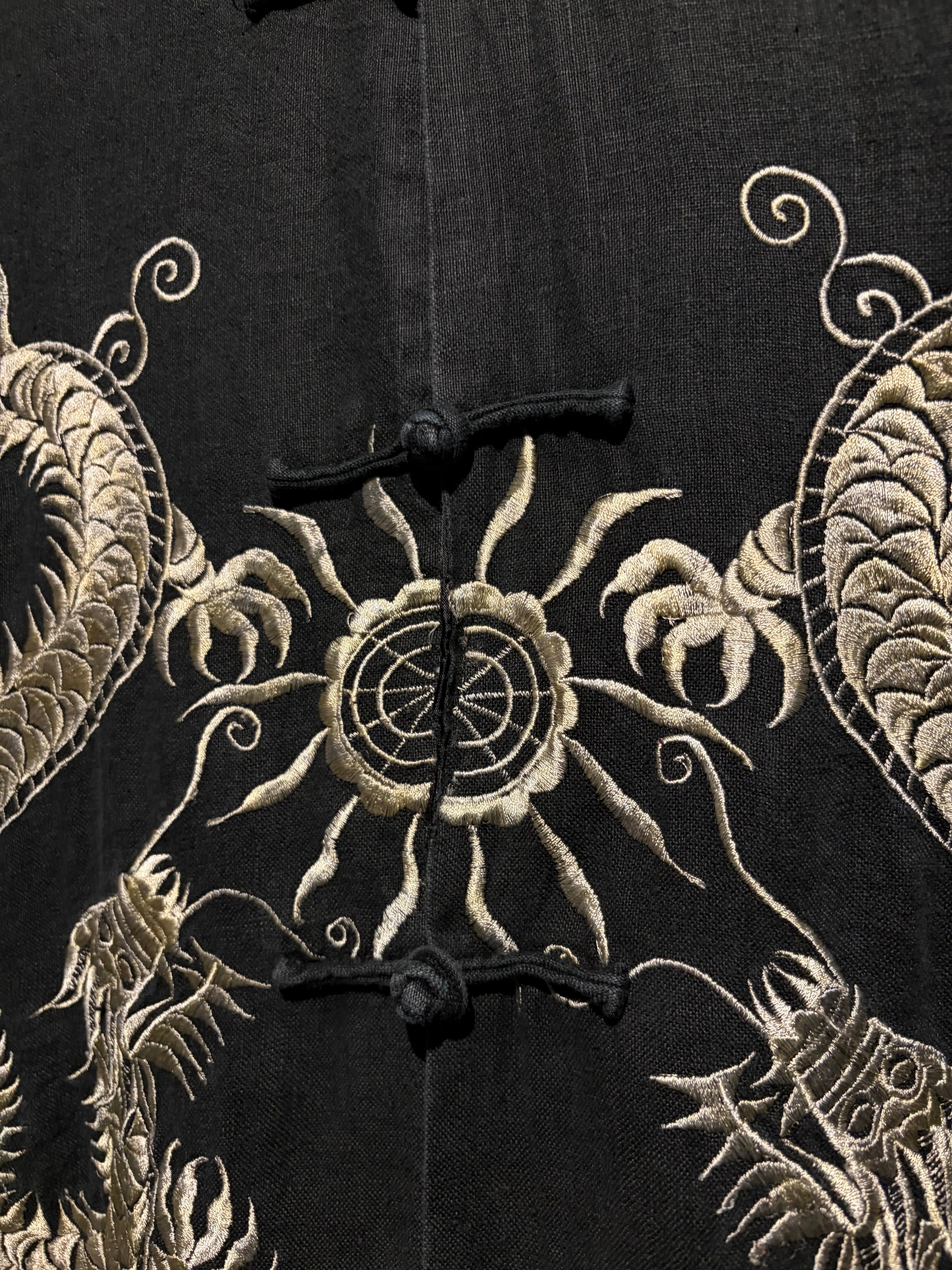 フェードが効いたブラックのリネンボディに、前後に緻密な龍の刺繍を刻んだ1着。