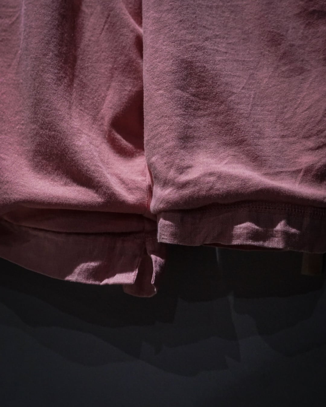 裏地にはコットン素材を使用したカットソー地とのダブルフェイスライクな二層構造で、肌あたりも良く着心地は非常に快適。リネンの通気性に加え、程よい安心感のある着用感に。