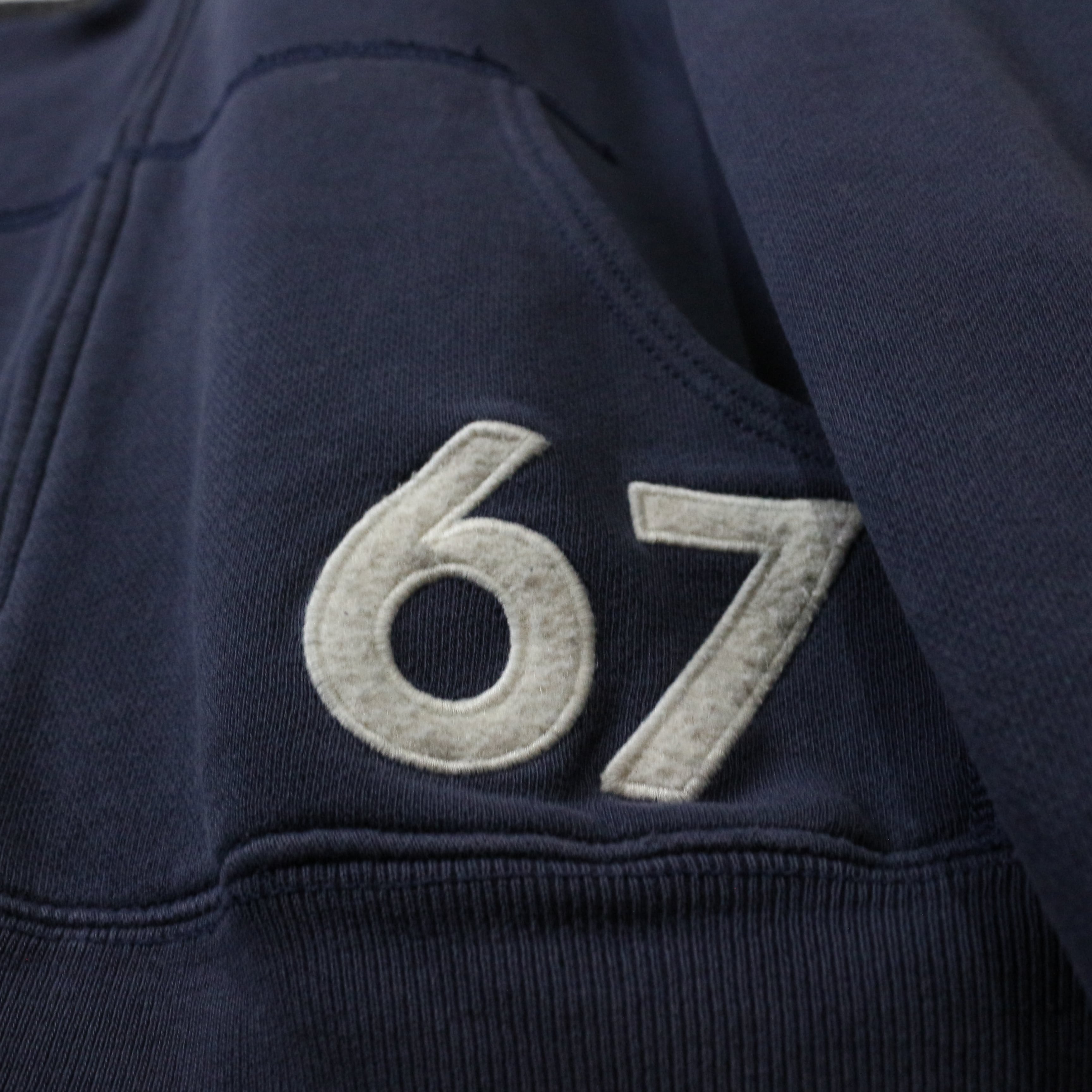 右袖には“POLO JEANS CO. R.L.”のロゴプリント、フロント裾には“67”のフェルトパッチを落とし込み、ブランドのバックボーンやヘリテージを感じさせるディテールも魅力。フーディ特有のカジュアルなアイテムでありながら、随所に計算されたデザインワークが光ります。