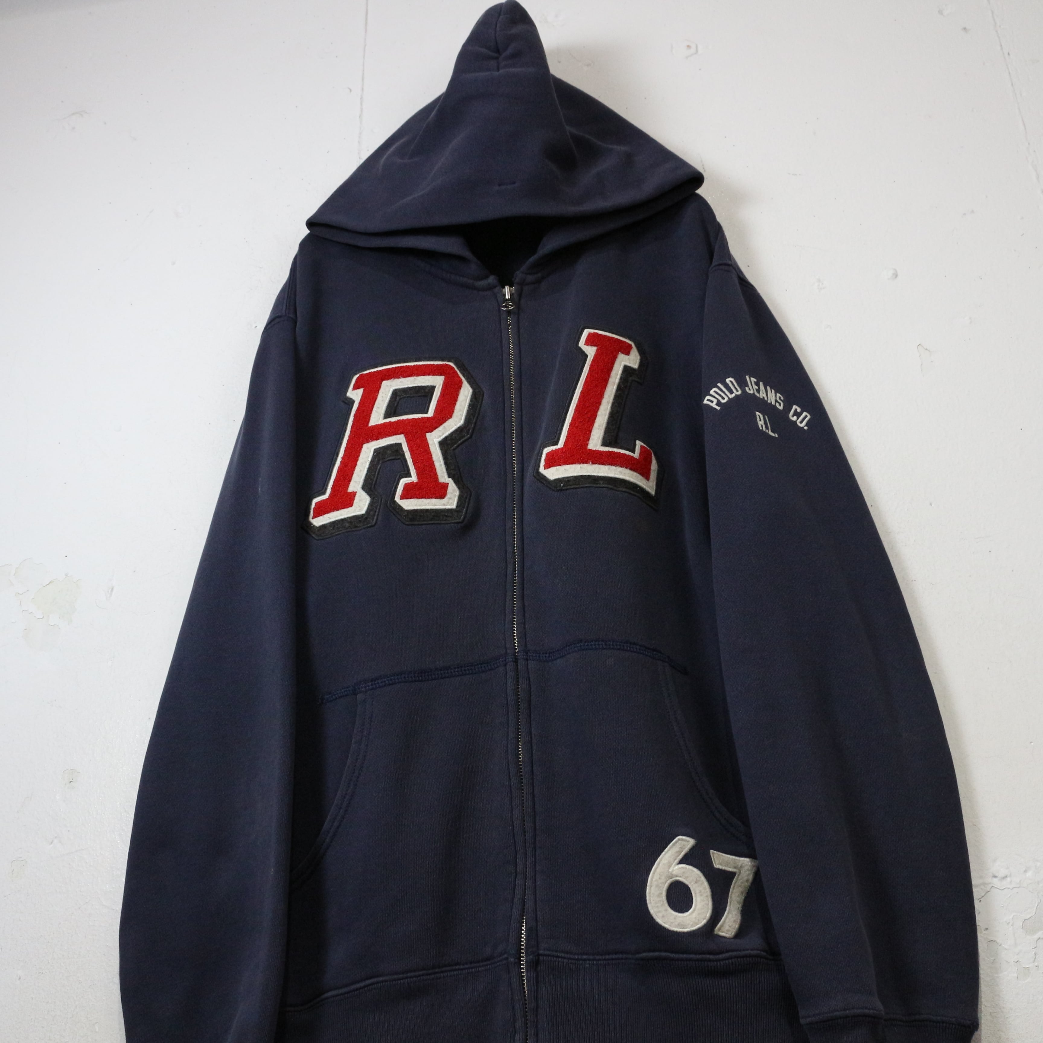 落ち着いたネイビーボディをベースに、フロントへ大胆に配された“R”“L”のブランド頭文字のワッペンが抜群の存在感を放つ1着。