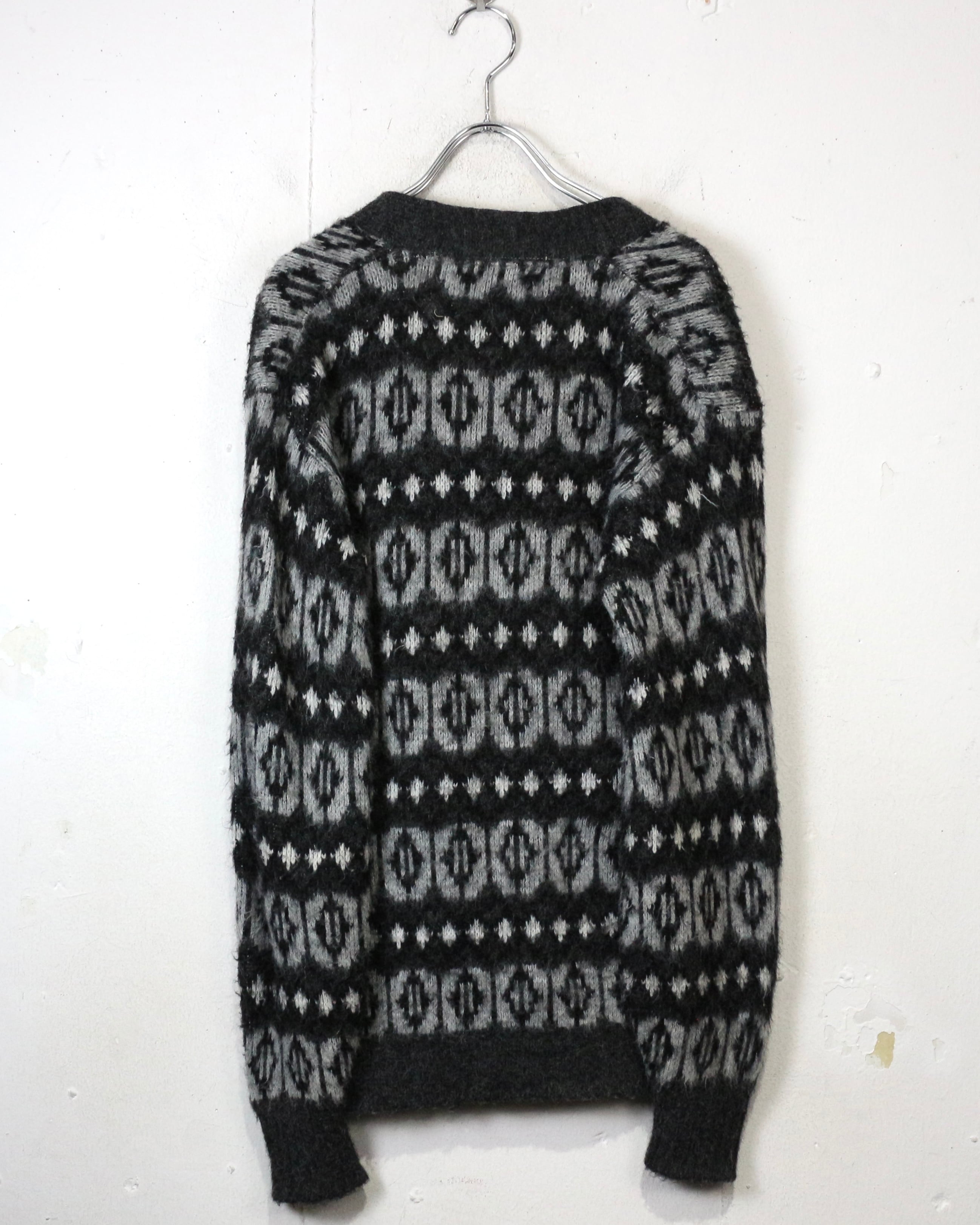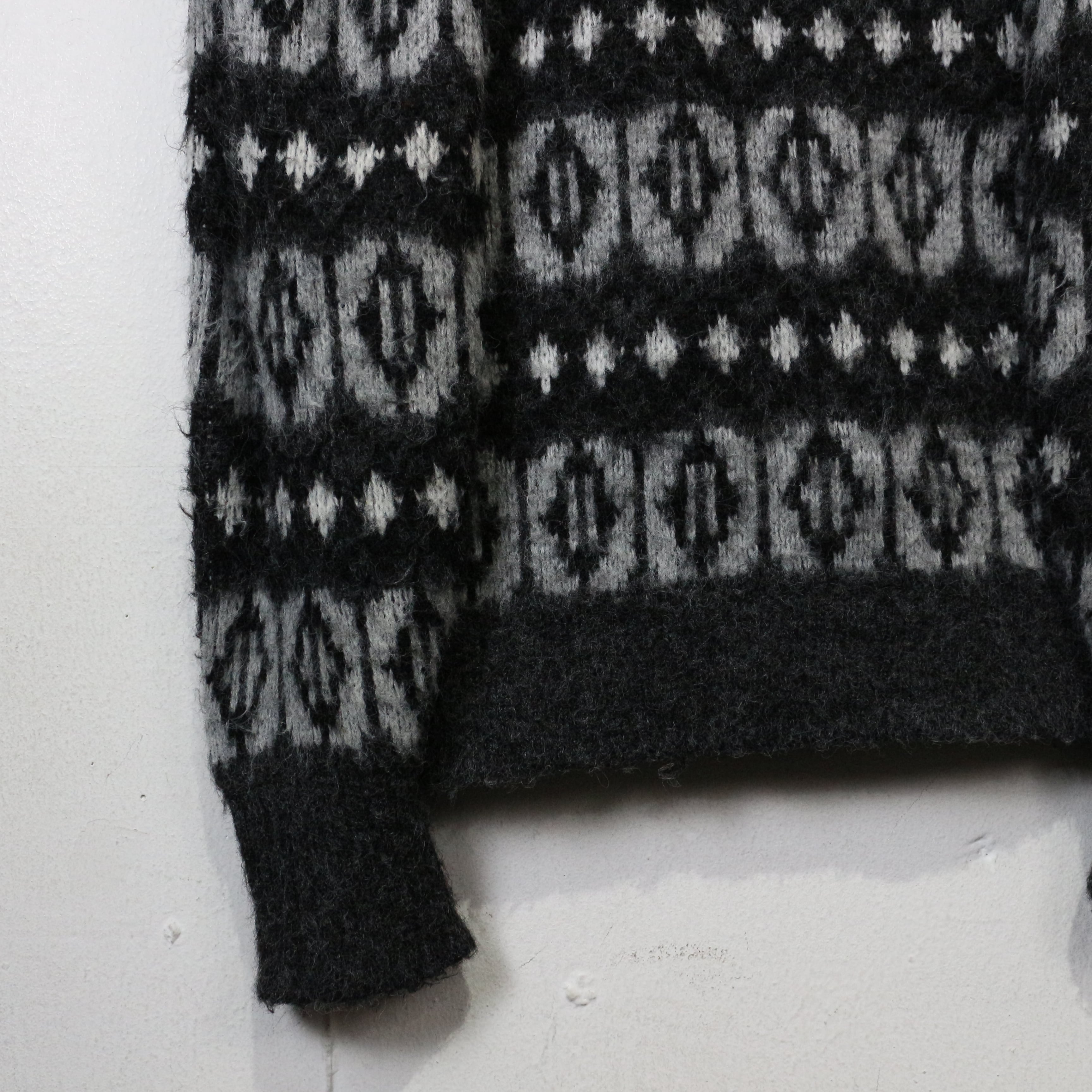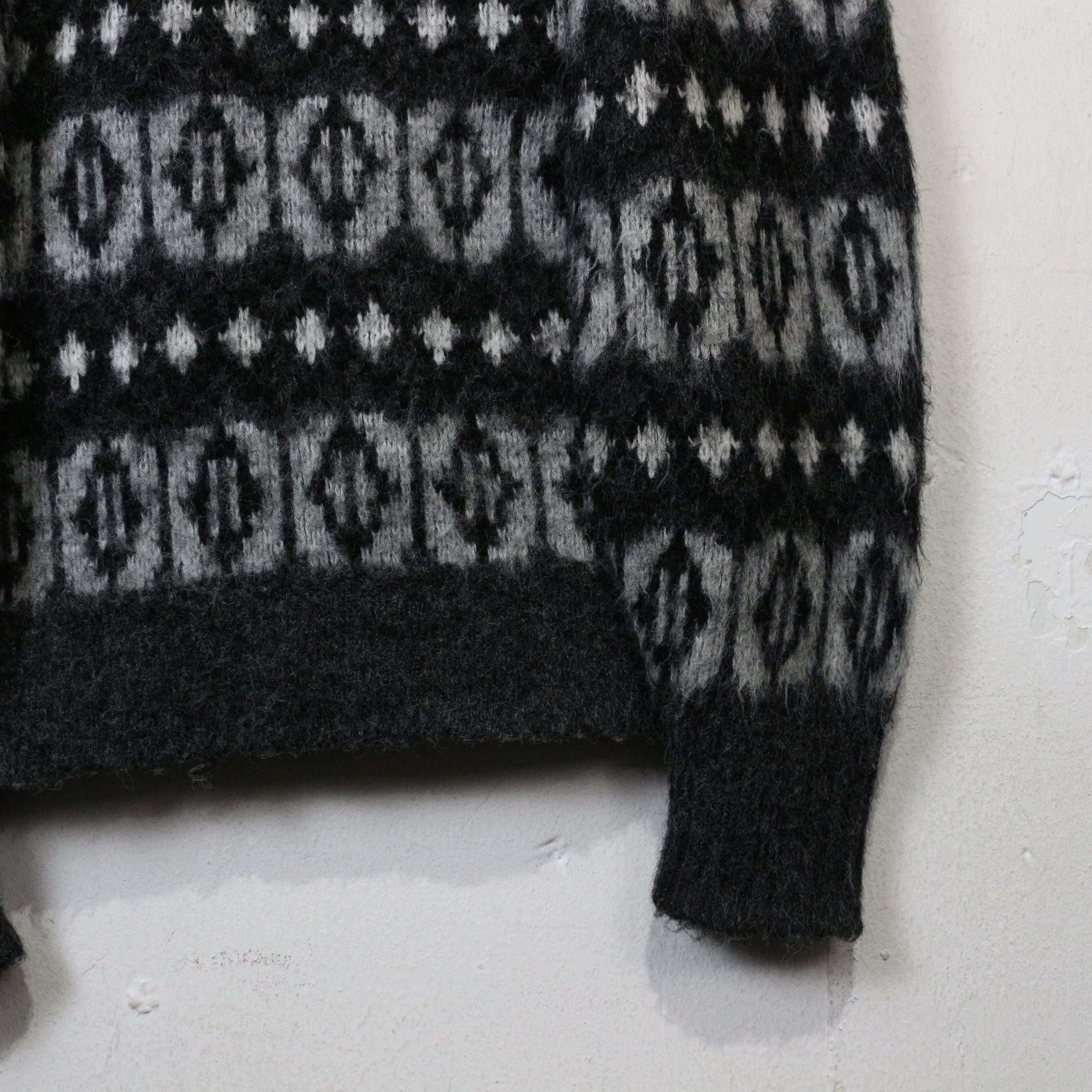 ブラック×グレーをベースに、細かなモチーフと幾何学的なノルディックパターンを全面に落とし込んだ1着。