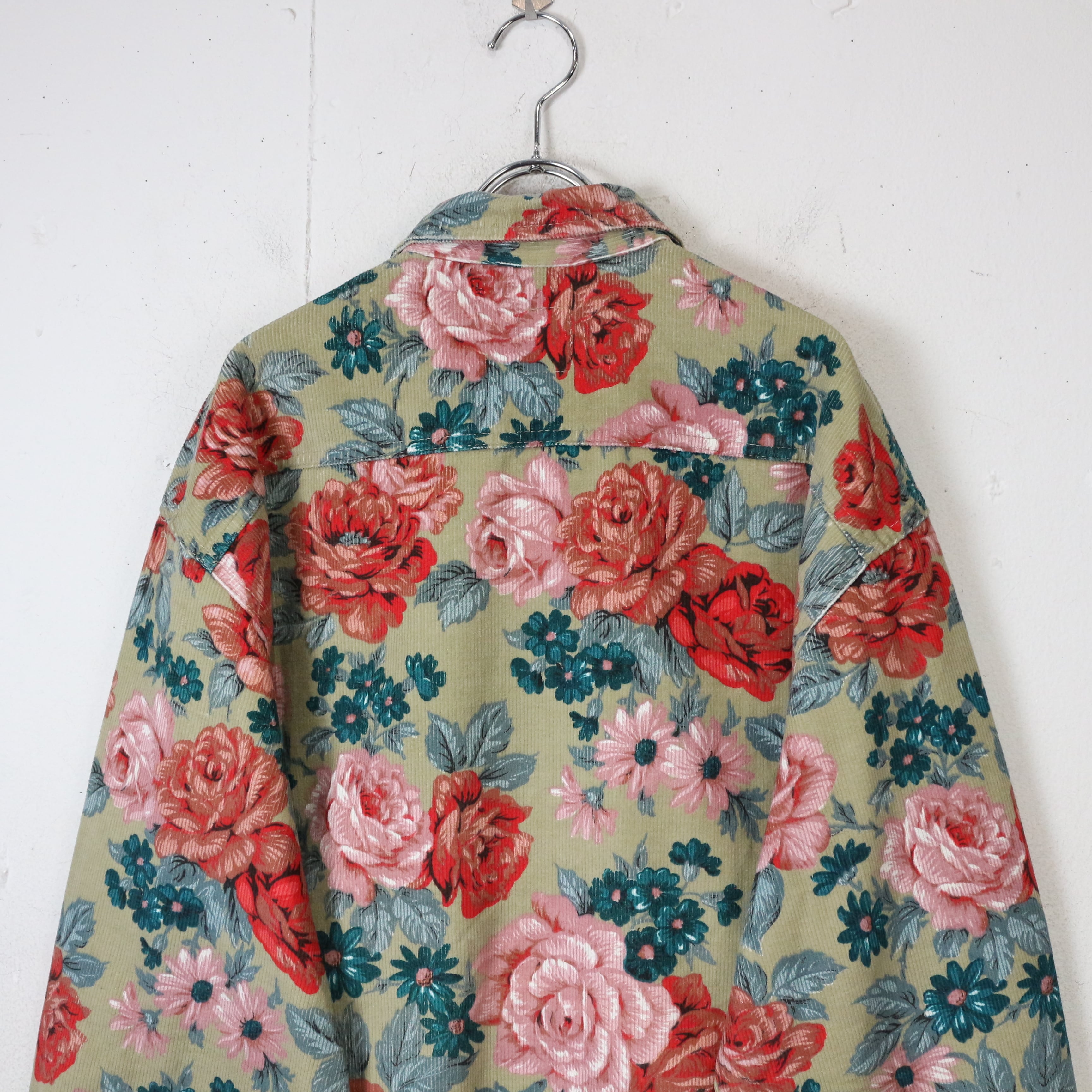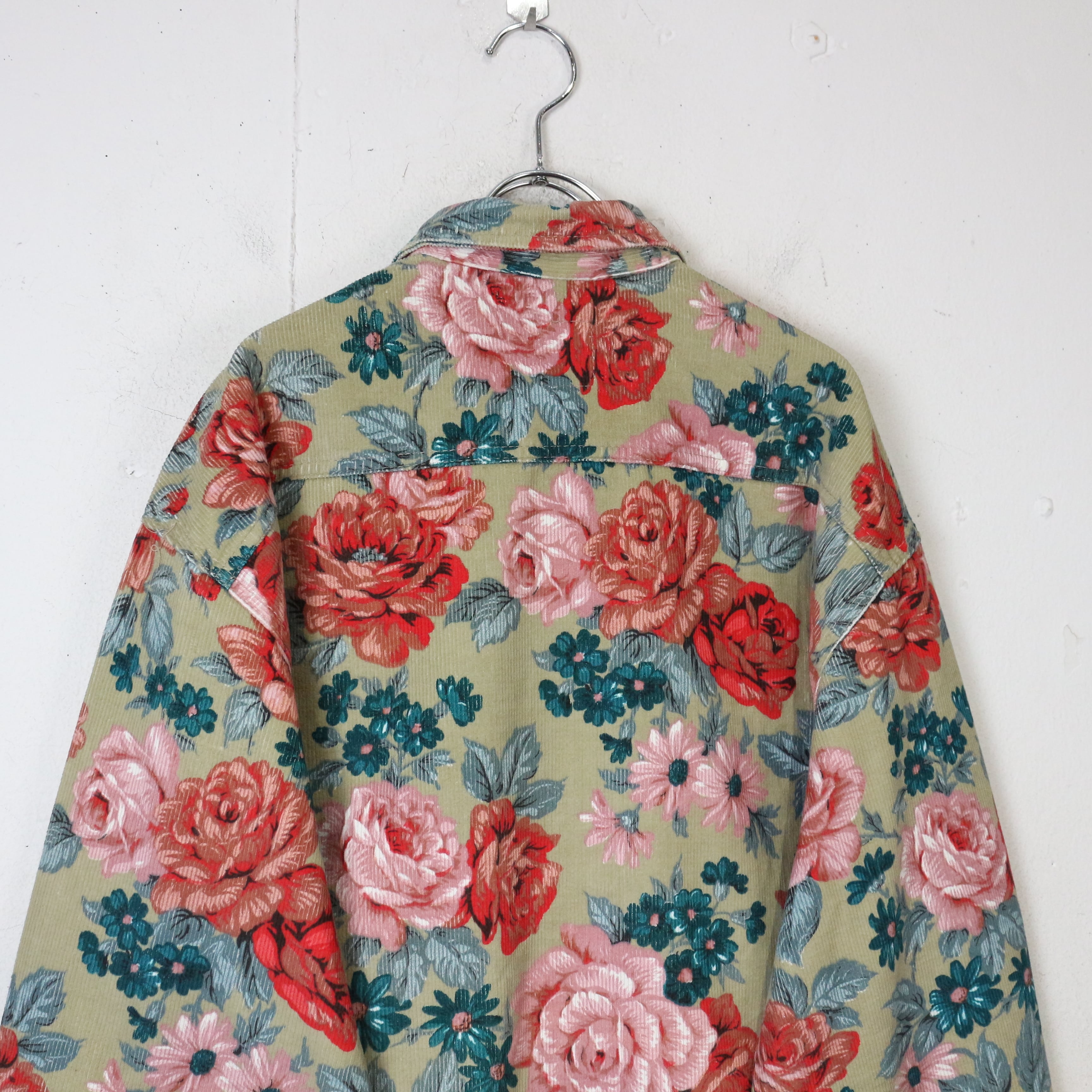 やや畝感の浅い細畝コーデュロイをベースに、全面に走る薔薇柄が目を惹く1着。