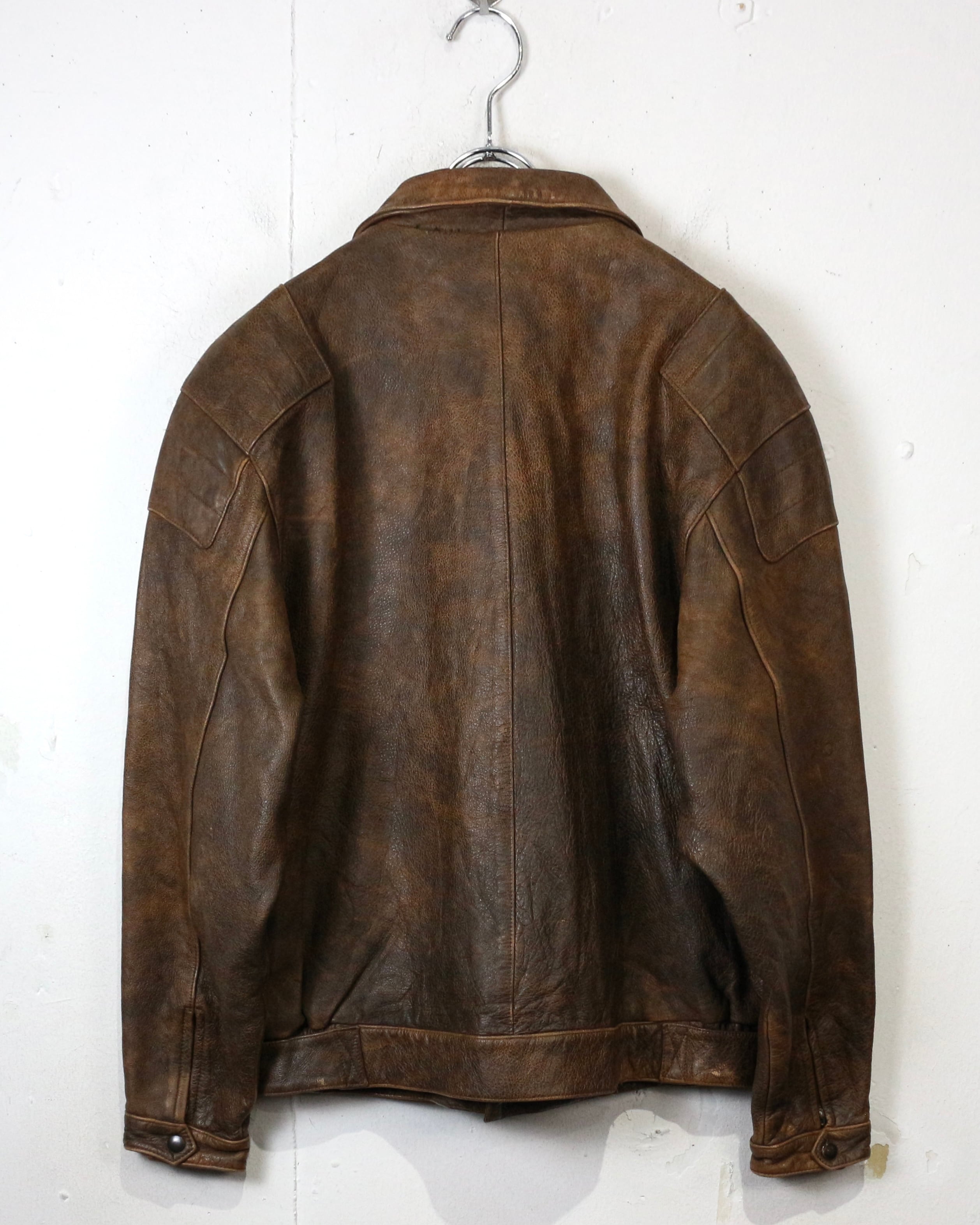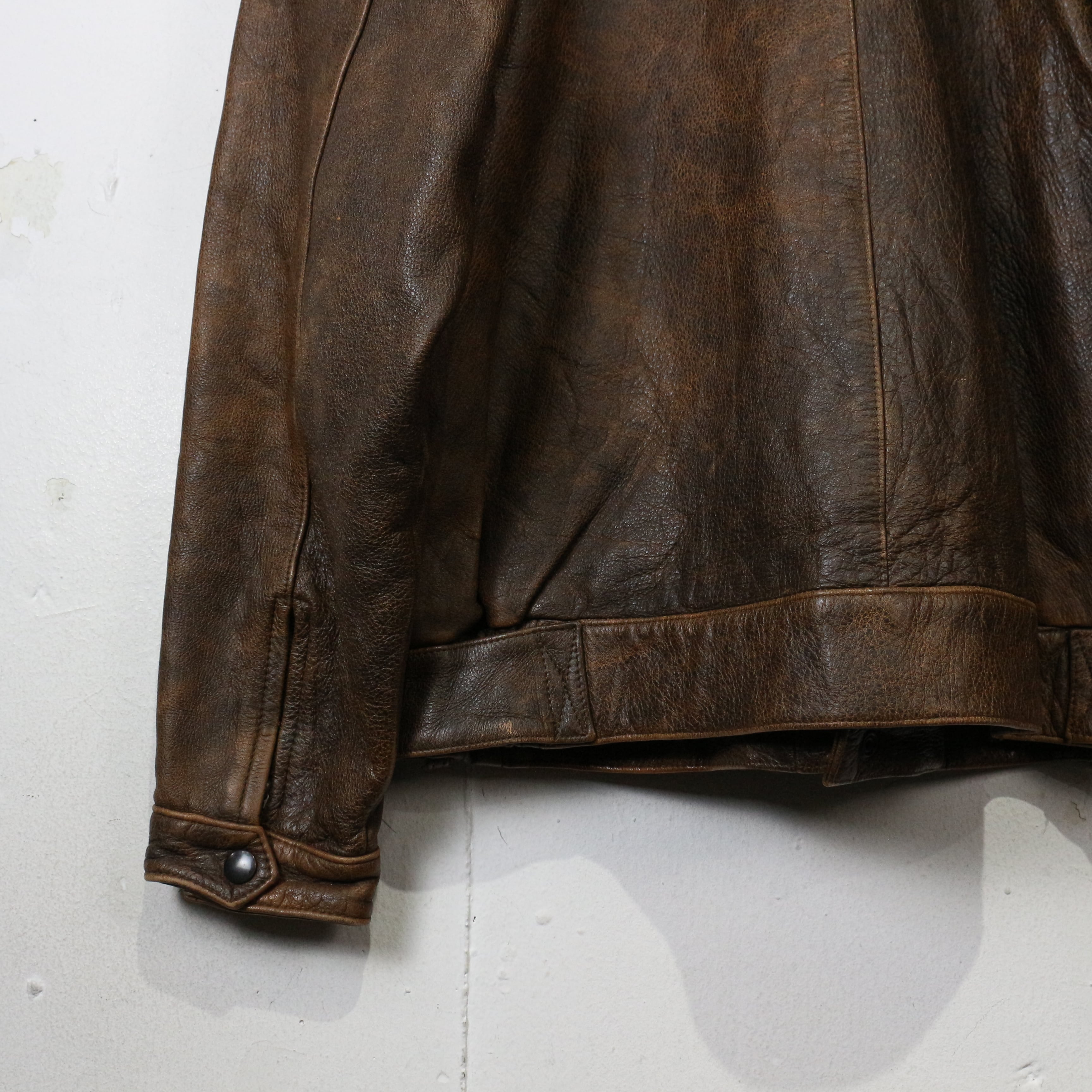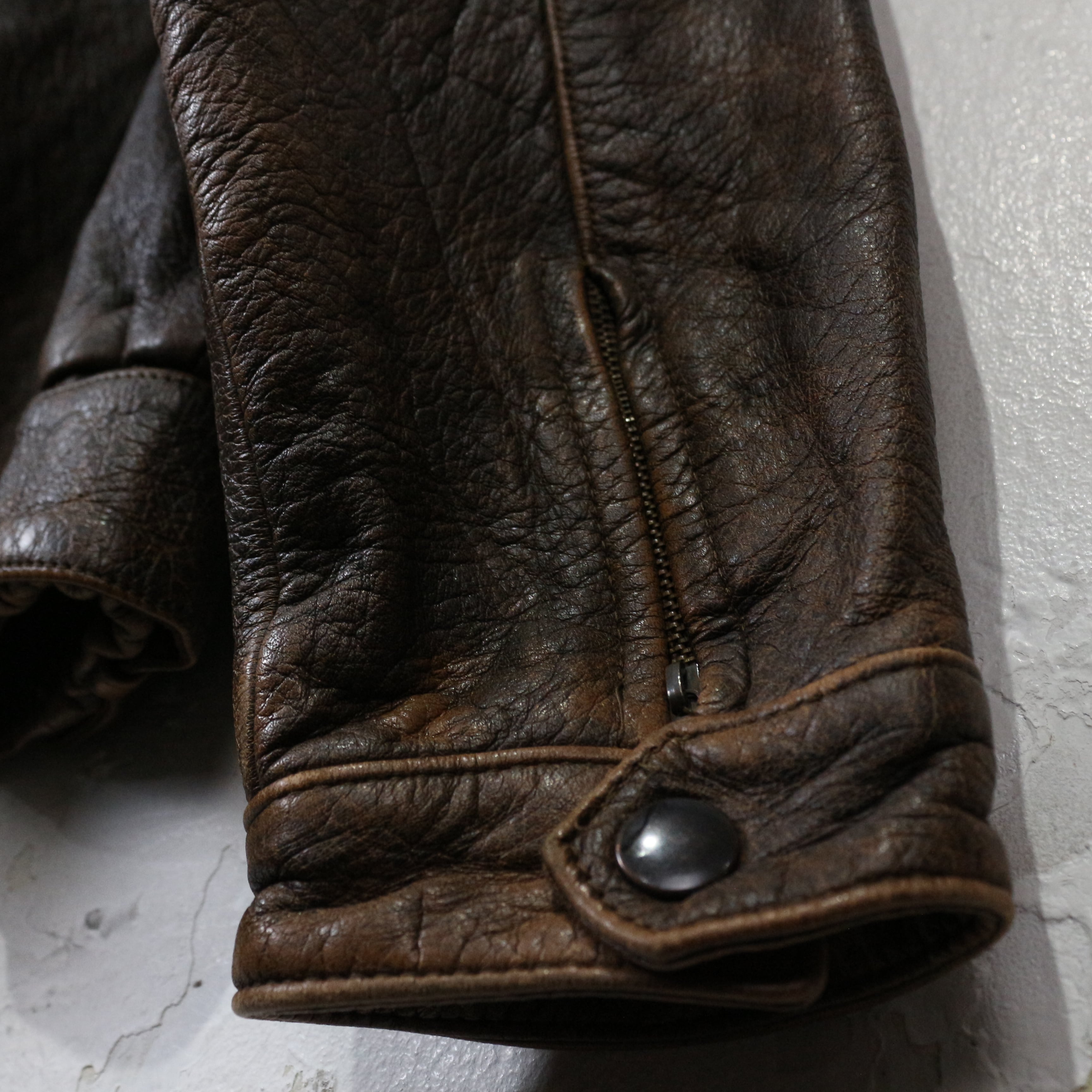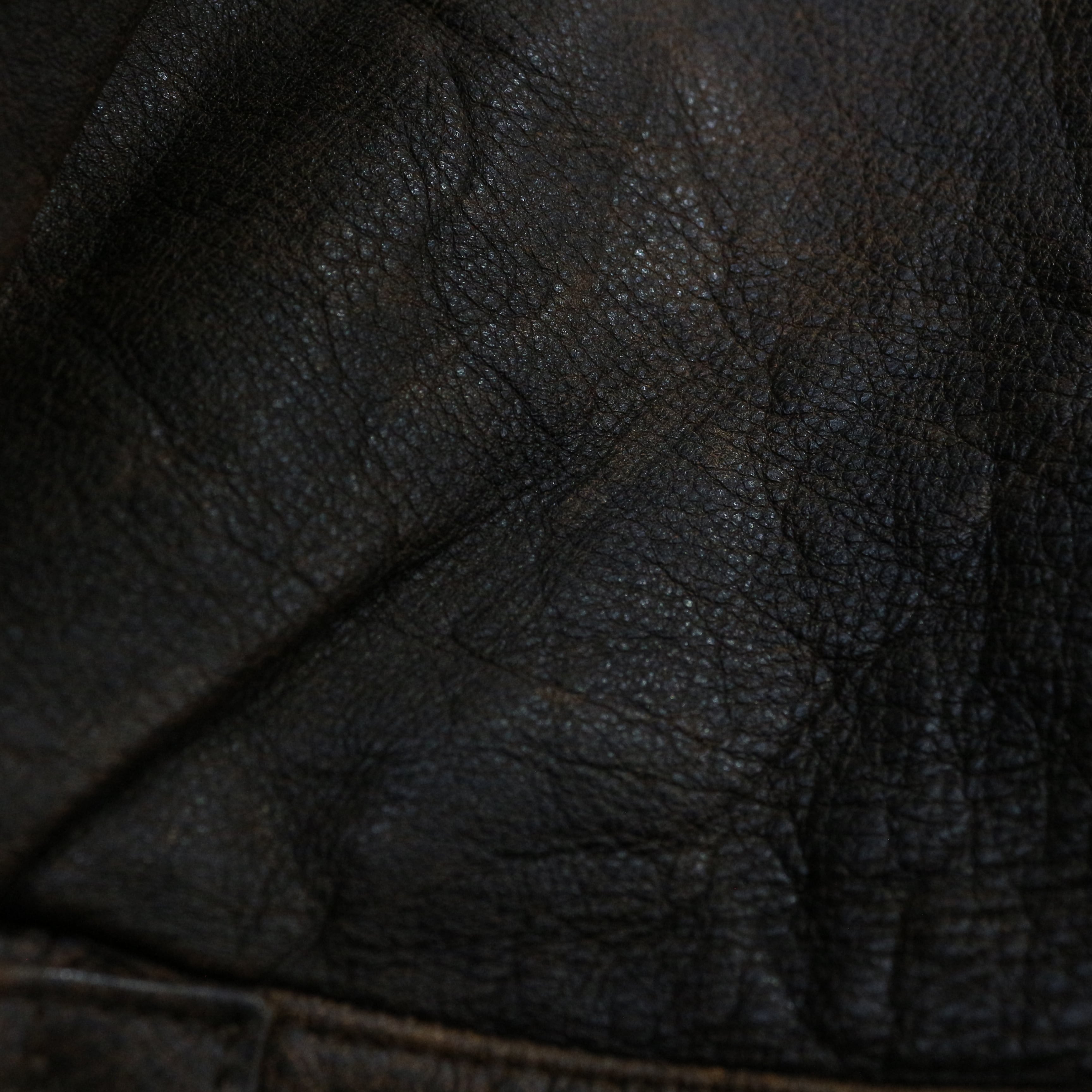 肉厚でしっかりとしたレザーを採用し、長年の着用によって生まれた深みのある色ムラやシワ感が全体に広がる、エイジングが抜群の1着。