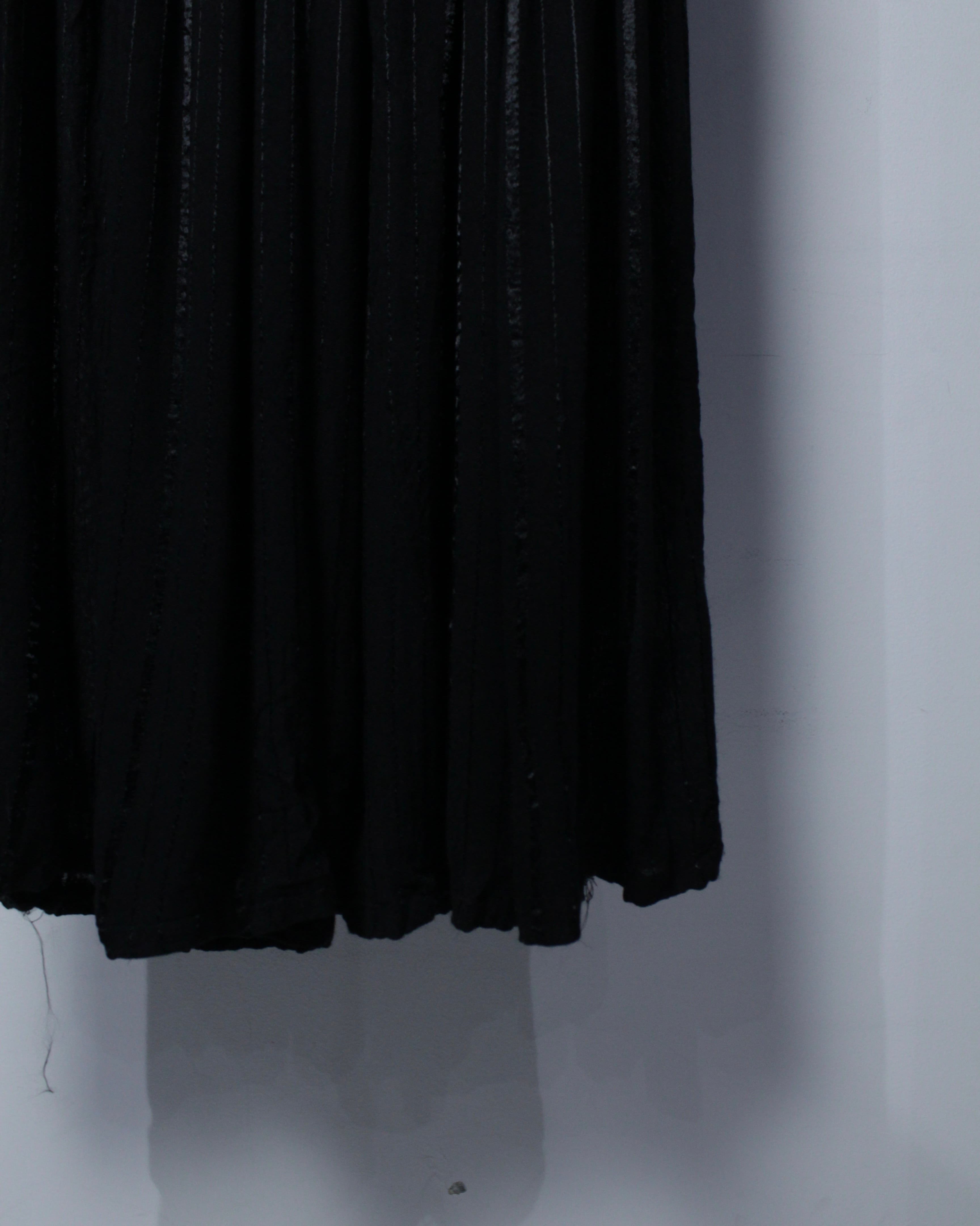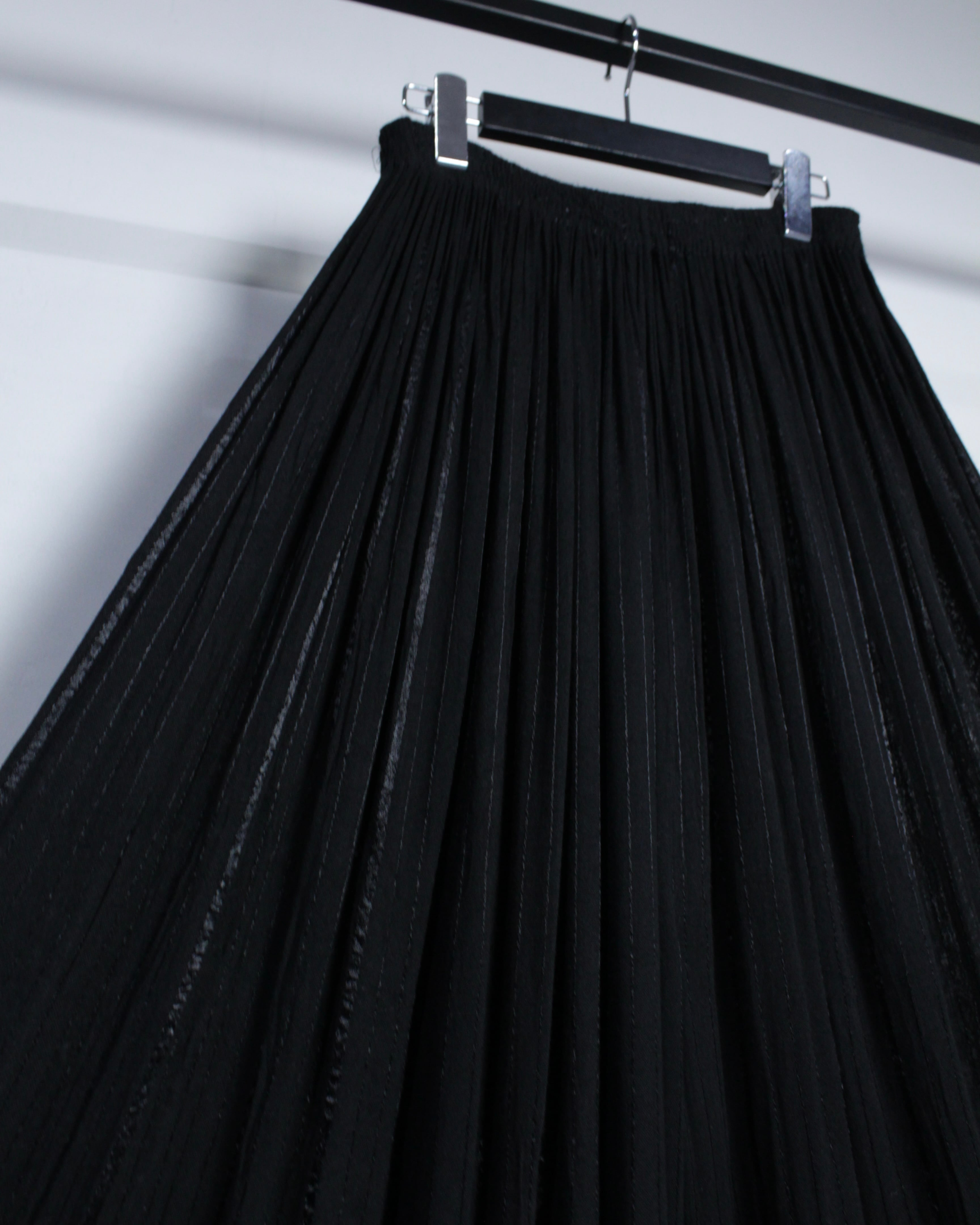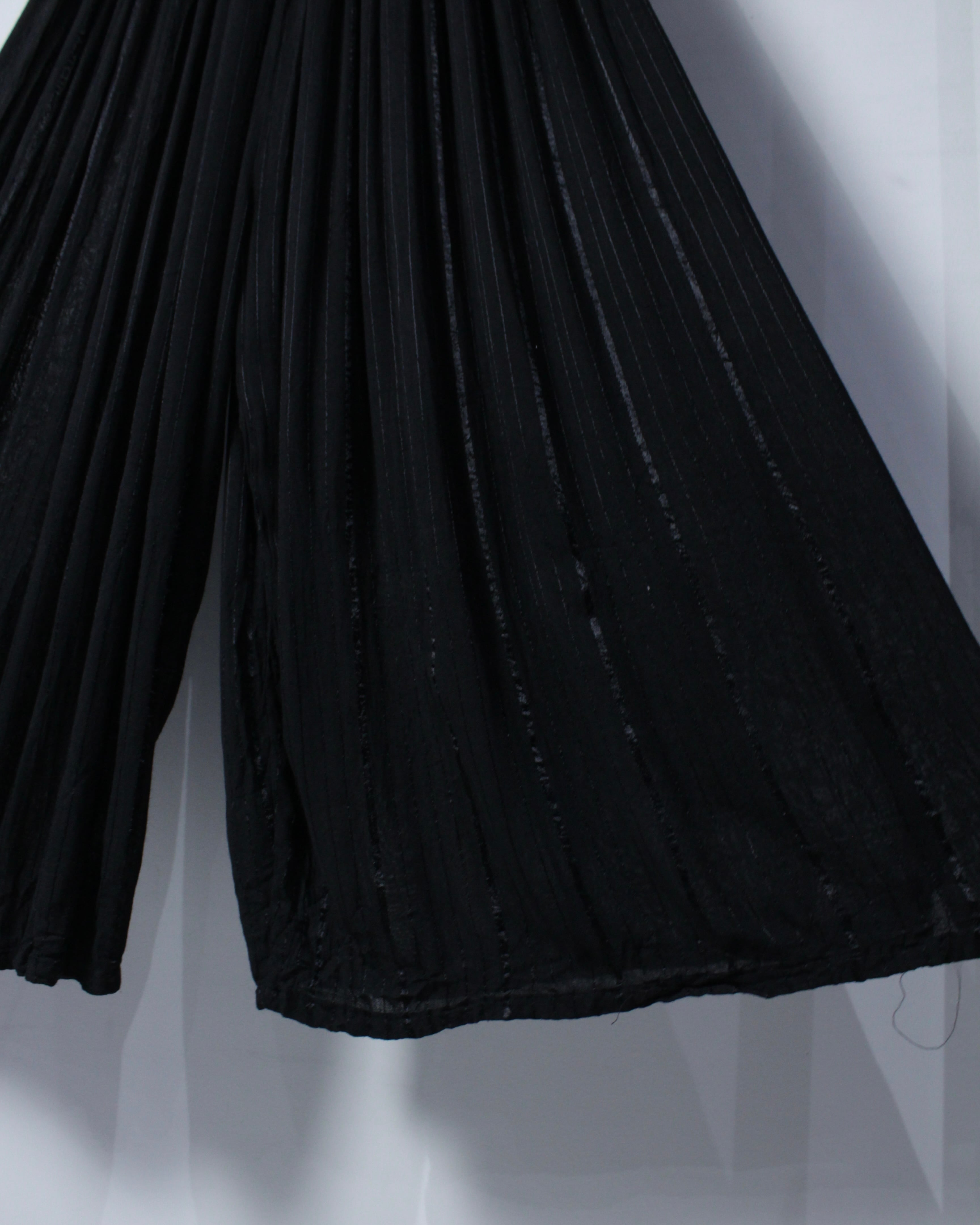 細やかに入るプリーツが生み出す立体感のある表情に、動くたびに揺れるドレープ性が相まった1着。