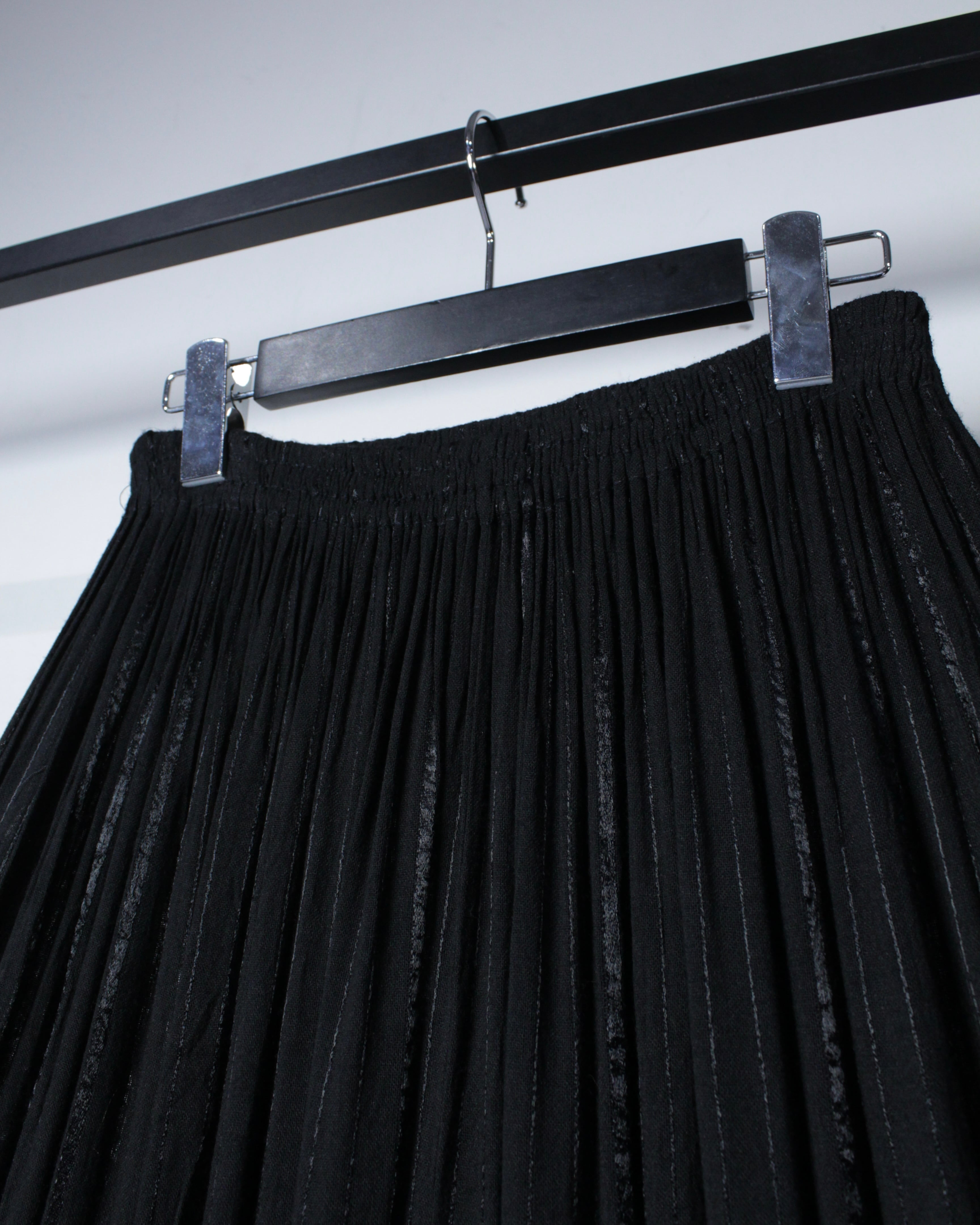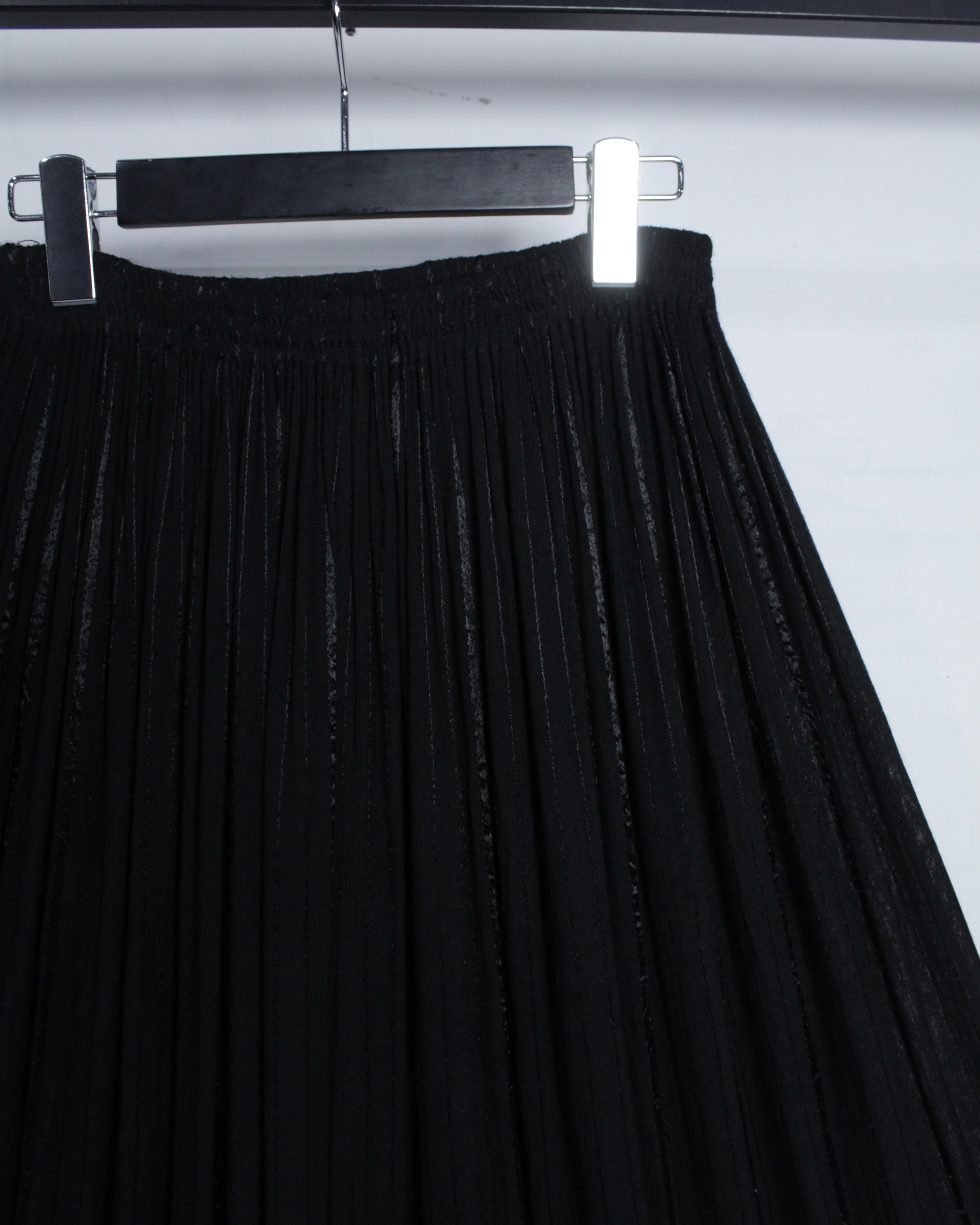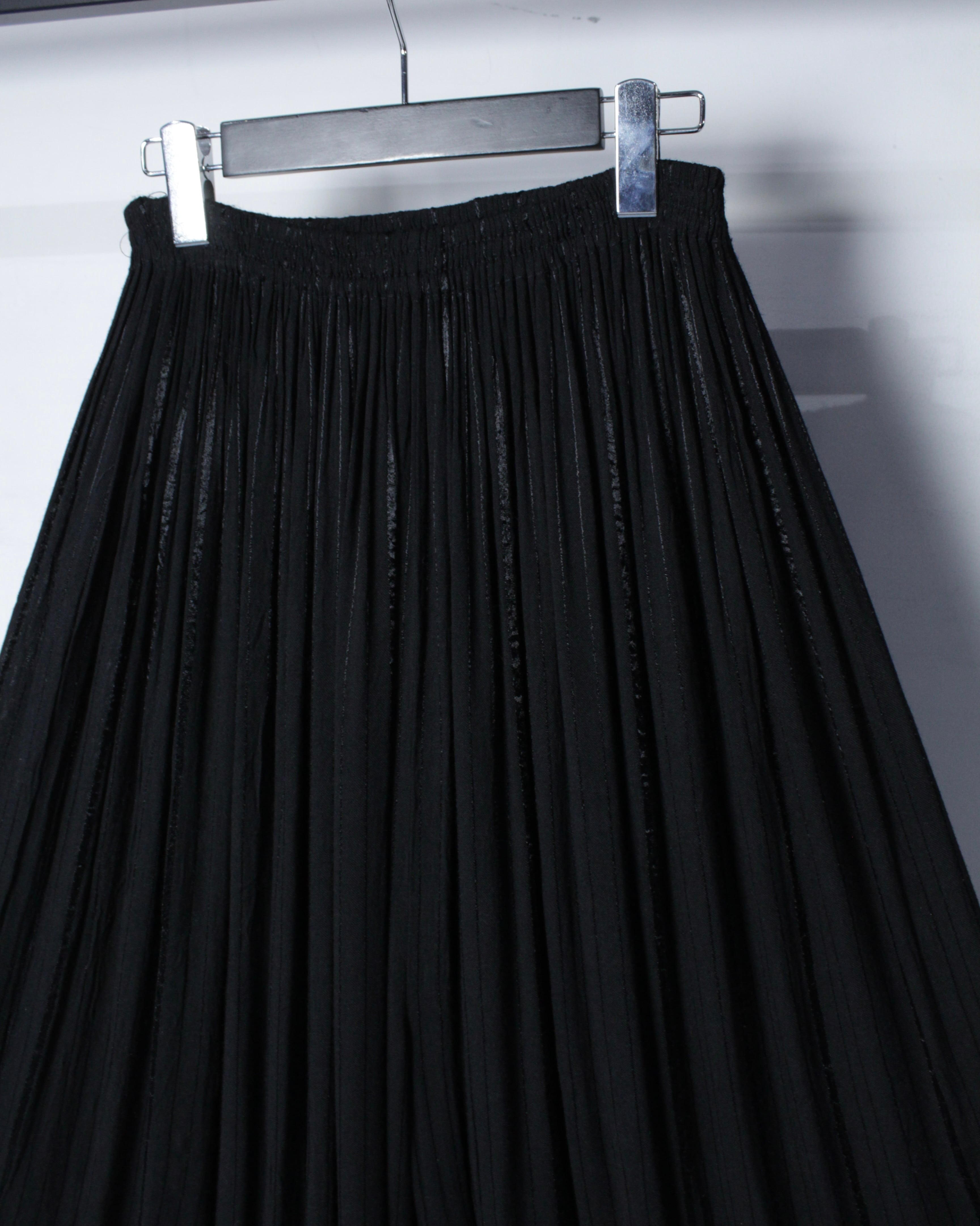 細やかに入るプリーツが生み出す立体感のある表情に、動くたびに揺れるドレープ性が相まった1着。