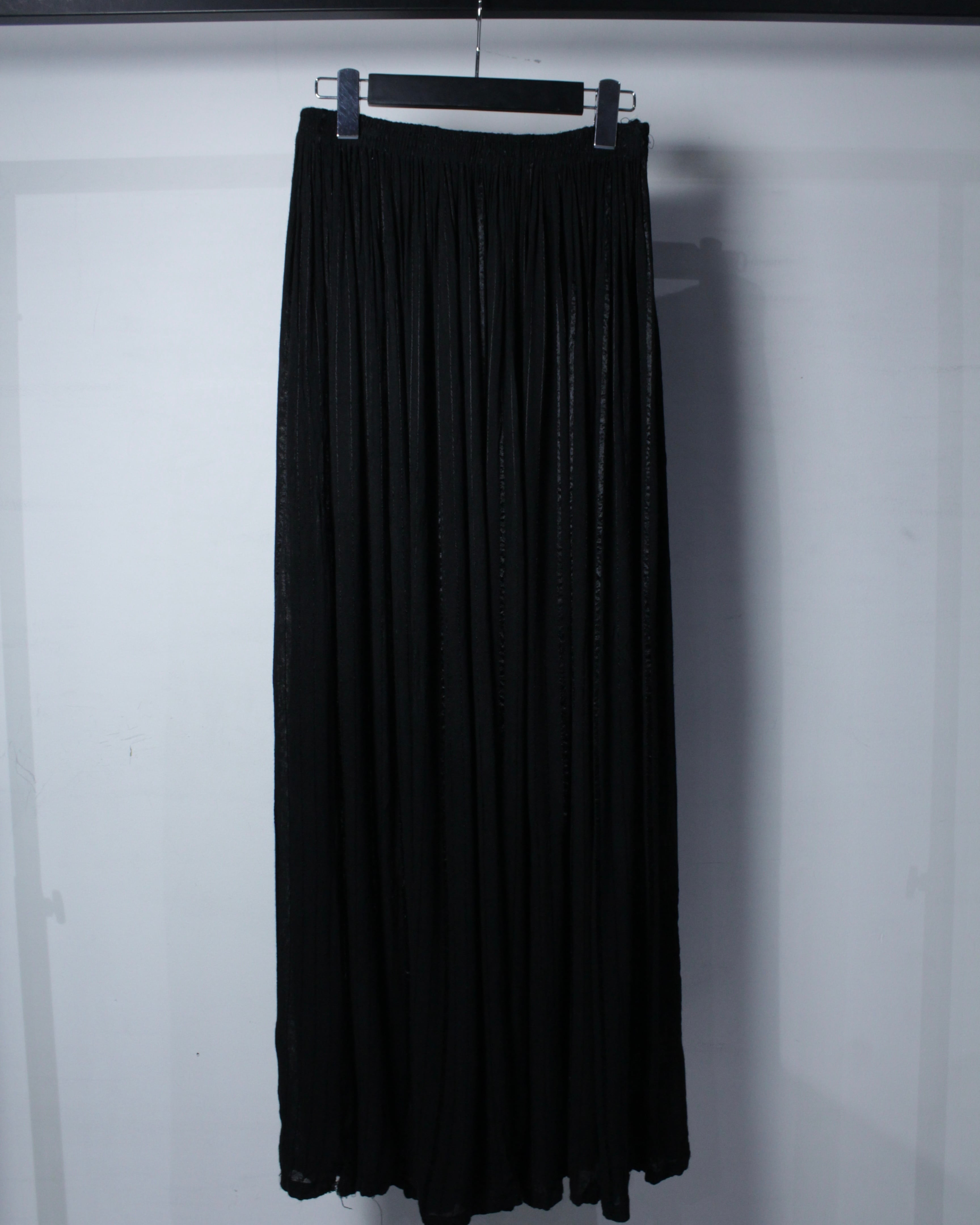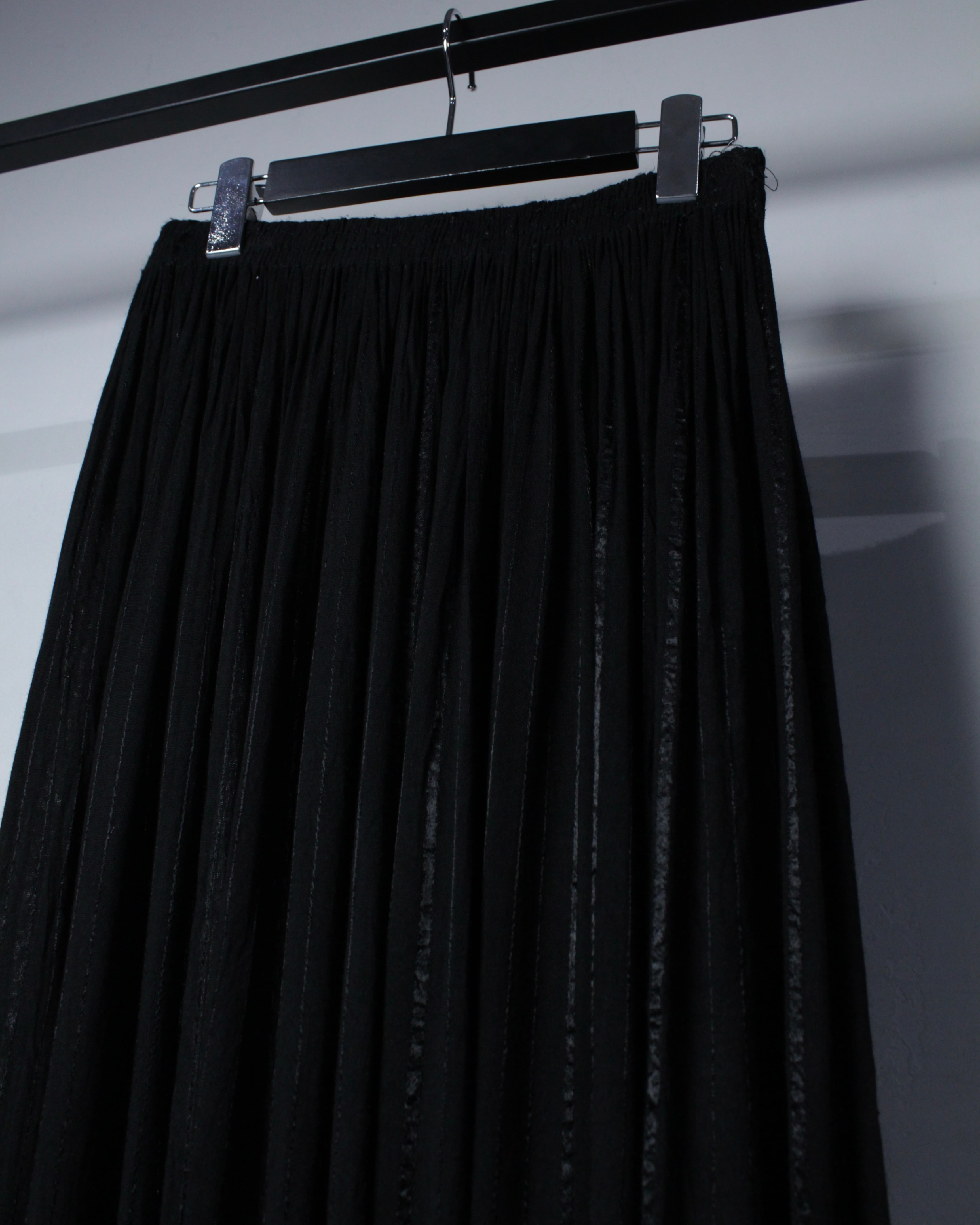 シルエットは袴を彷彿とさせるワイドな広がりに、レングスも長めに設定された存在感抜群のバランス。縦のラインを強調しつつ、しっかりとボリュームを持たせたことで、スタイリングに奥行きを与えてくれます。