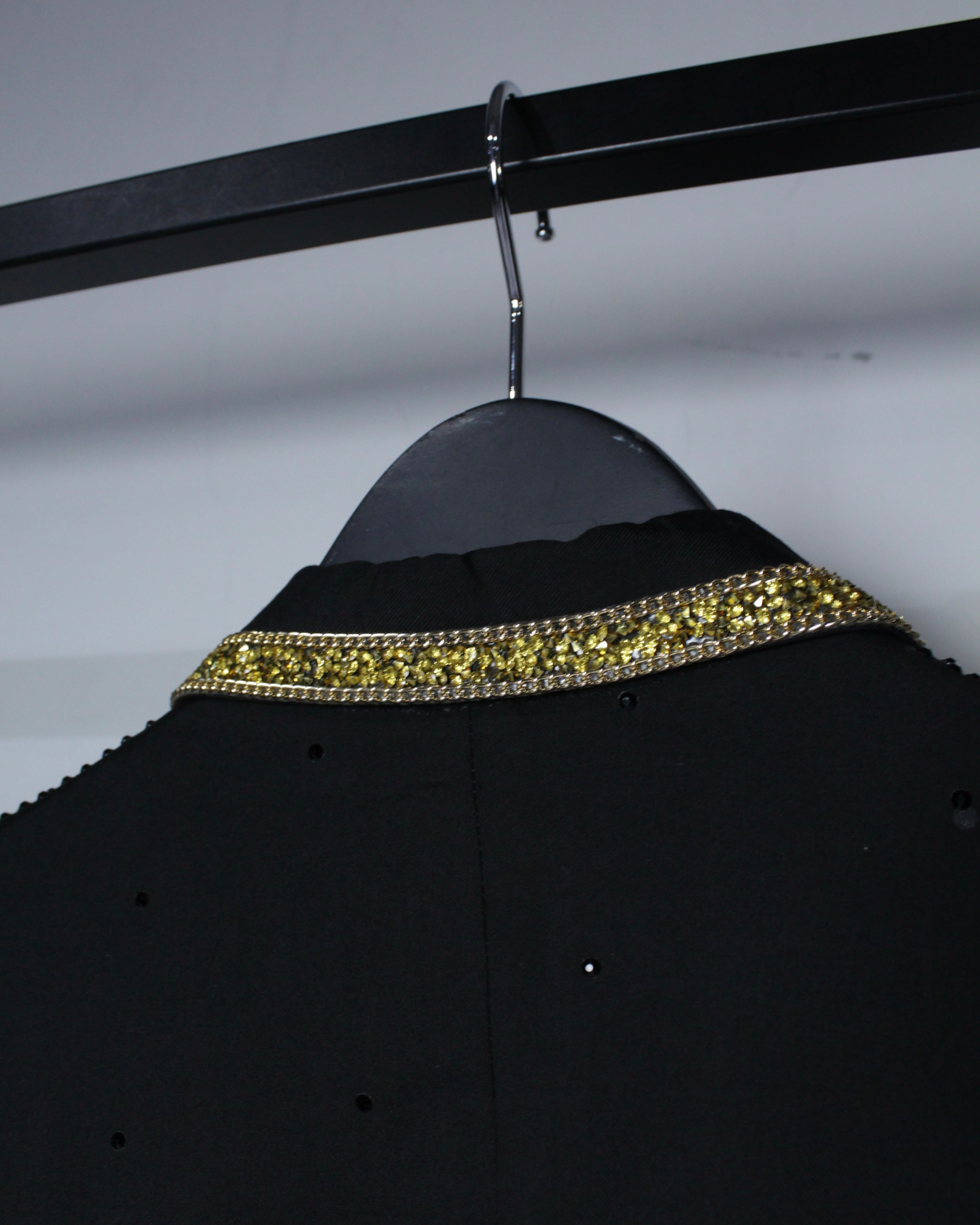 さらに襟元にはゴールドのチェーンとラインストーンテープをあしらい、視線を集める華やかなアクセントに。
