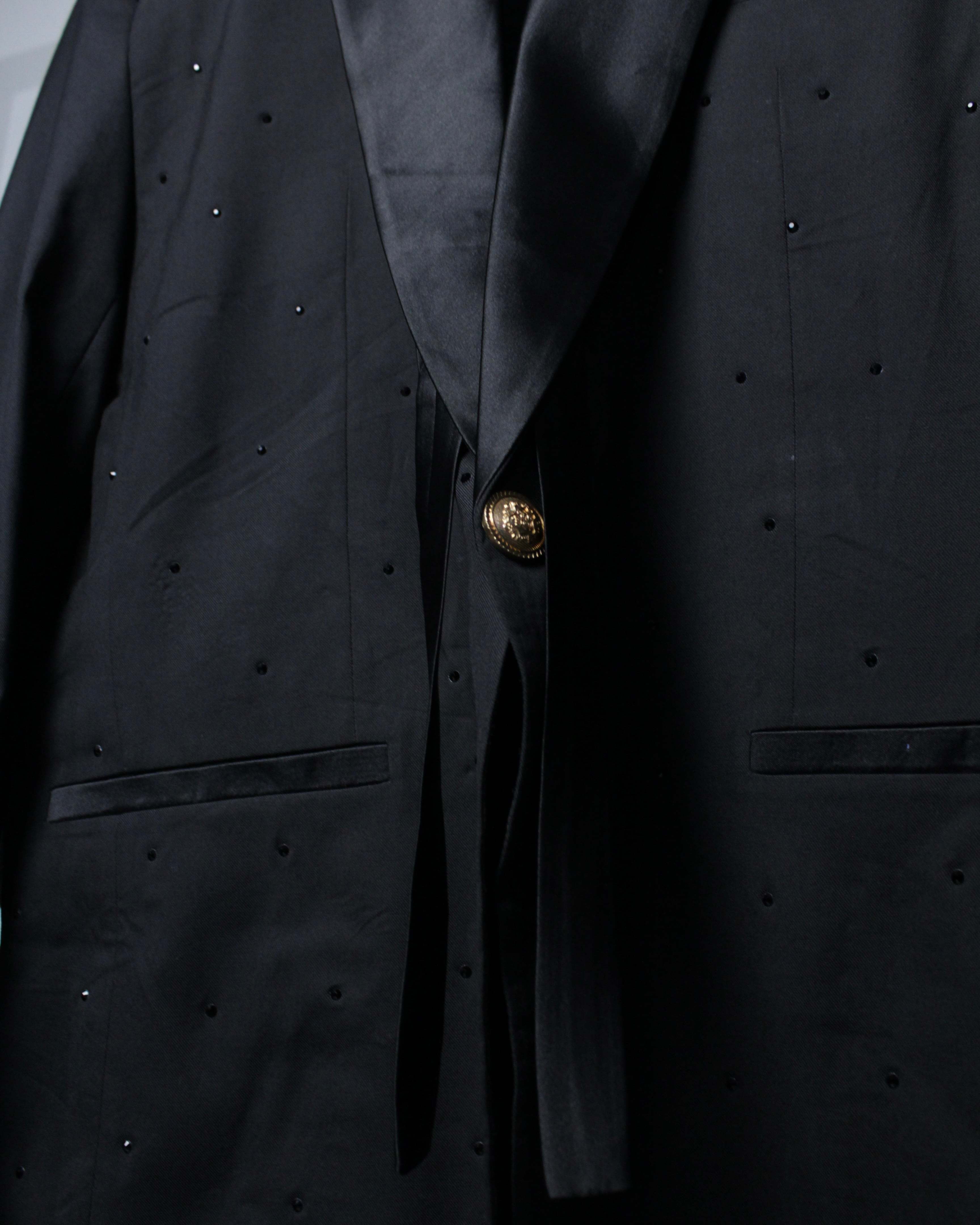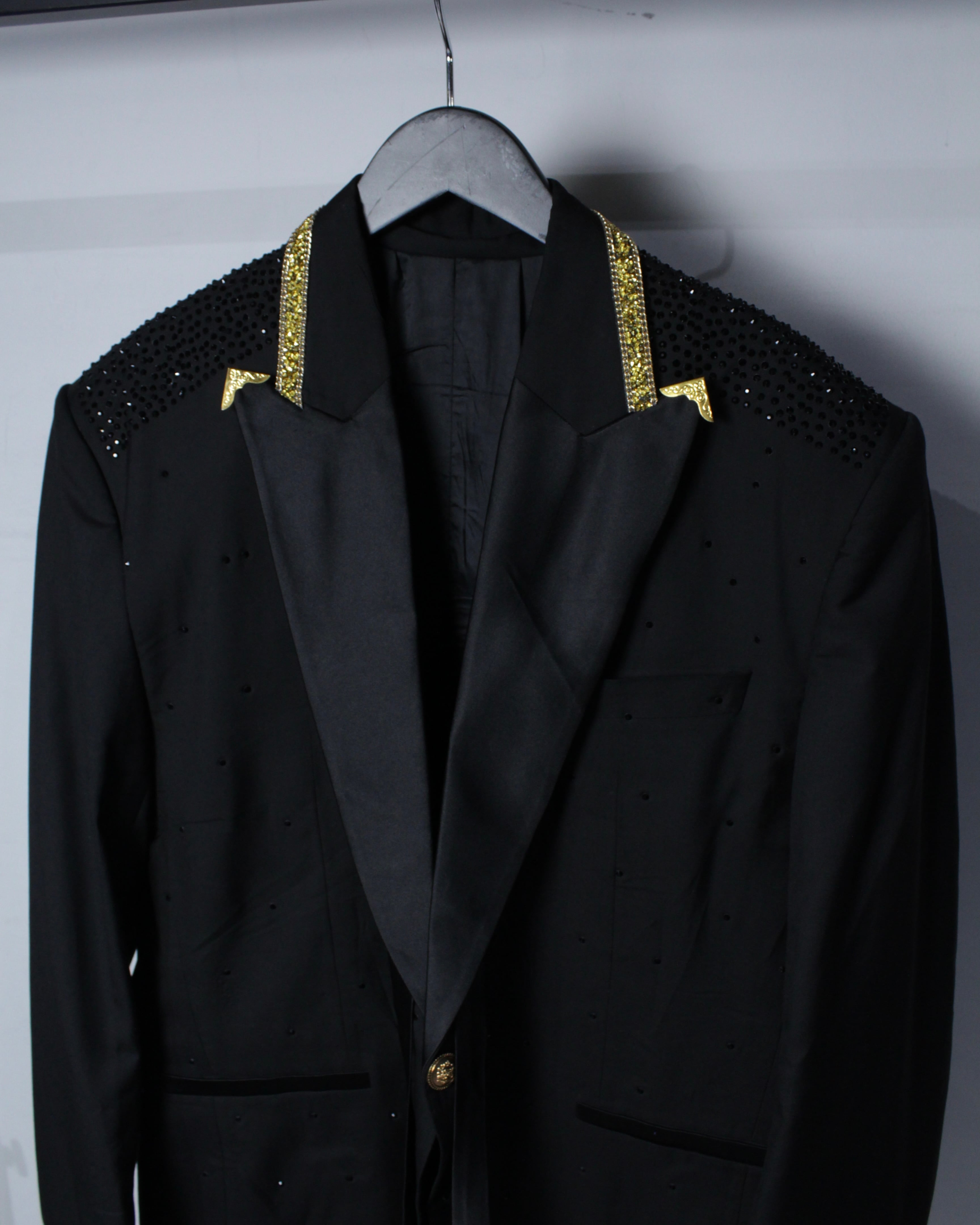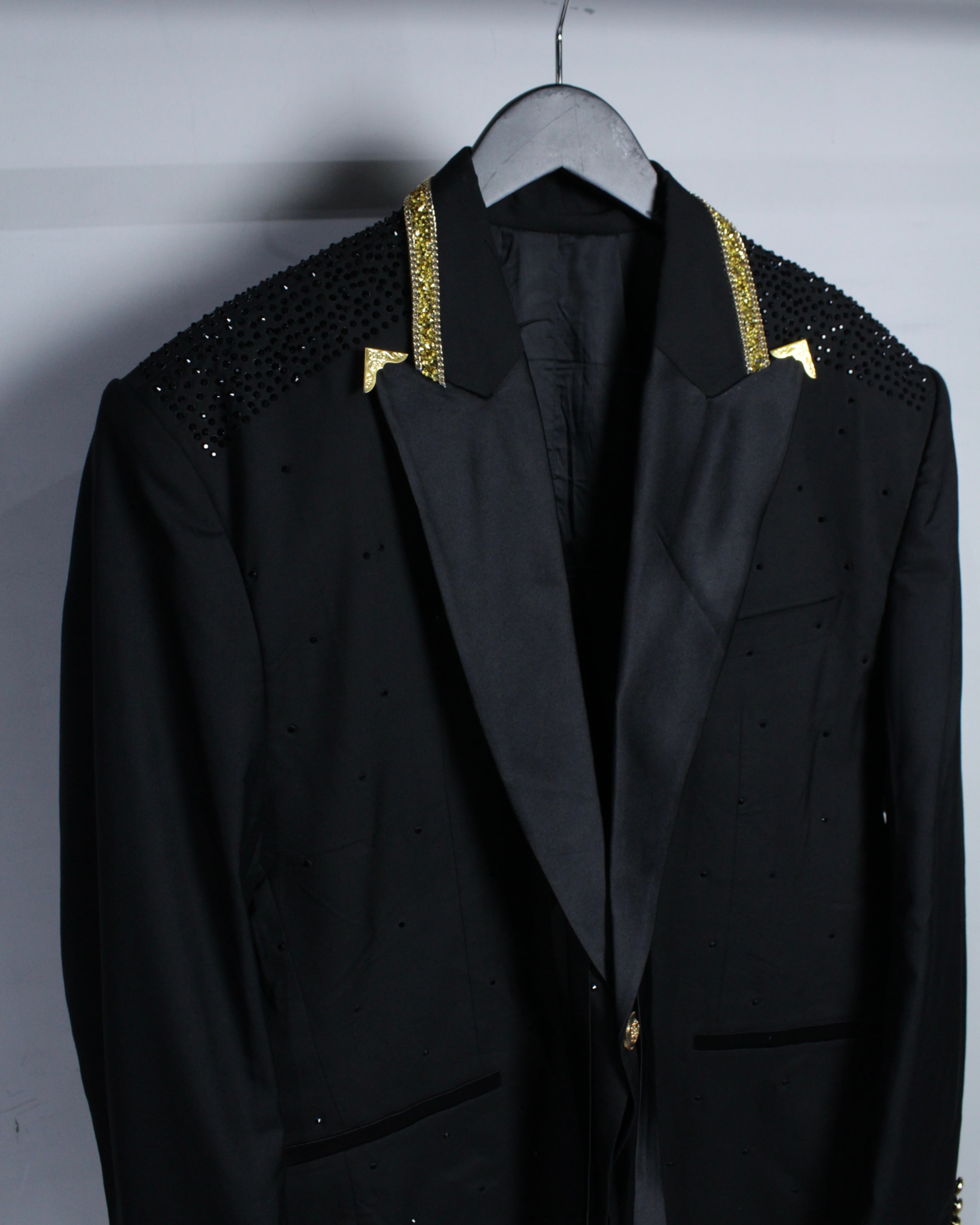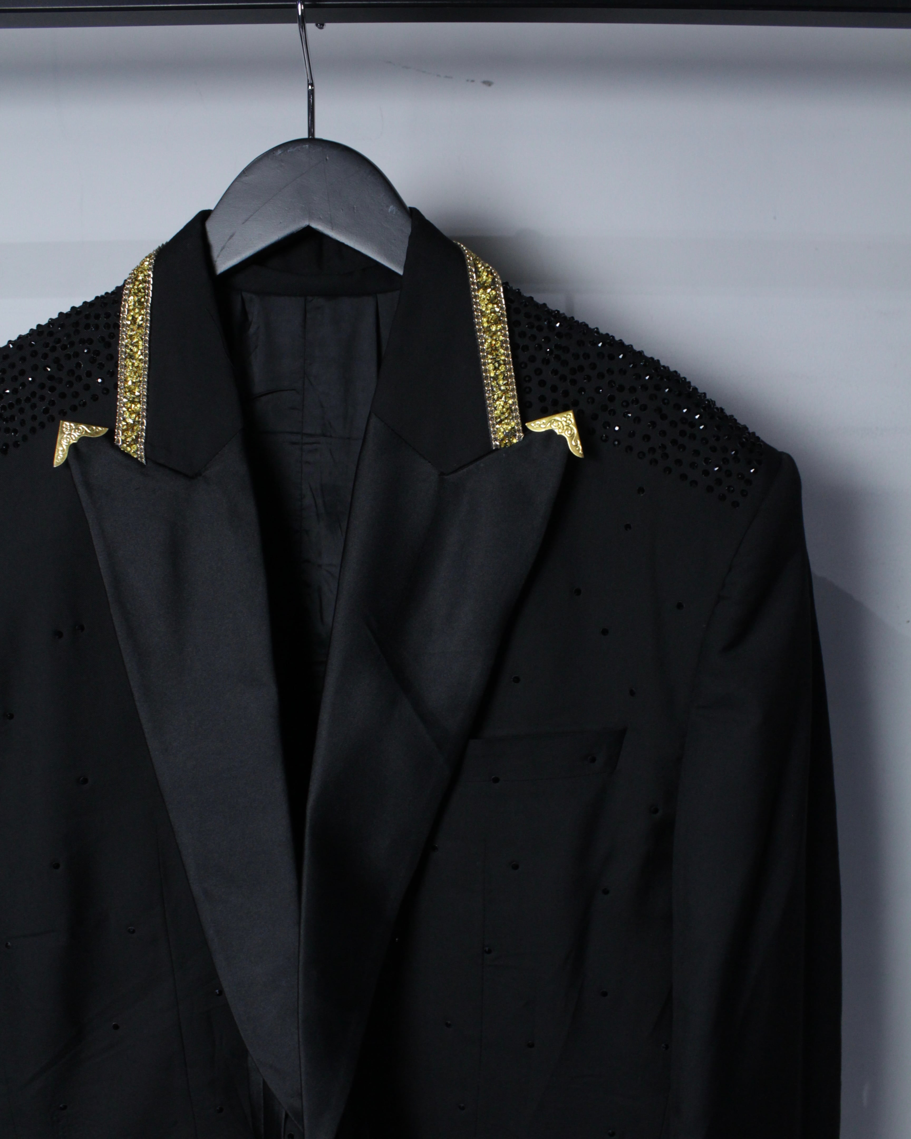 ベースは深みのあるブラックファブリックに、ラペル部分にはサテンの切り替えを施したクラシックなタキシード仕様。その上から肩、ボディ全体にかけてブラックのラインストーンを散りばめることで、光を受けた際にさりげなく輝く奥行きのある表情を演出しています。