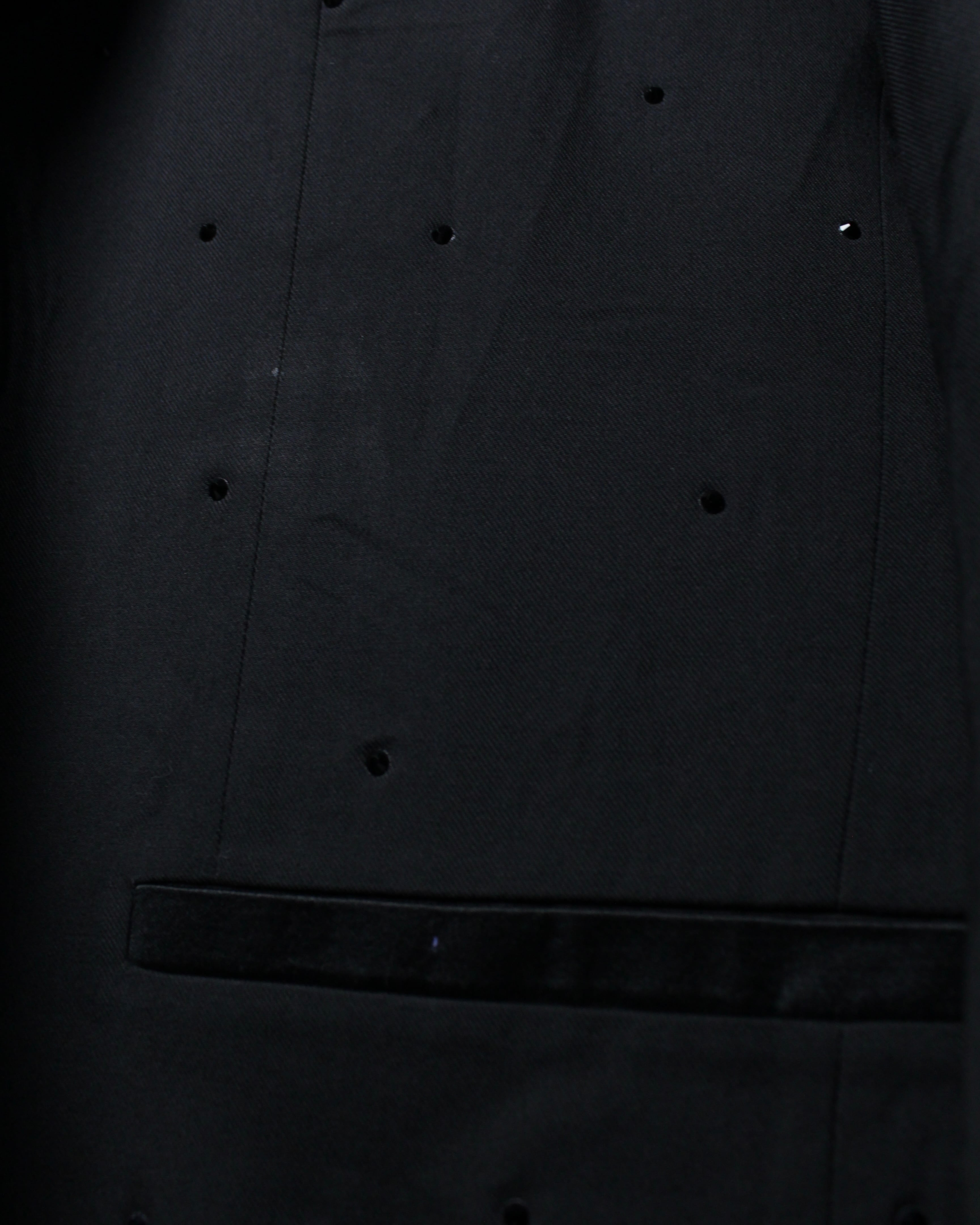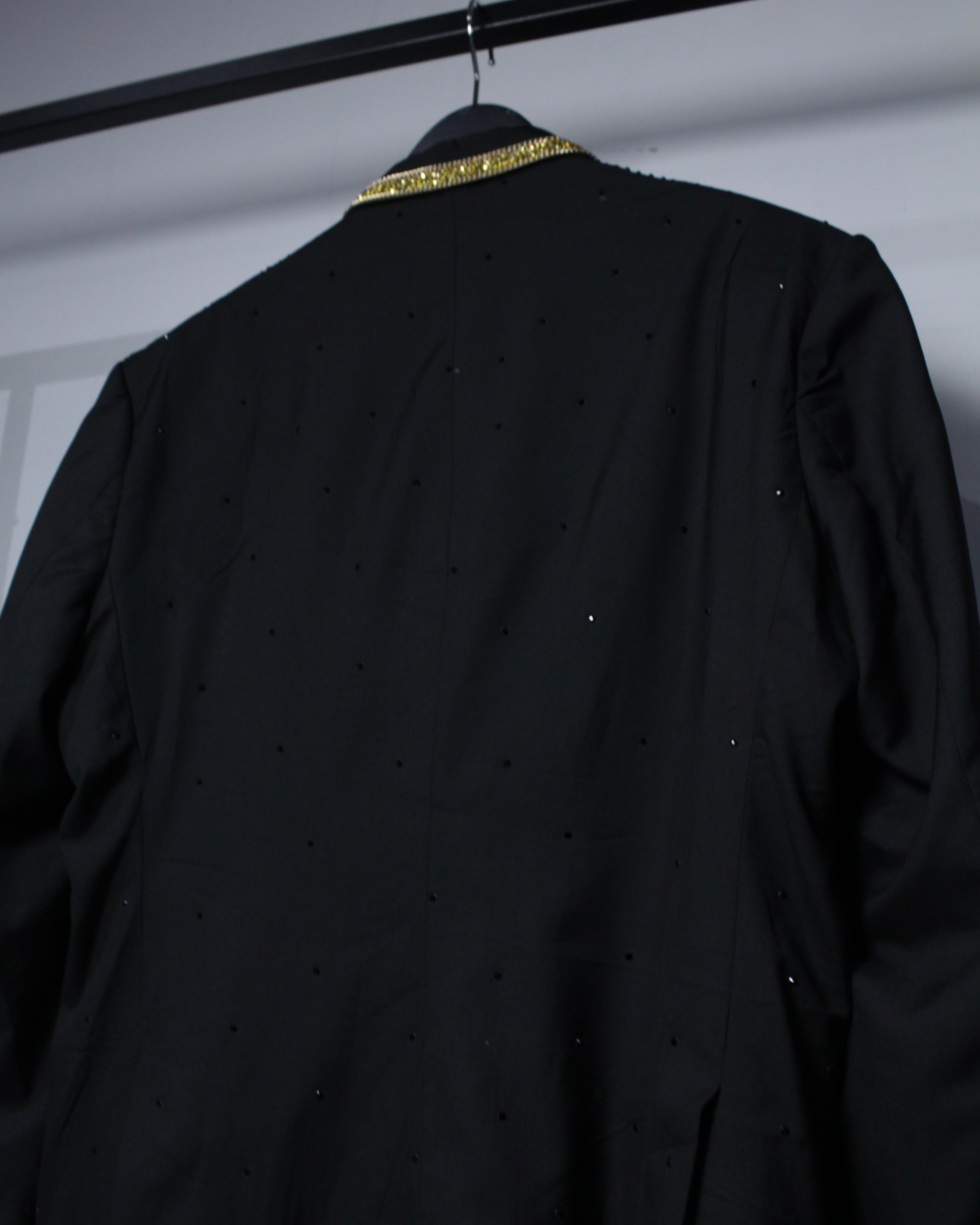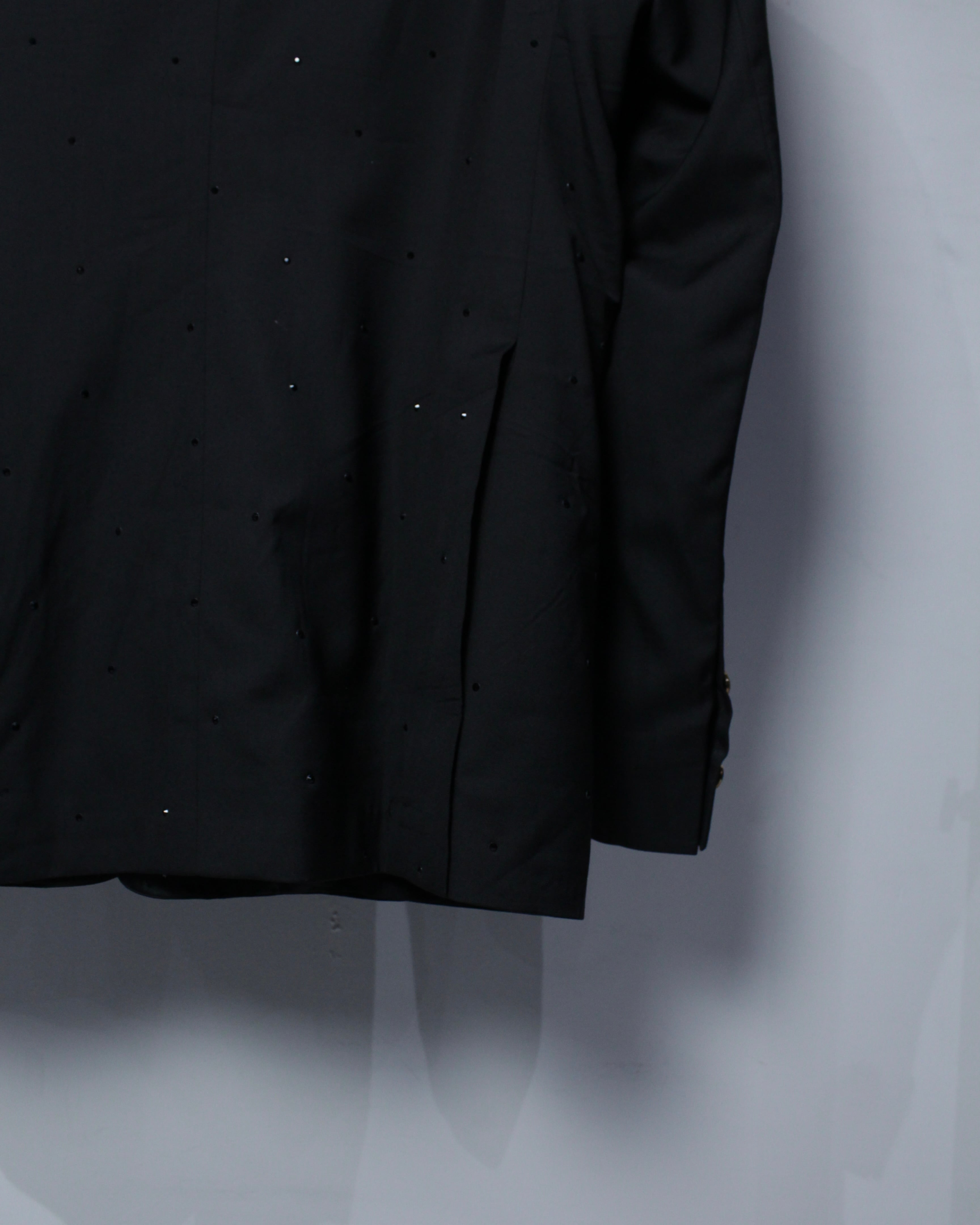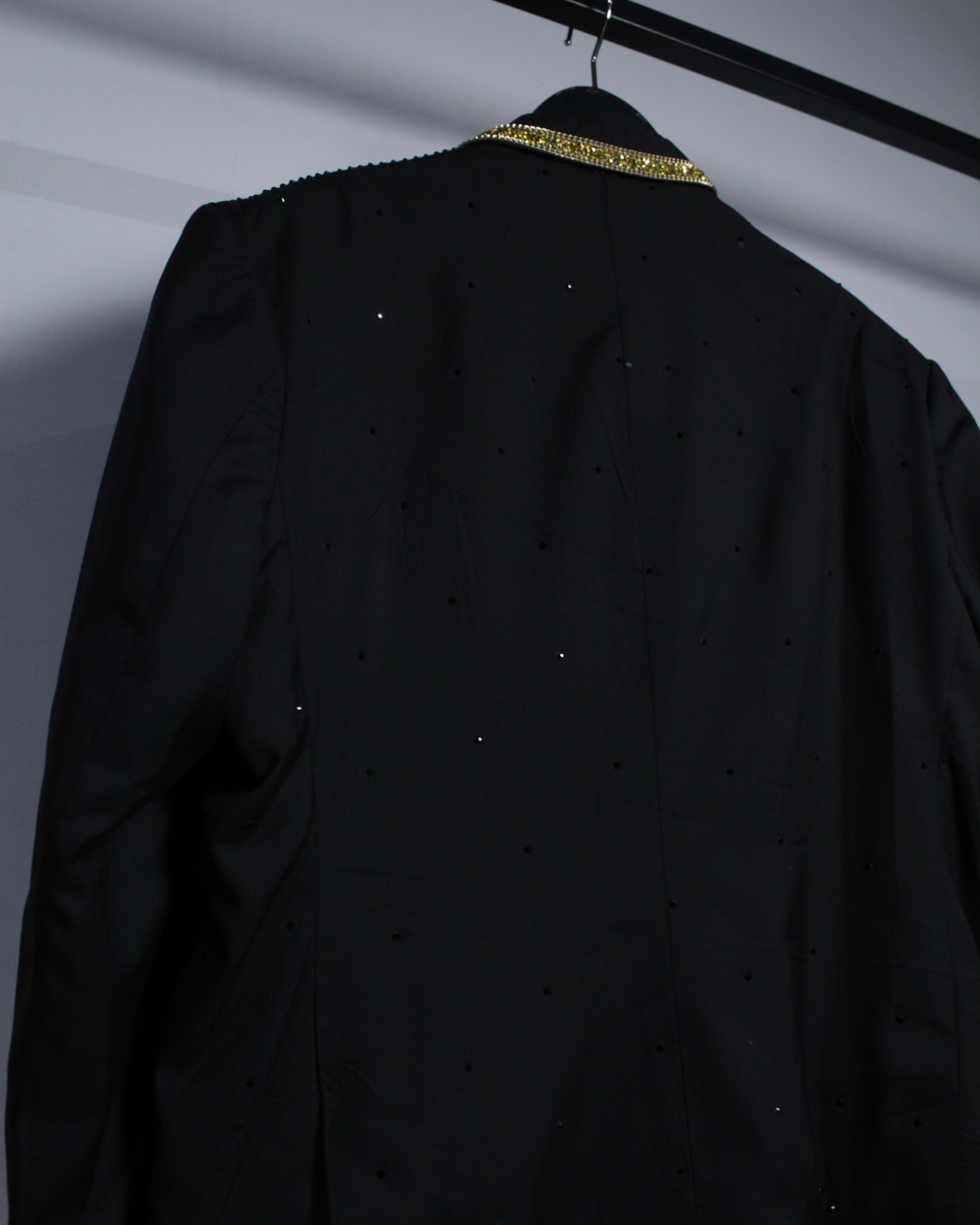 ベースは深みのあるブラックファブリックに、ラペル部分にはサテンの切り替えを施したクラシックなタキシード仕様。その上から肩、ボディ全体にかけてブラックのラインストーンを散りばめることで、光を受けた際にさりげなく輝く奥行きのある表情を演出しています。