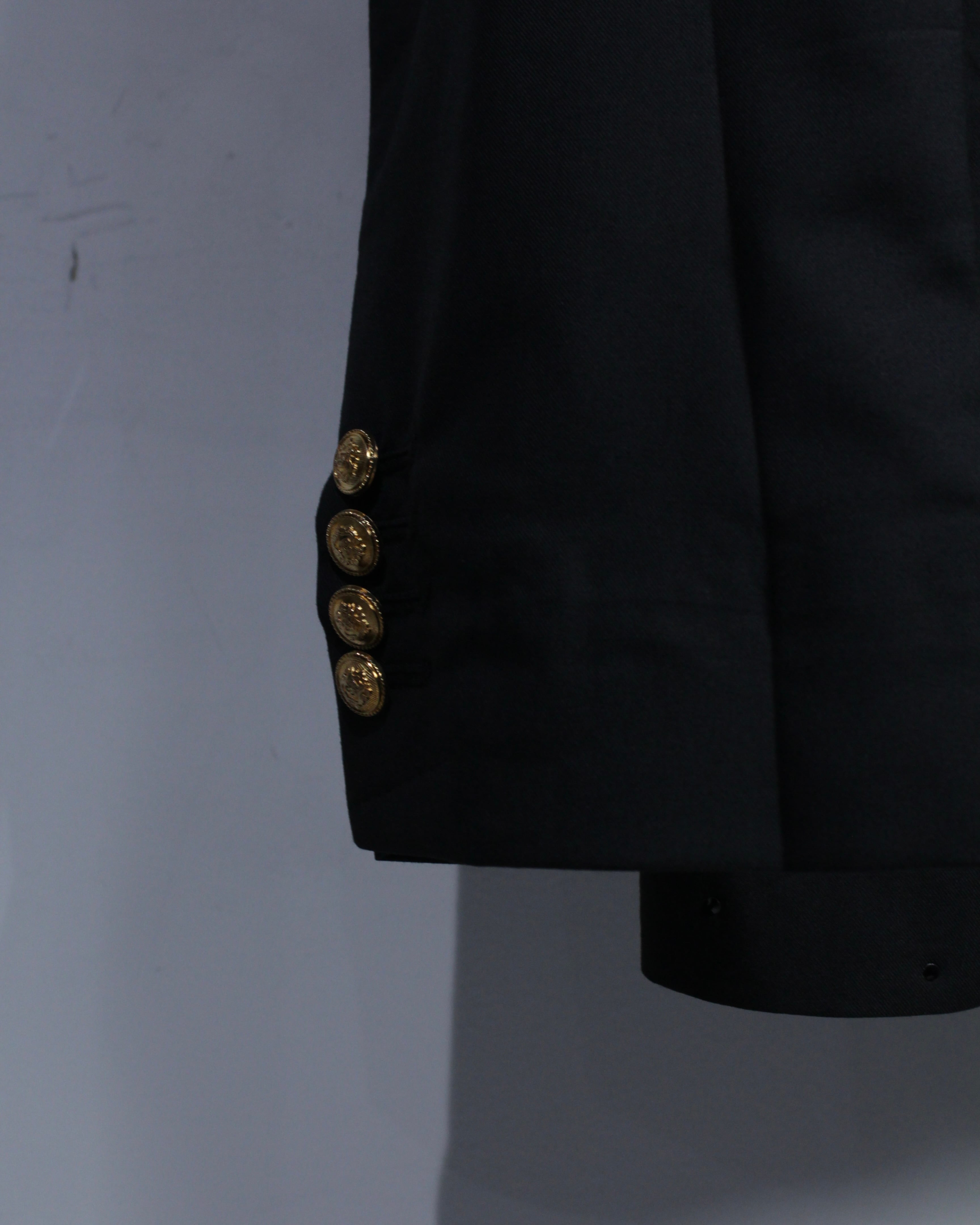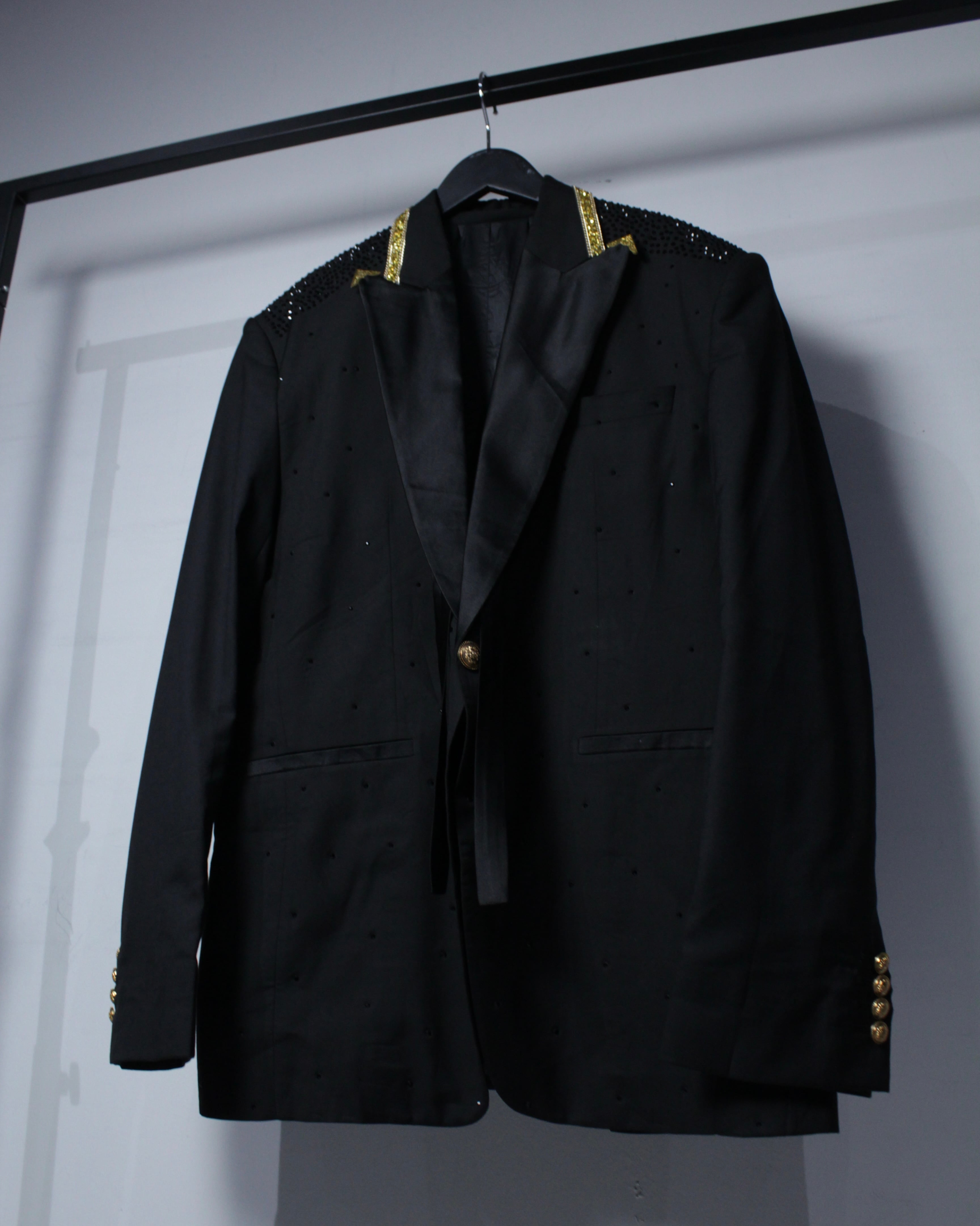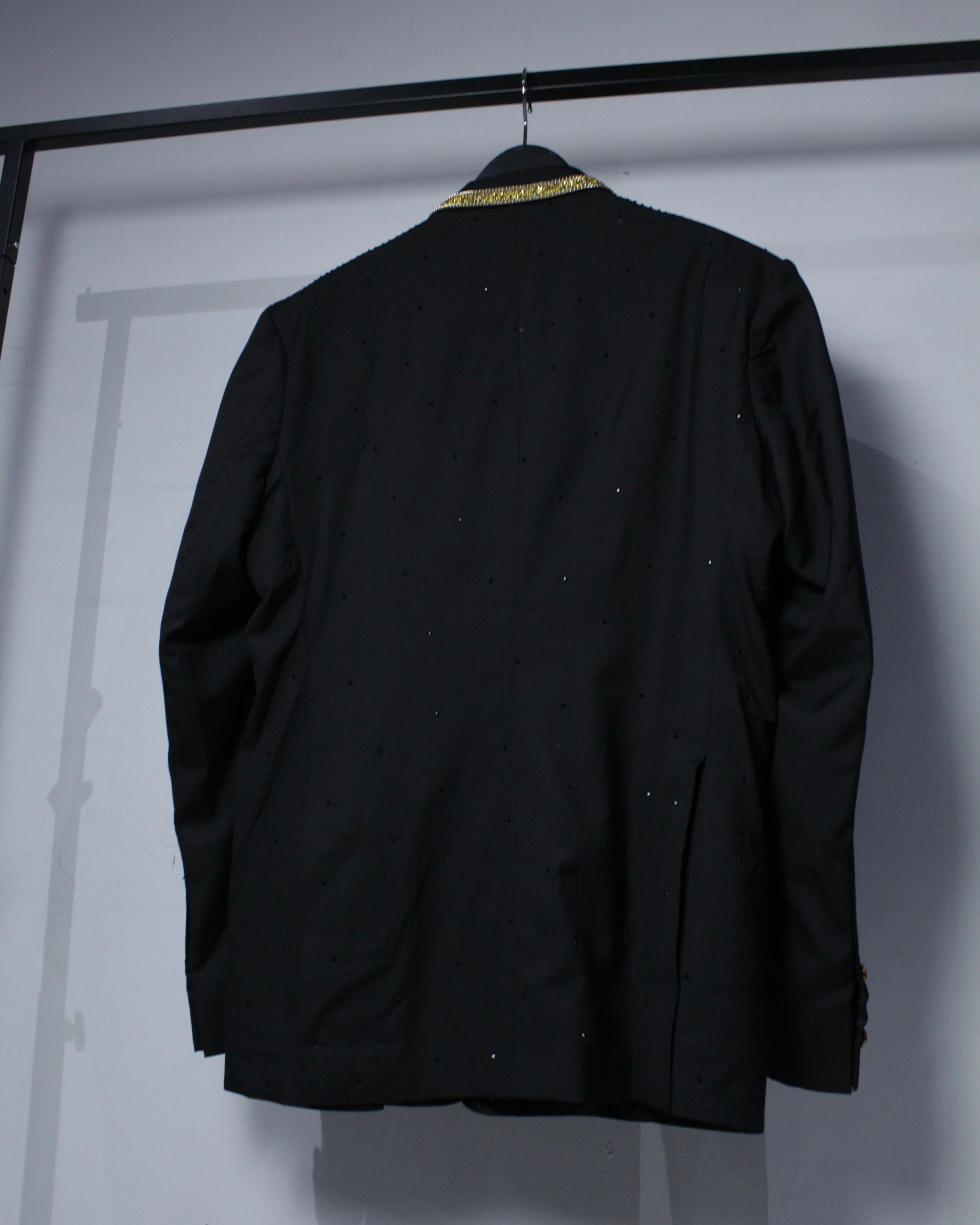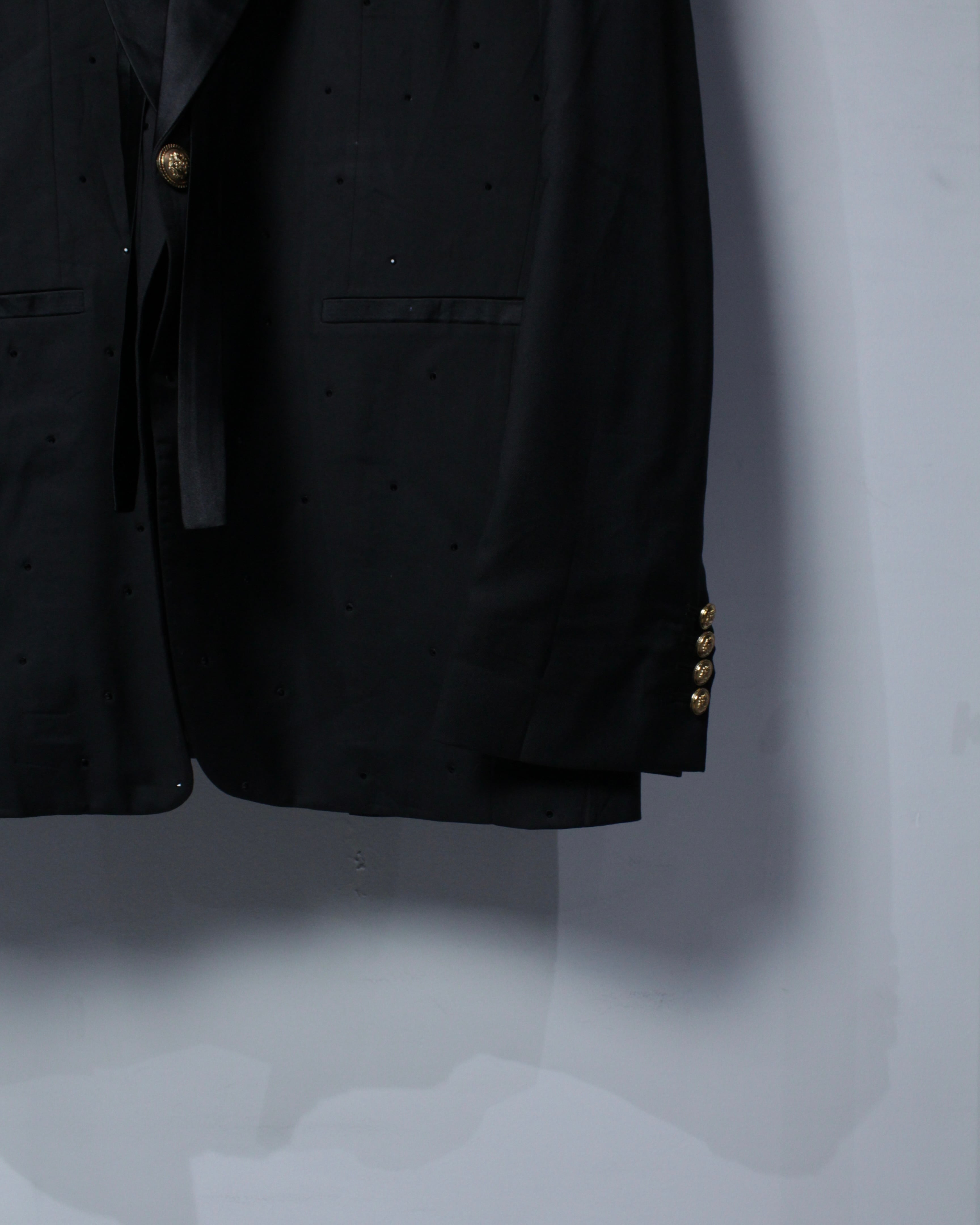 重厚なブラックに、ラグジュアリーな装飾を纏わせた圧倒的存在感を放つタキシードジャケットをご紹介いたします。