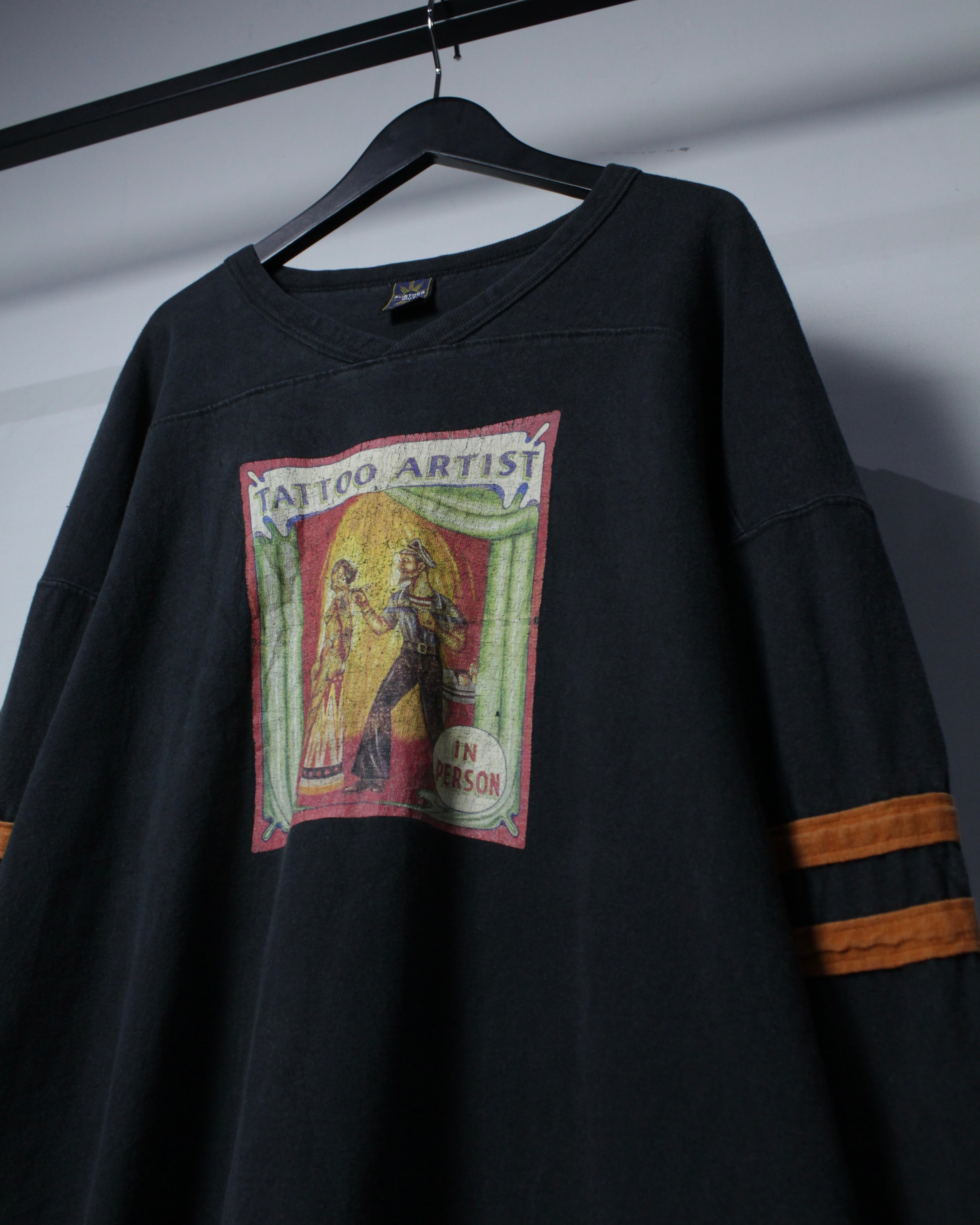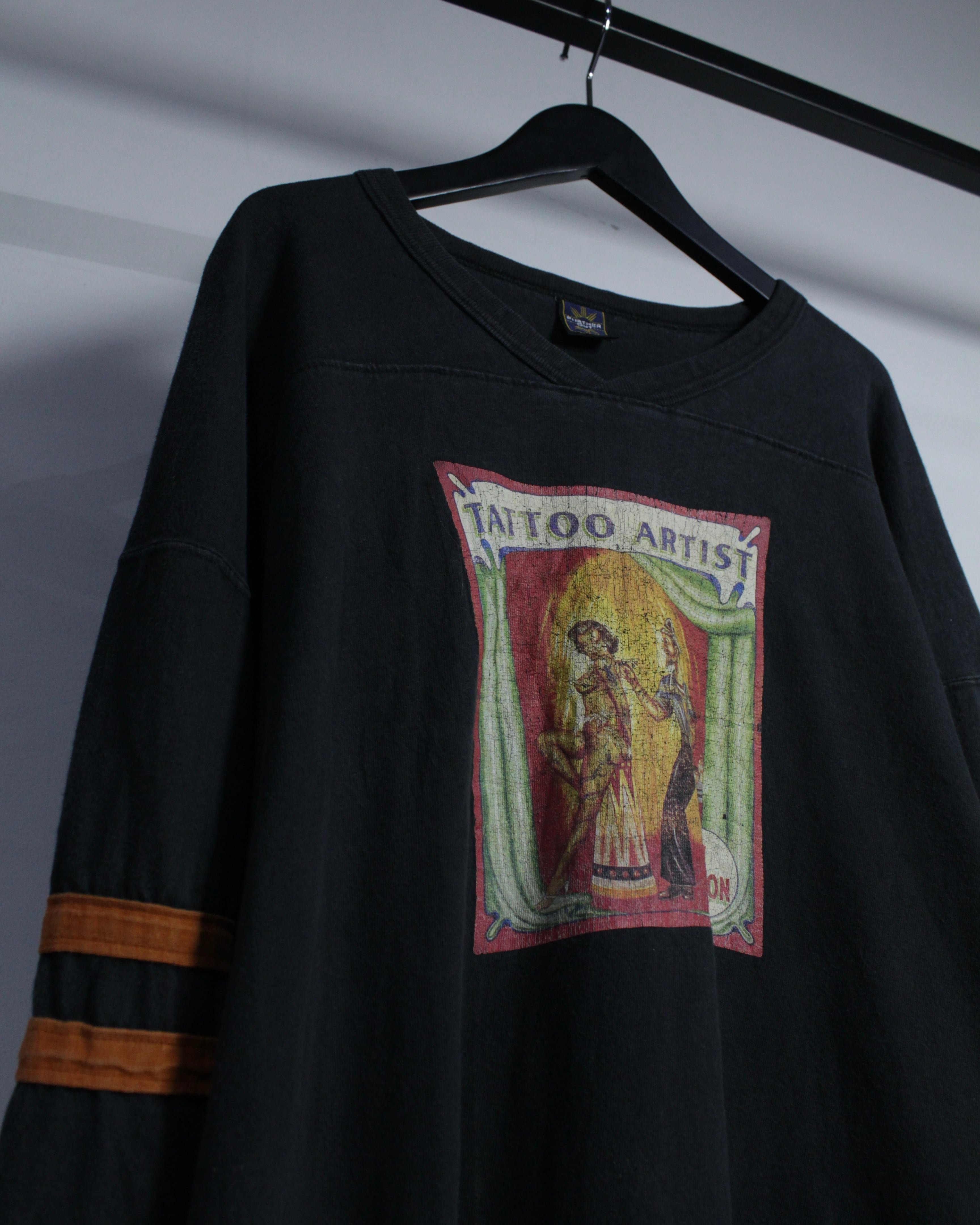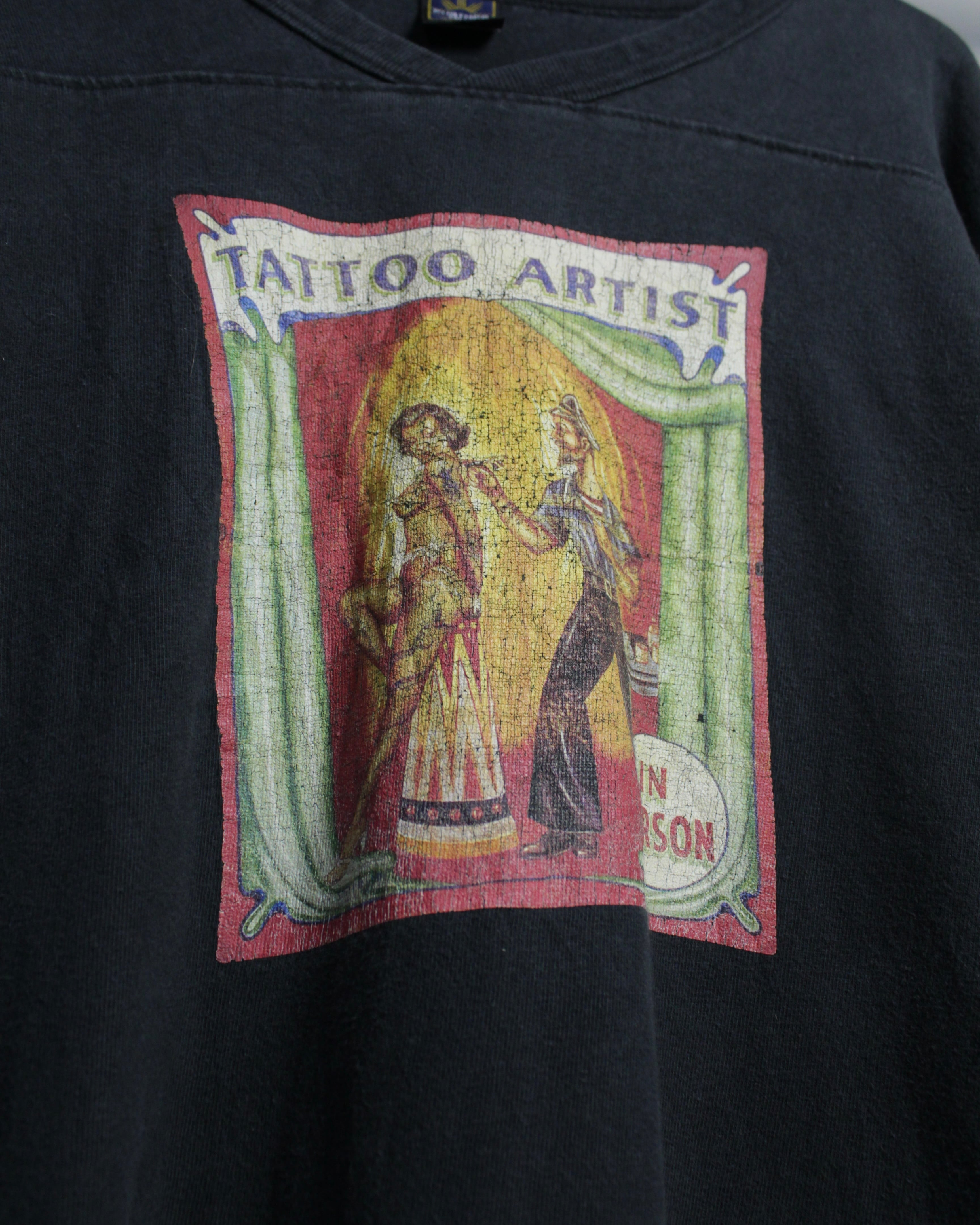 ボディは程よくフェードしたブラックカラー。コットン特有の柔らかな風合いと、着込まれたことで生まれる退廃的な表情が相まって、雰囲気のある一枚に仕上がっています。フロントには“Tattoo Artist”のプリントを配置し、どこかヴィンテージポスターを思わせるアート性の高いデザインが目を惹きます。