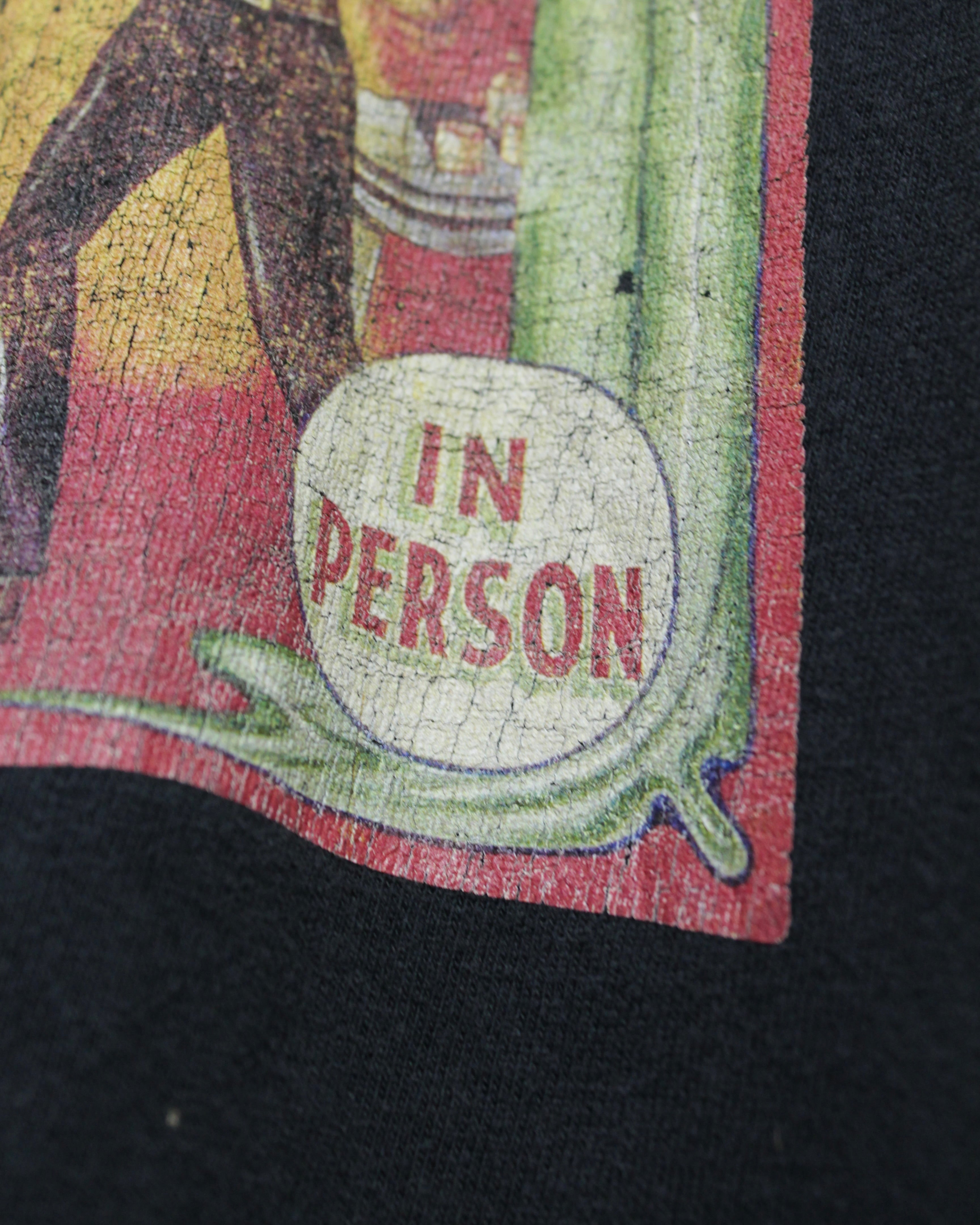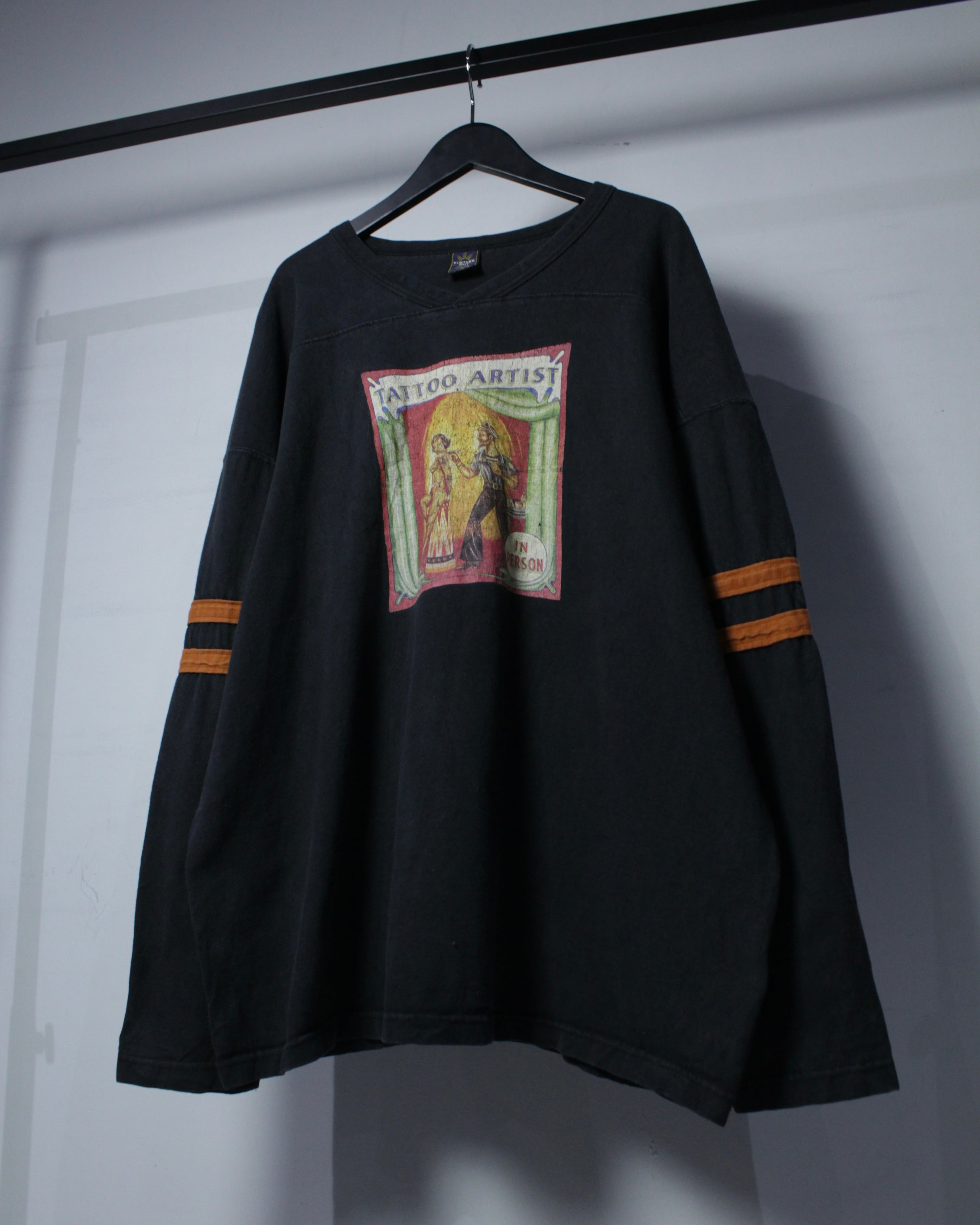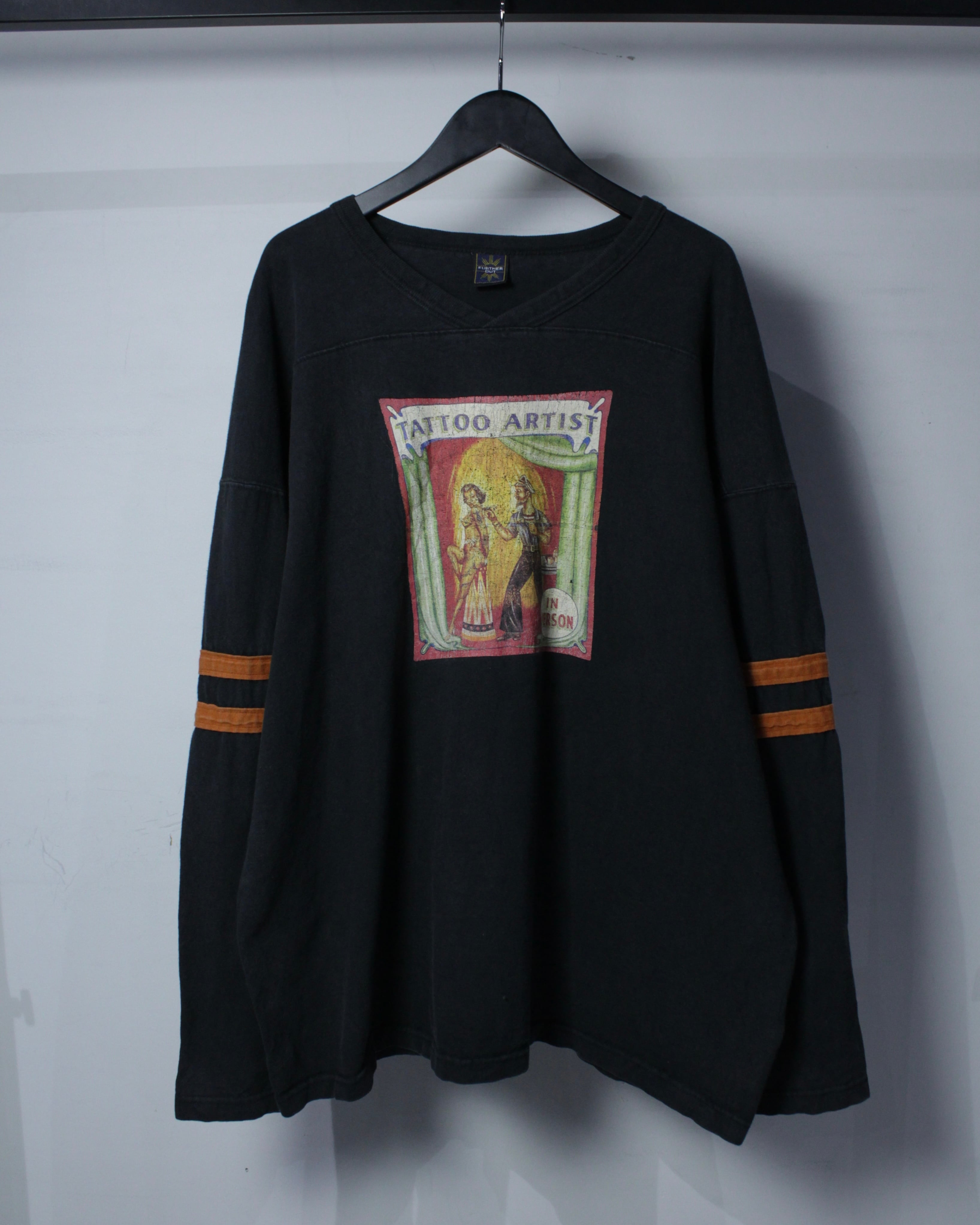 ボディは程よくフェードしたブラックカラー。コットン特有の柔らかな風合いと、着込まれたことで生まれる退廃的な表情が相まって、雰囲気のある一枚に仕上がっています。フロントには“Tattoo Artist”のプリントを配置し、どこかヴィンテージポスターを思わせるアート性の高いデザインが目を惹きます。