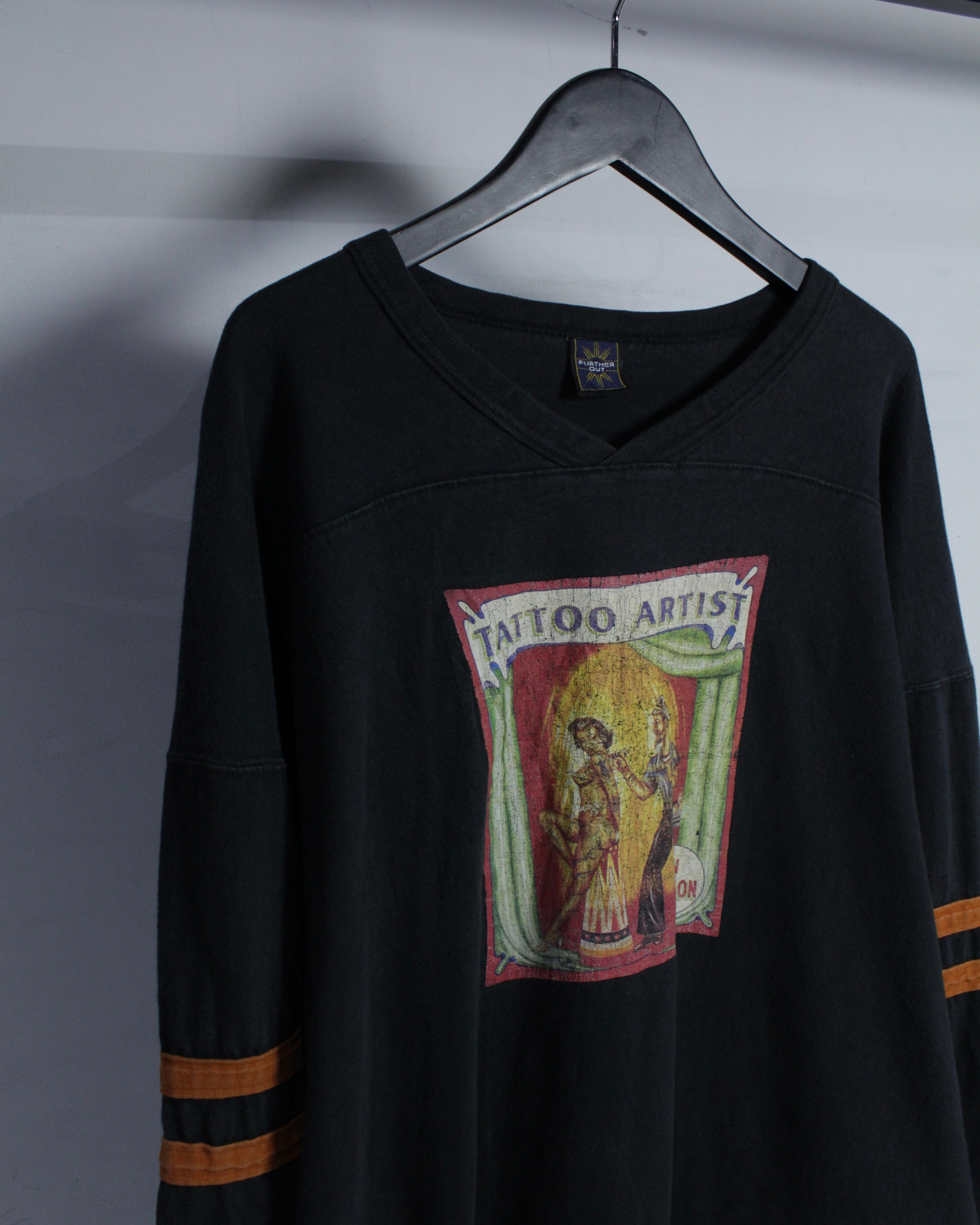 アメリカンカルチャーを感じさせるグラフィックが魅力の、VネックロングスリーブTシャツをご紹介いたします。