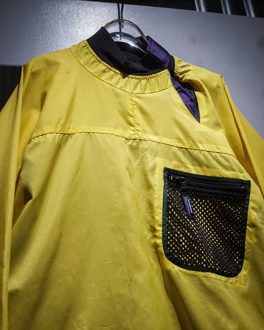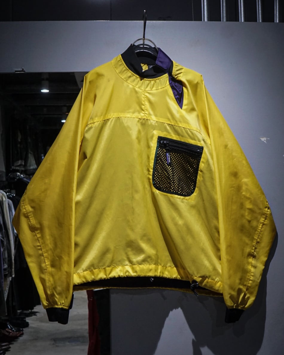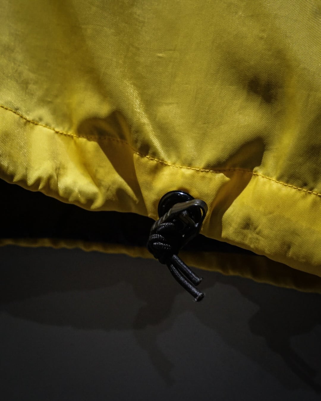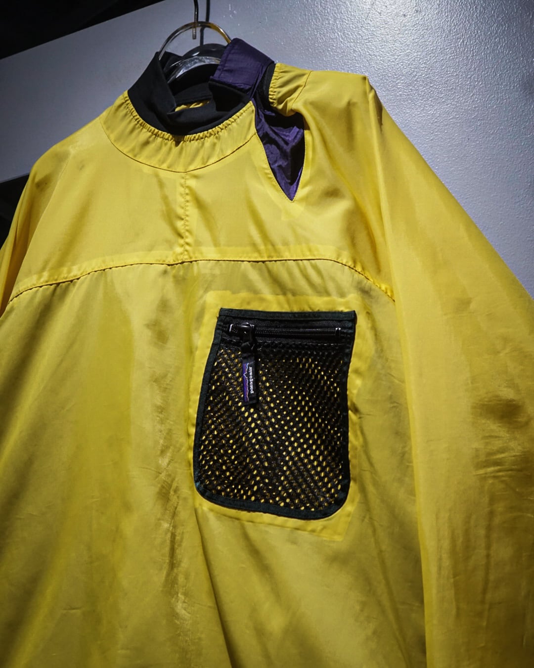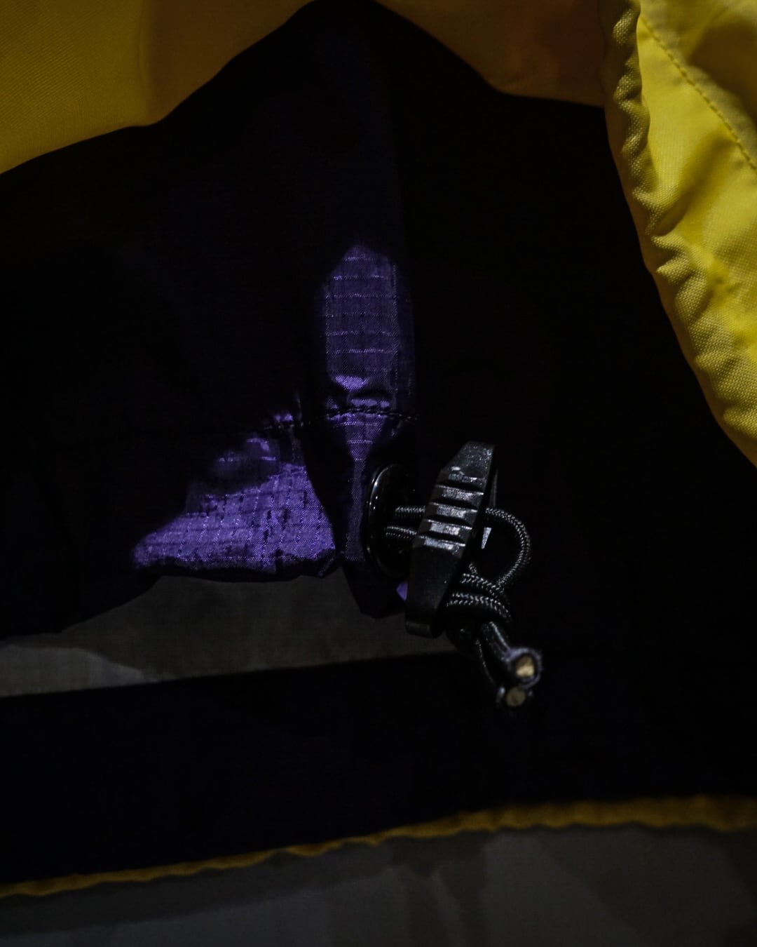 鮮やかなイエローボディに、首元にはパープルのリップストップナイロンを切り替えた配色が秀逸。フロントにはジップ付きのメッシュポケットを配置し、アクセントと実用性を兼ね備えたディテールに仕上がっています。