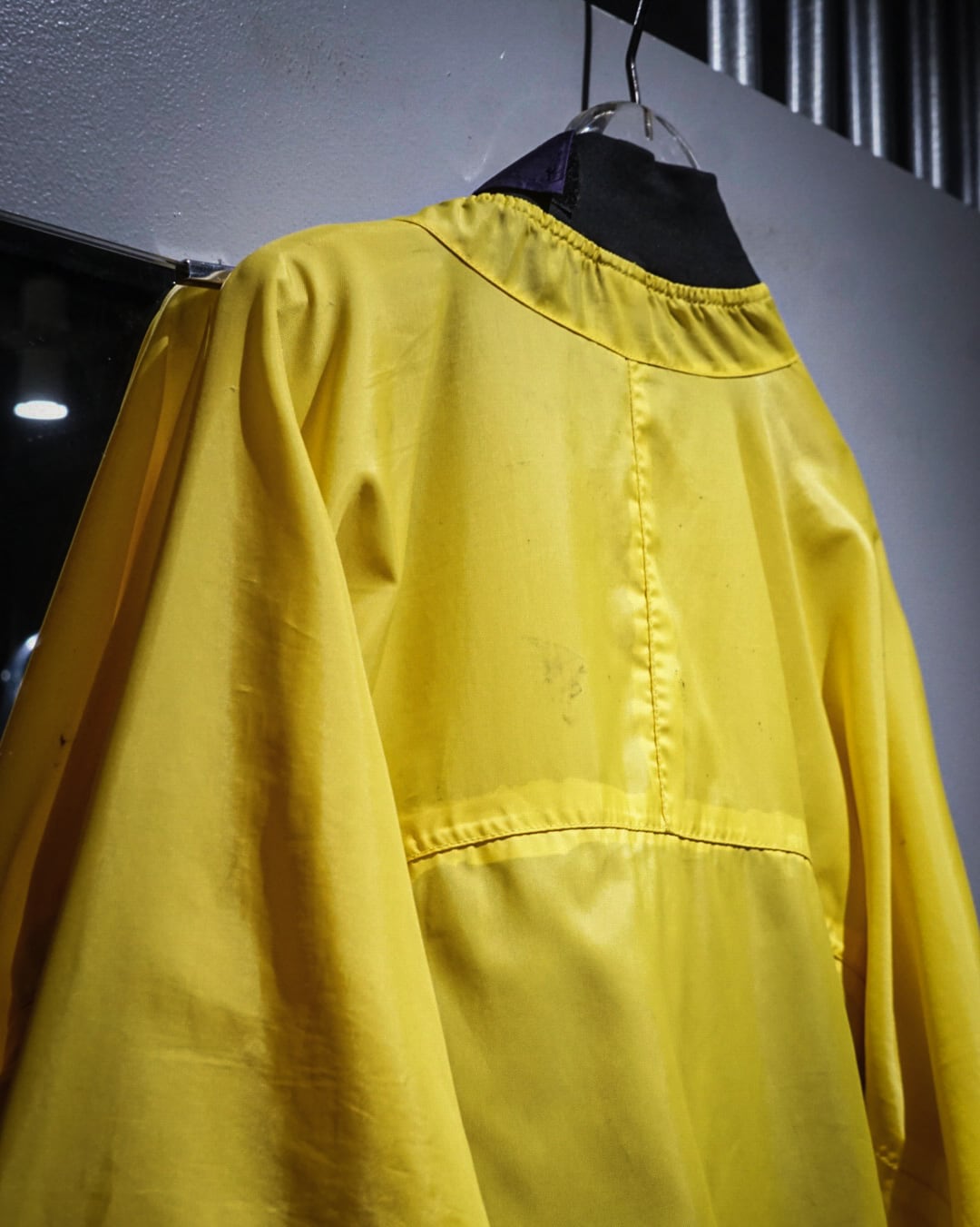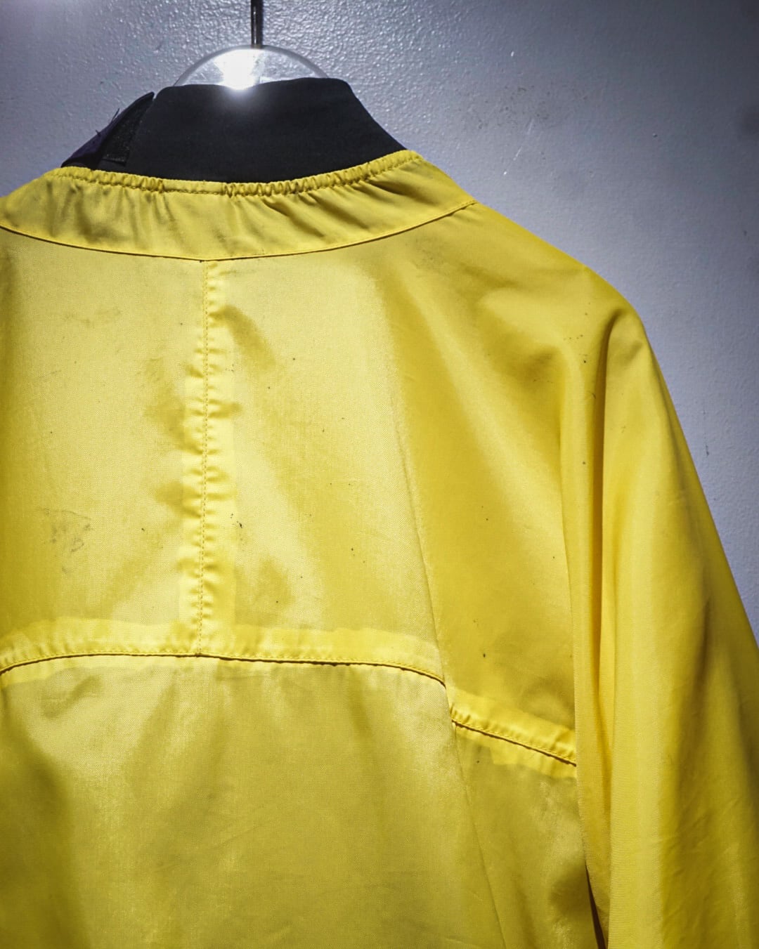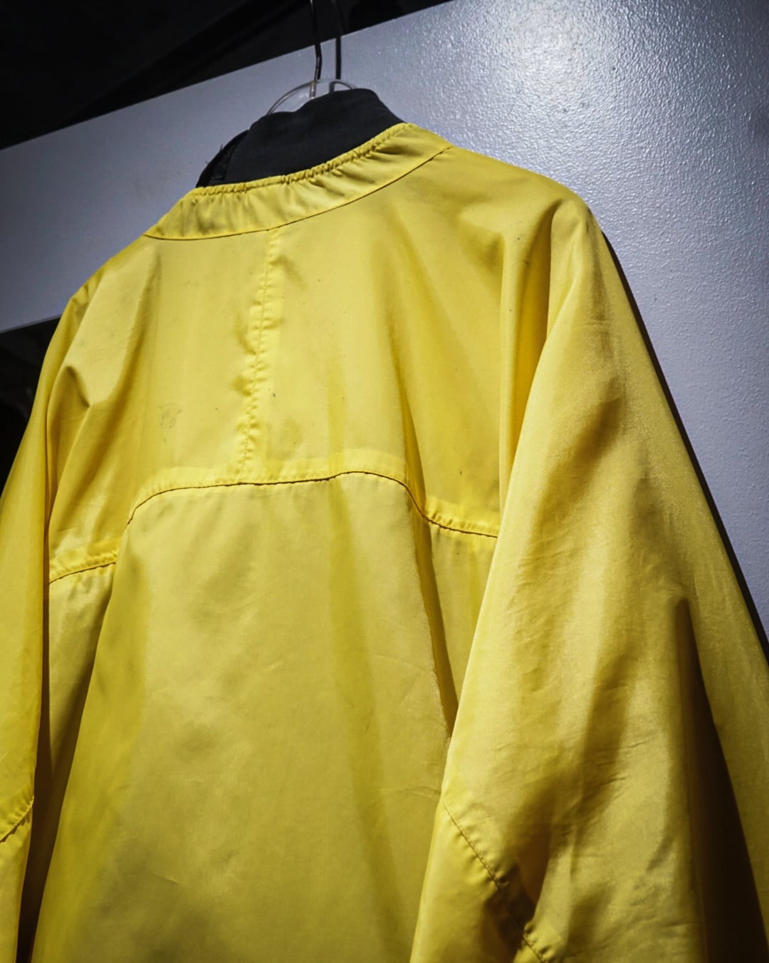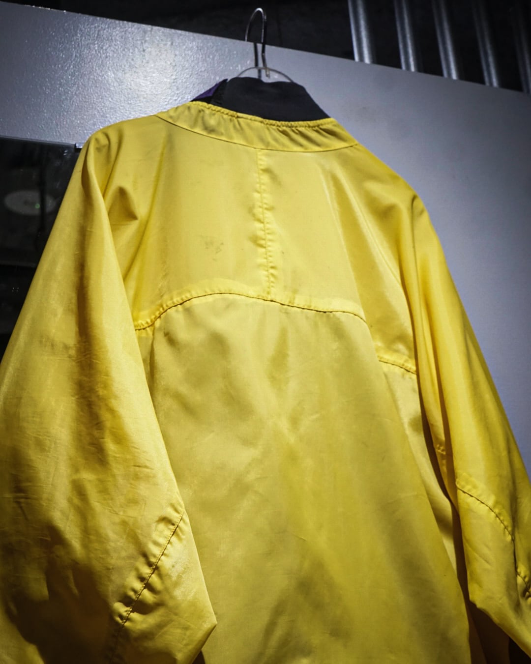 鮮やかなイエローボディに、首元にはパープルのリップストップナイロンを切り替えた配色が秀逸。フロントにはジップ付きのメッシュポケットを配置し、アクセントと実用性を兼ね備えたディテールに仕上がっています。