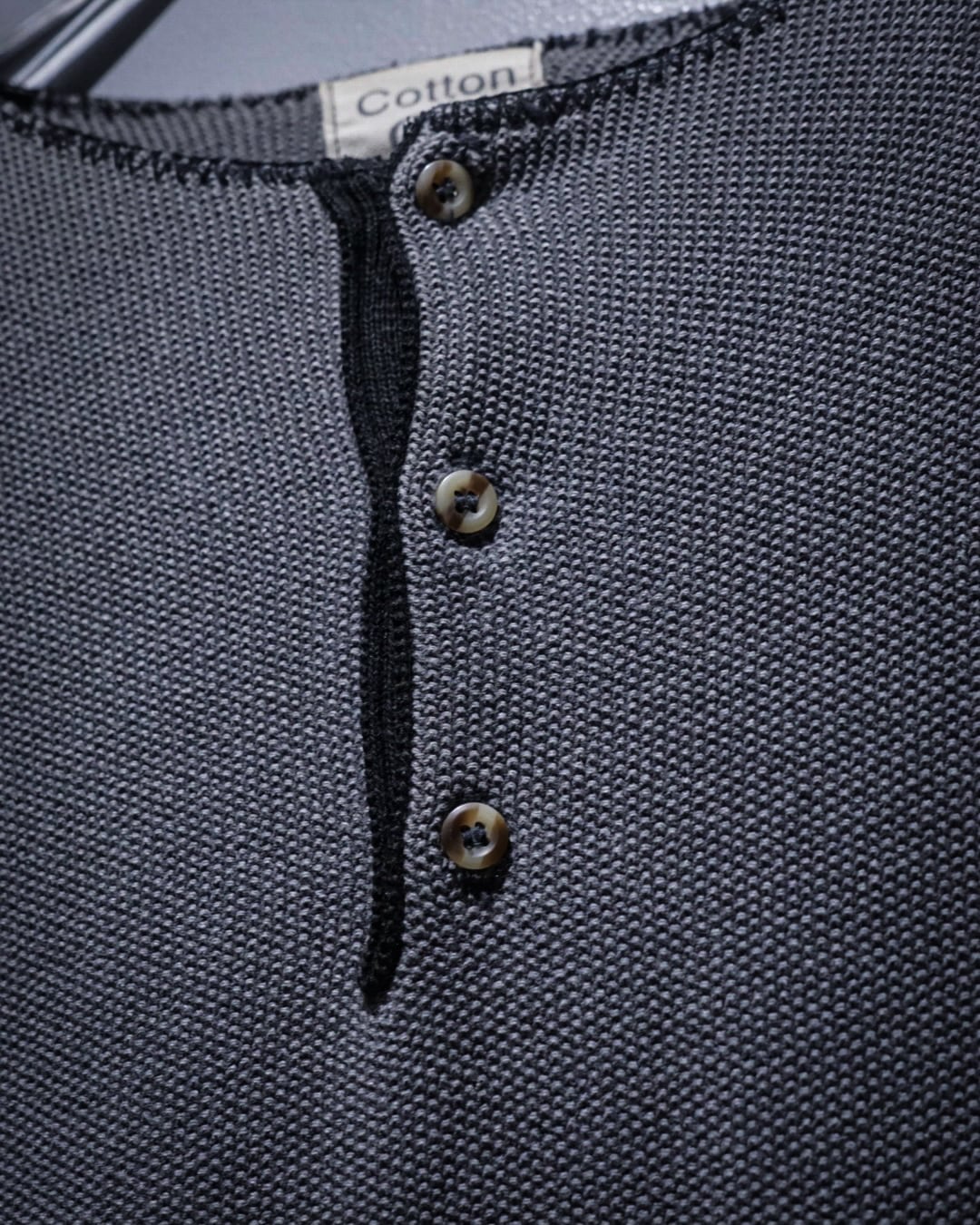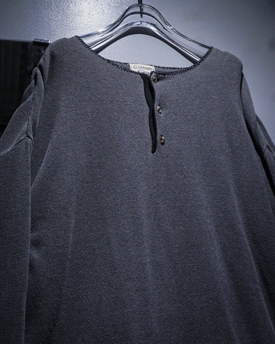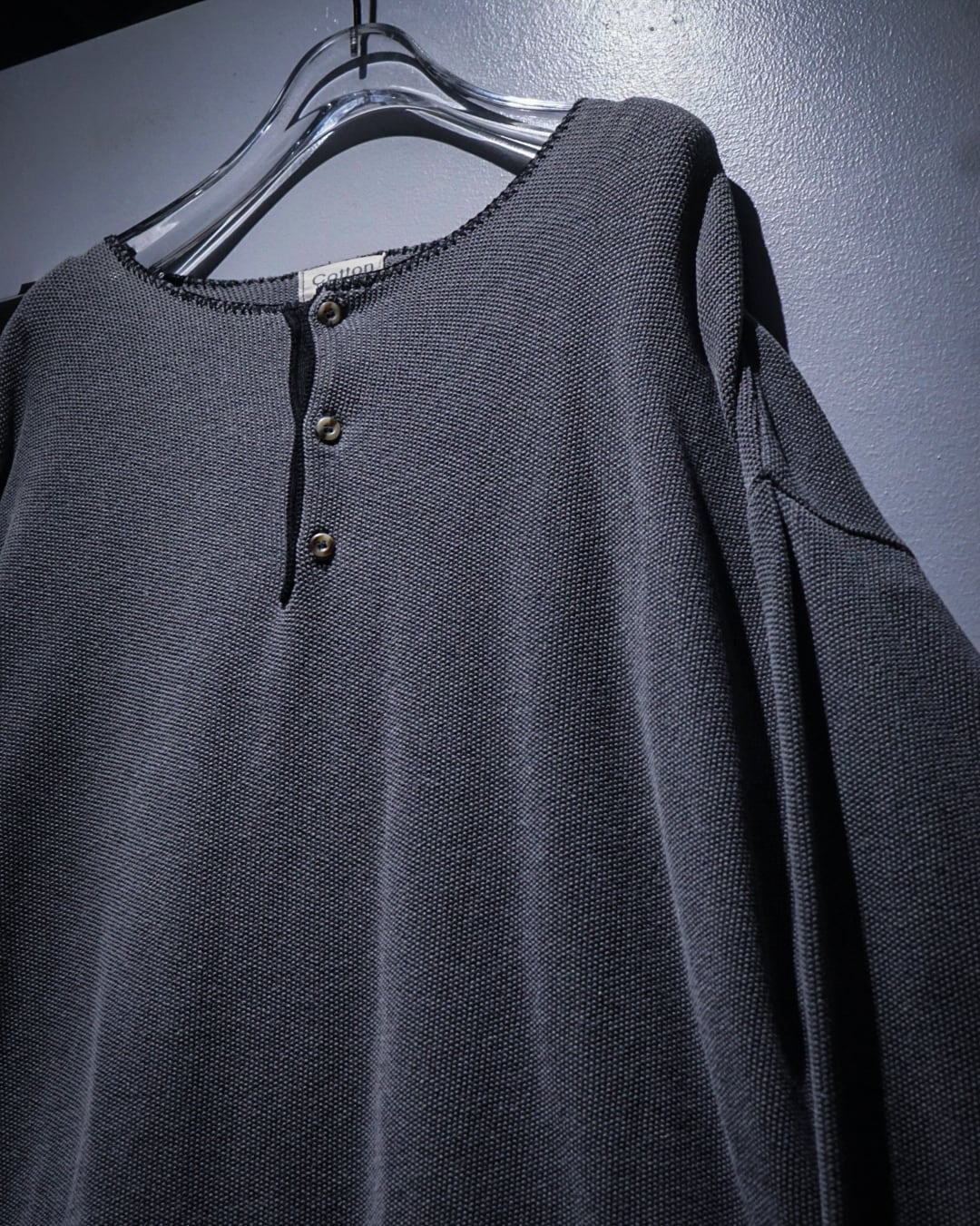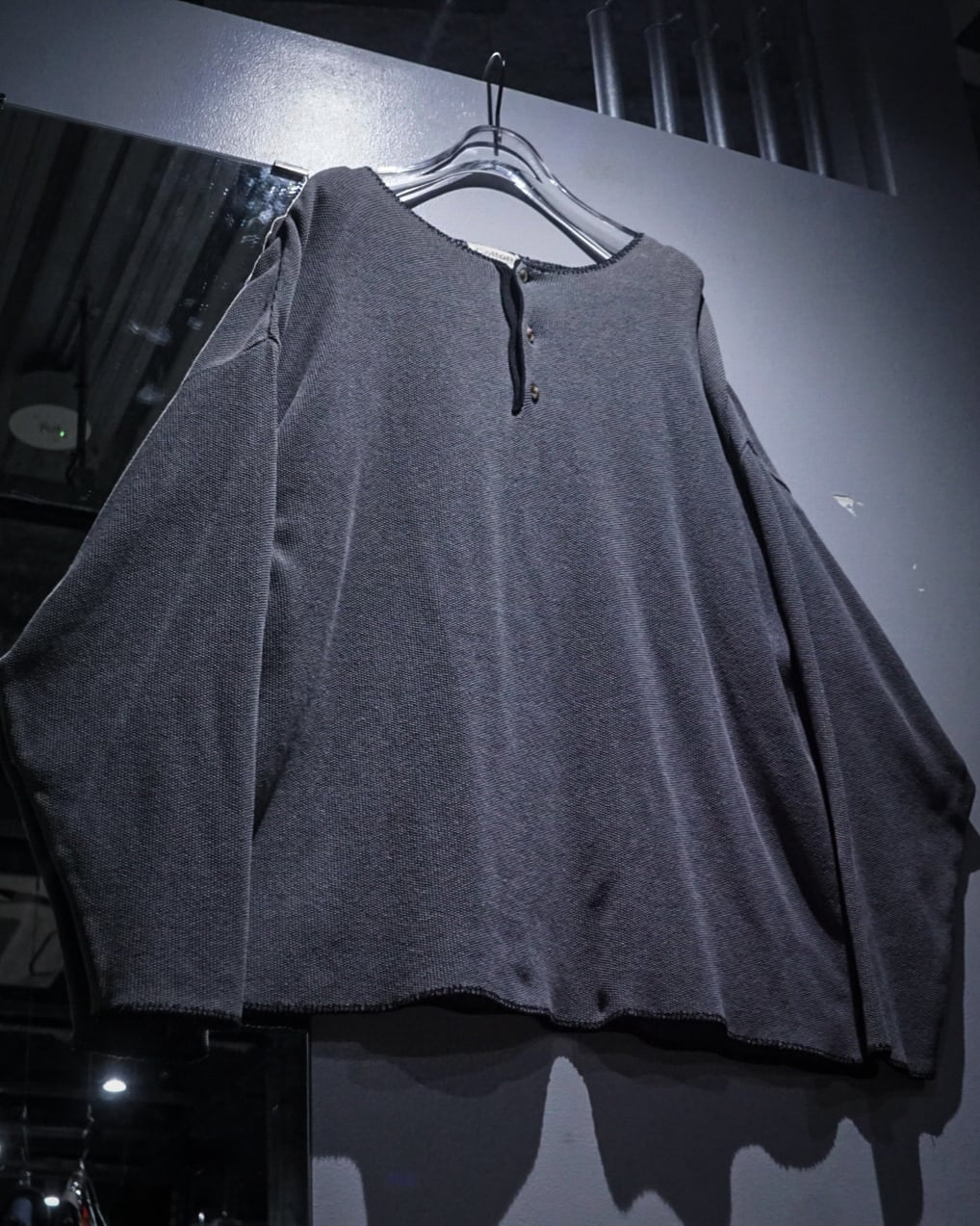 グレーのニットボディにヘンリーネック仕様で、ネックや裾のラフな処理も相まり緩さを持ちつつ洒落感と雰囲気を持った一着。