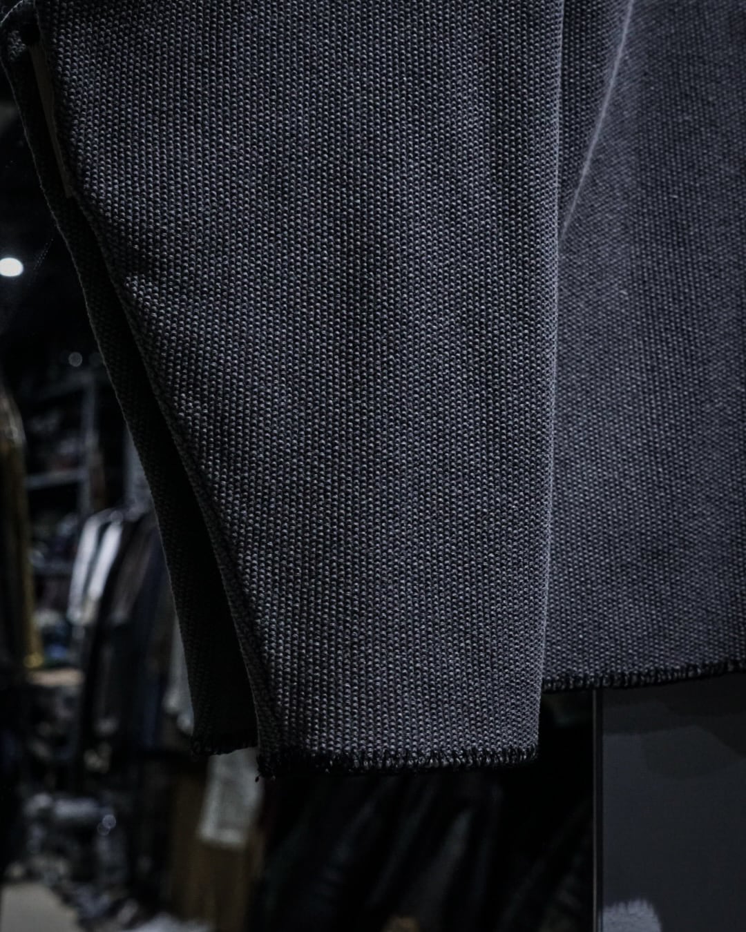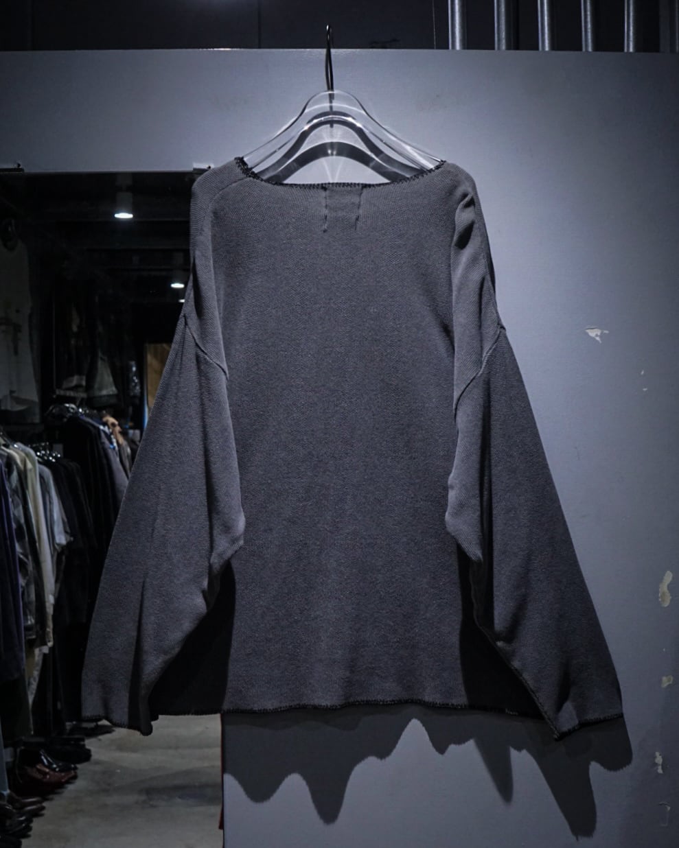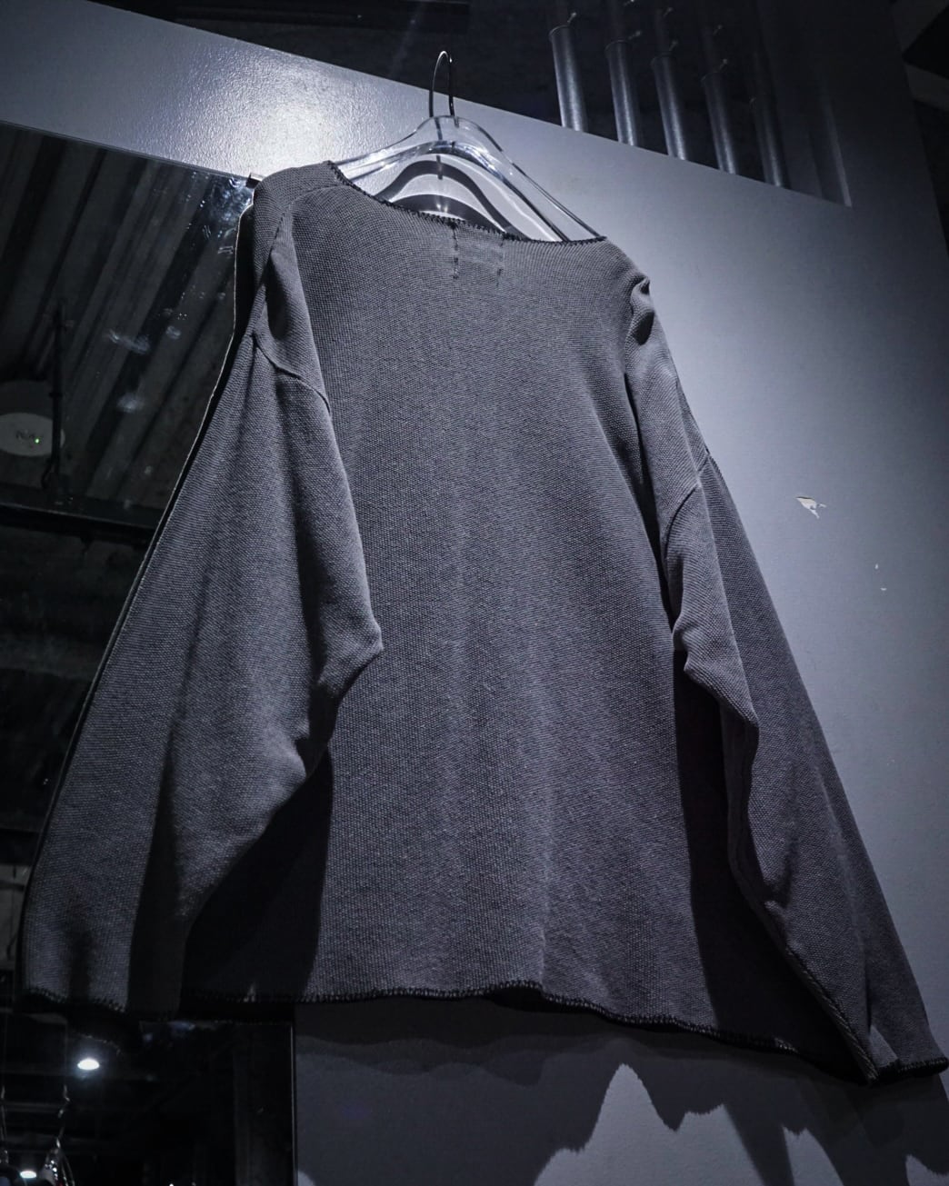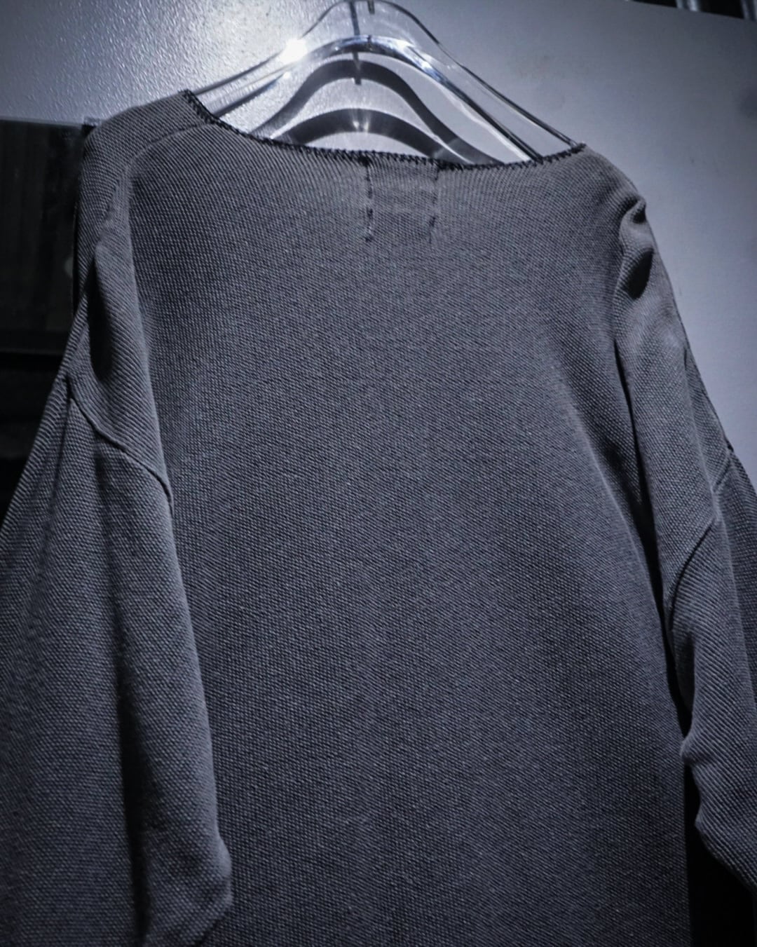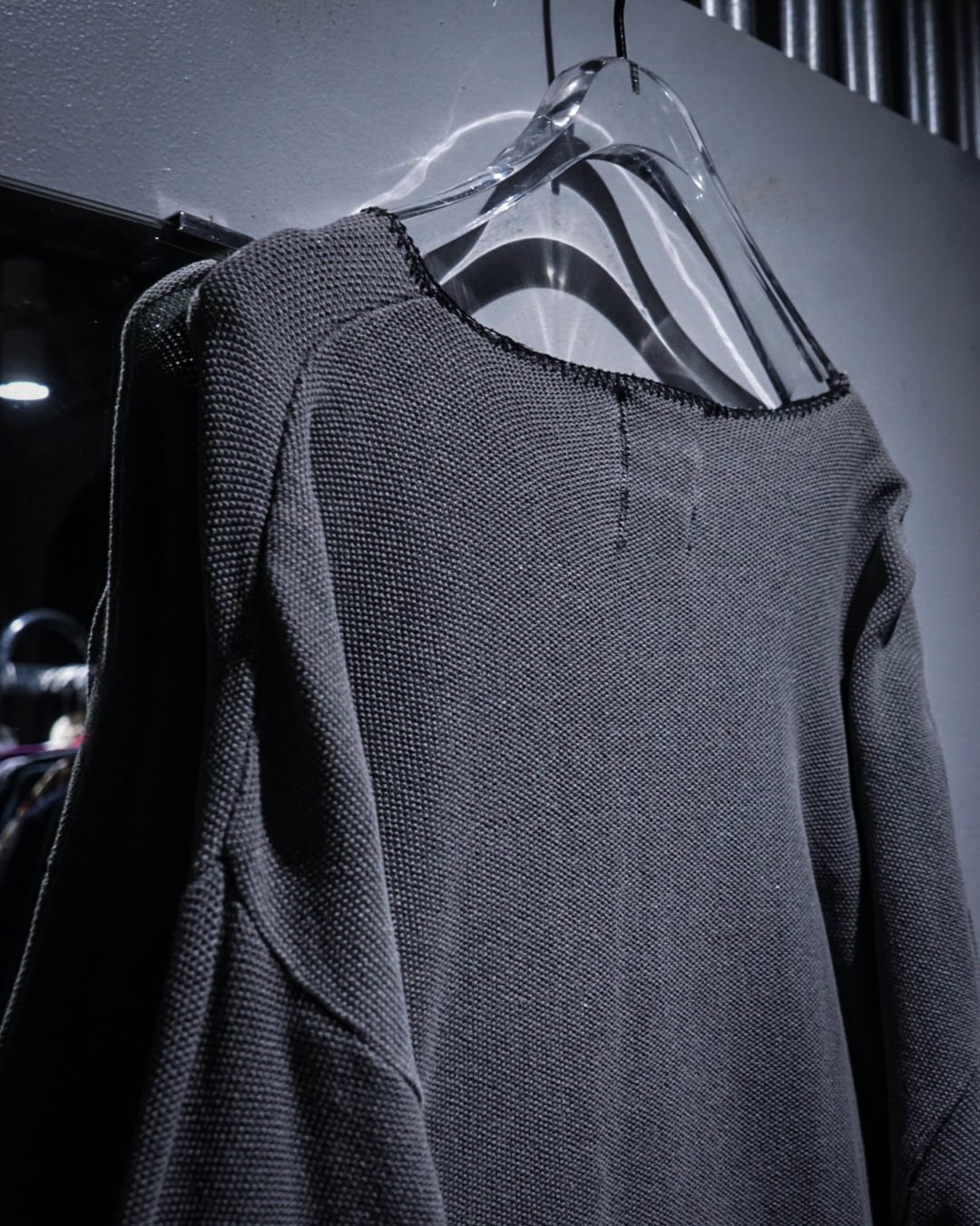 グレーのニットボディにヘンリーネック仕様で、ネックや裾のラフな処理も相まり緩さを持ちつつ洒落感と雰囲気を持った一着。