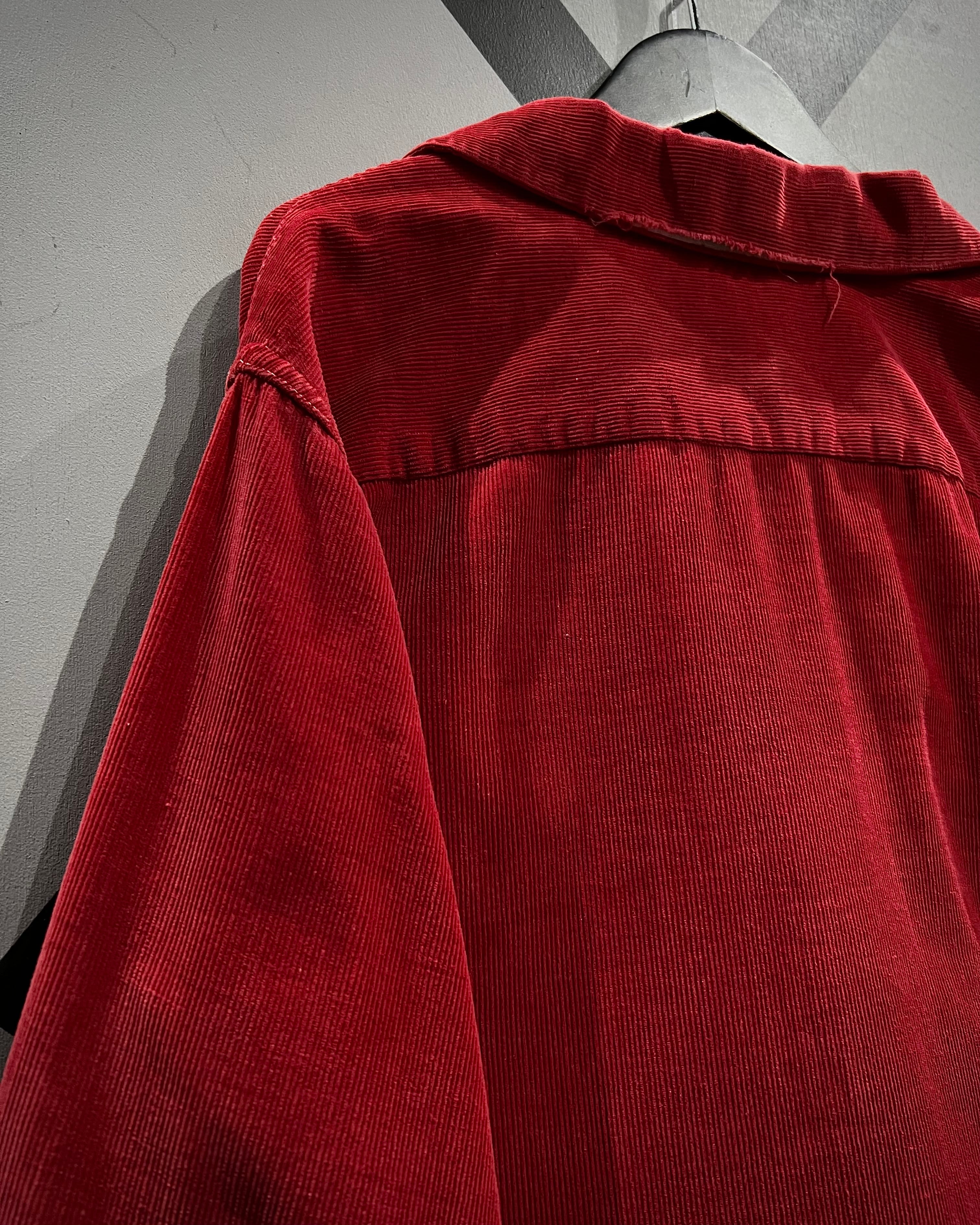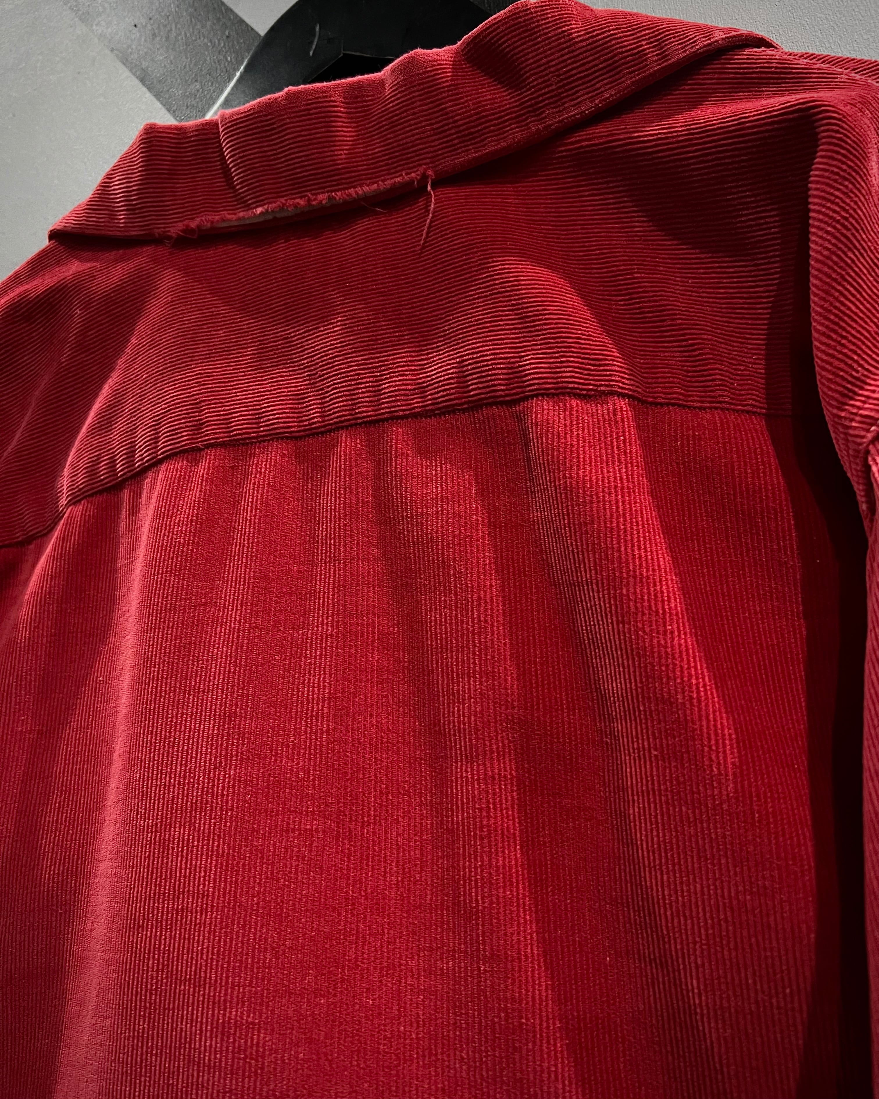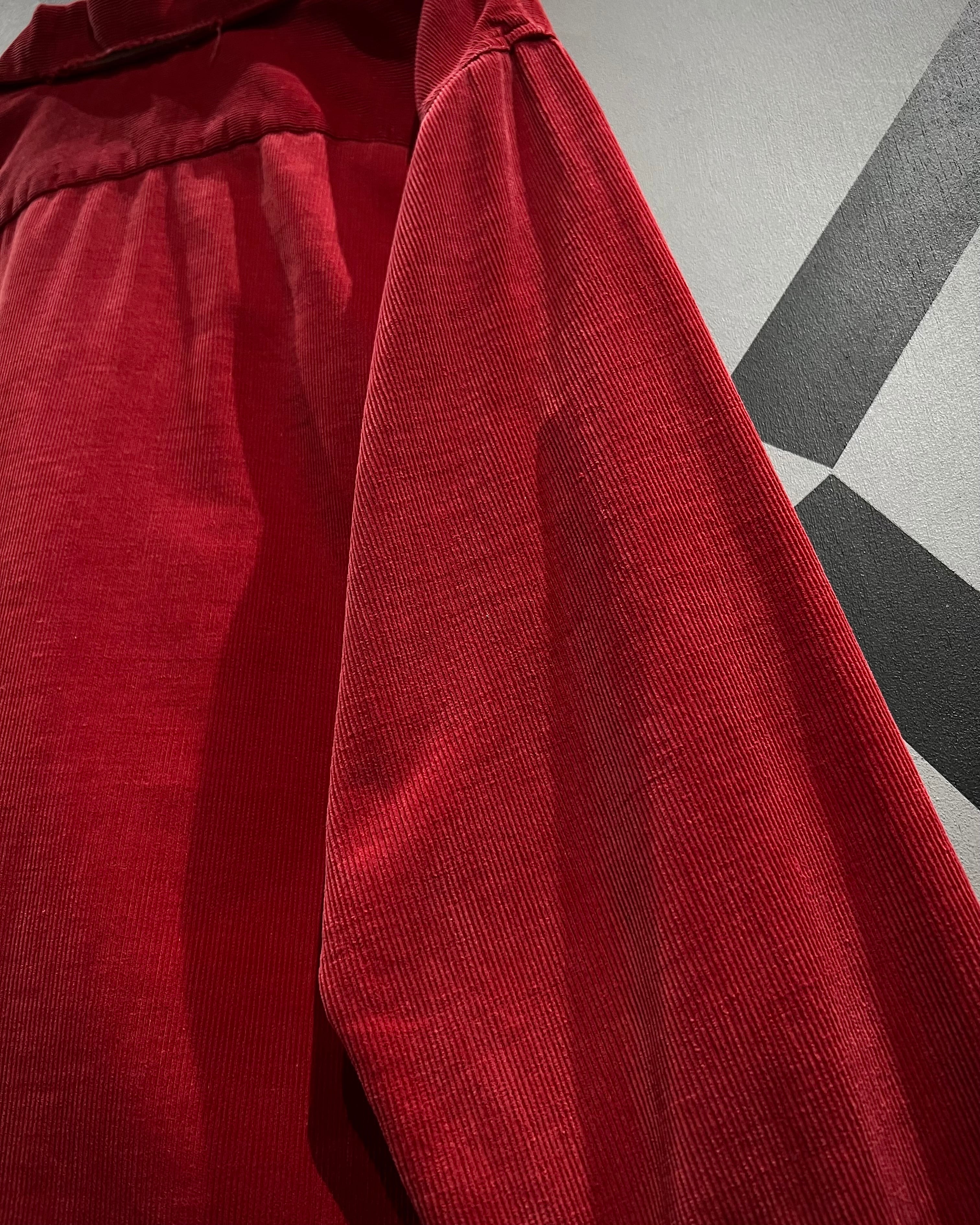 畝の立ったコーデュロイ生地を用いたボディは、柔らかさと温かみを兼ね備えつつ、深みのあるレッドカラーが視覚的なインパクトを演出。肩周りにはサテン生地の裏張りが施されており、当時らしい丁寧な作り込みと着心地への配慮が感じられる仕上がりとなっています。