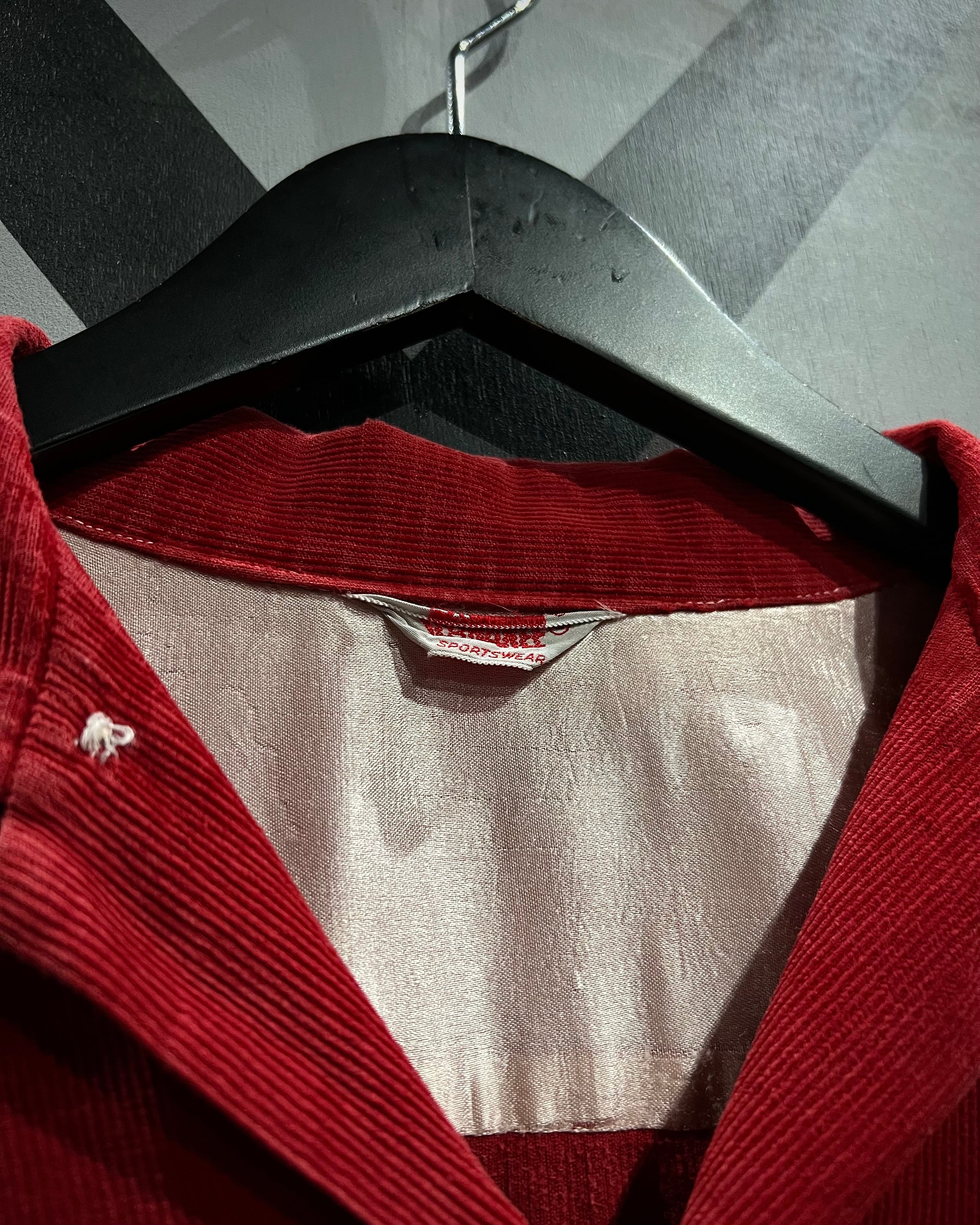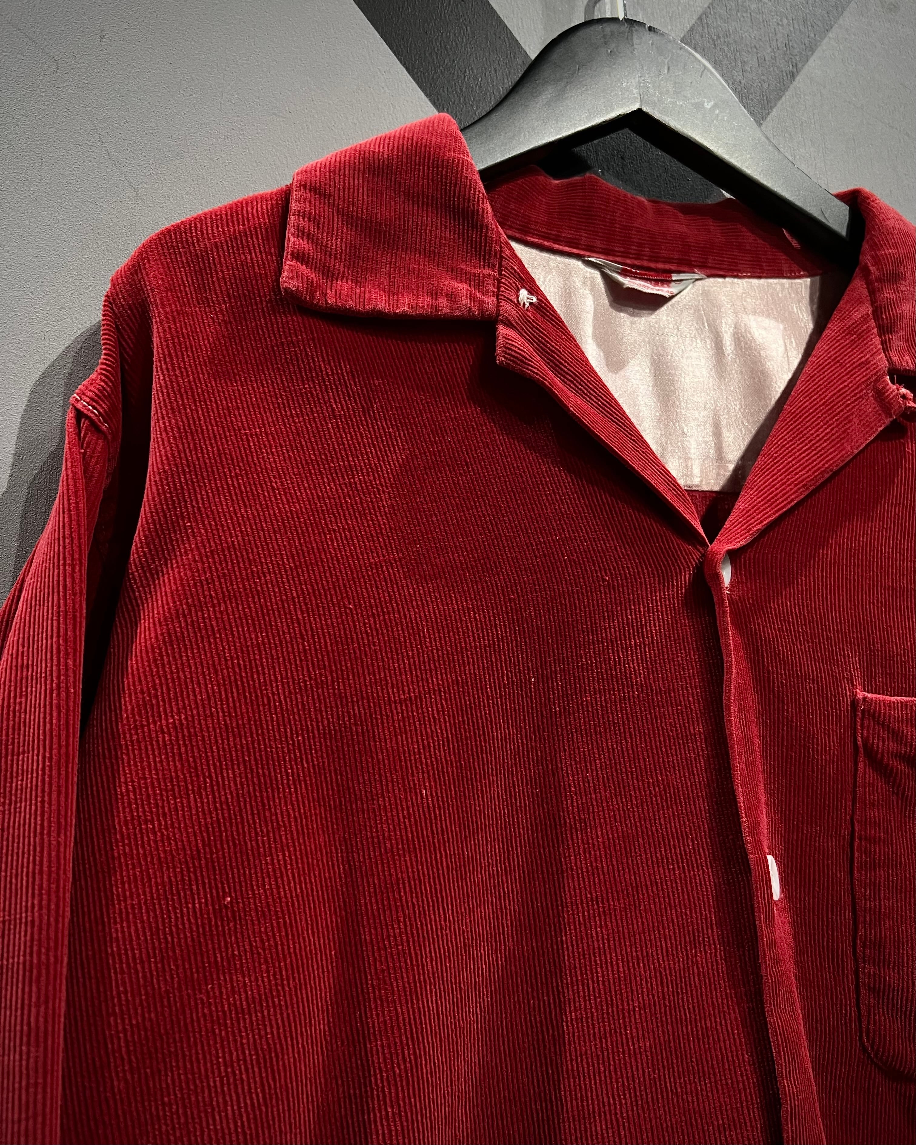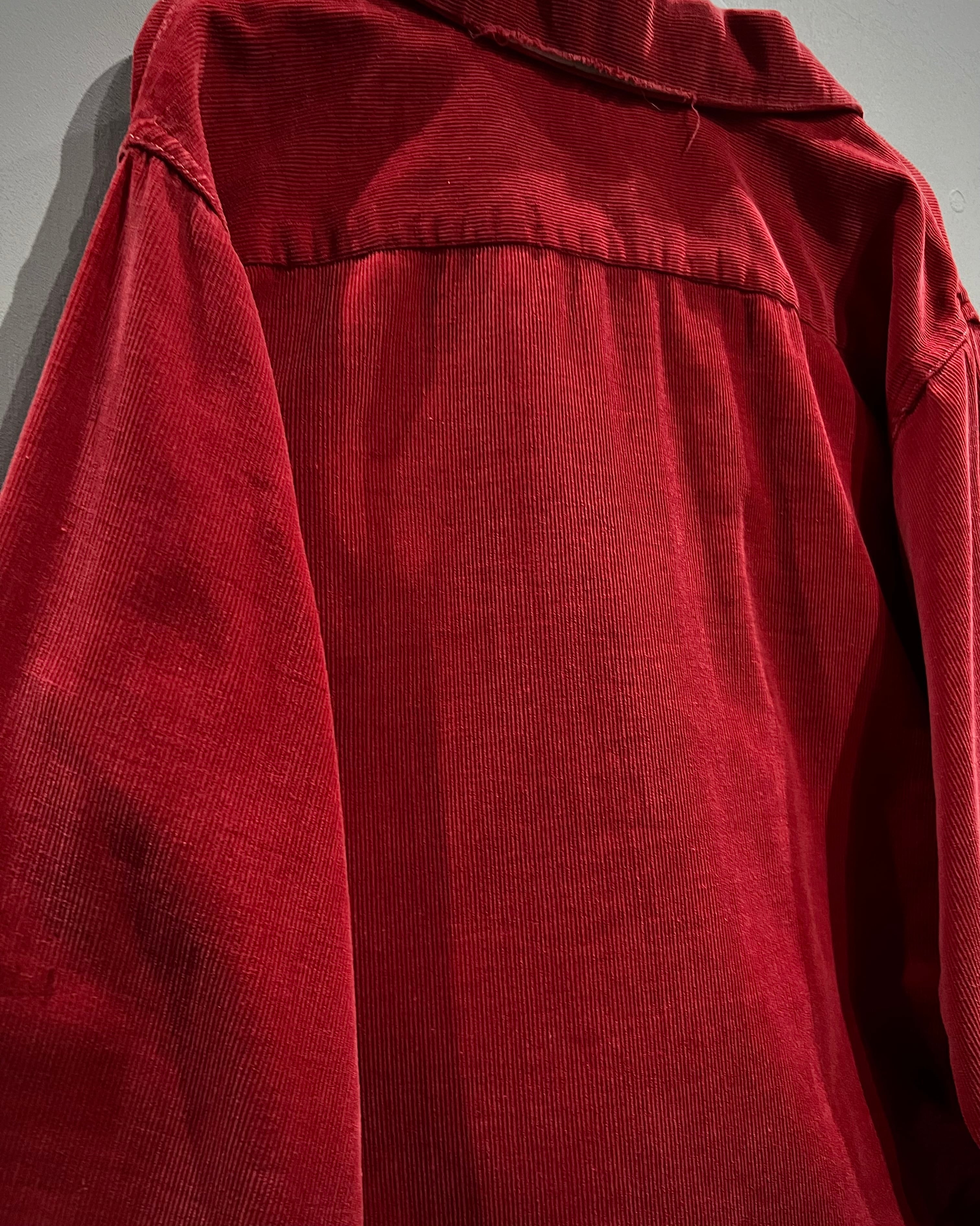畝の立ったコーデュロイ生地を用いたボディは、柔らかさと温かみを兼ね備えつつ、深みのあるレッドカラーが視覚的なインパクトを演出。肩周りにはサテン生地の裏張りが施されており、当時らしい丁寧な作り込みと着心地への配慮が感じられる仕上がりとなっています。