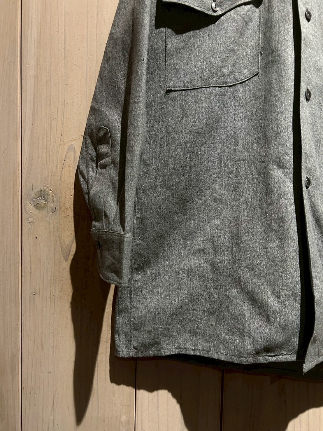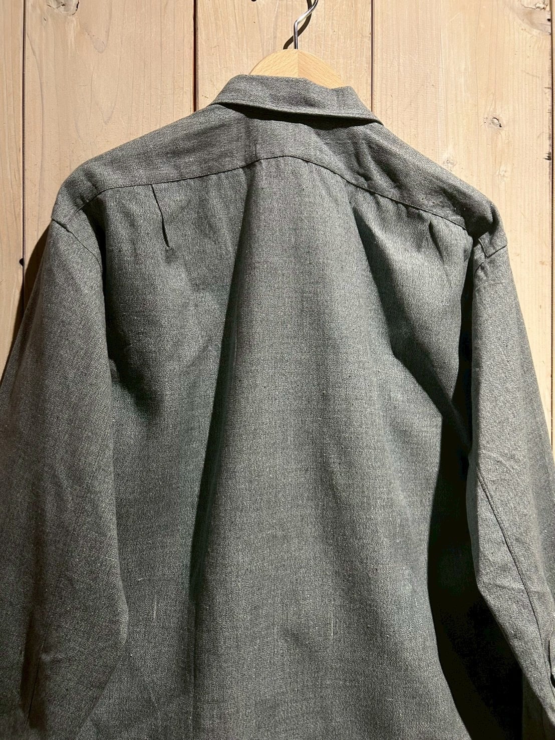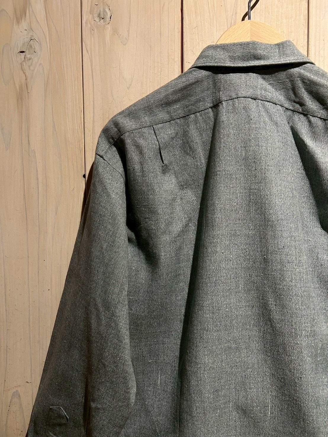 生地にはハリのあるシャンブレーを使用し、細かな織りによる奥行きのあるグレートーンが魅力。着込むことで柔らかさと風合いが増していく、ヴィンテージならではの経年変化も楽しめる一着です。
