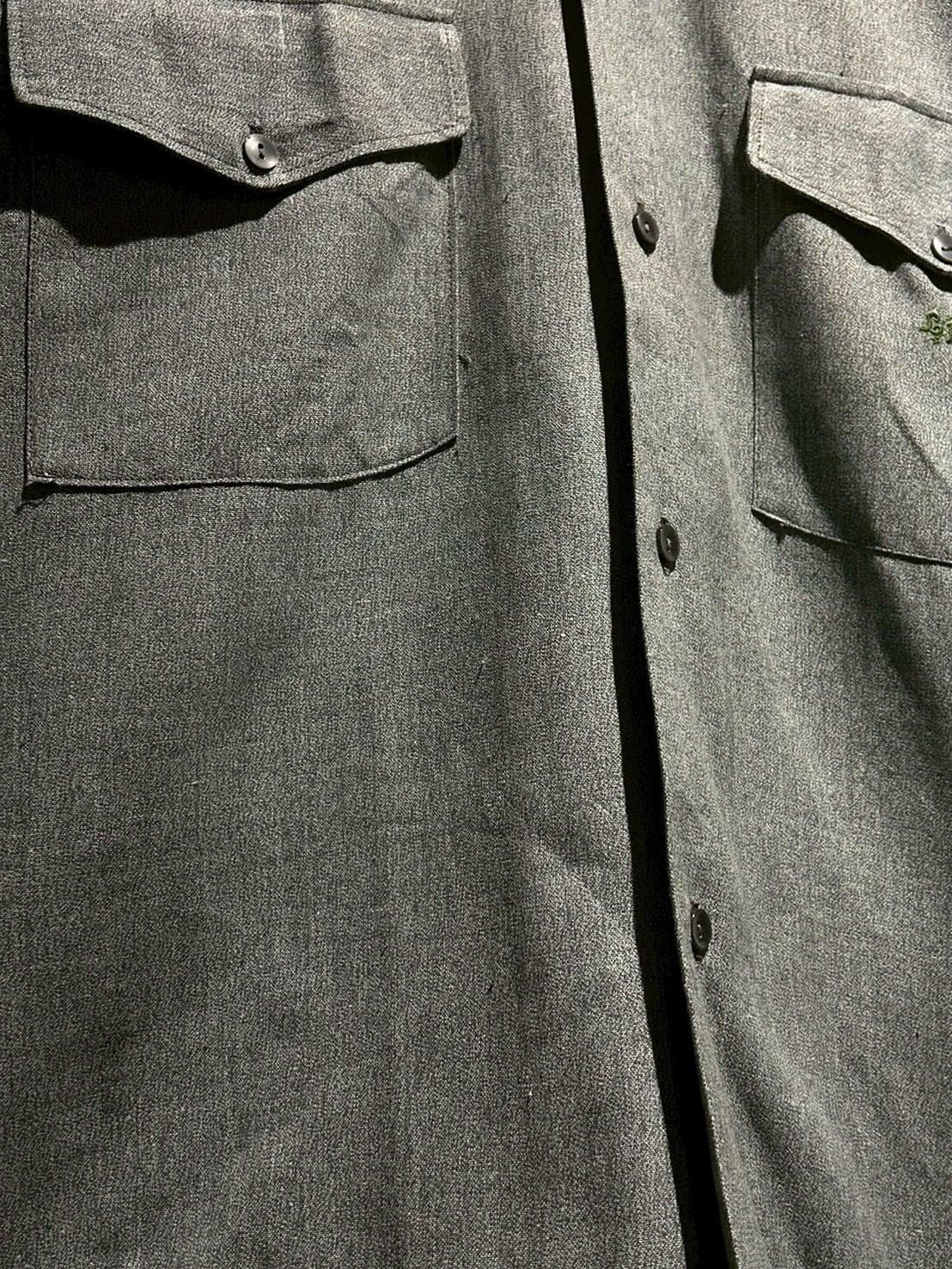 フロントにはフラップ付きのダブルポケットを配置し、実用性とデザイン性を兼備。襟にはしっかりと芯が入っており、ワークウェアながらもどこか端正な印象を与えるバランスの取れたディテールが特徴です。胸元にはさりげない刺繍が入り、シンプルな中に個性をプラス。