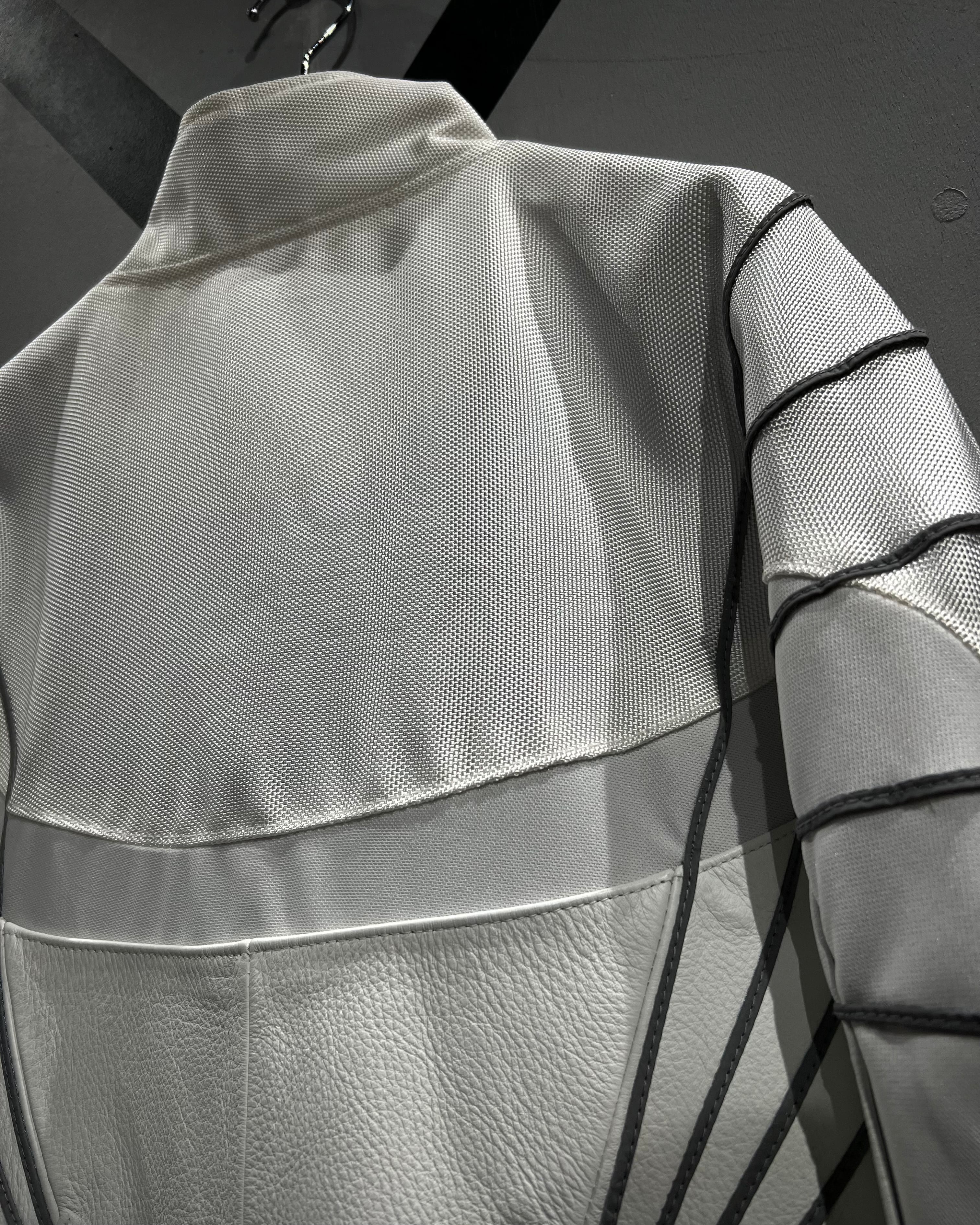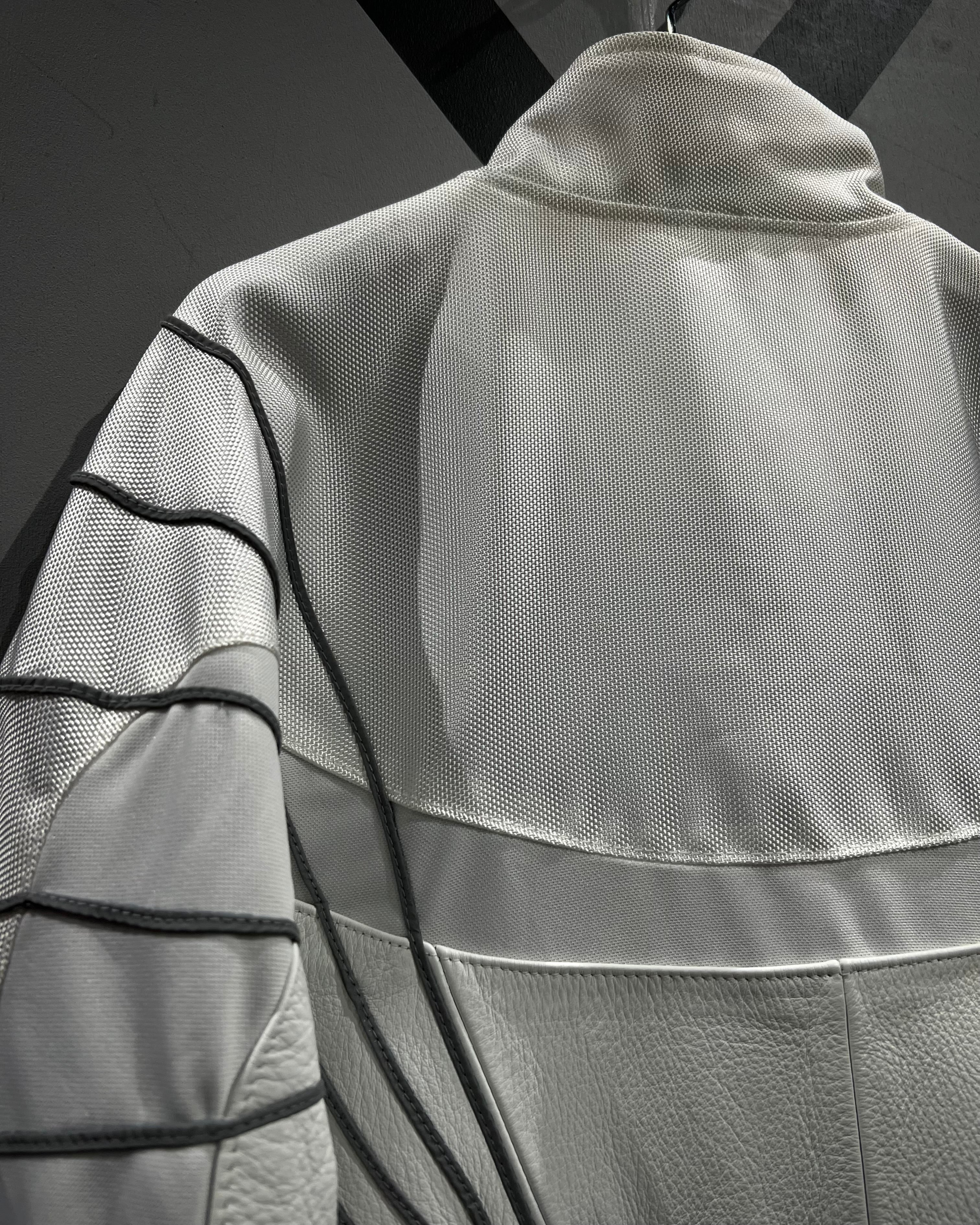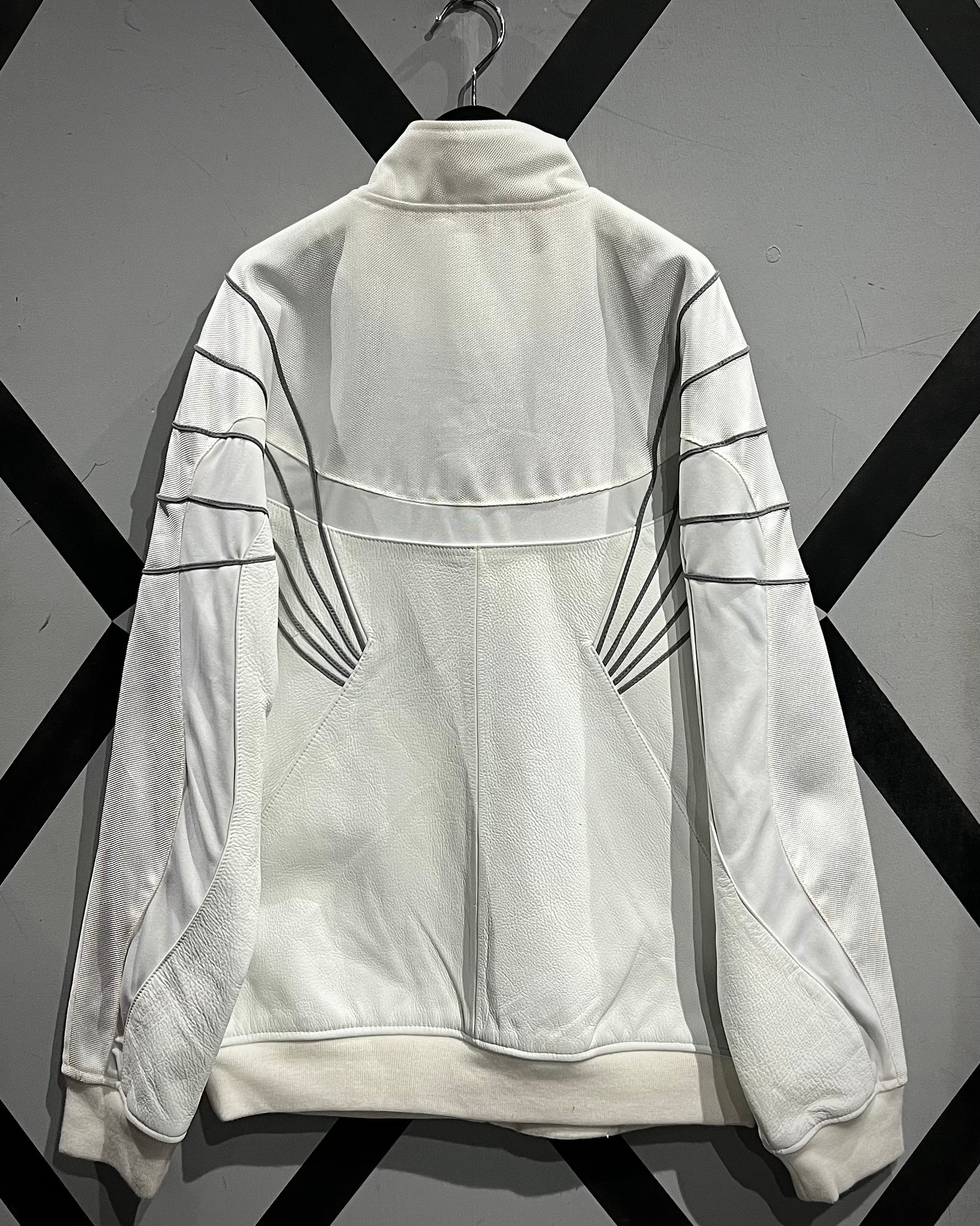光沢のあるナイロン生地をベースに構築されたボディは、三段階で巧みに切り替えられたパターンが特徴的。単色ながら奥行きを感じさせる立体的な表情に仕上がっており、洗練されたスポーツウェアの空気感を纏った一着です。