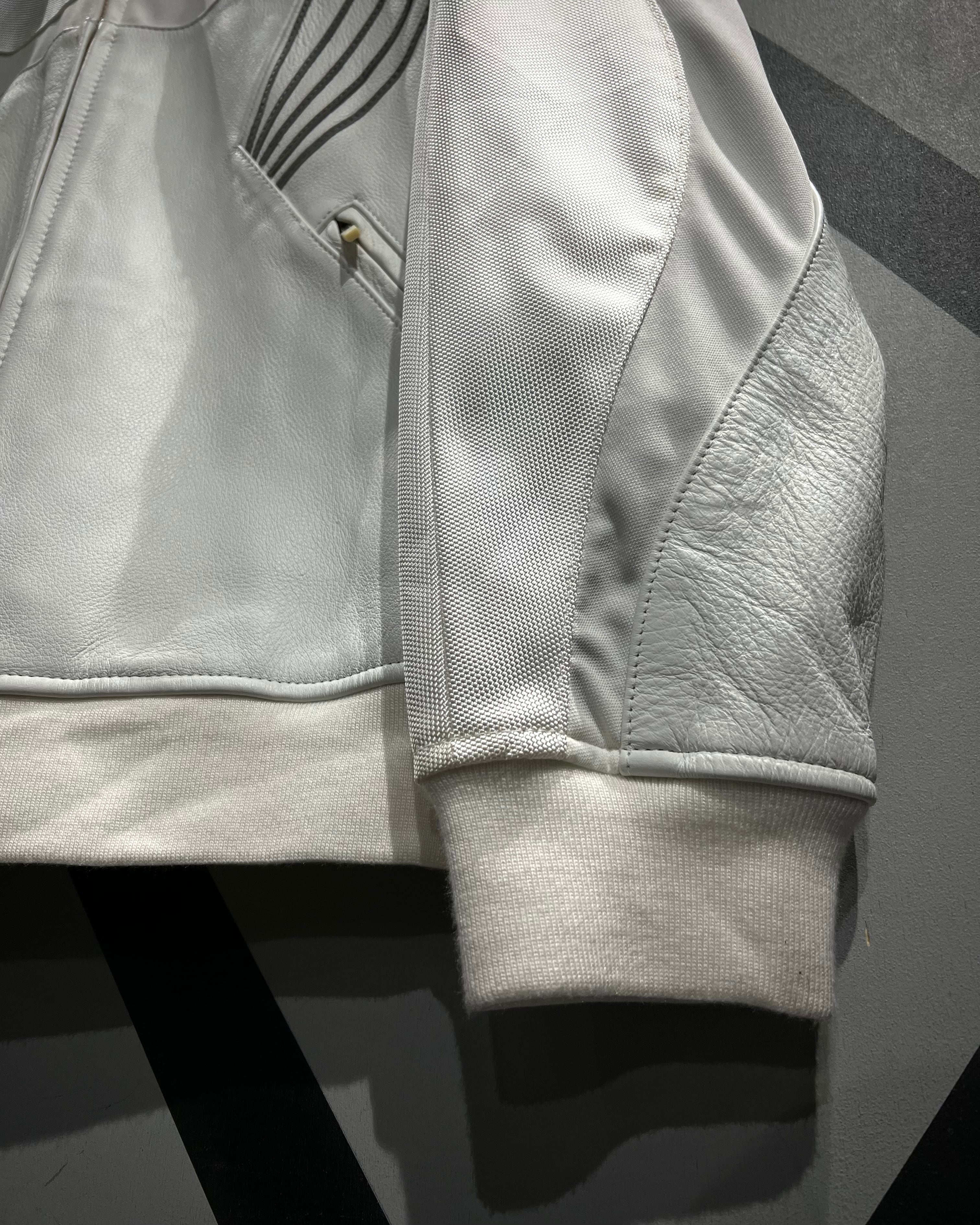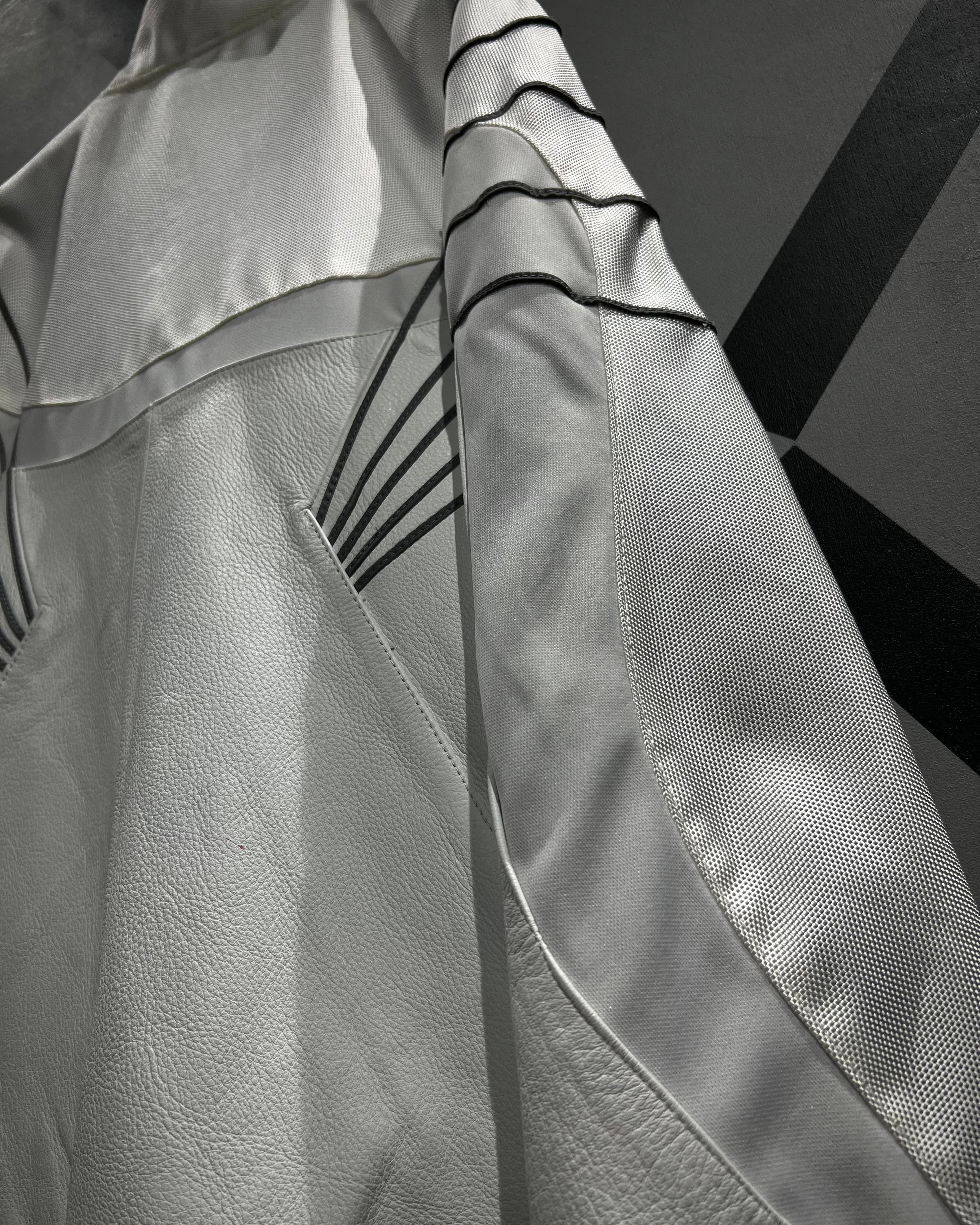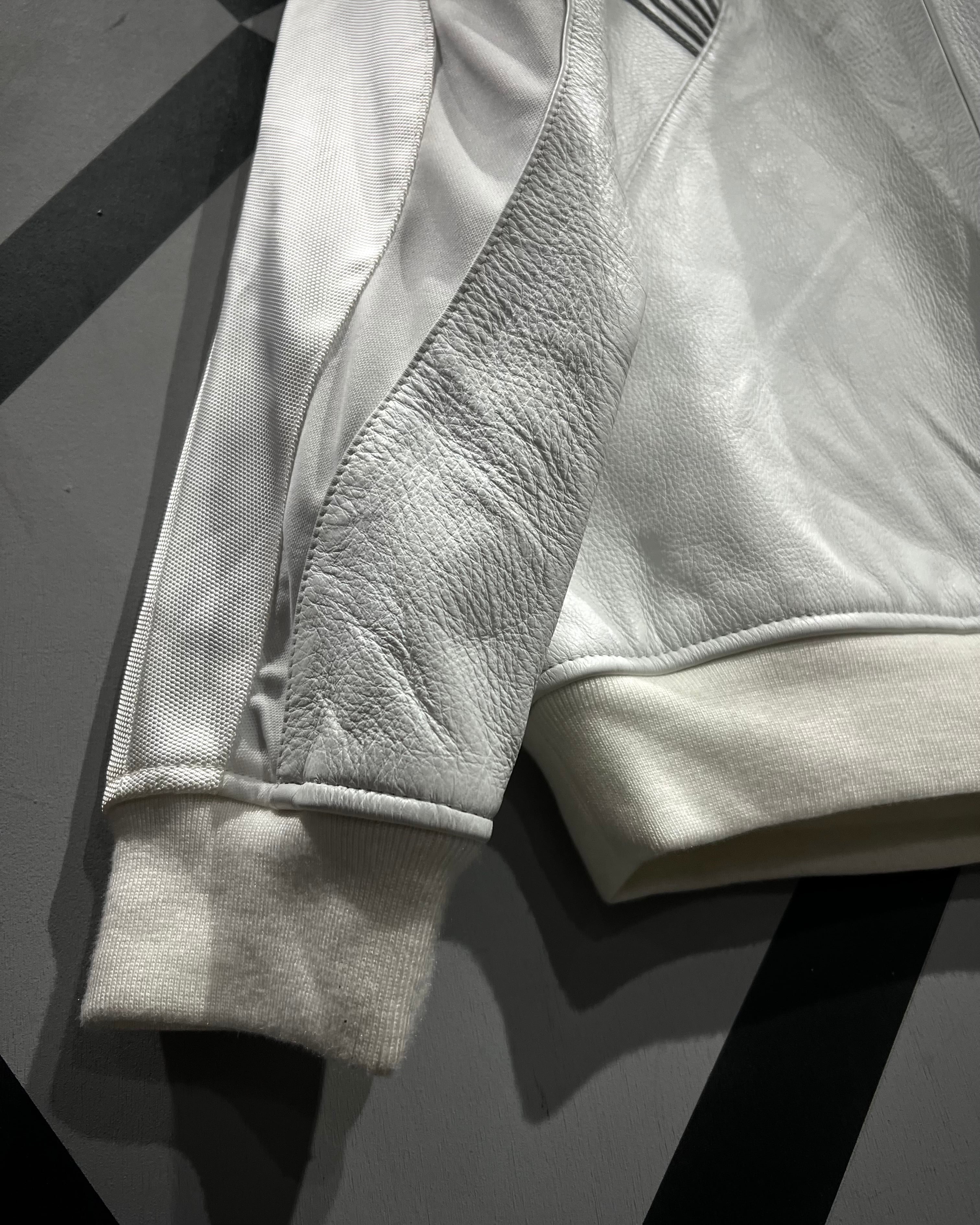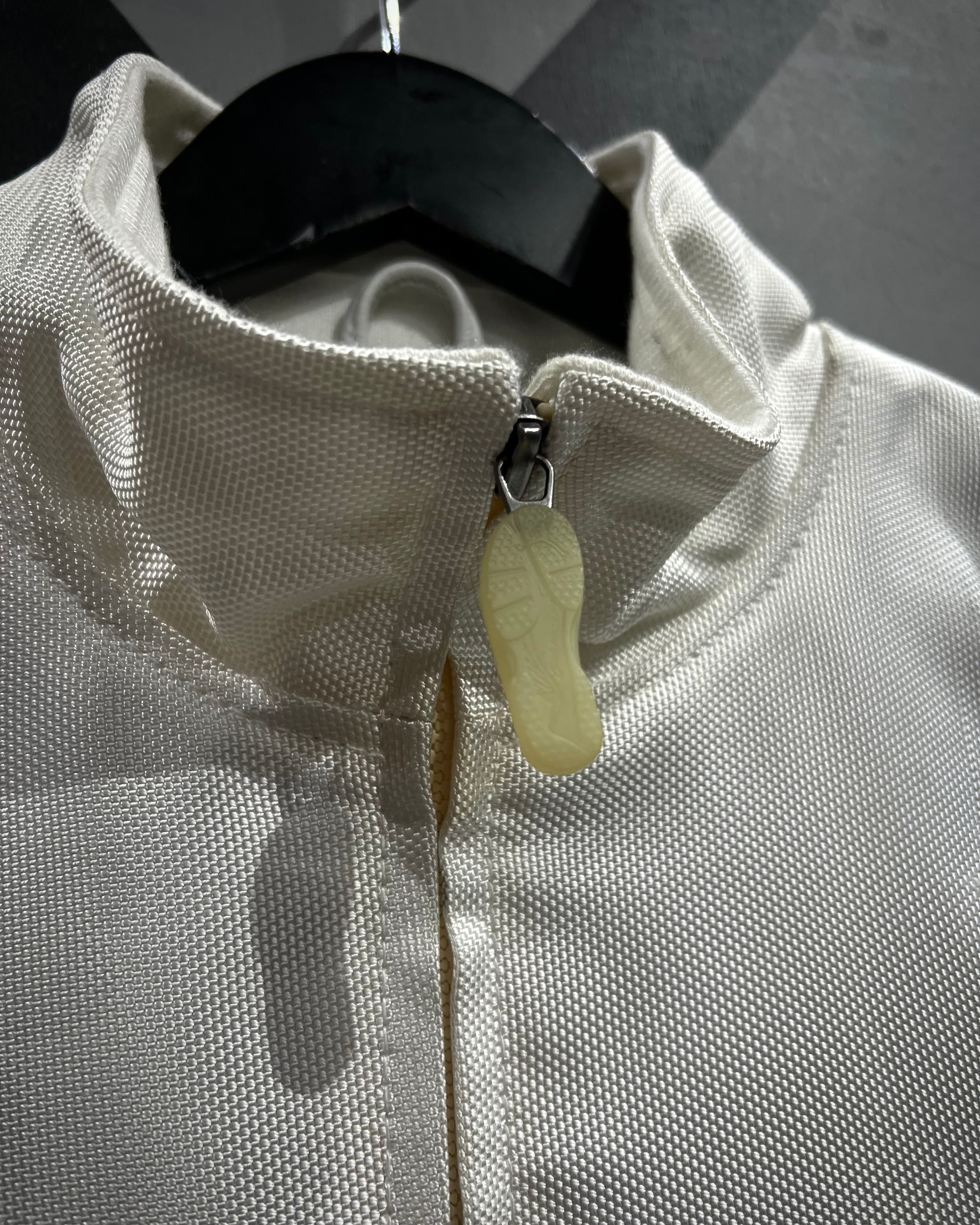 光沢のあるナイロン生地をベースに構築されたボディは、三段階で巧みに切り替えられたパターンが特徴的。単色ながら奥行きを感じさせる立体的な表情に仕上がっており、洗練されたスポーツウェアの空気感を纏った一着です。