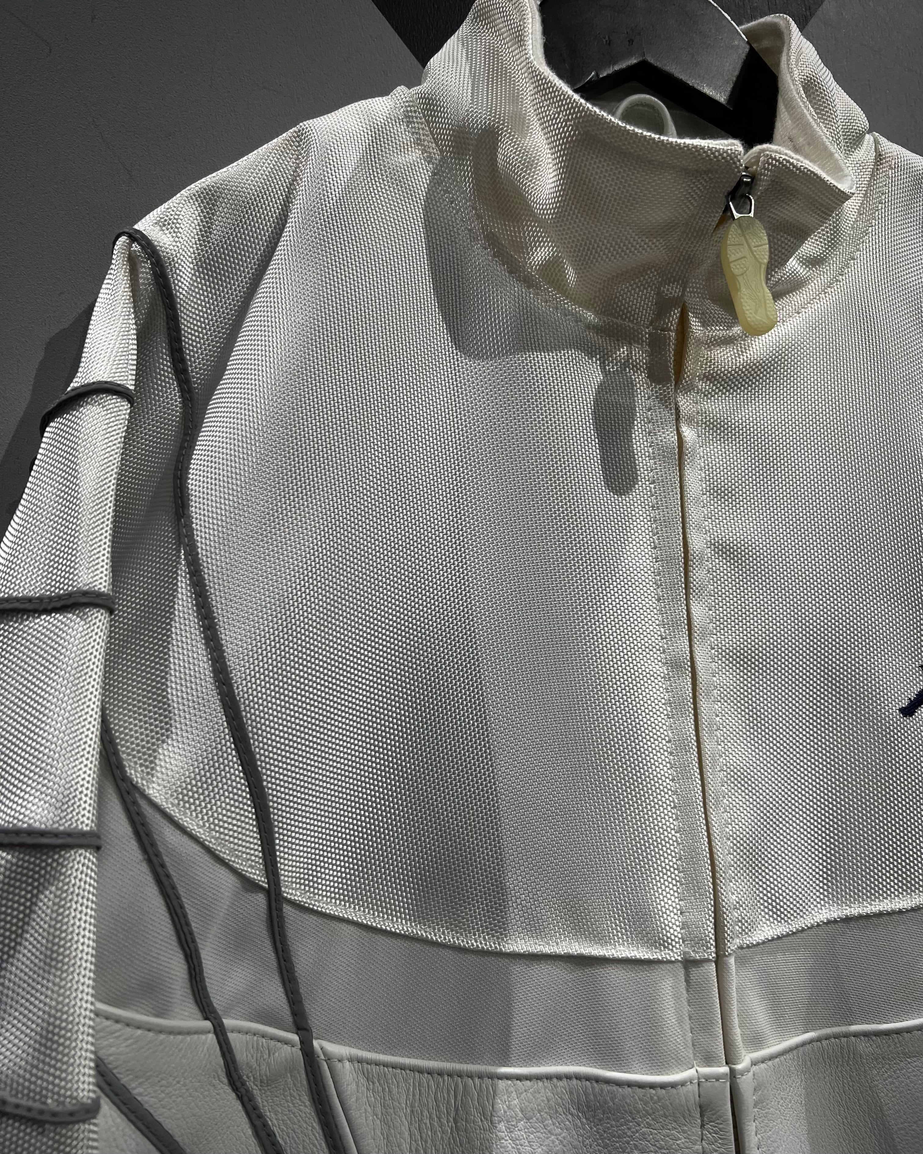 前面から背面にかけて流れるグレーのパイピングラインが視覚的なアクセントとなり、動きに合わせて美しいラインを描写。左胸にはアイコニックなジャンプマンロゴを配置し、ブランドの存在感をしっかりと主張。ハイネック仕様により首元の収まりも良く、細部まで抜かりのないデザインです。
