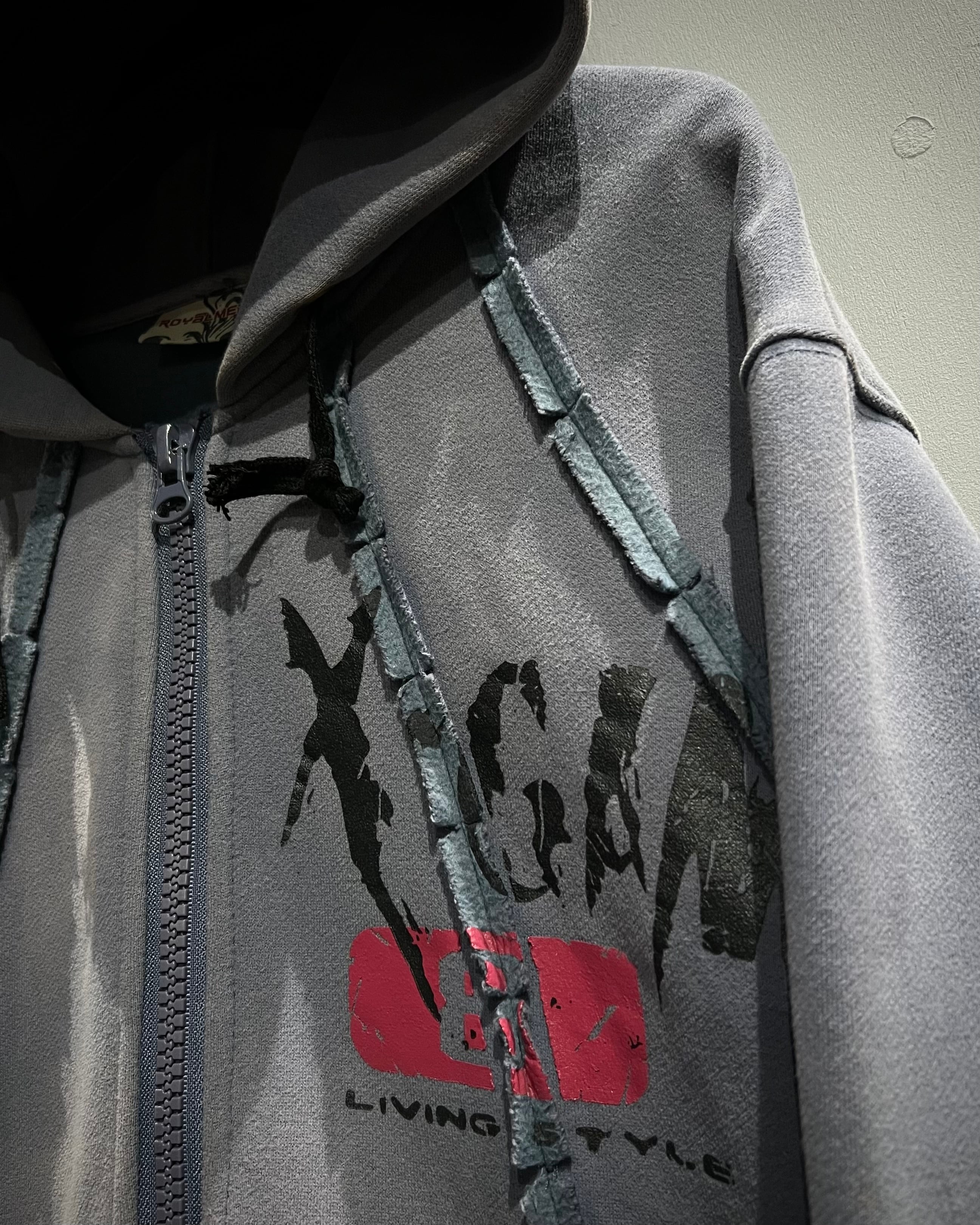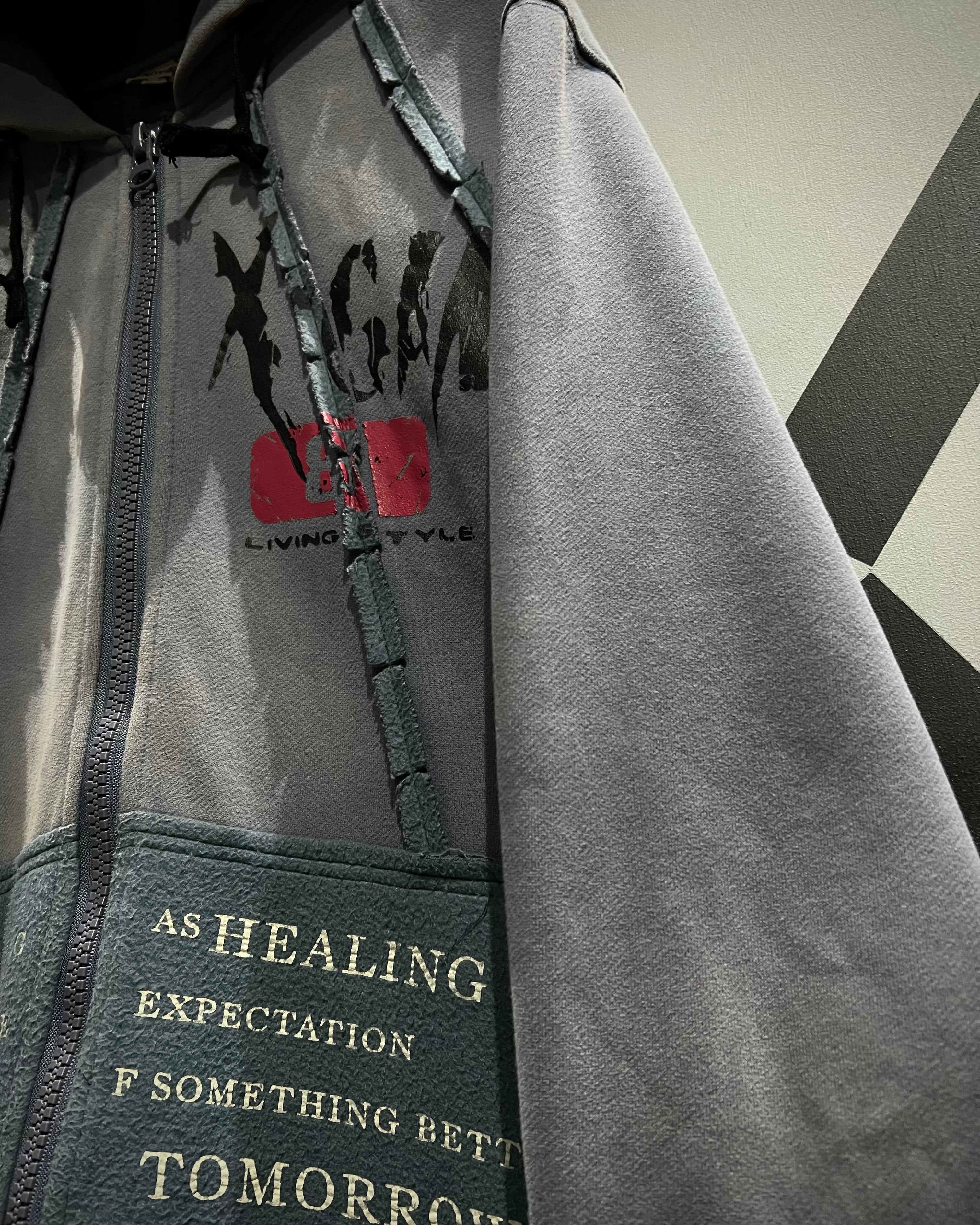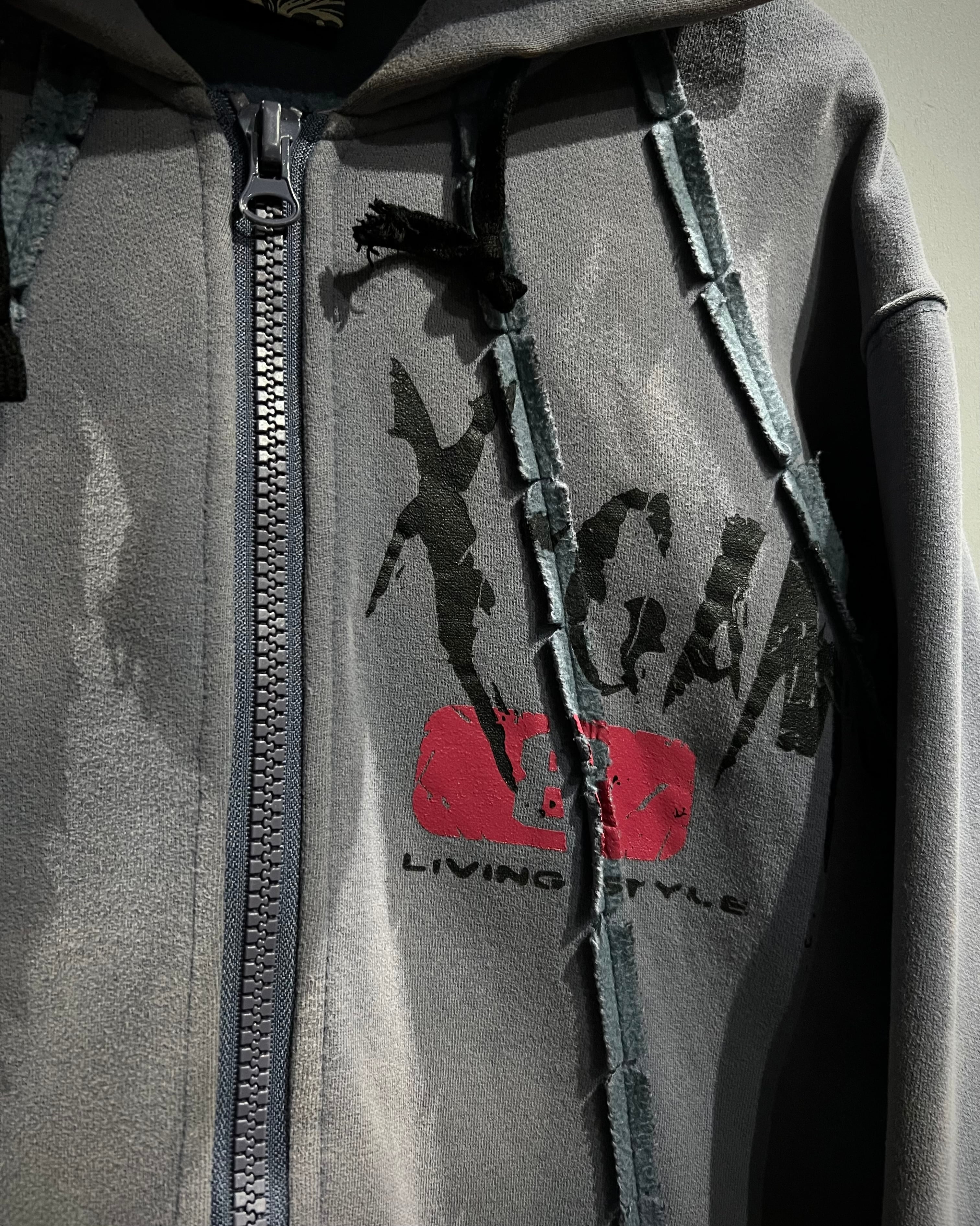 フロントにはプリントデザインを配置し、フード部分にはスローガン調のメッセージをオン。さらに、立体感のあるパッチをライン状にあしらうことで、フーディの枠を超えたデザイン性の高さが光ります。ジップ仕様で着脱もしやすく、機能性面も申し分ない仕上がりです。