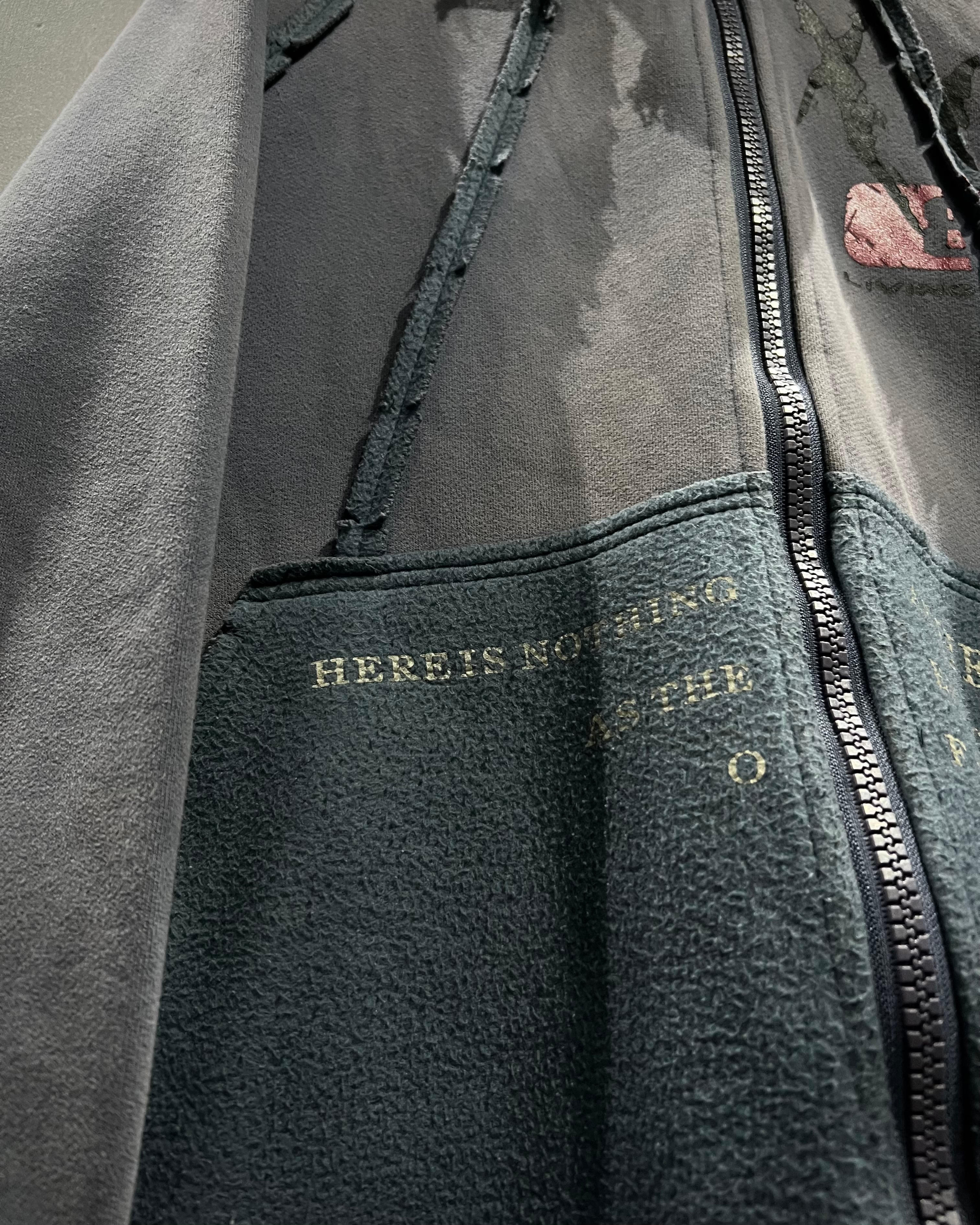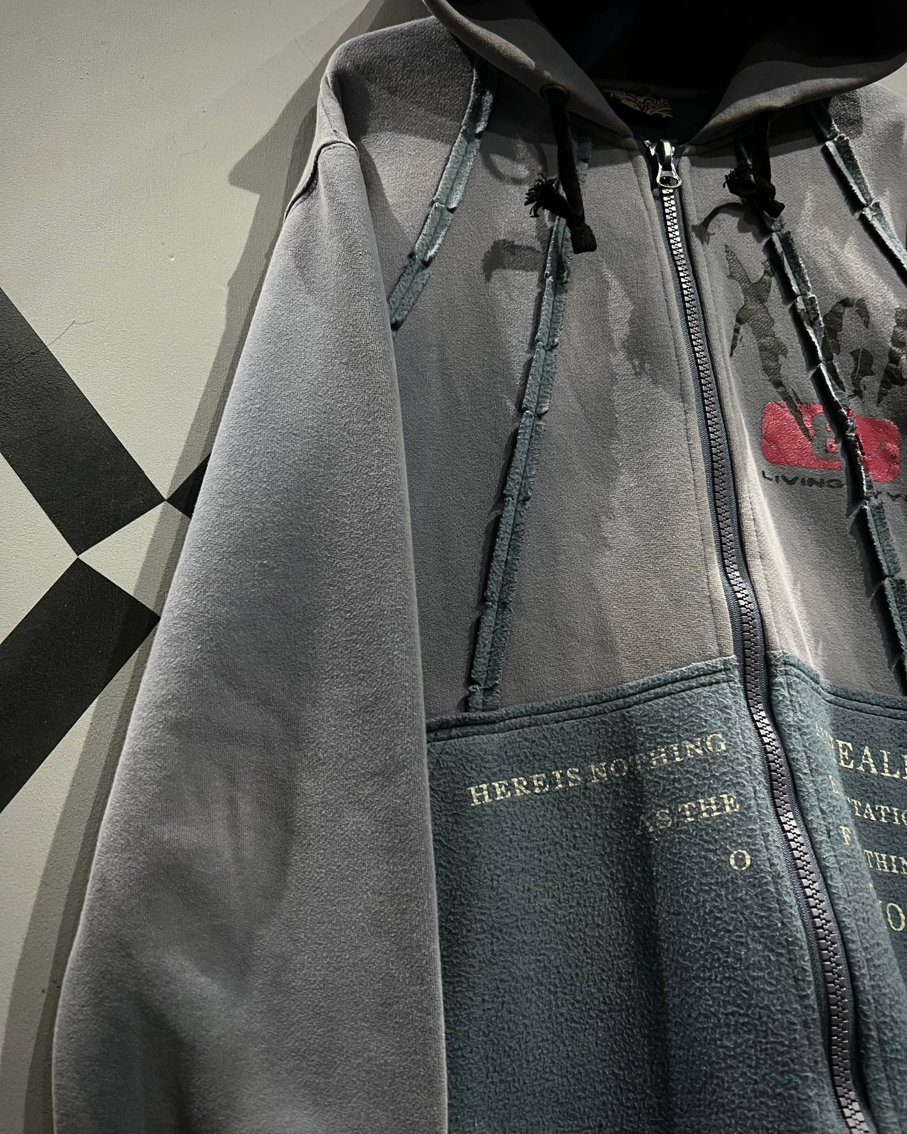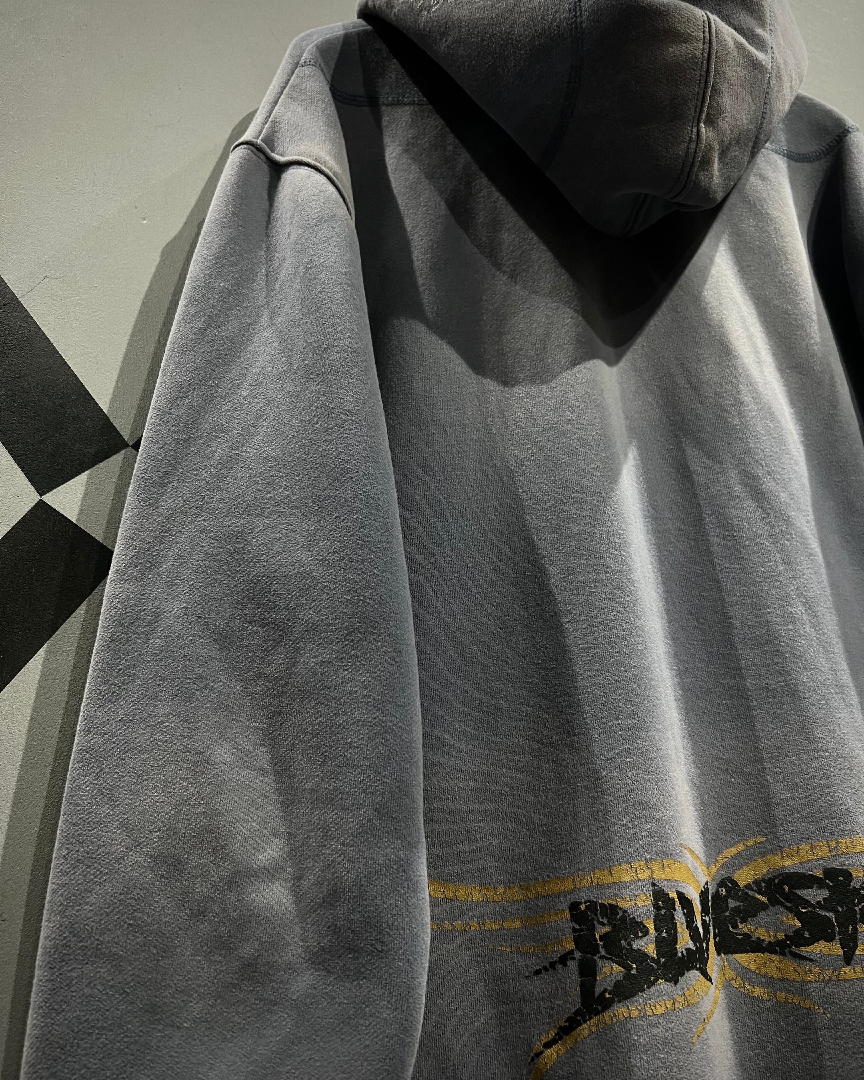フロントにはプリントデザインを配置し、フード部分にはスローガン調のメッセージをオン。さらに、立体感のあるパッチをライン状にあしらうことで、フーディの枠を超えたデザイン性の高さが光ります。ジップ仕様で着脱もしやすく、機能性面も申し分ない仕上がりです。