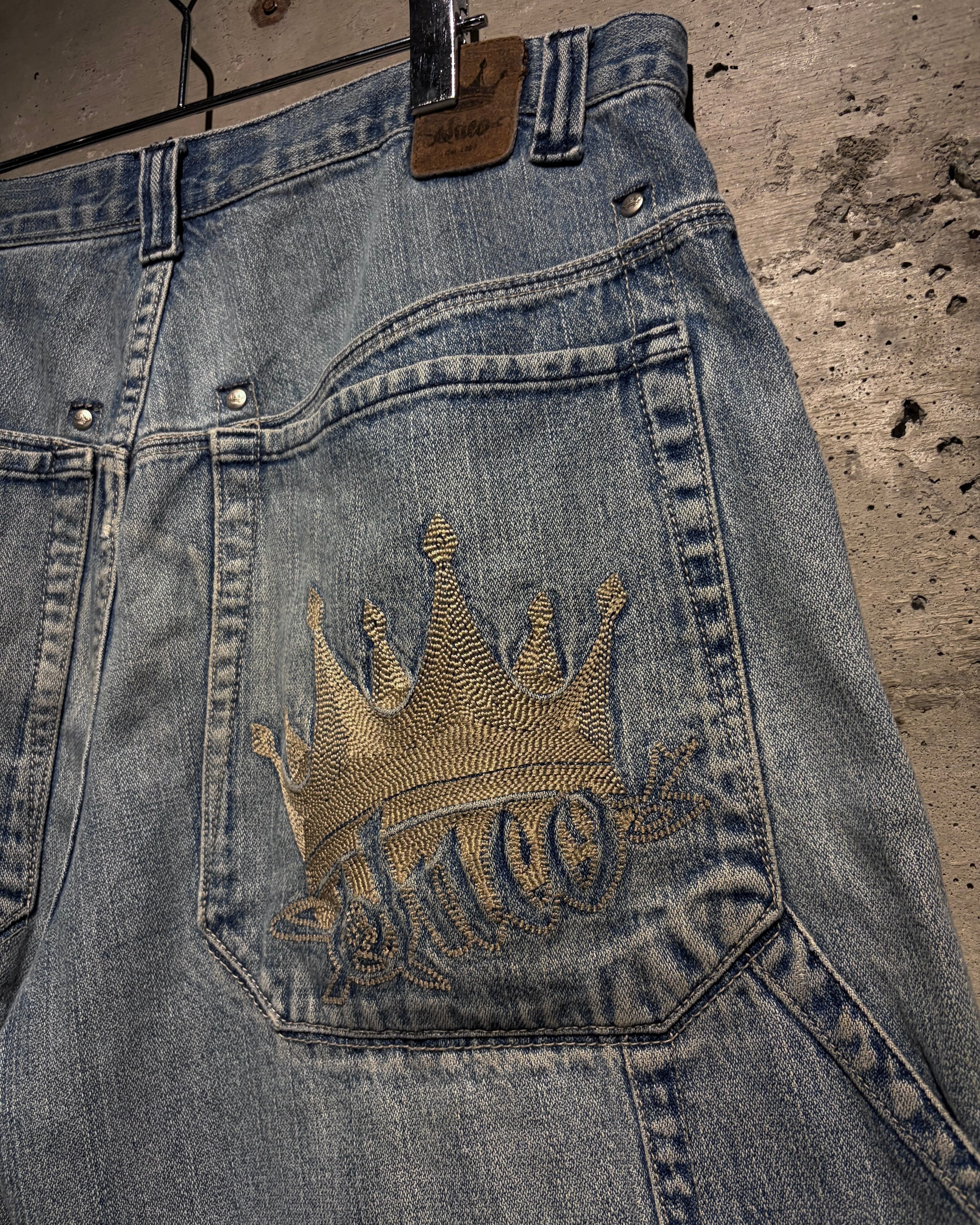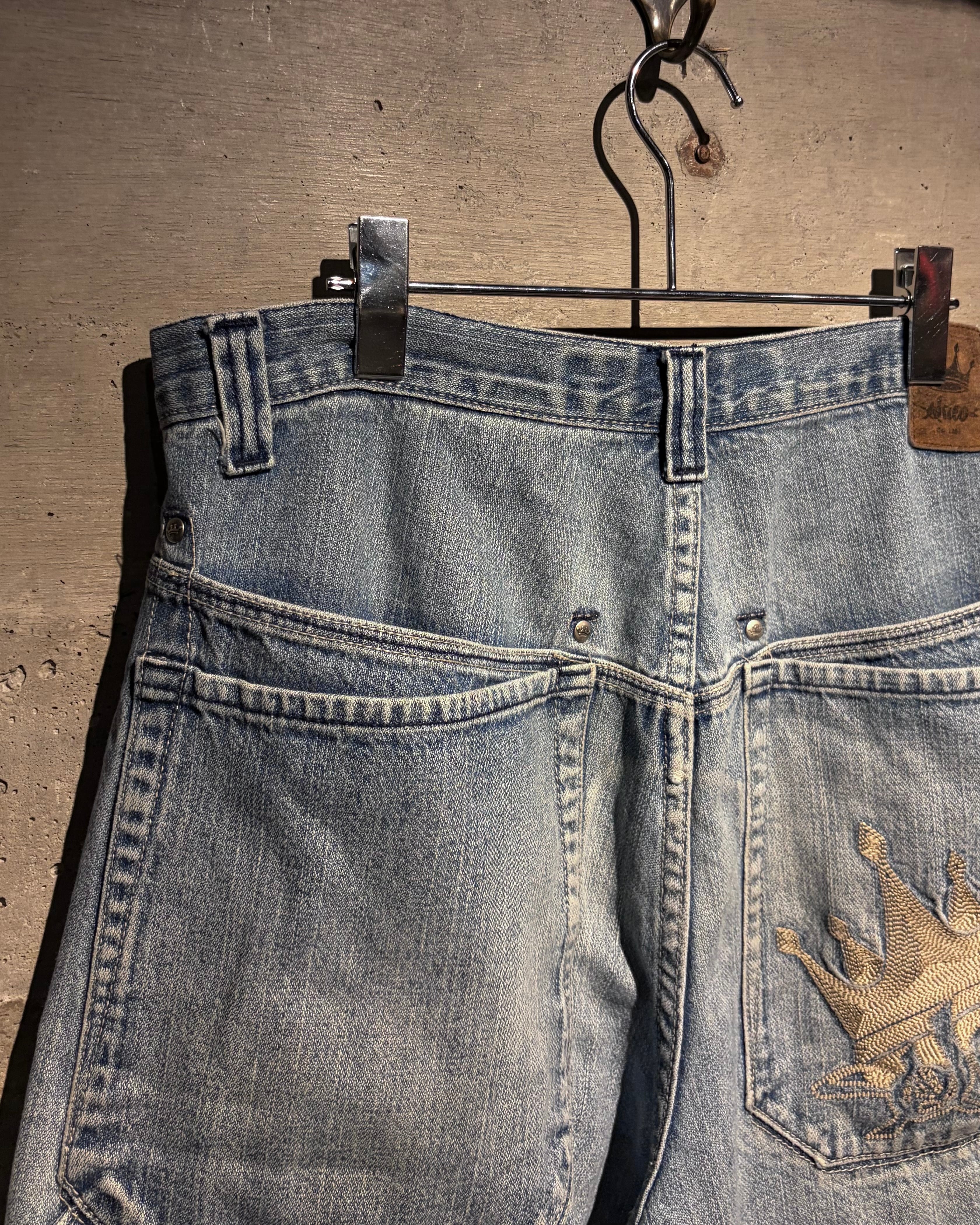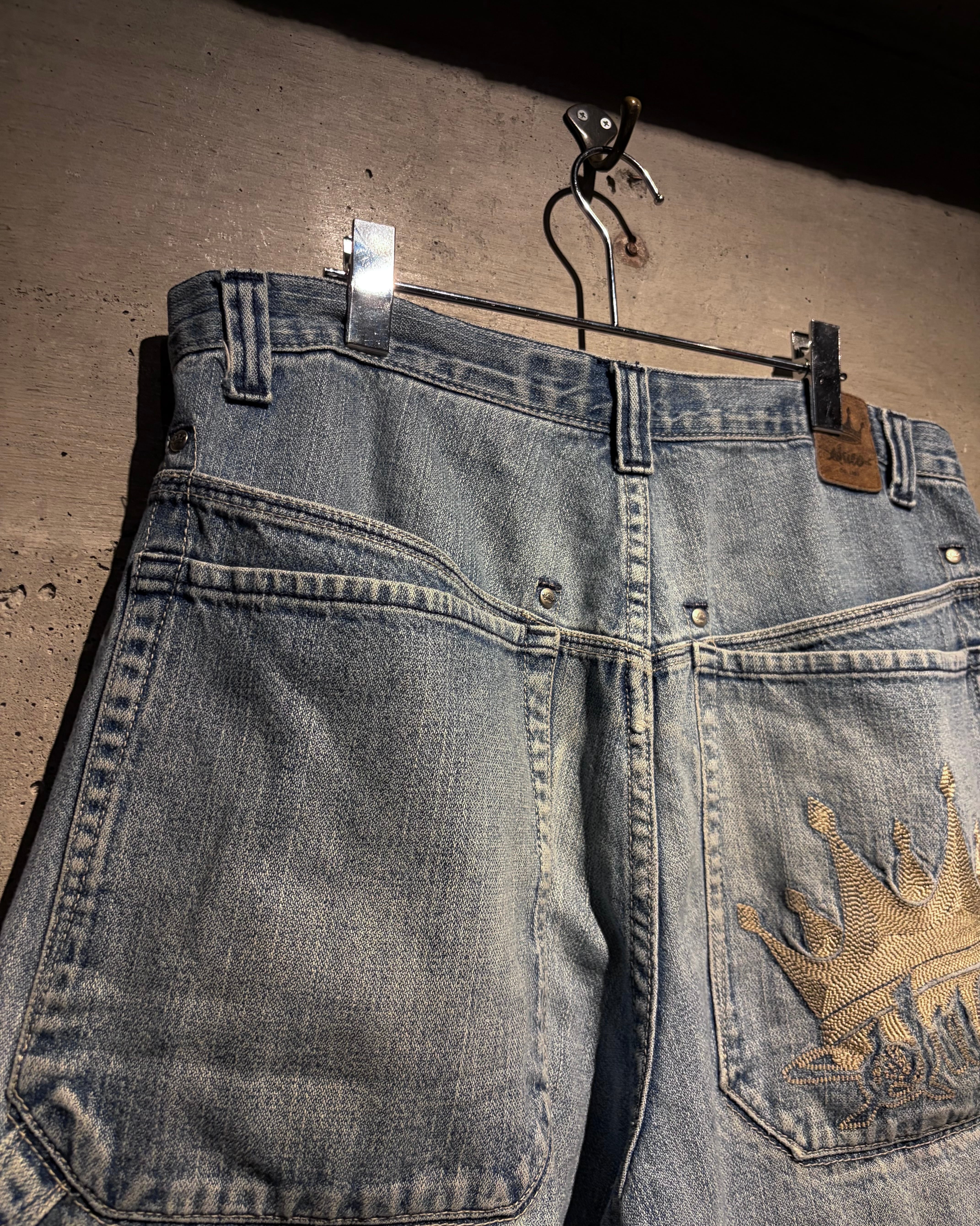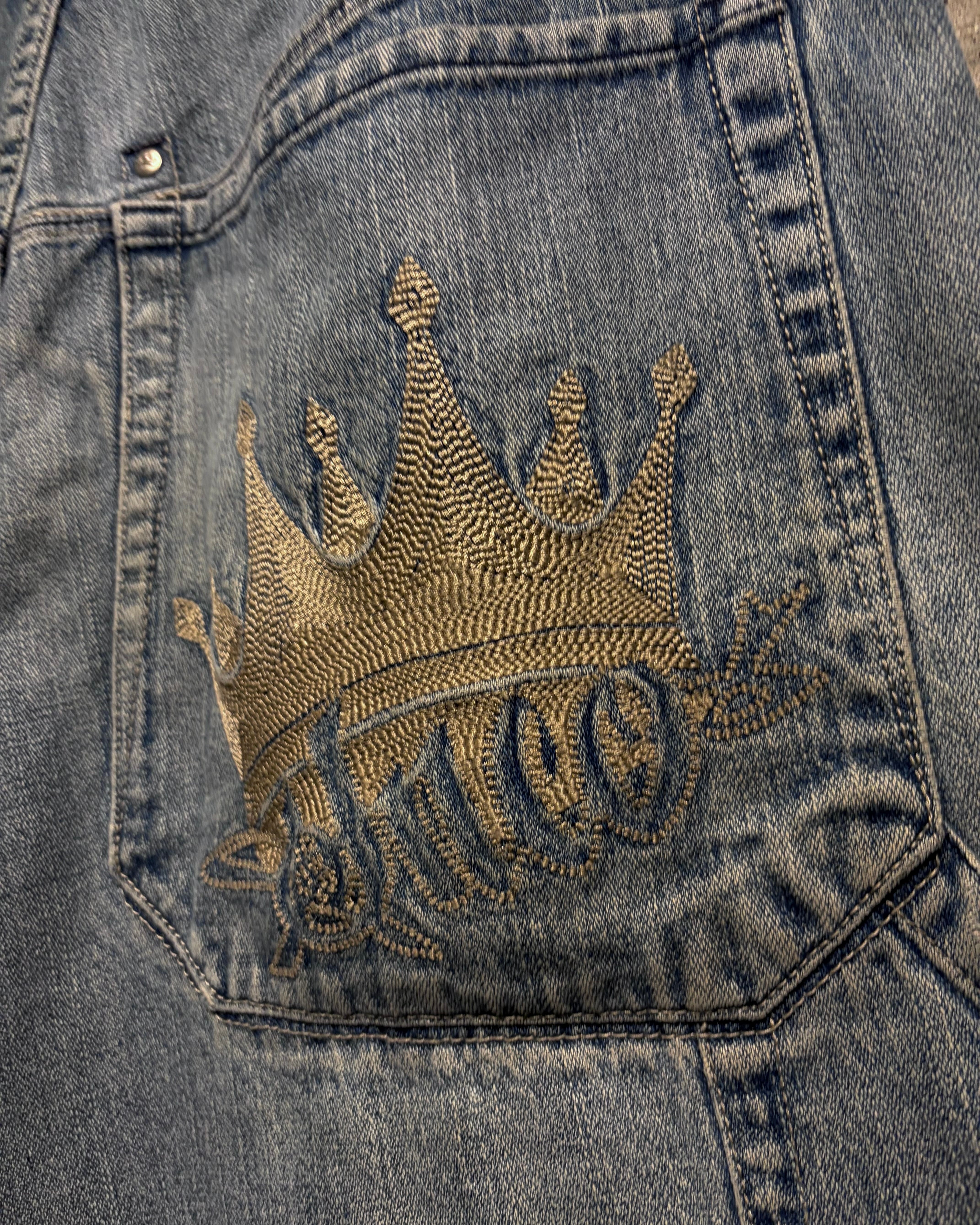 バックポケットにはブランドの象徴とも言えるクラウンロゴを大胆に刺繍で配置。さらに随所に配されたレッドタブやピスネームがアクセントとなり、JNCOらしいストリートマインドをしっかりと感じさせるディテールワーク。