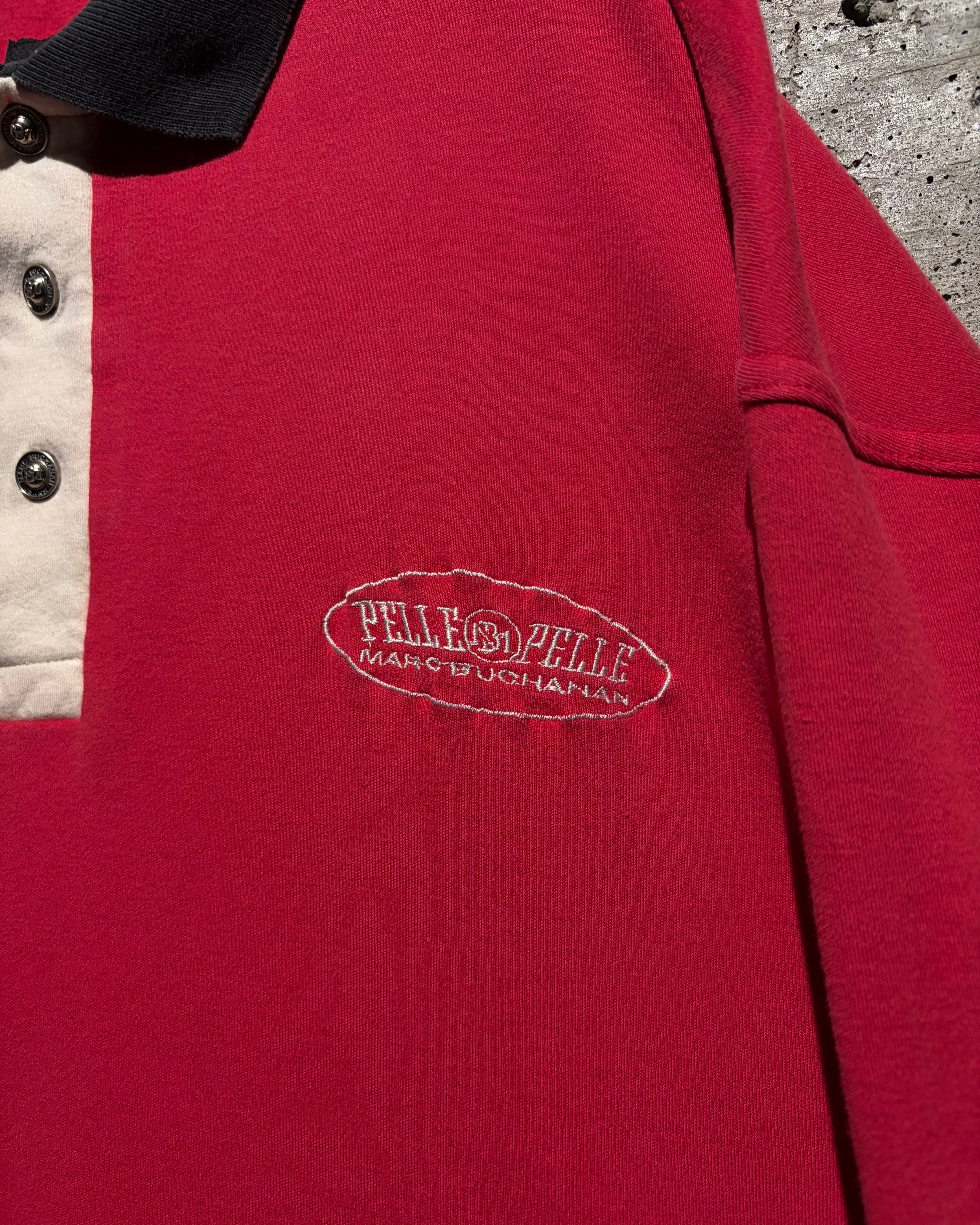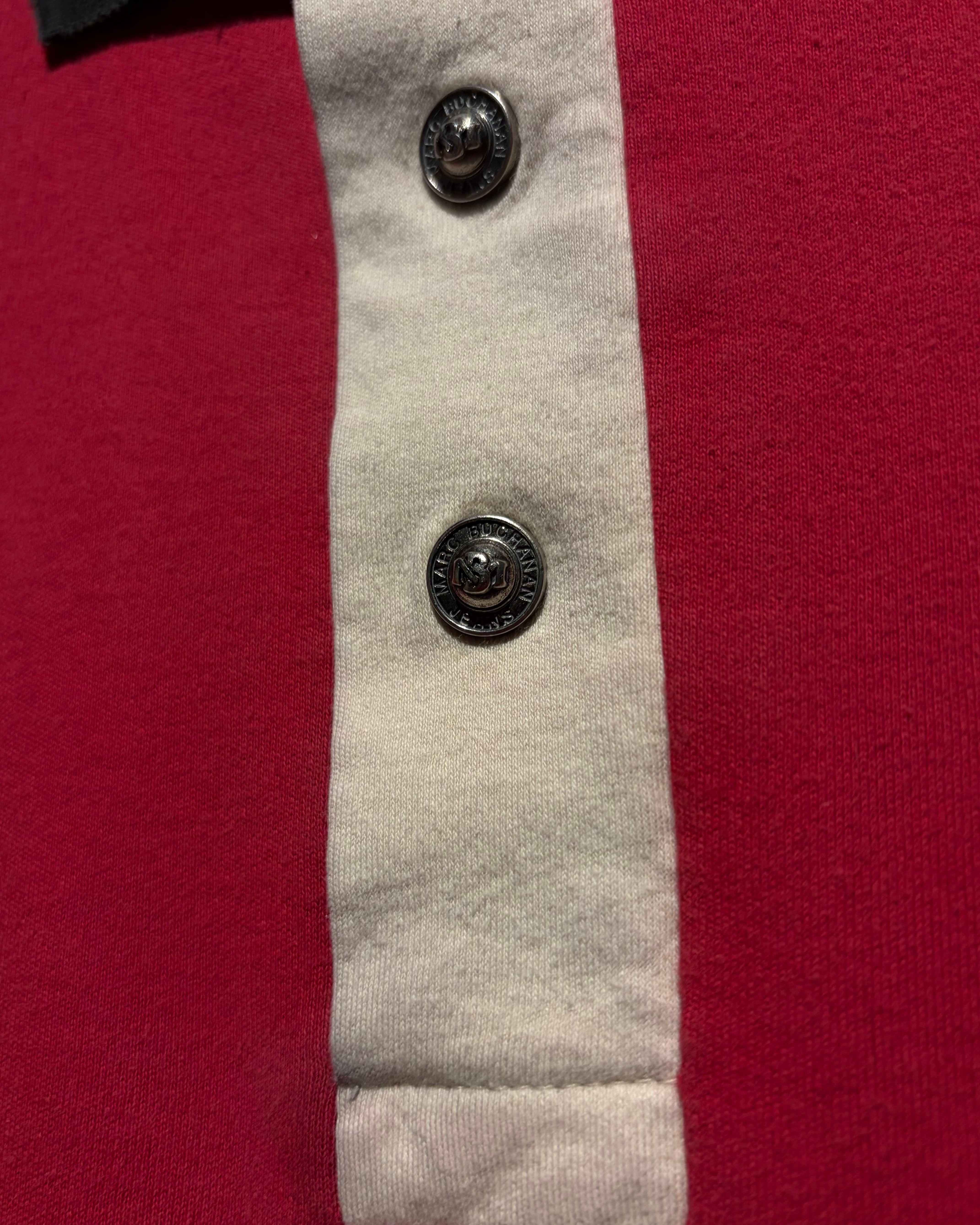 発色の良いレッドをベースに、ブラック、アイボリーの切り替えを効かせたカラーリングが特徴的なラガーシャツ。