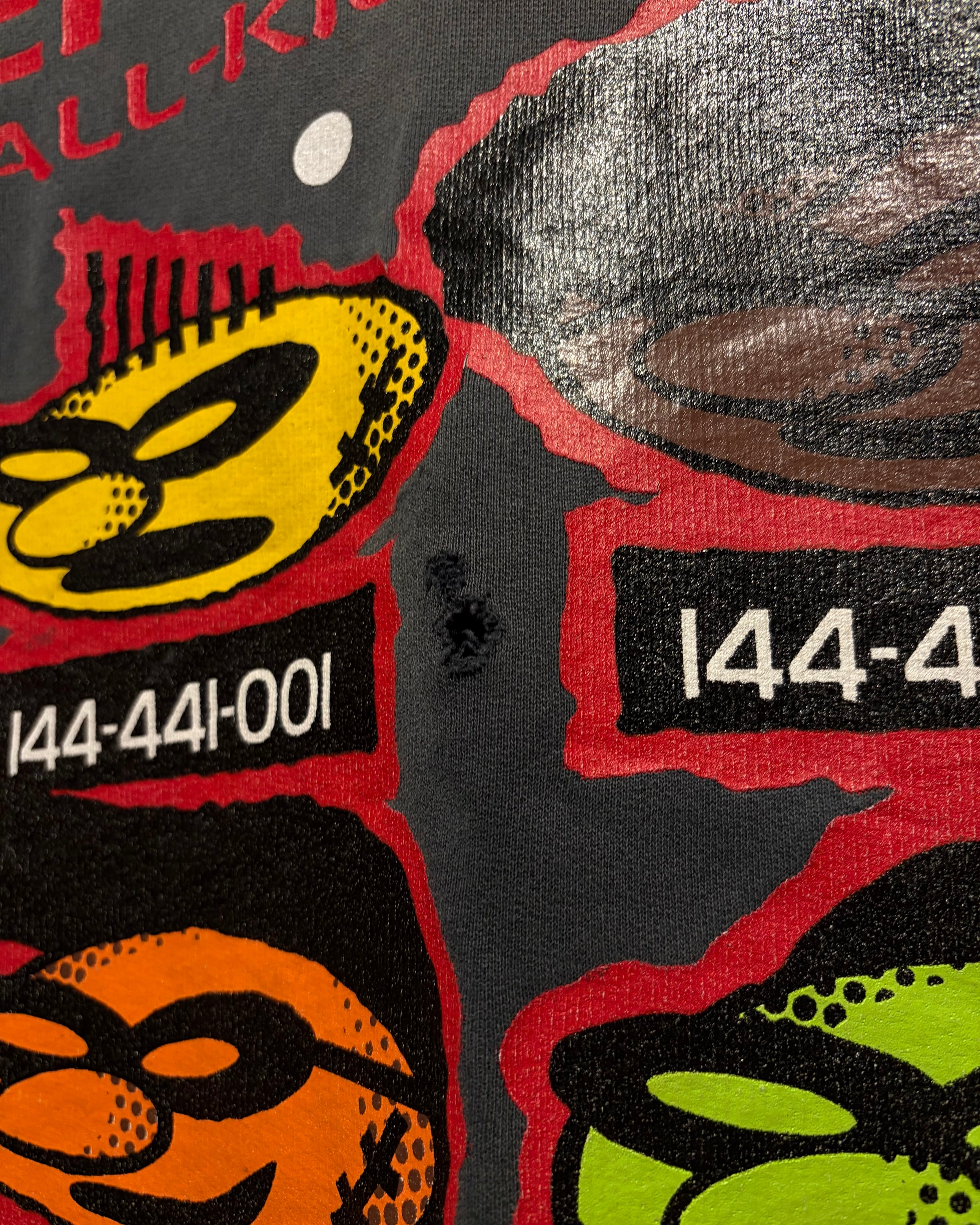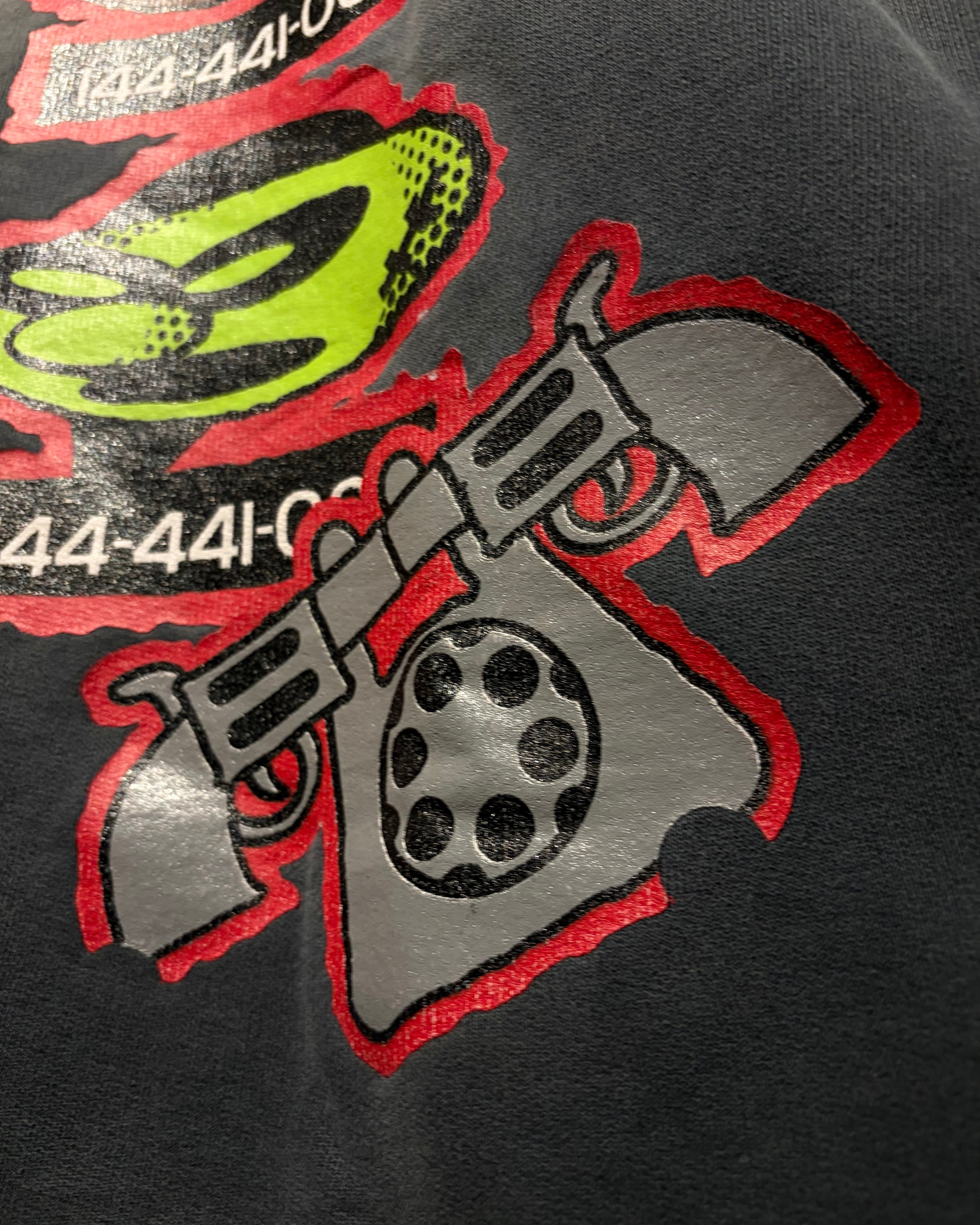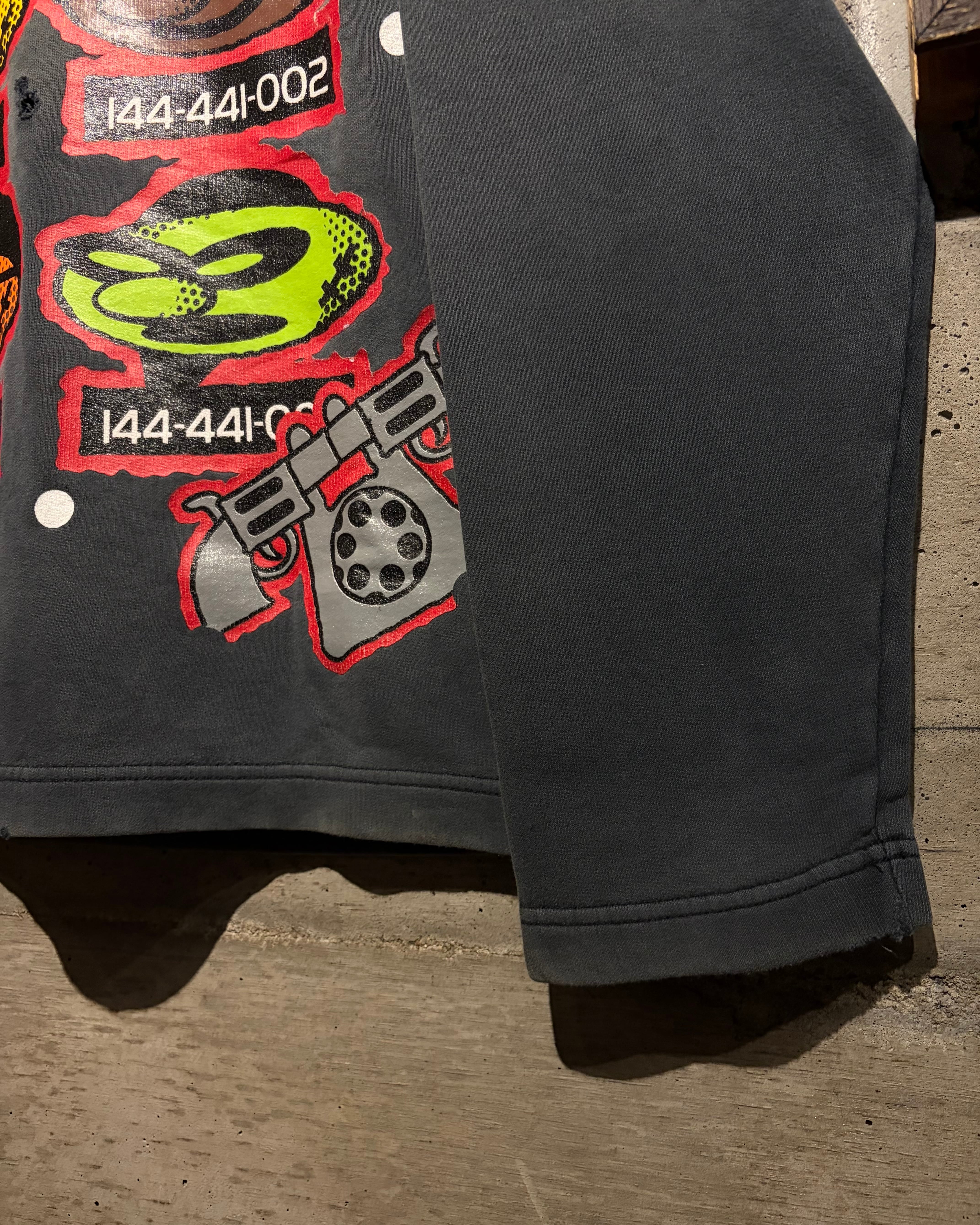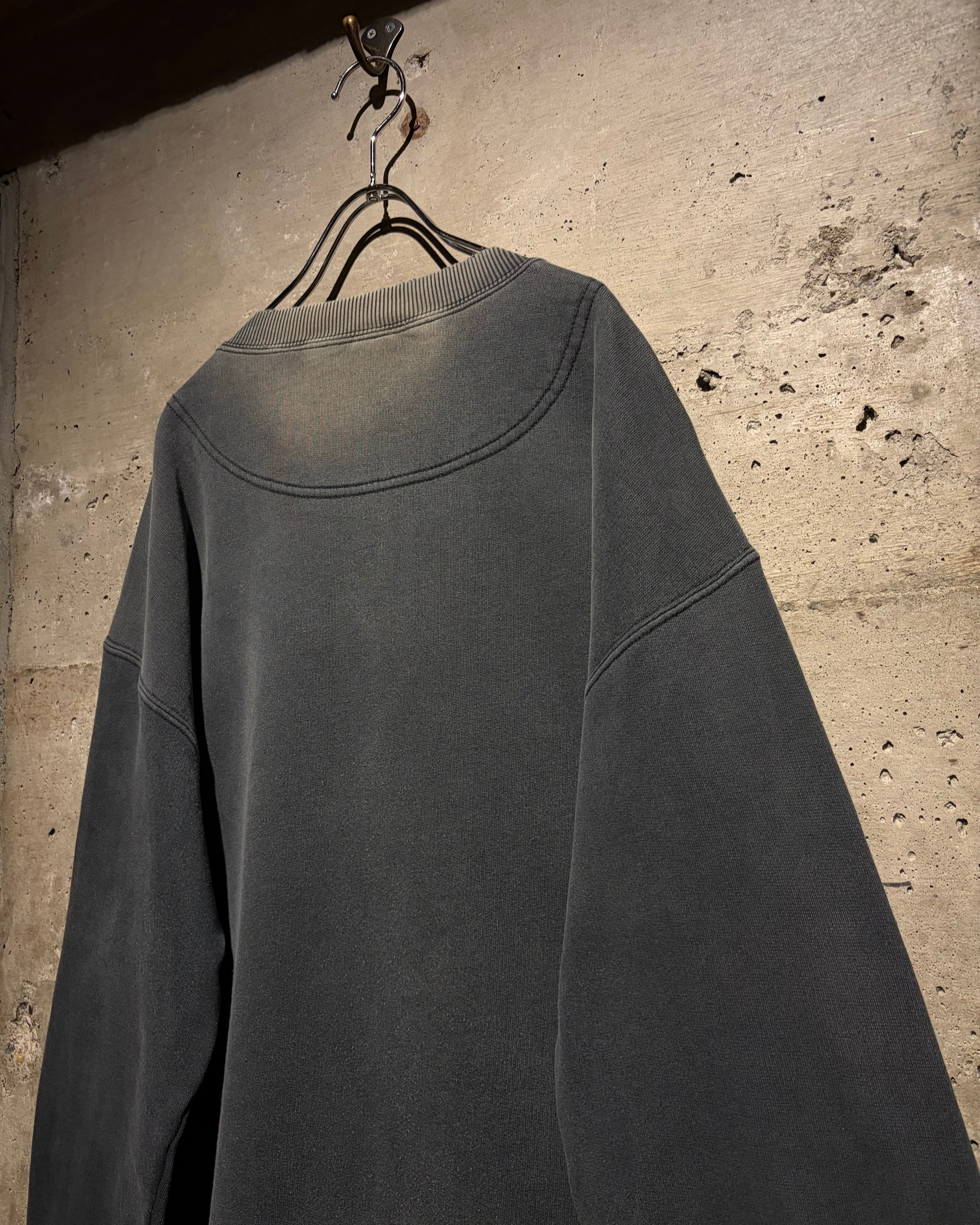フェード感の効いたチャコールボディに、ブランドらしいインパクトのあるグラフィックを大胆に載せた、当時らしい空気感を纏った1着。
