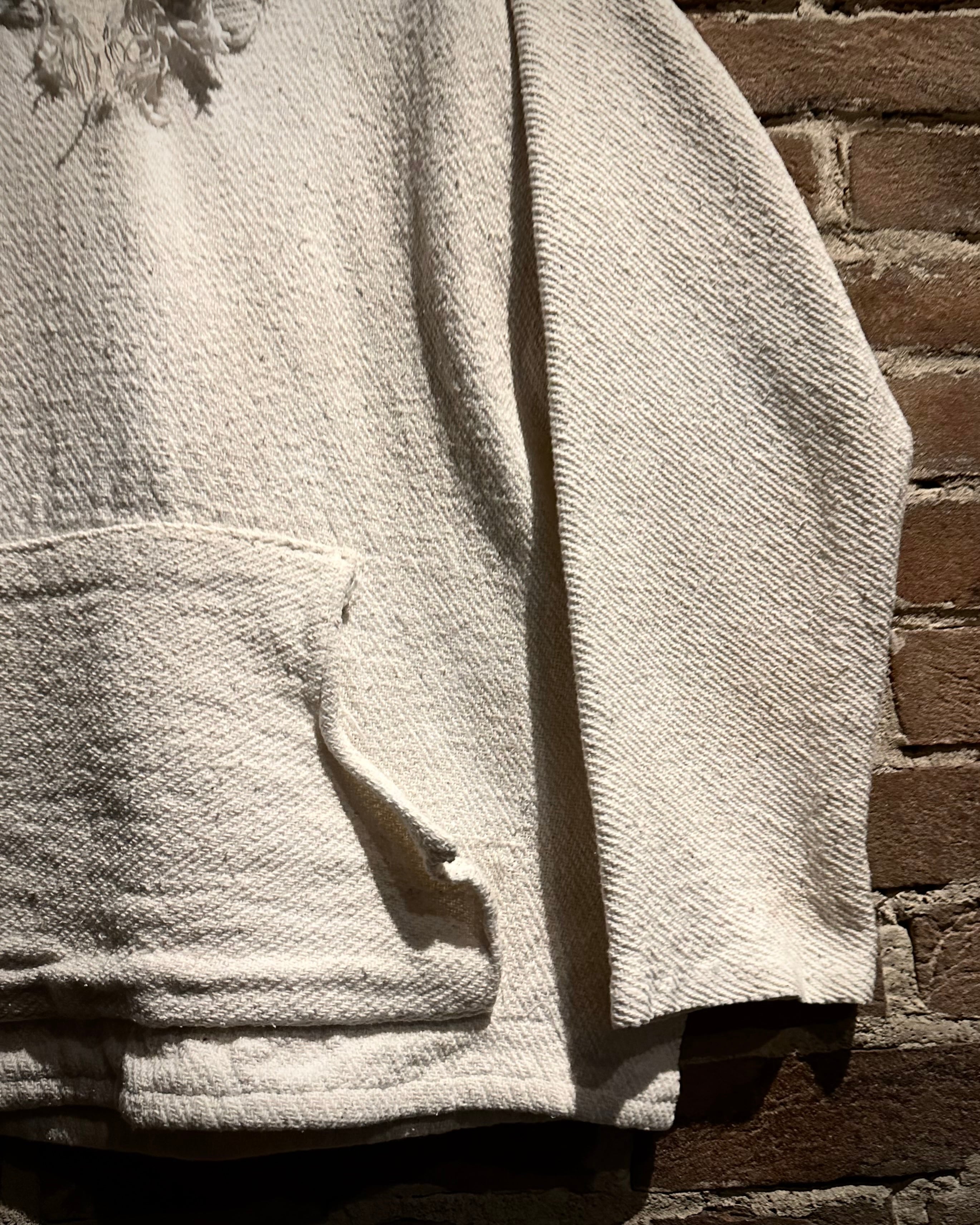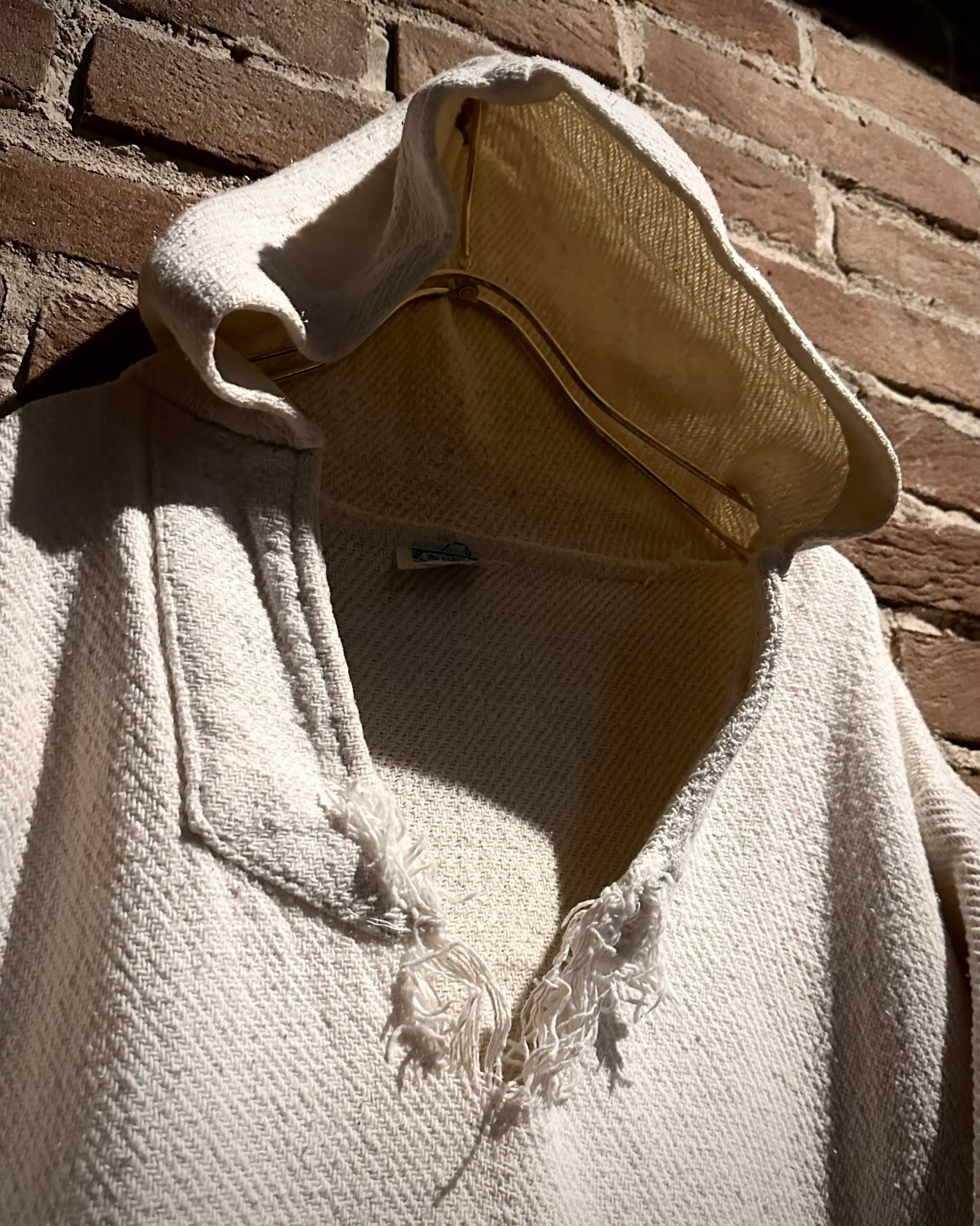 厚手のコットンを用いた織りのボディは、ざっくりとした表情とタフな質感が魅力。ナチュラルな生成りカラーが素材の風合いを引き立て、シンプルながら存在感のある1着に。