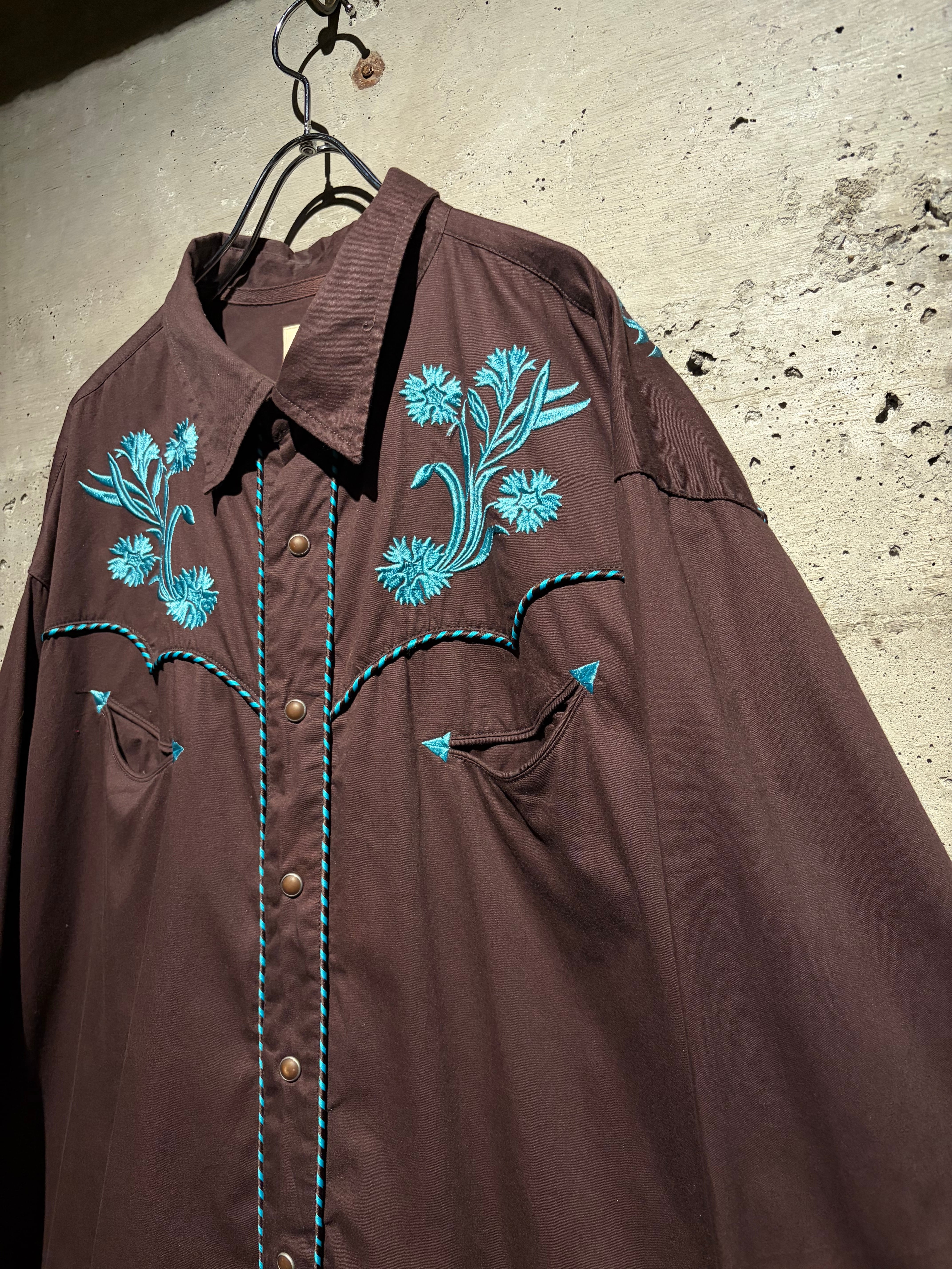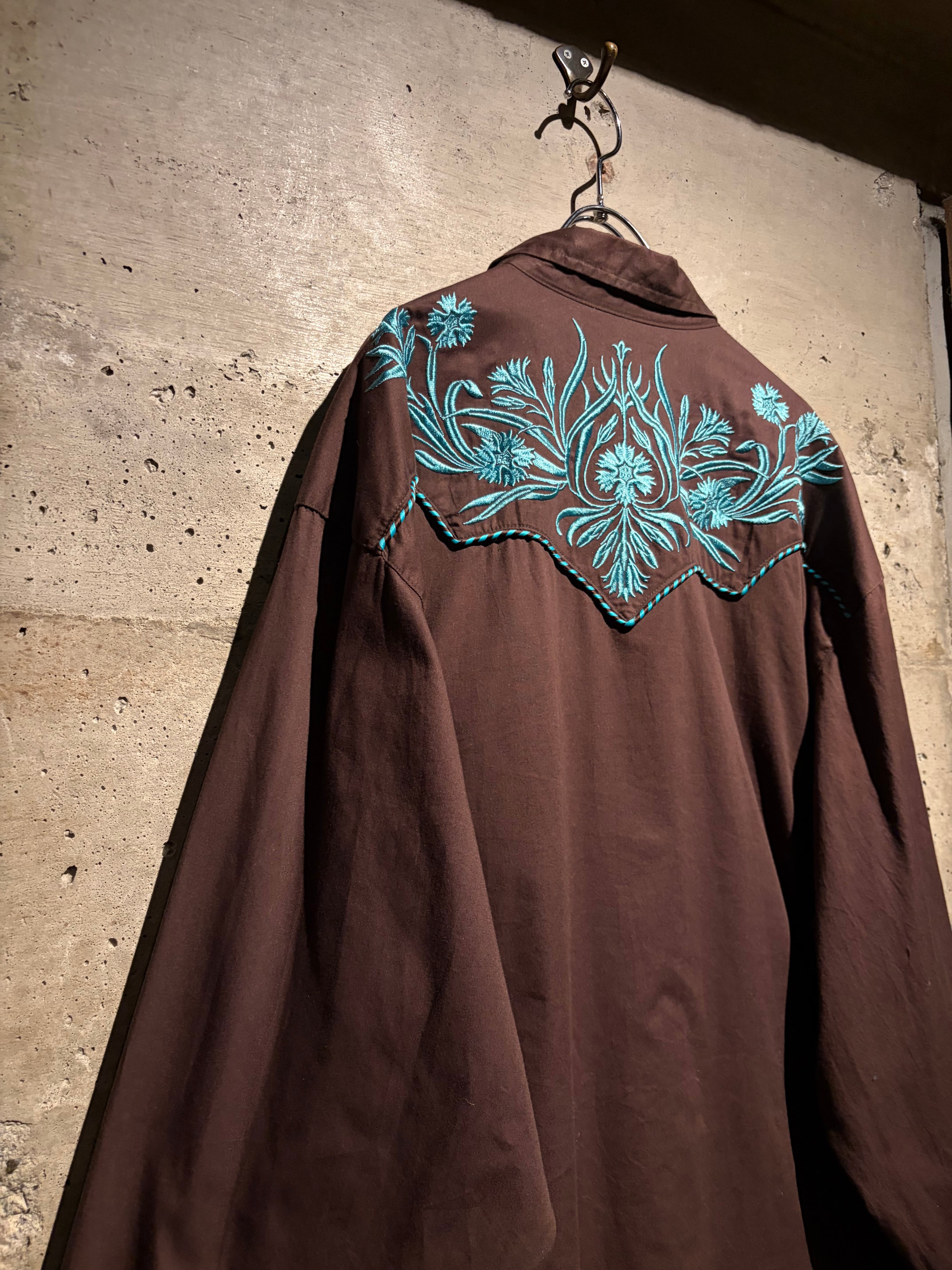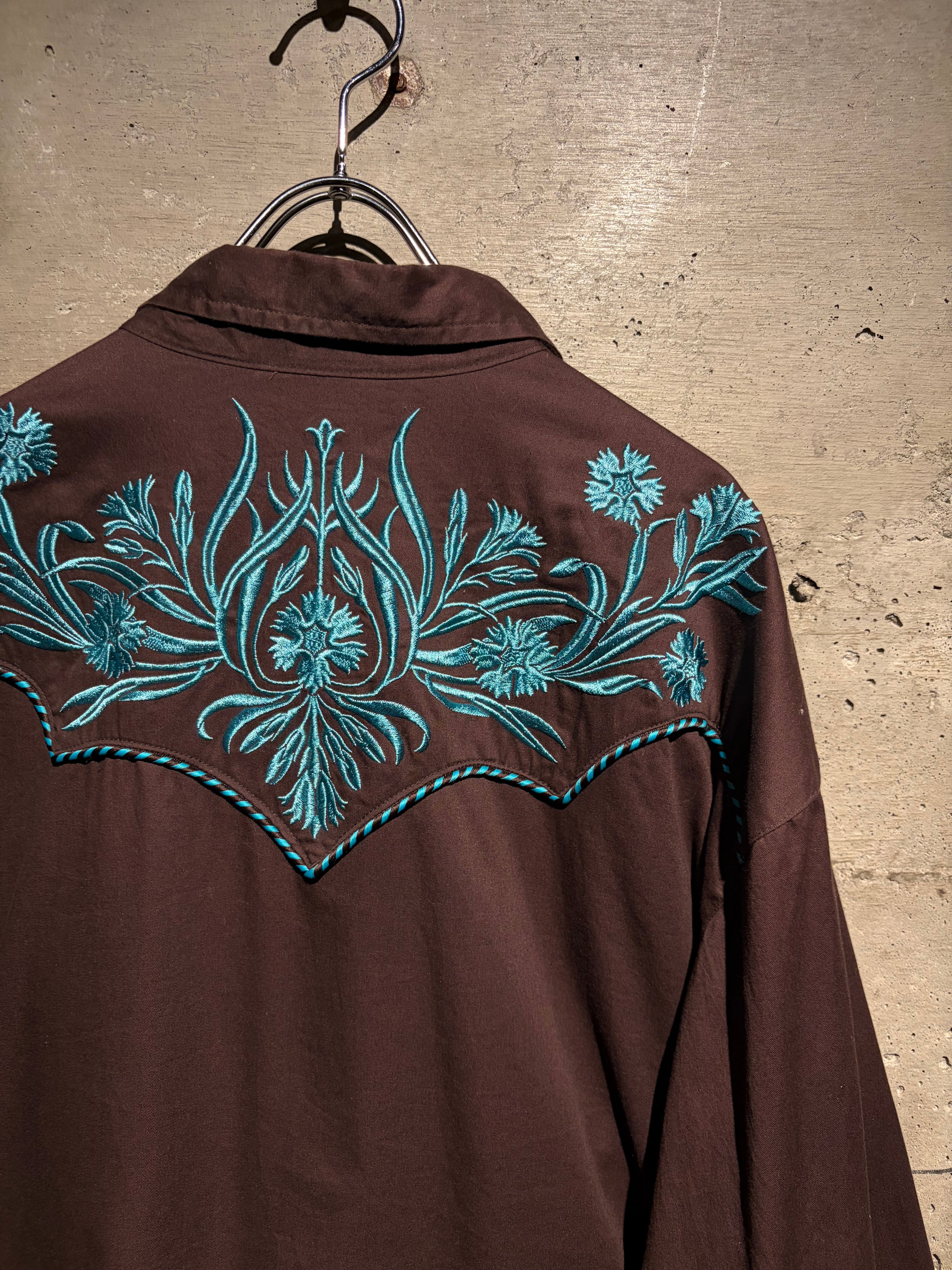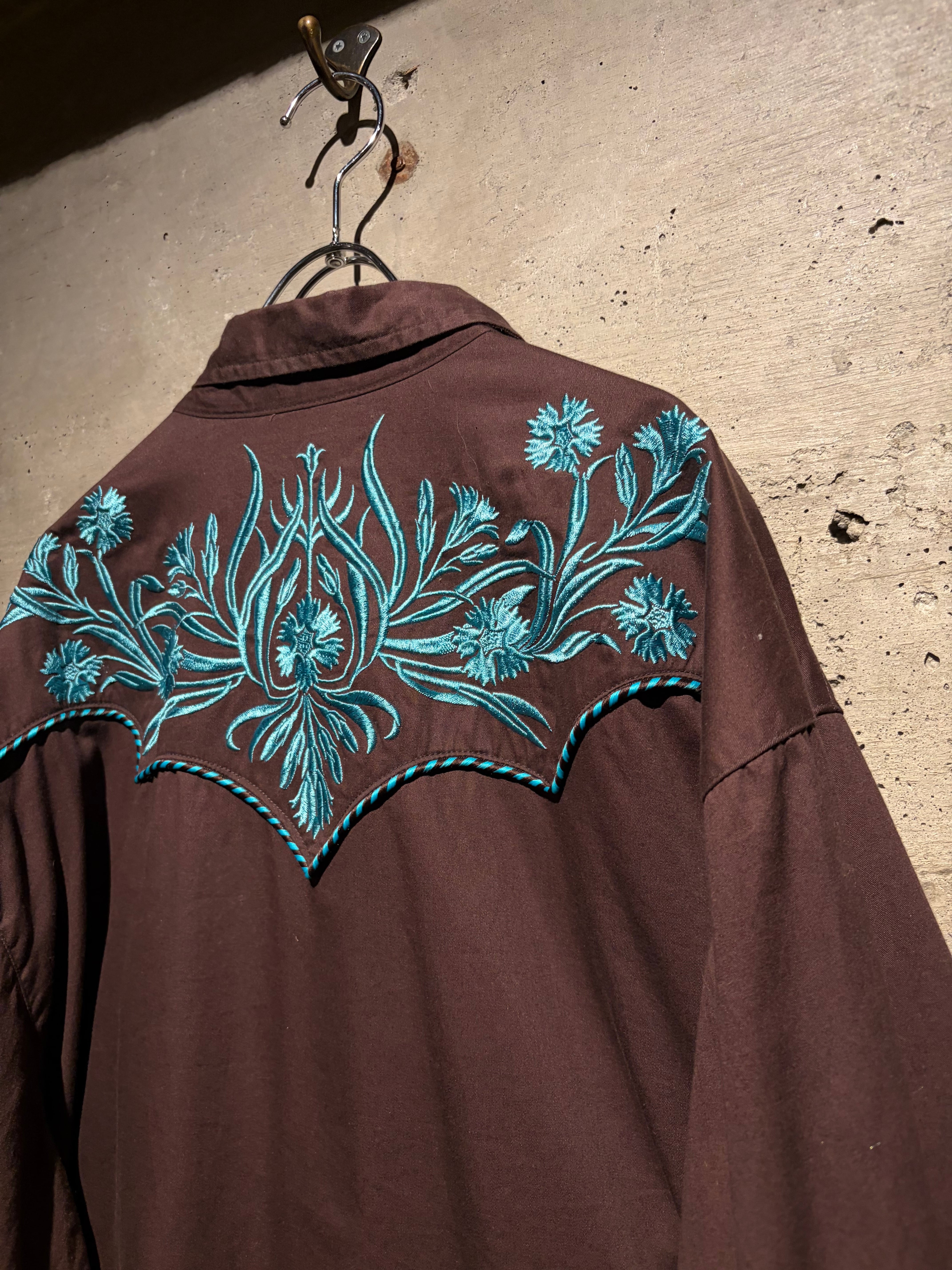 落ち着いたブラウンのボディをベースに、ヨーク部分には水色のボタニカル刺繍を配置。曲線的なウエスタンヨークに沿う刺繍と、フロントからバックへ繋がるデザインが、クラシックな中に華やかさと奥行きを生み出しています。アローポケットやスナップボタンなどの定番ディテールも踏襲し、無骨さと装飾性を両立。