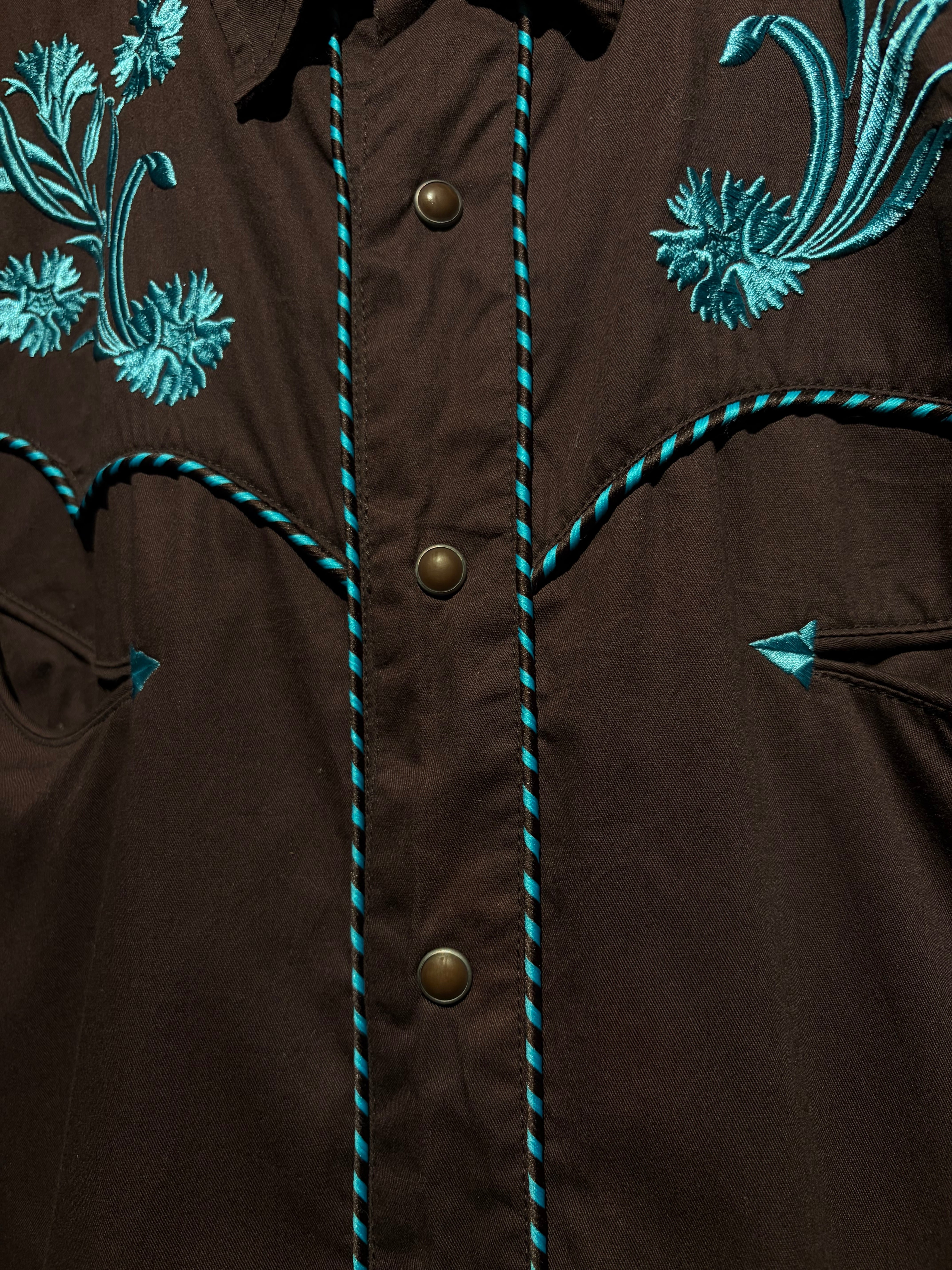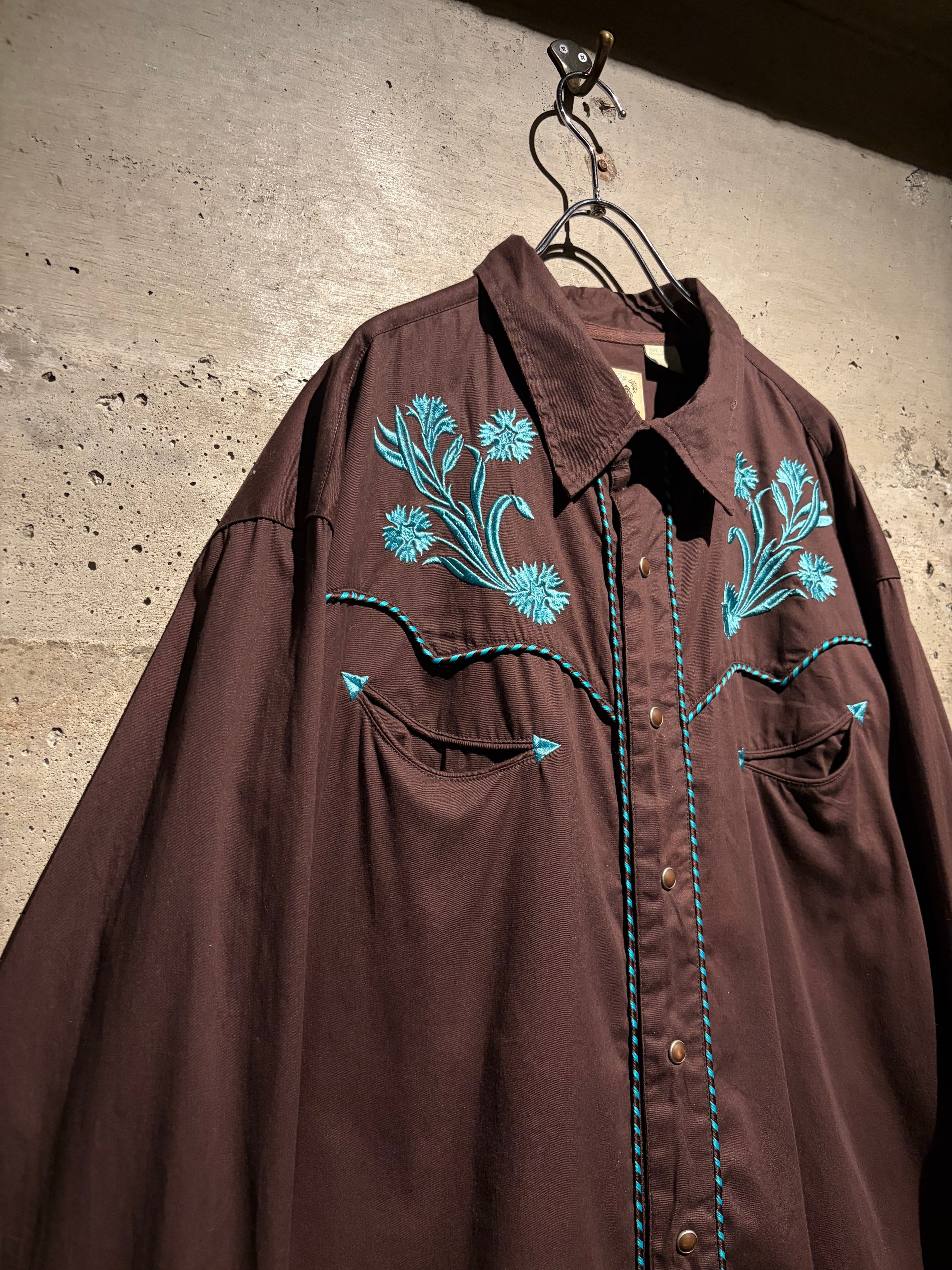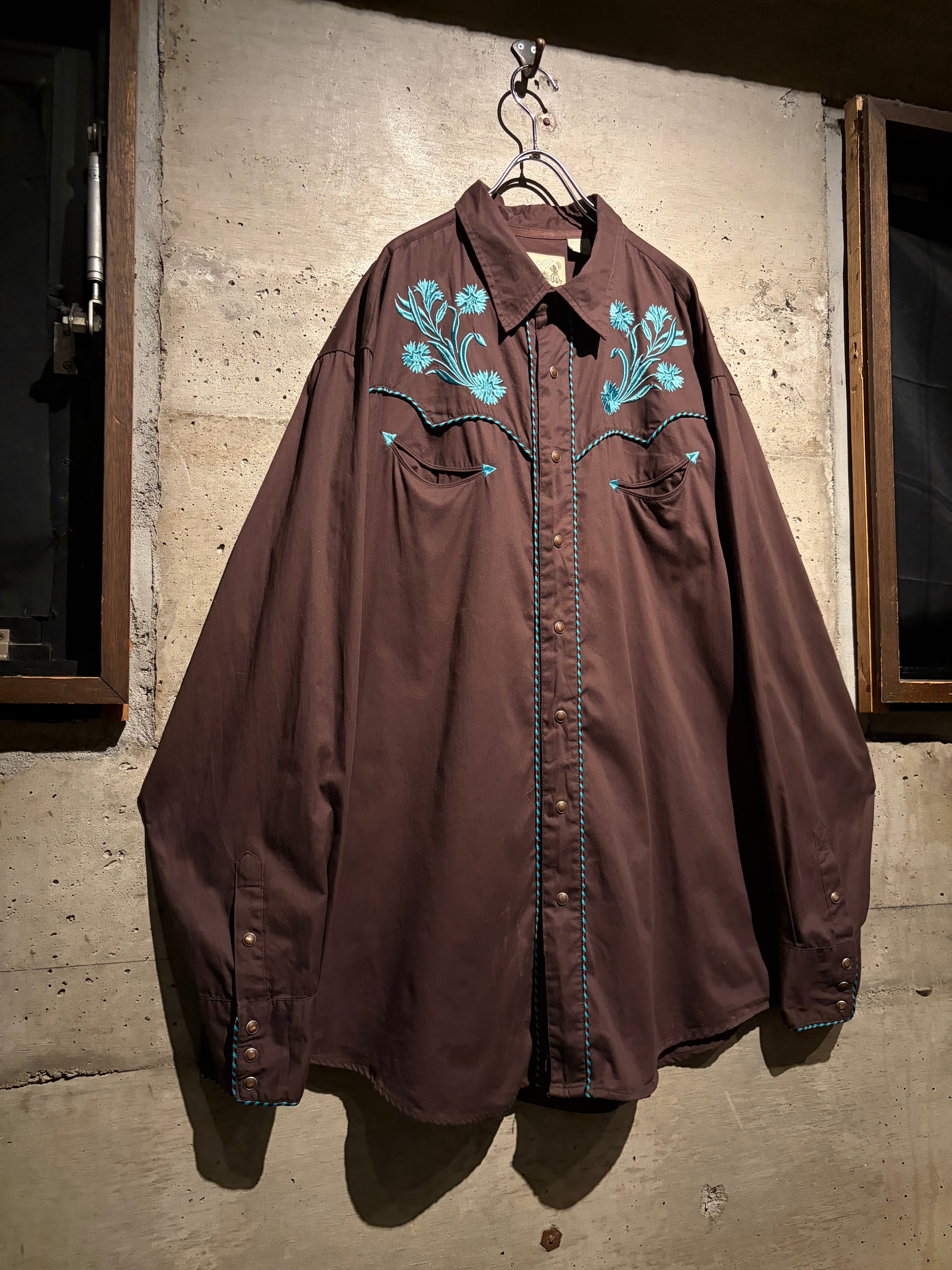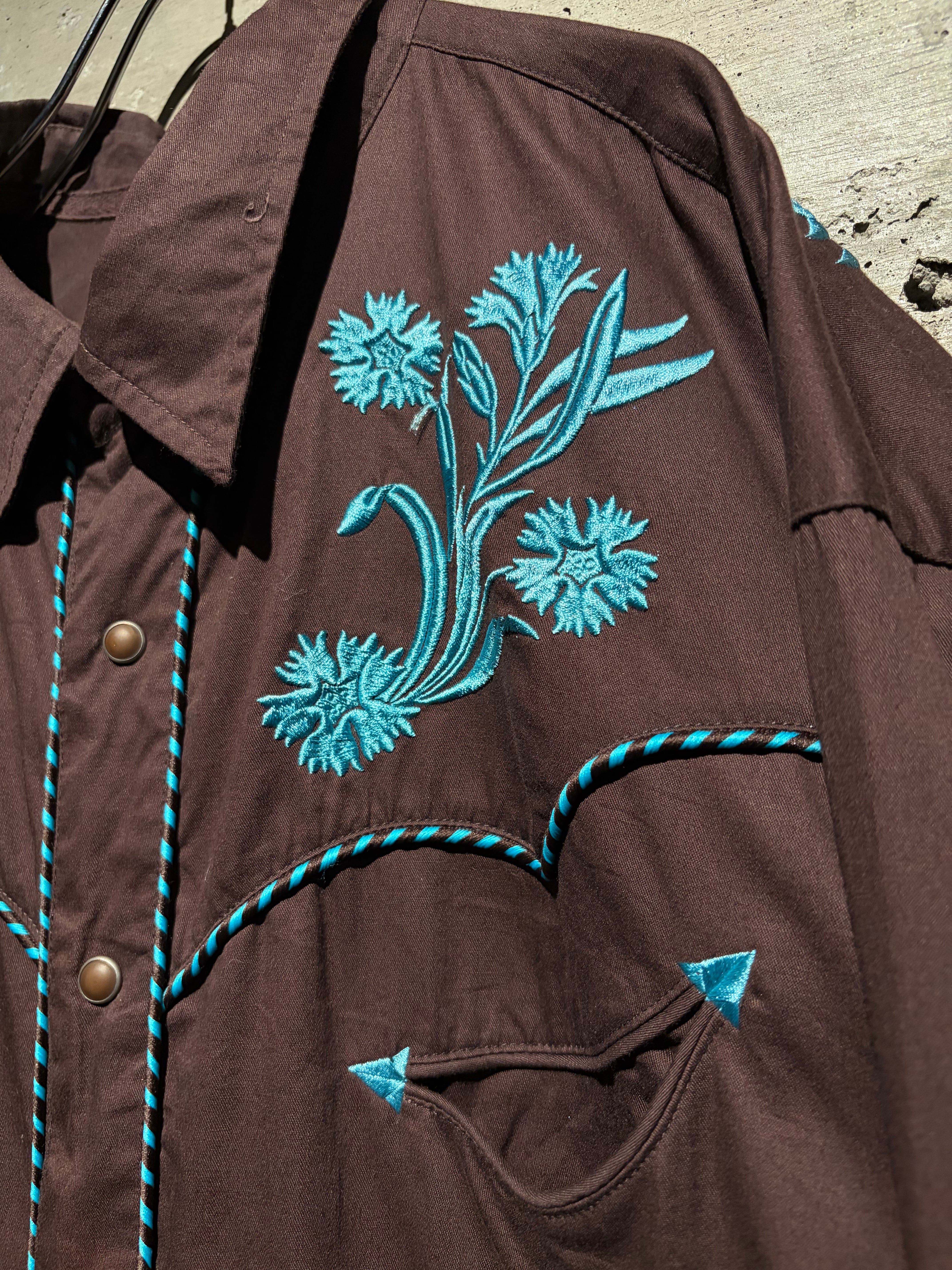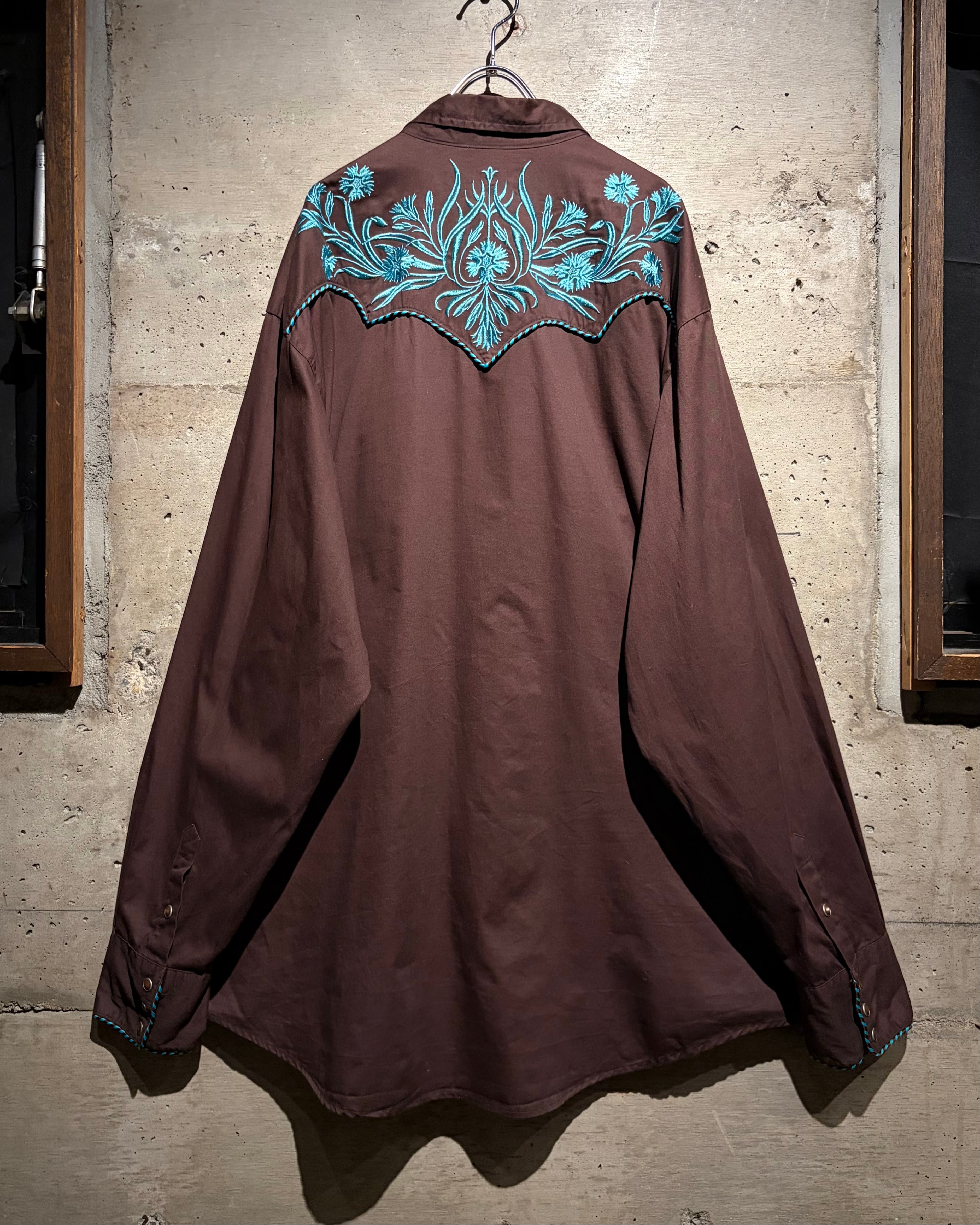 落ち着いたブラウンのボディをベースに、ヨーク部分には水色のボタニカル刺繍を配置。曲線的なウエスタンヨークに沿う刺繍と、フロントからバックへ繋がるデザインが、クラシックな中に華やかさと奥行きを生み出しています。アローポケットやスナップボタンなどの定番ディテールも踏襲し、無骨さと装飾性を両立。