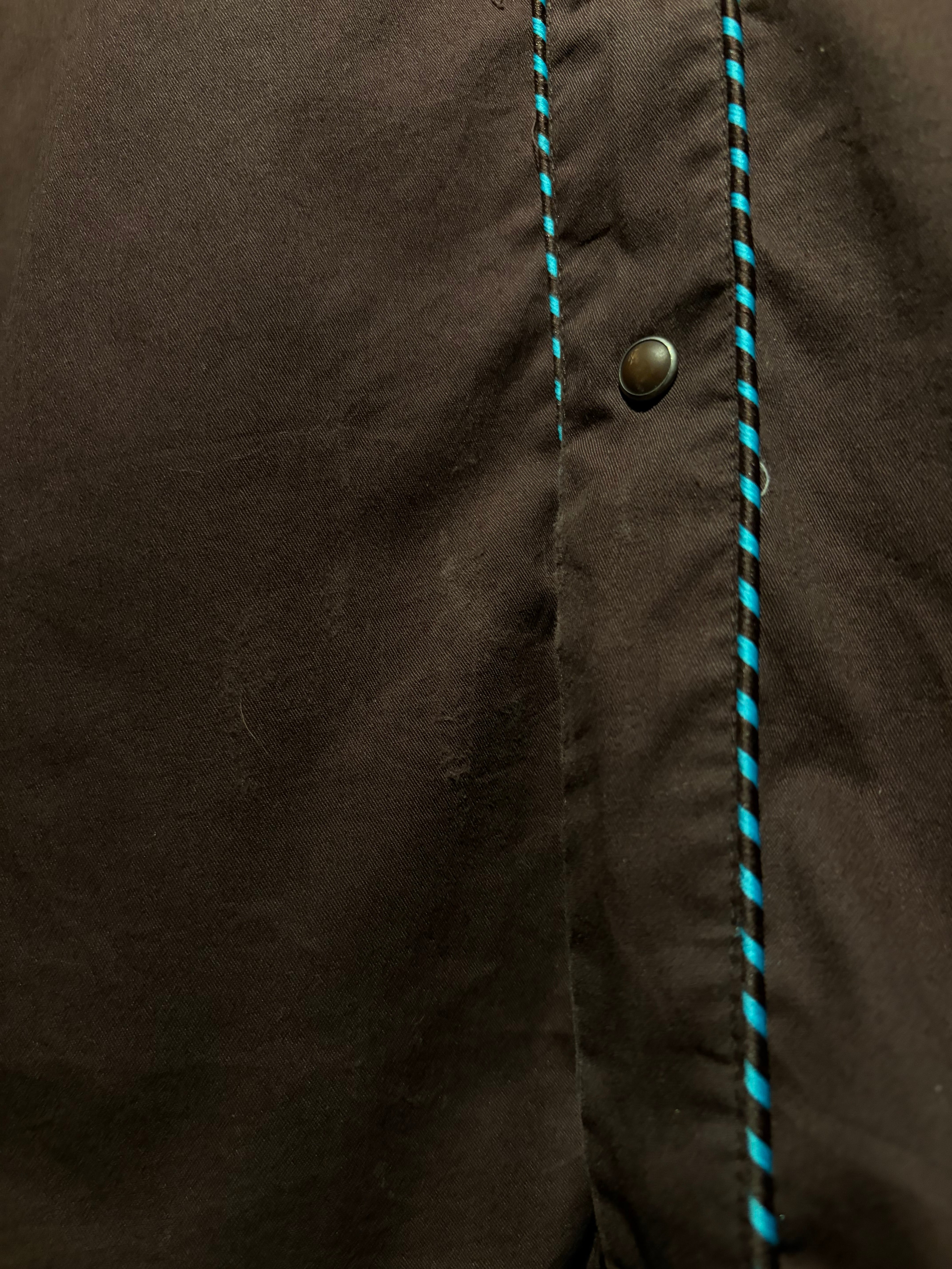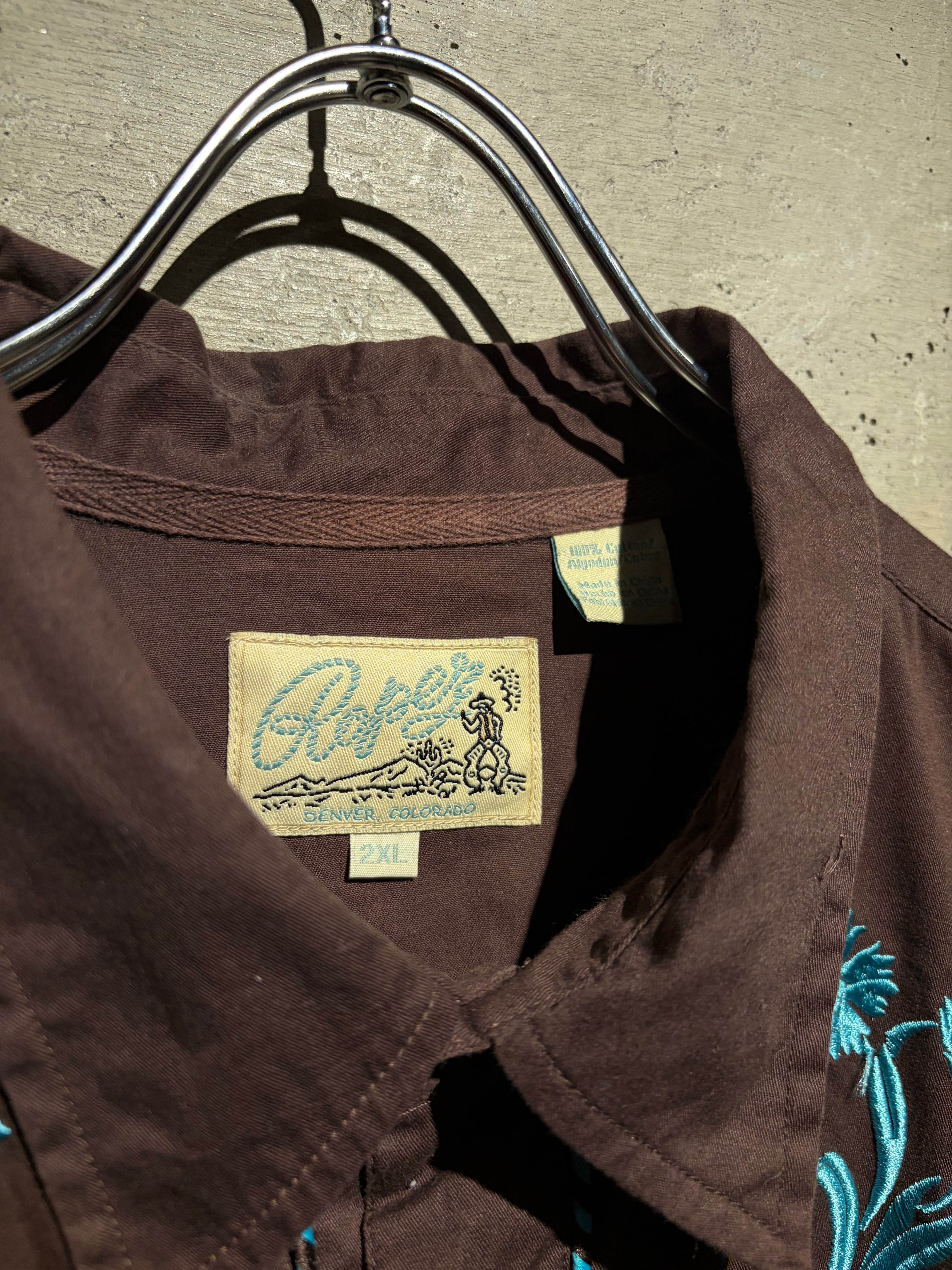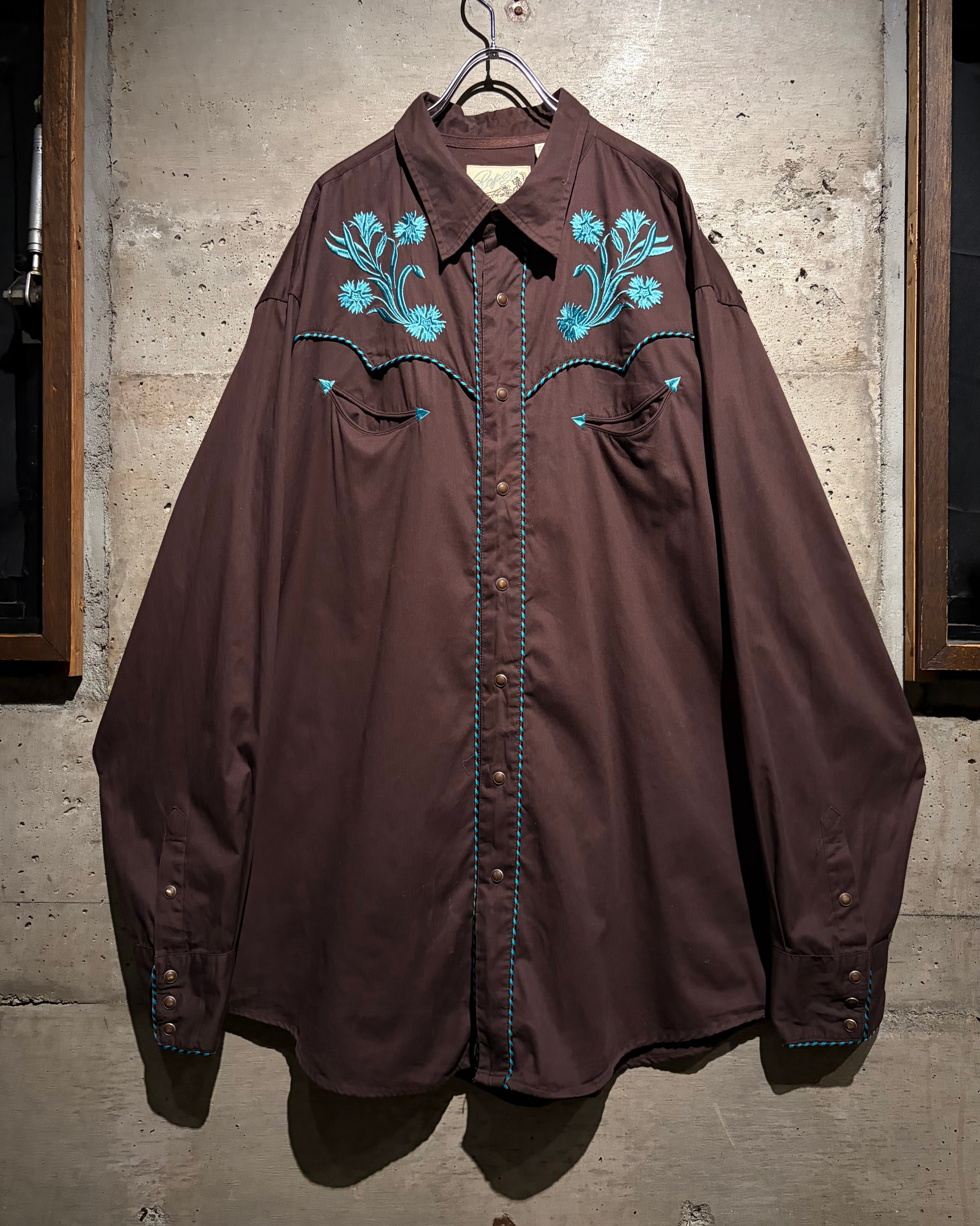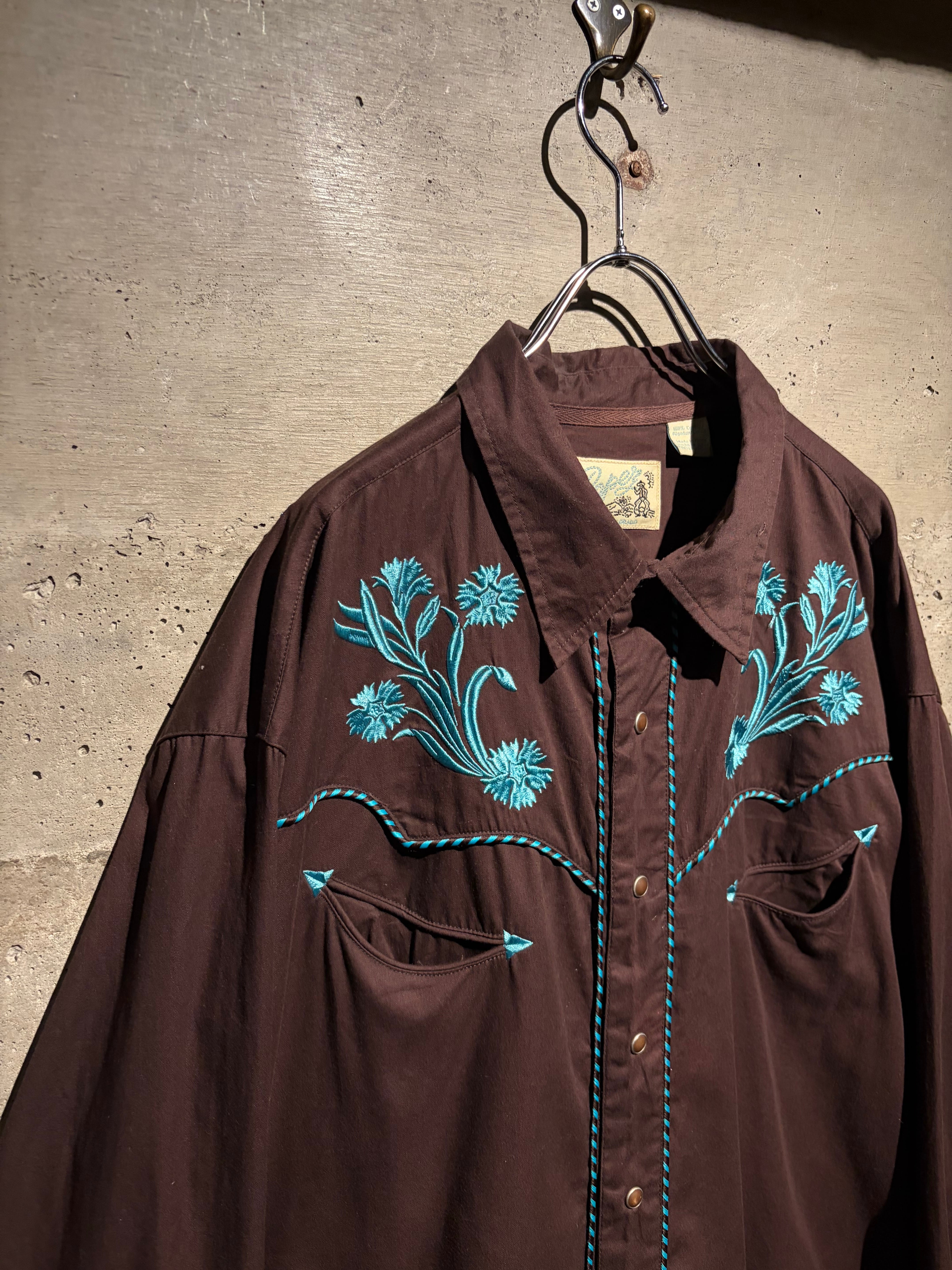 落ち着いたブラウンのボディをベースに、ヨーク部分には水色のボタニカル刺繍を配置。曲線的なウエスタンヨークに沿う刺繍と、フロントからバックへ繋がるデザインが、クラシックな中に華やかさと奥行きを生み出しています。アローポケットやスナップボタンなどの定番ディテールも踏襲し、無骨さと装飾性を両立。
