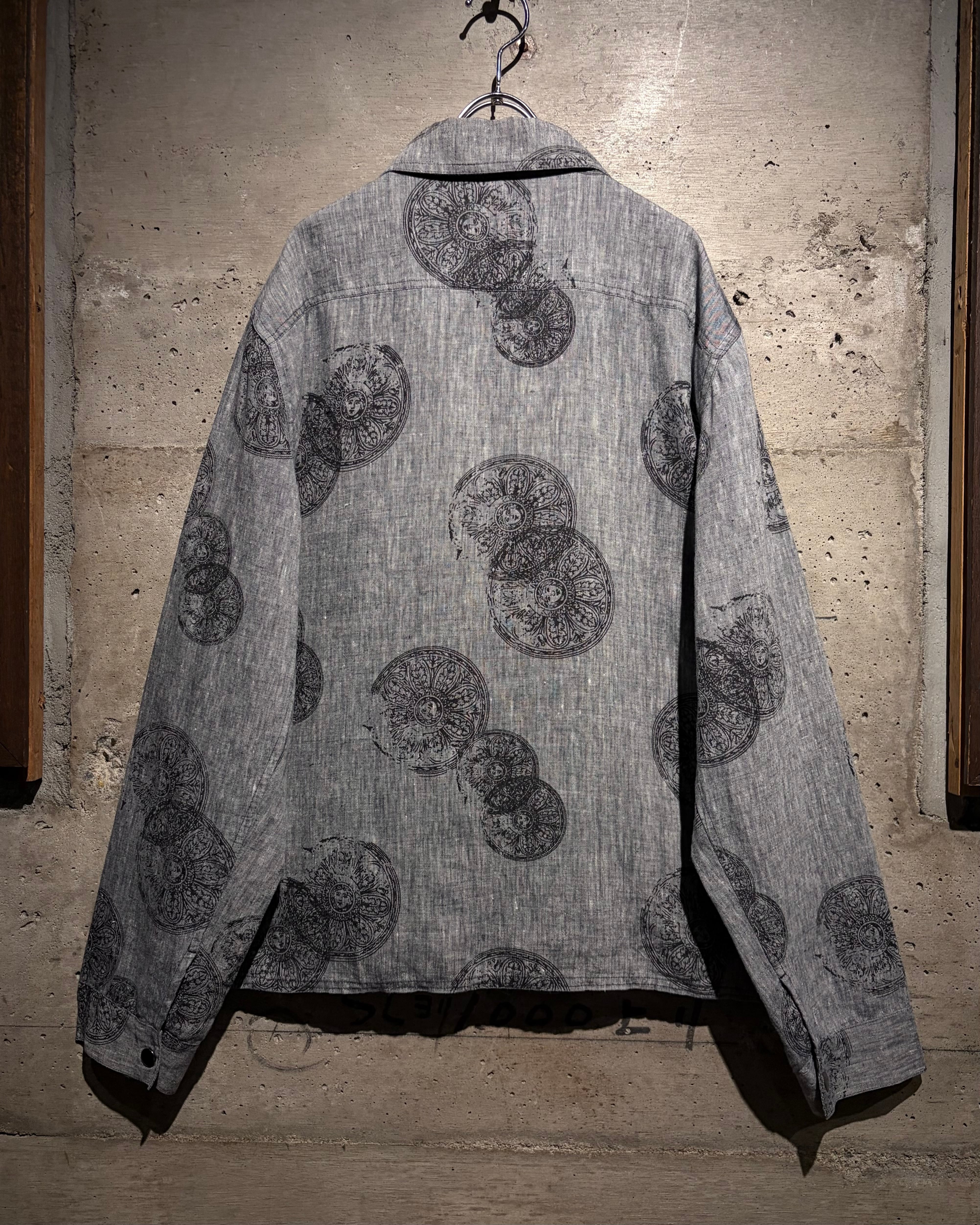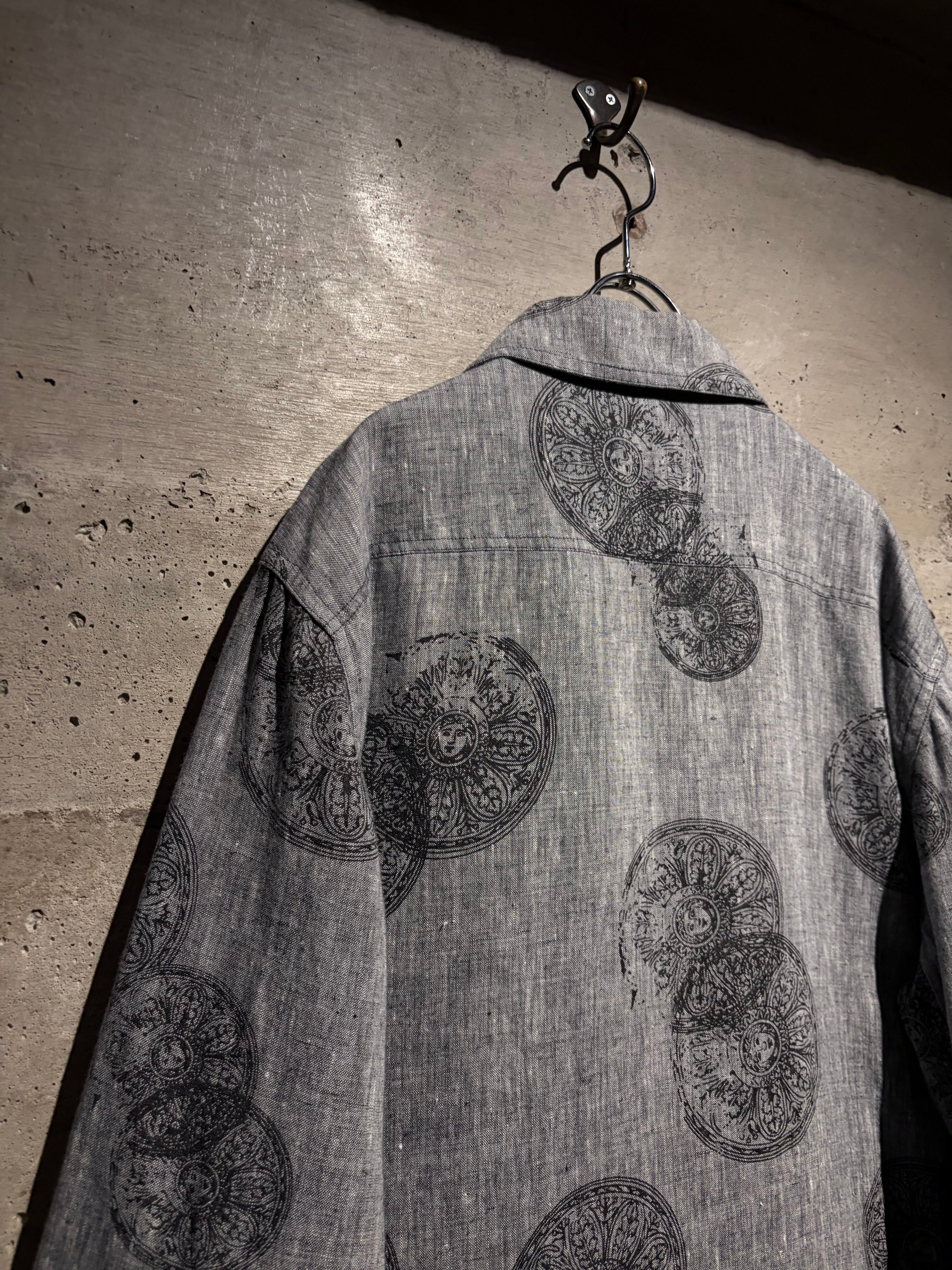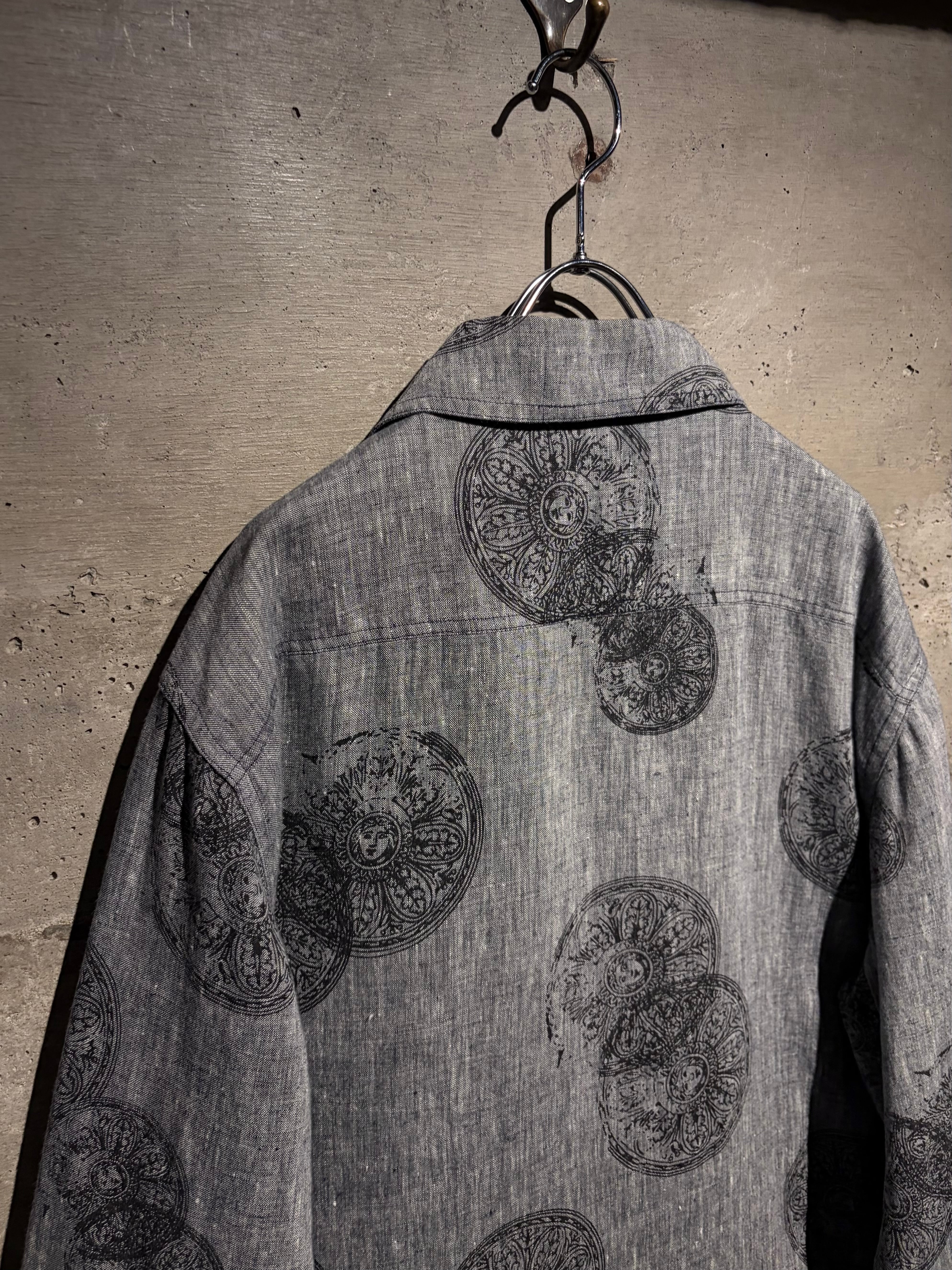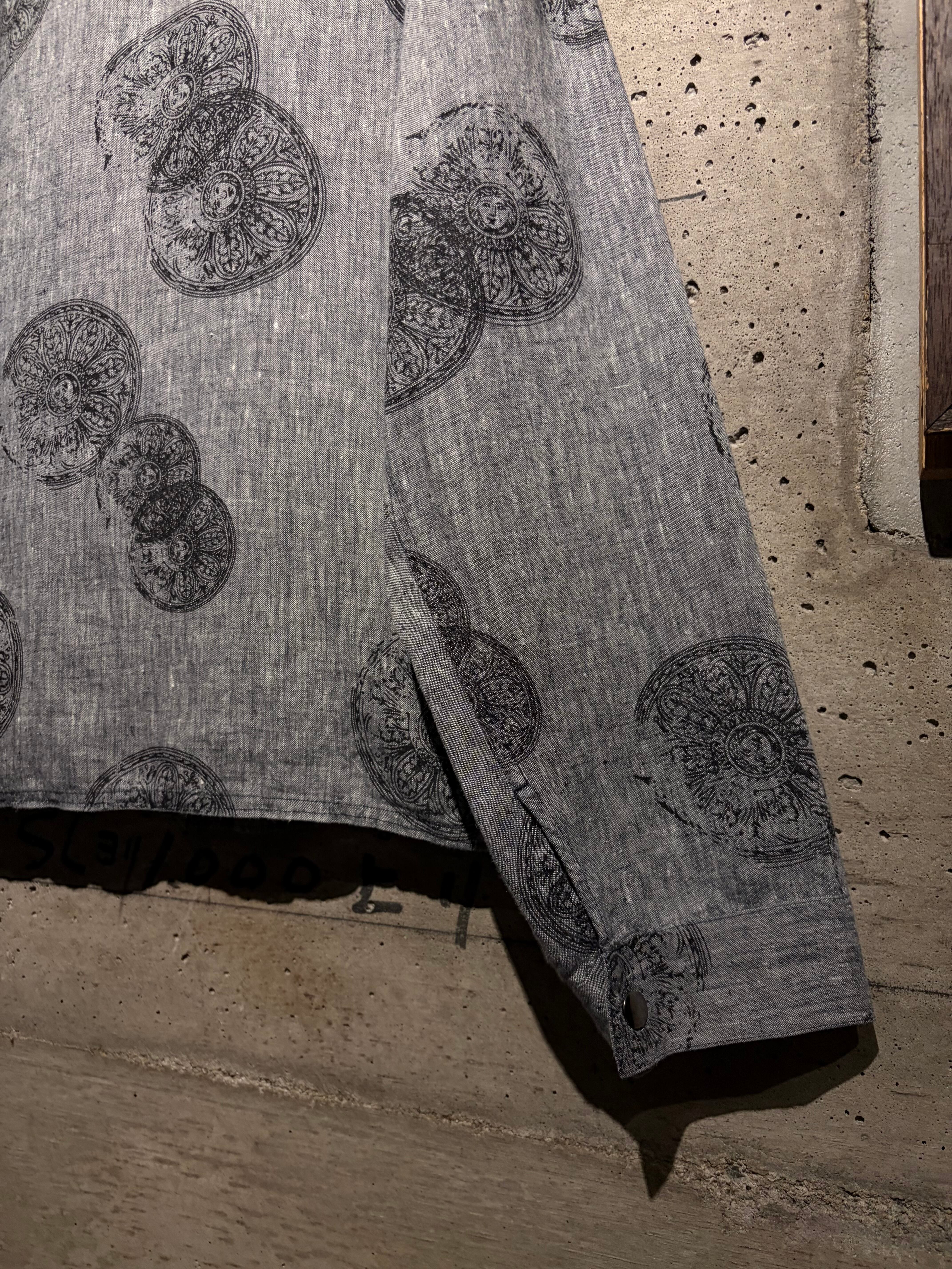 ドライタッチなグレーボディをベースに、繊細かつアーティスティックなフラワーモチーフを全面に落とし込んだ一着。単調になりがちなワントーンの中に、奥行きと動きを生む柄配置が秀逸。