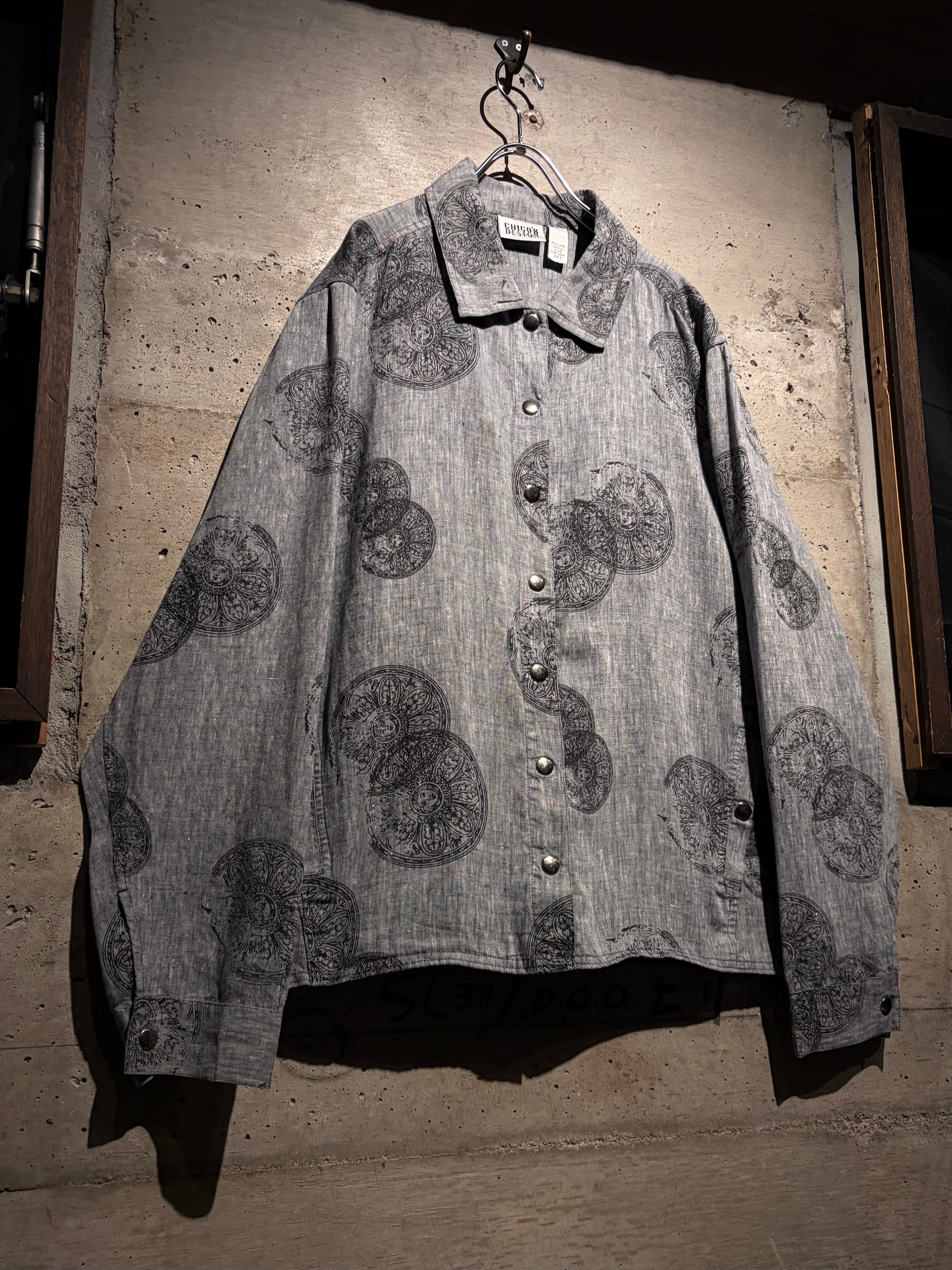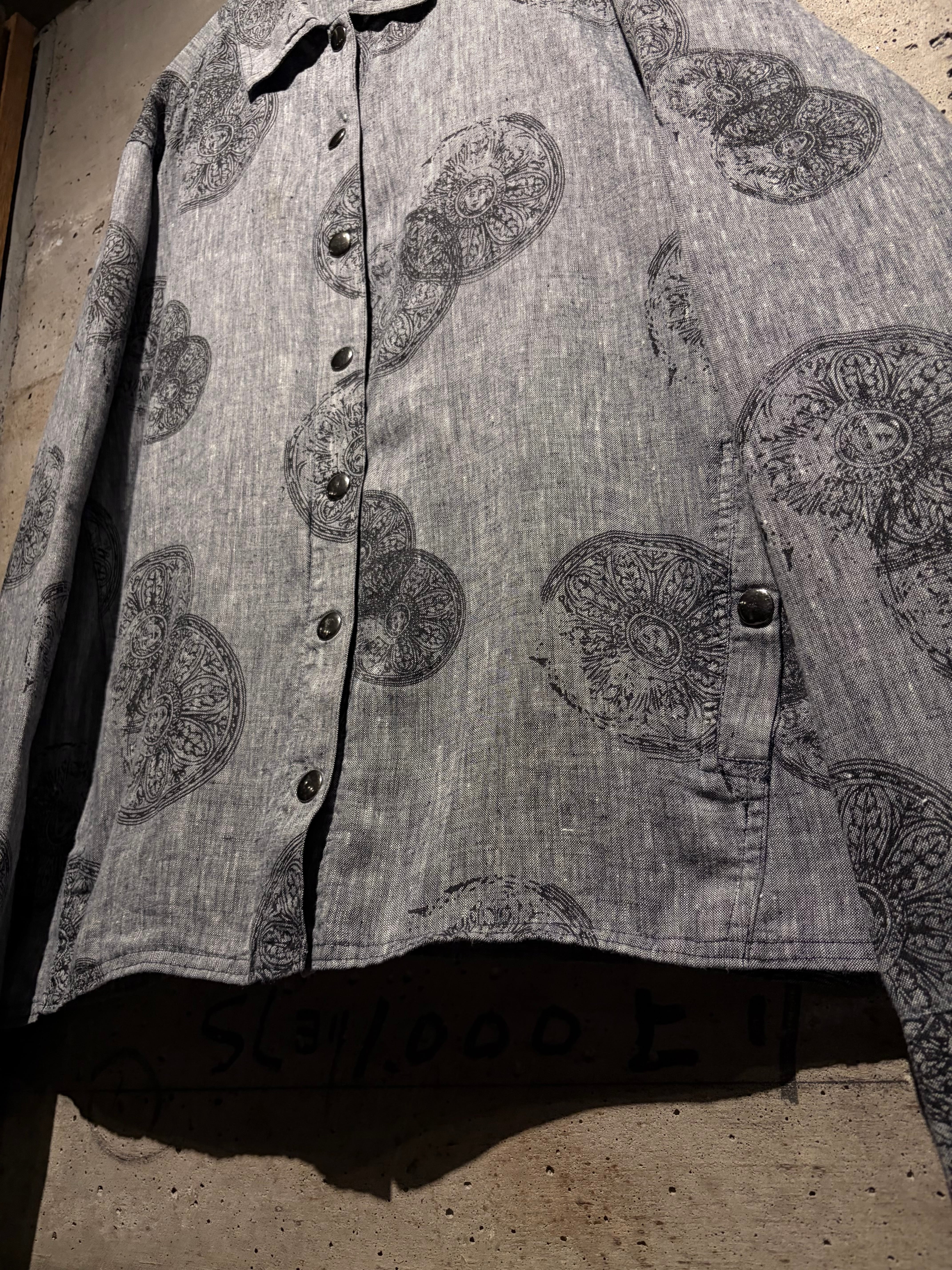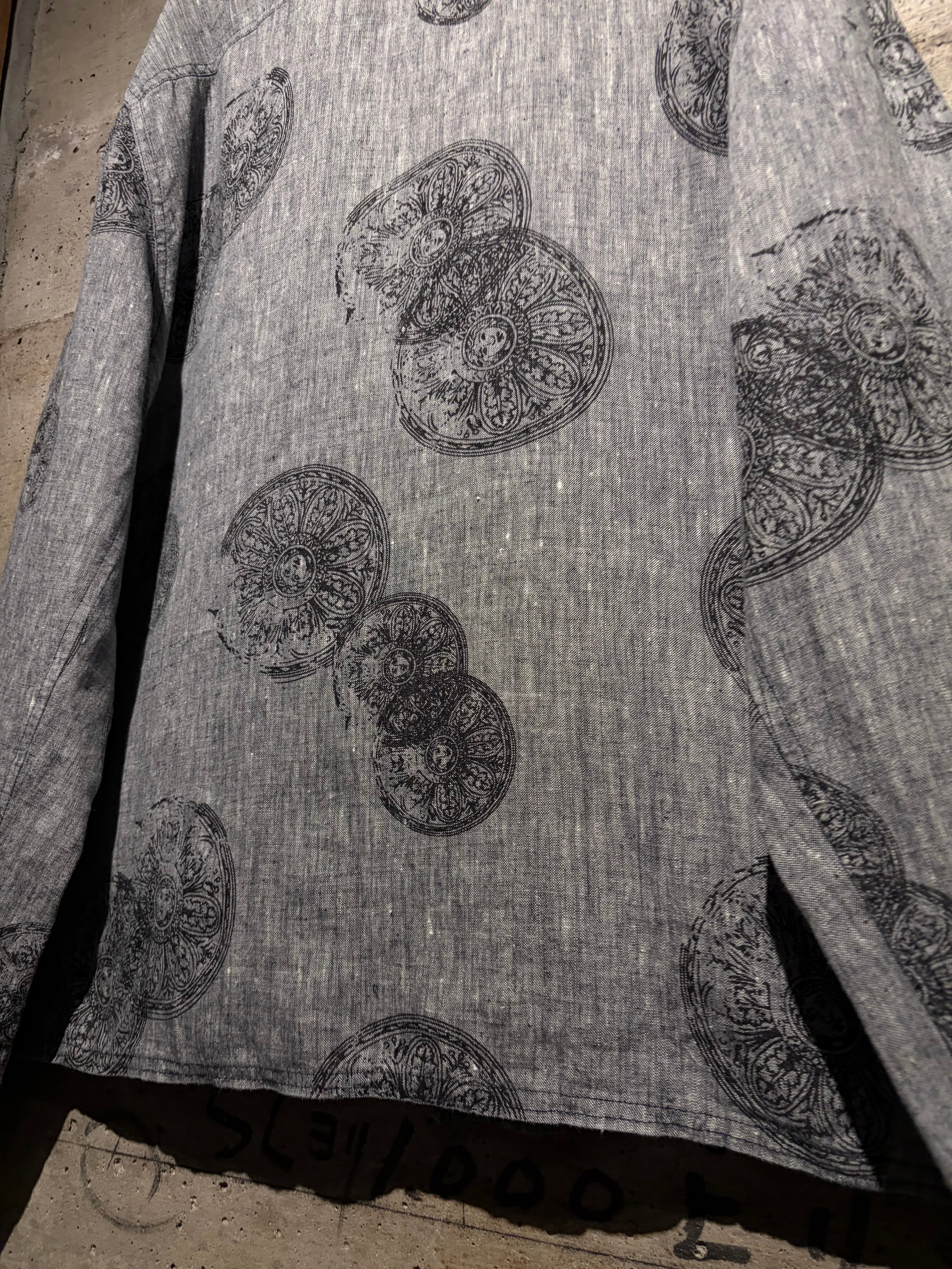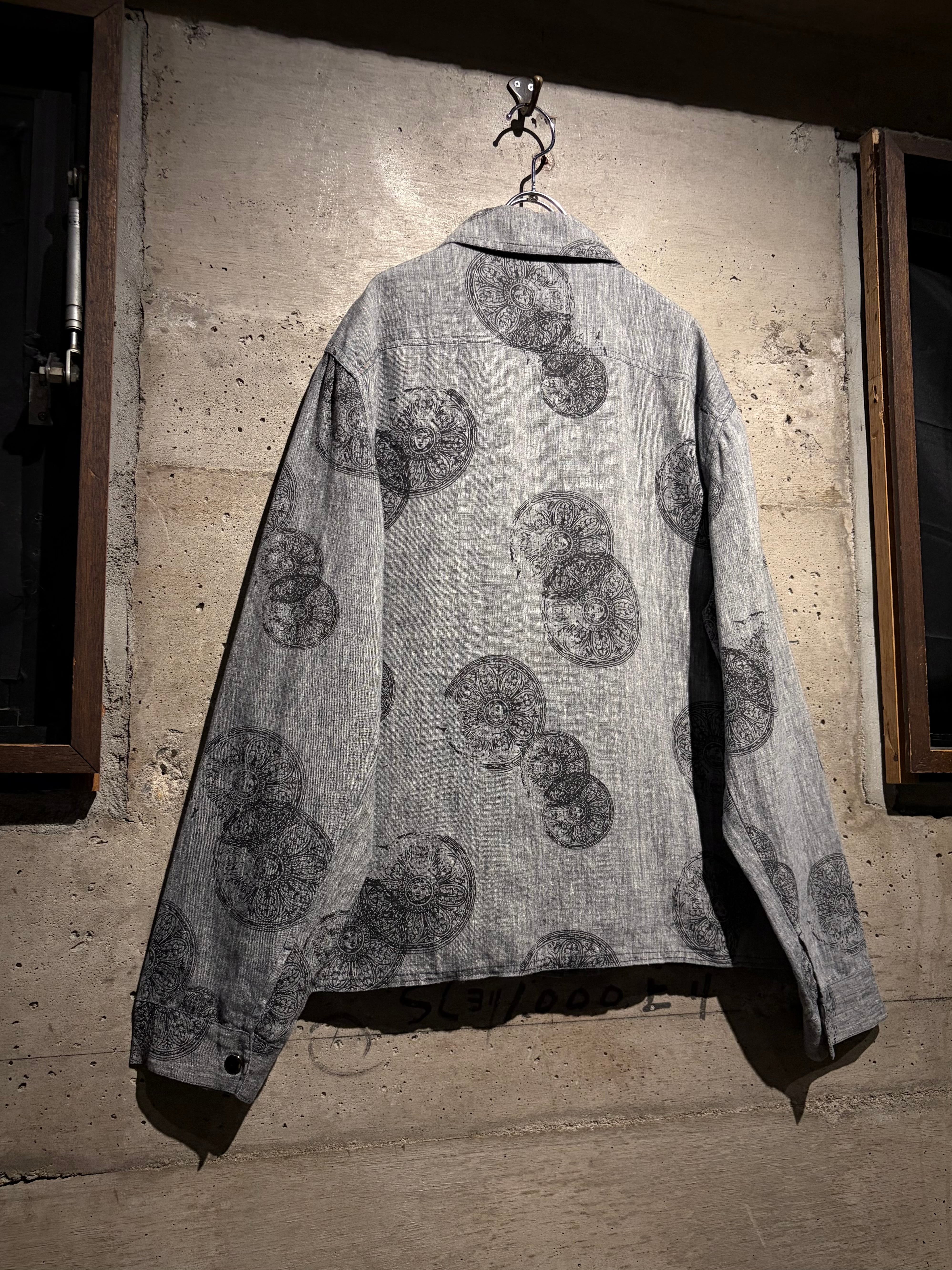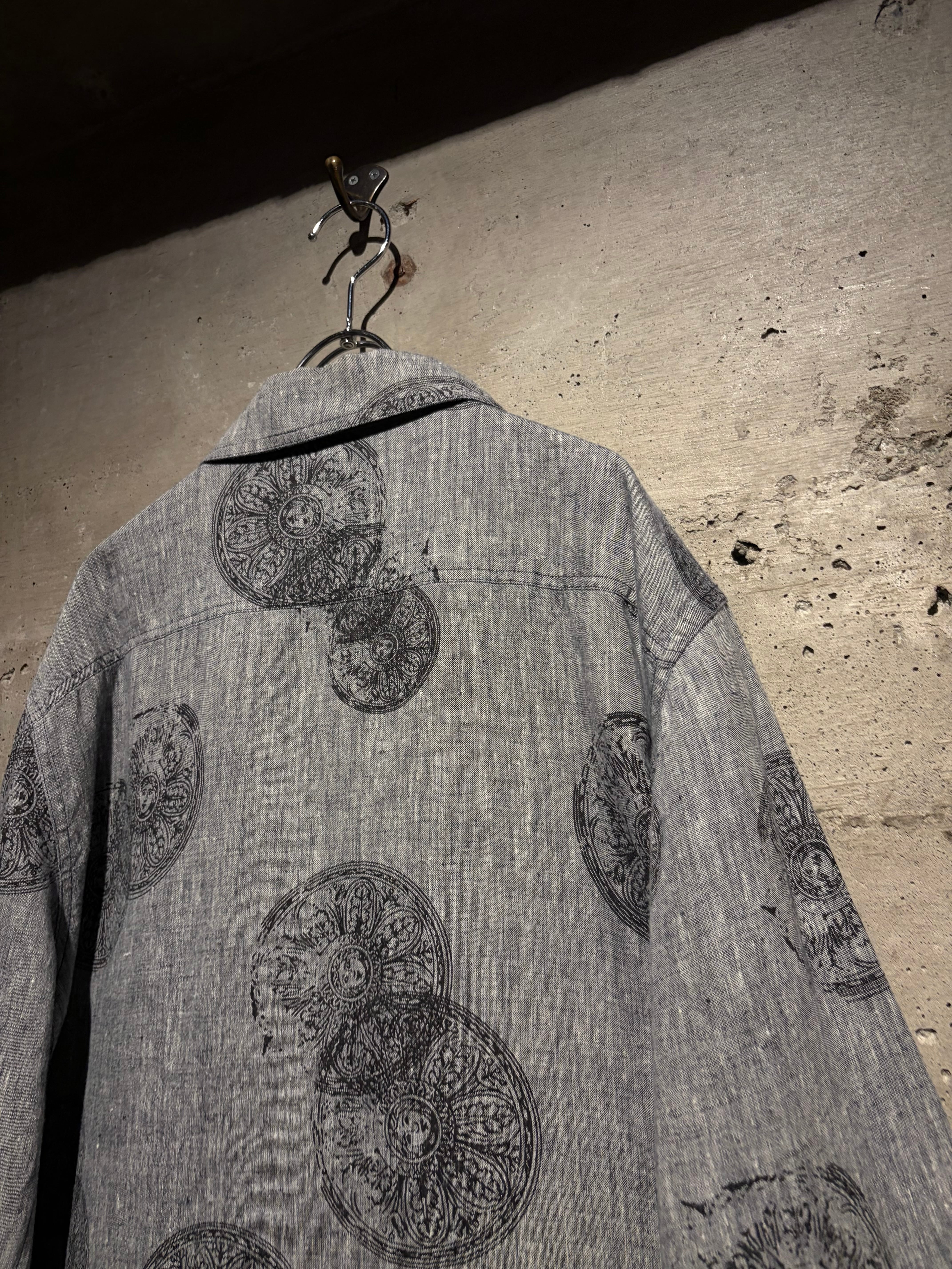 ドライタッチなグレーボディをベースに、繊細かつアーティスティックなフラワーモチーフを全面に落とし込んだ一着。単調になりがちなワントーンの中に、奥行きと動きを生む柄配置が秀逸。