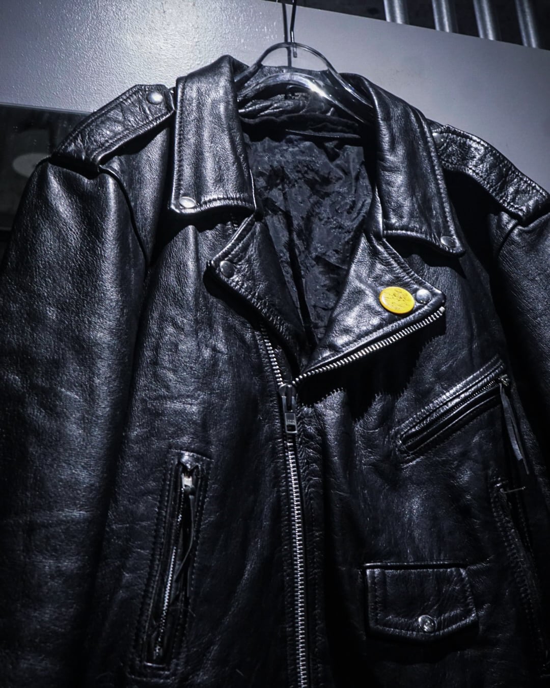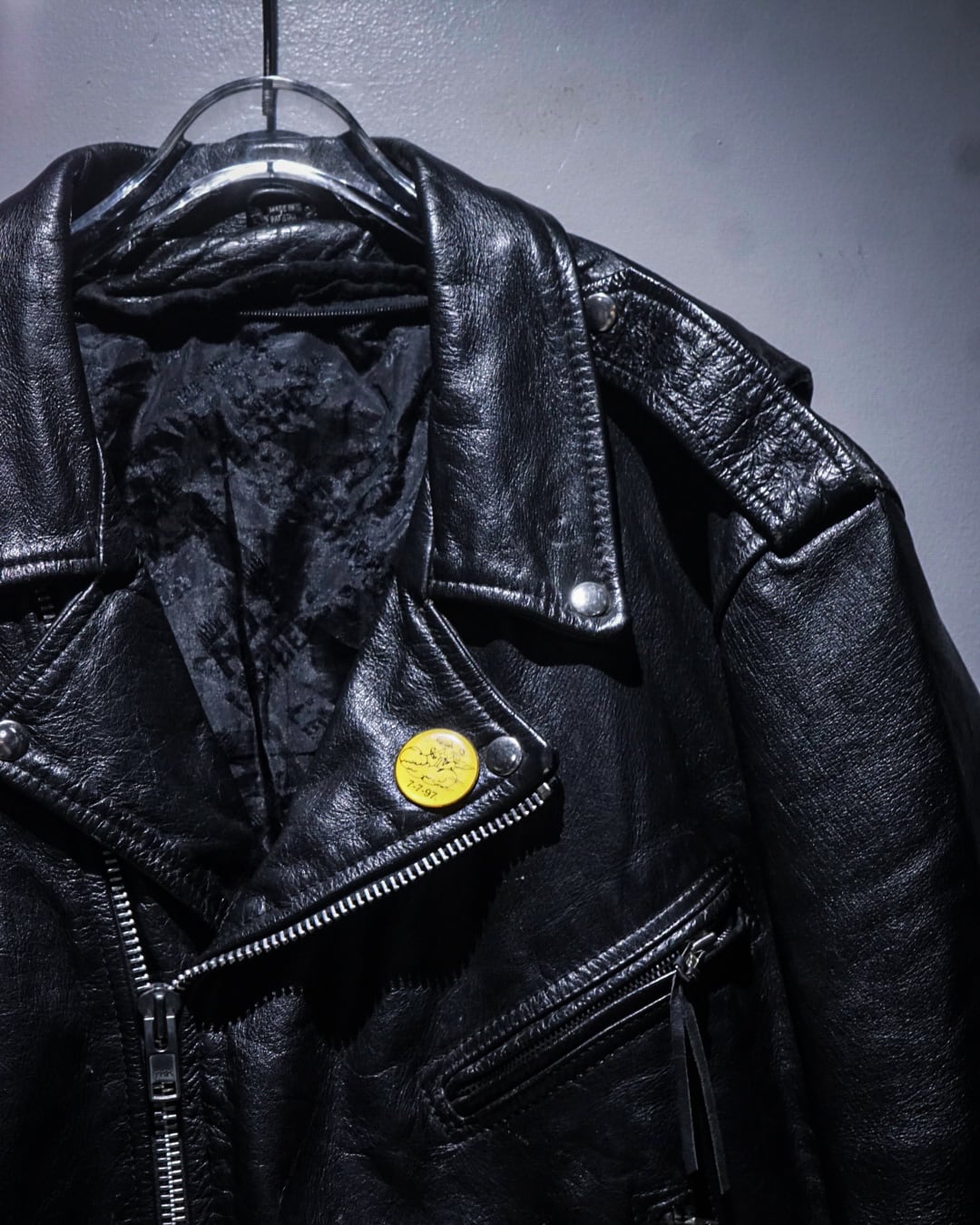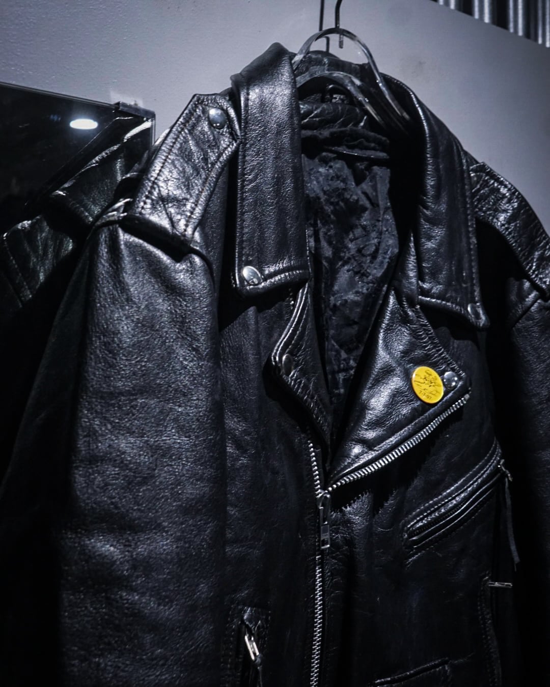 フロントは王道のダブル仕様に、ラペル、エポレット、ジップポケットといったライダースのアイコニックなディテールを網羅。加えて胸元にはピンバッジが施され、ハードな印象の中にどこか遊びの効いたアクセントも。