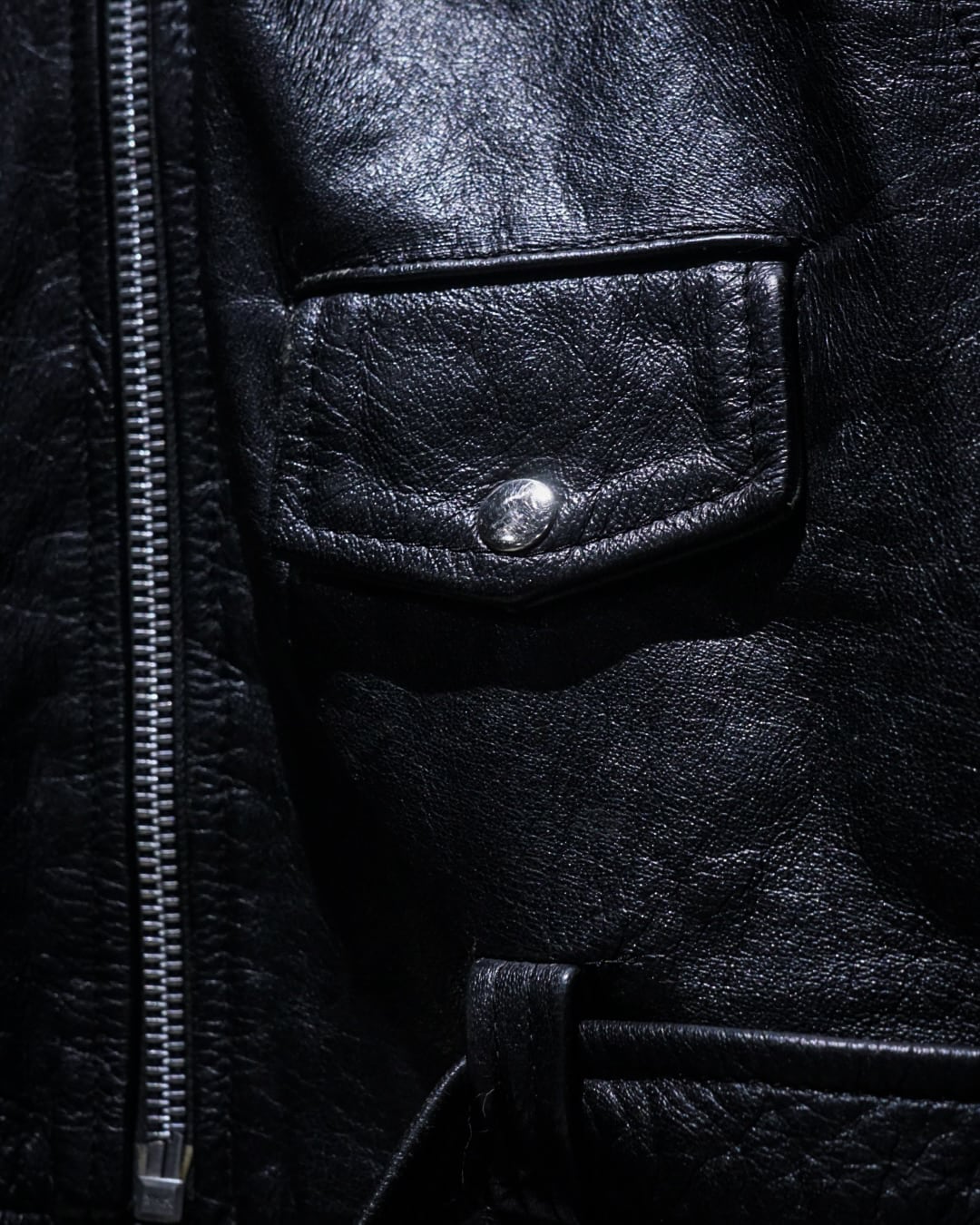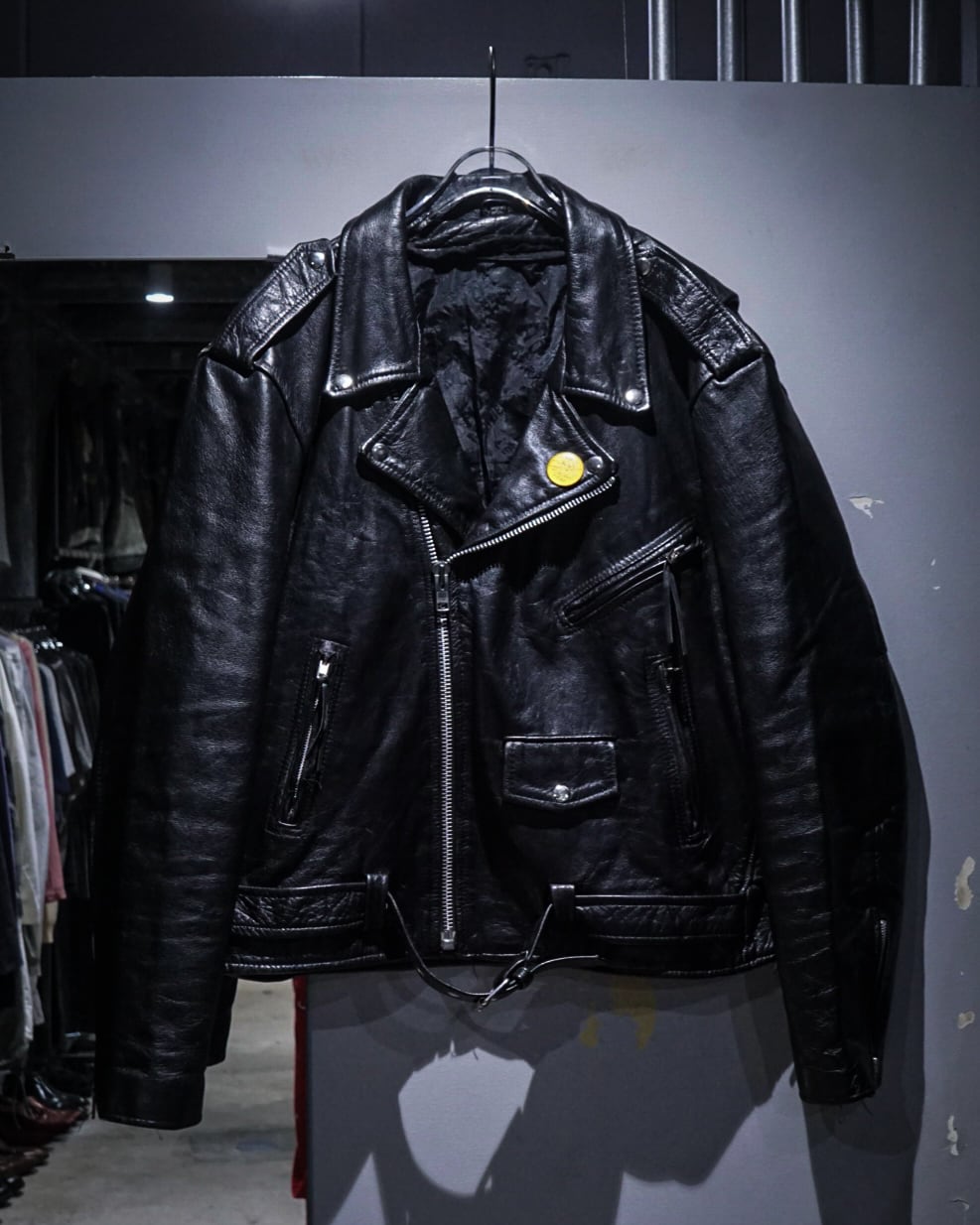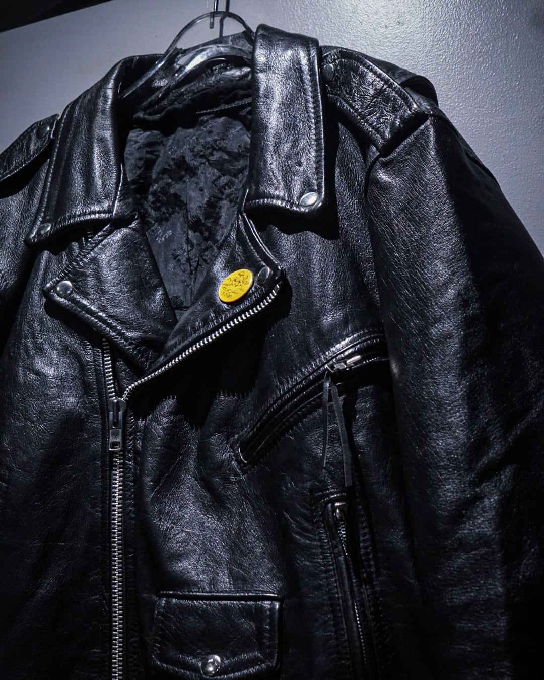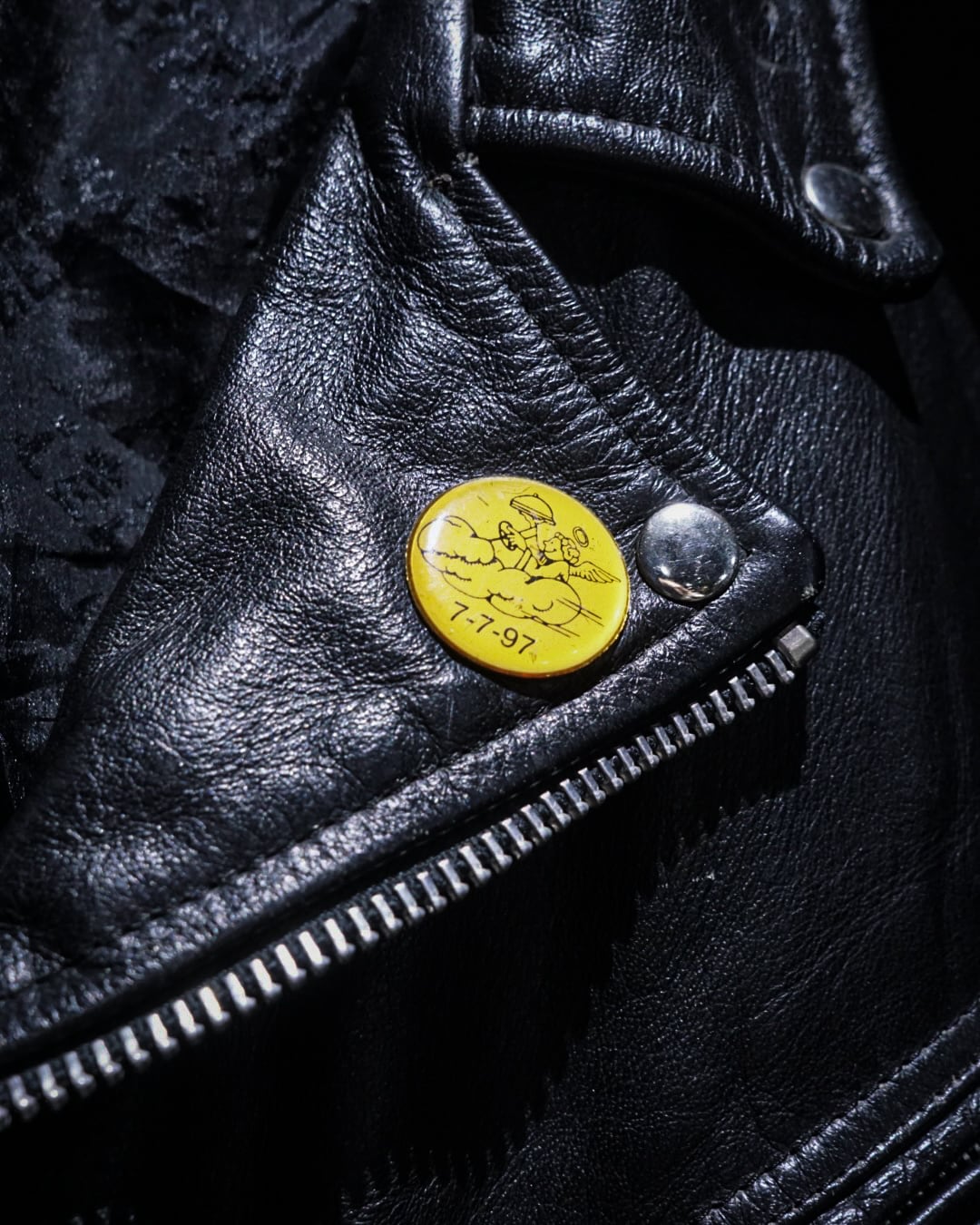 フロントは王道のダブル仕様に、ラペル、エポレット、ジップポケットといったライダースのアイコニックなディテールを網羅。加えて胸元にはピンバッジが施され、ハードな印象の中にどこか遊びの効いたアクセントも。