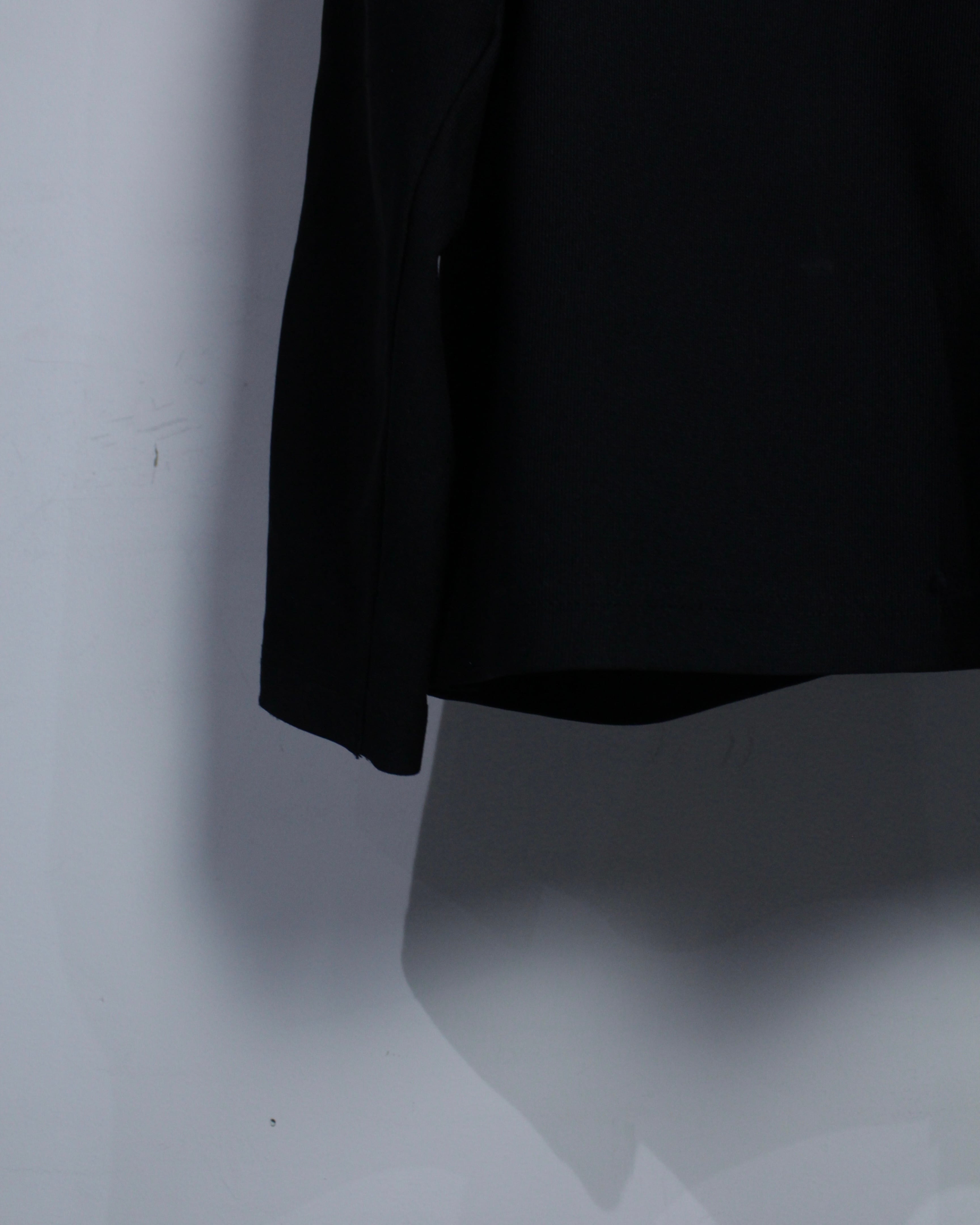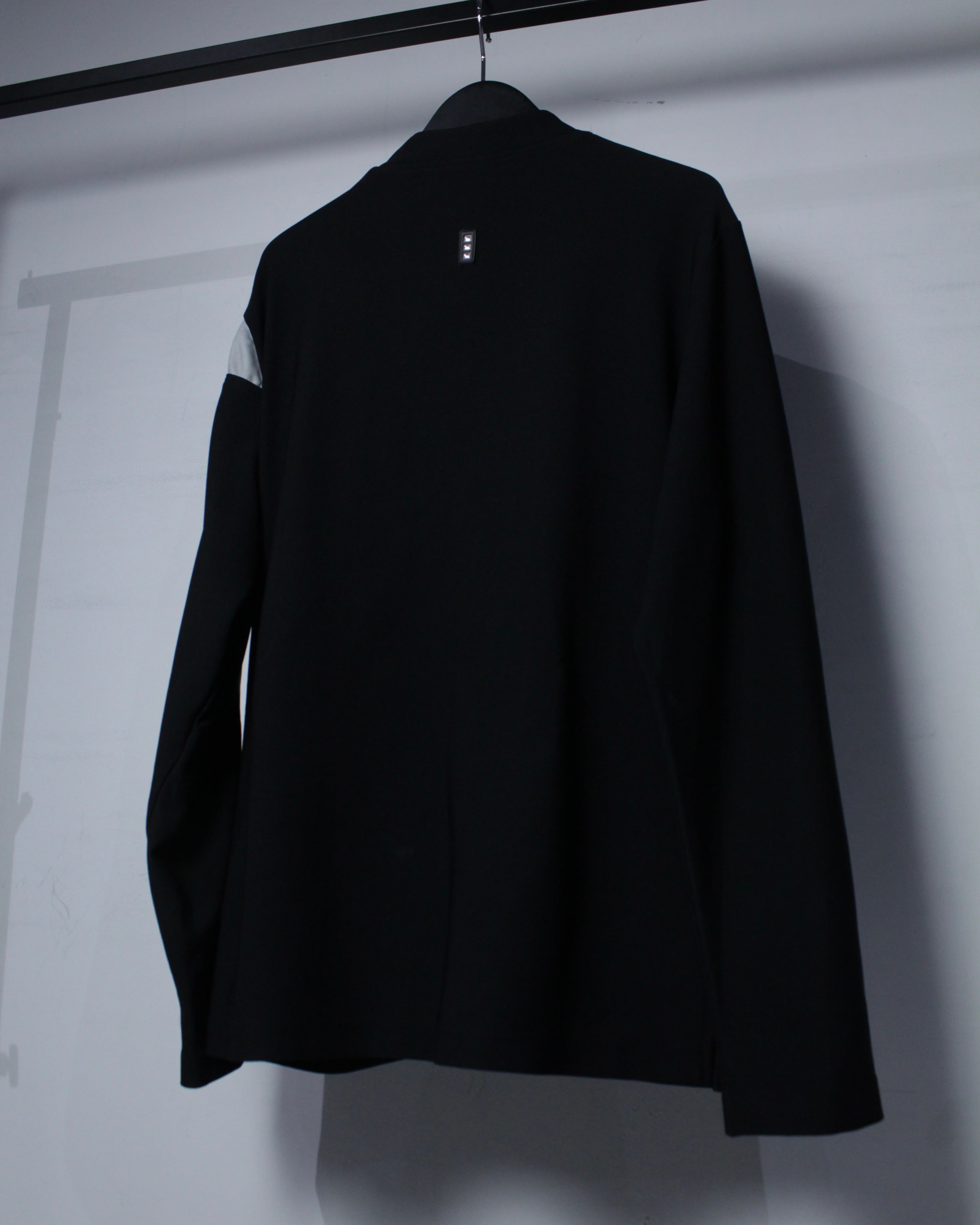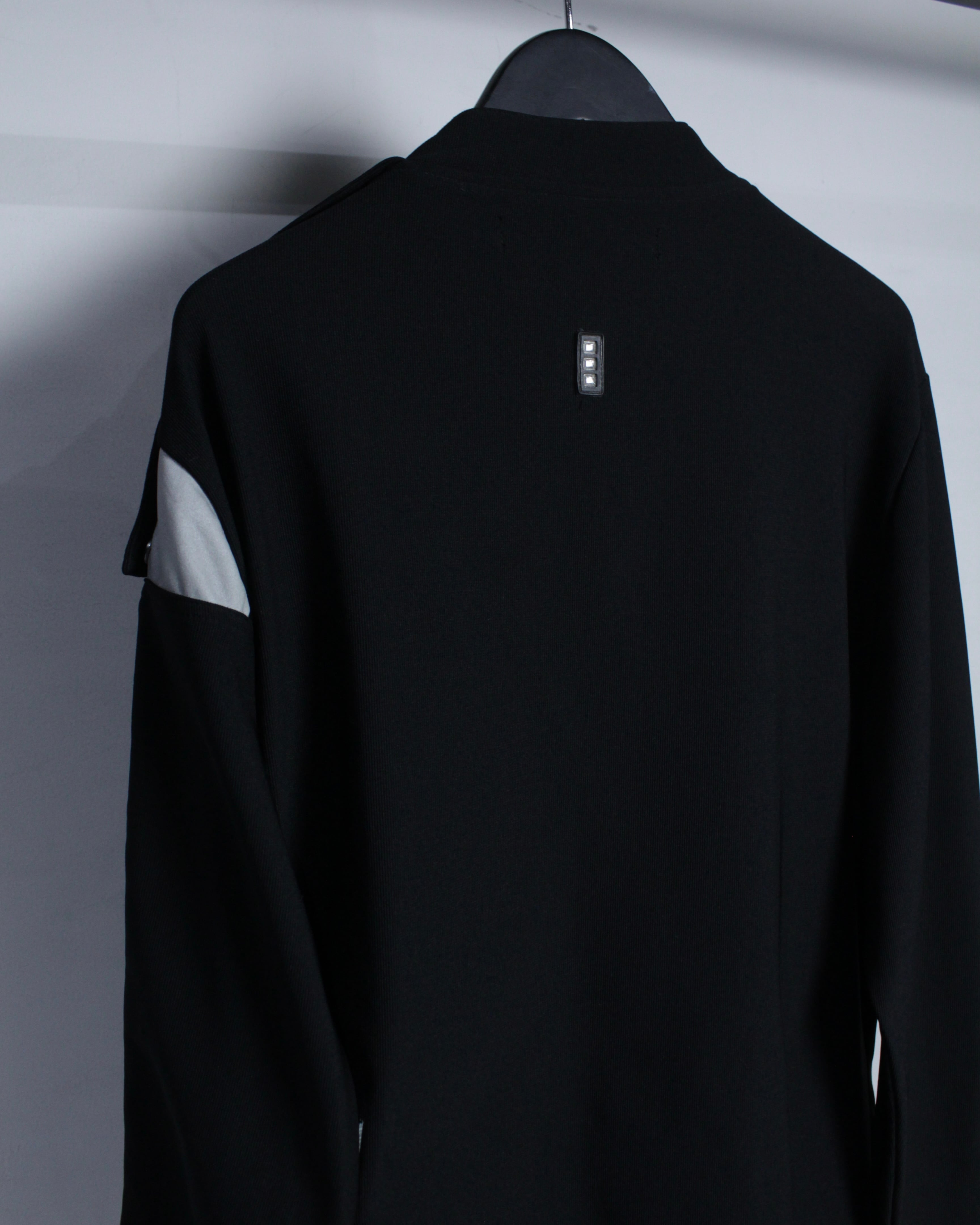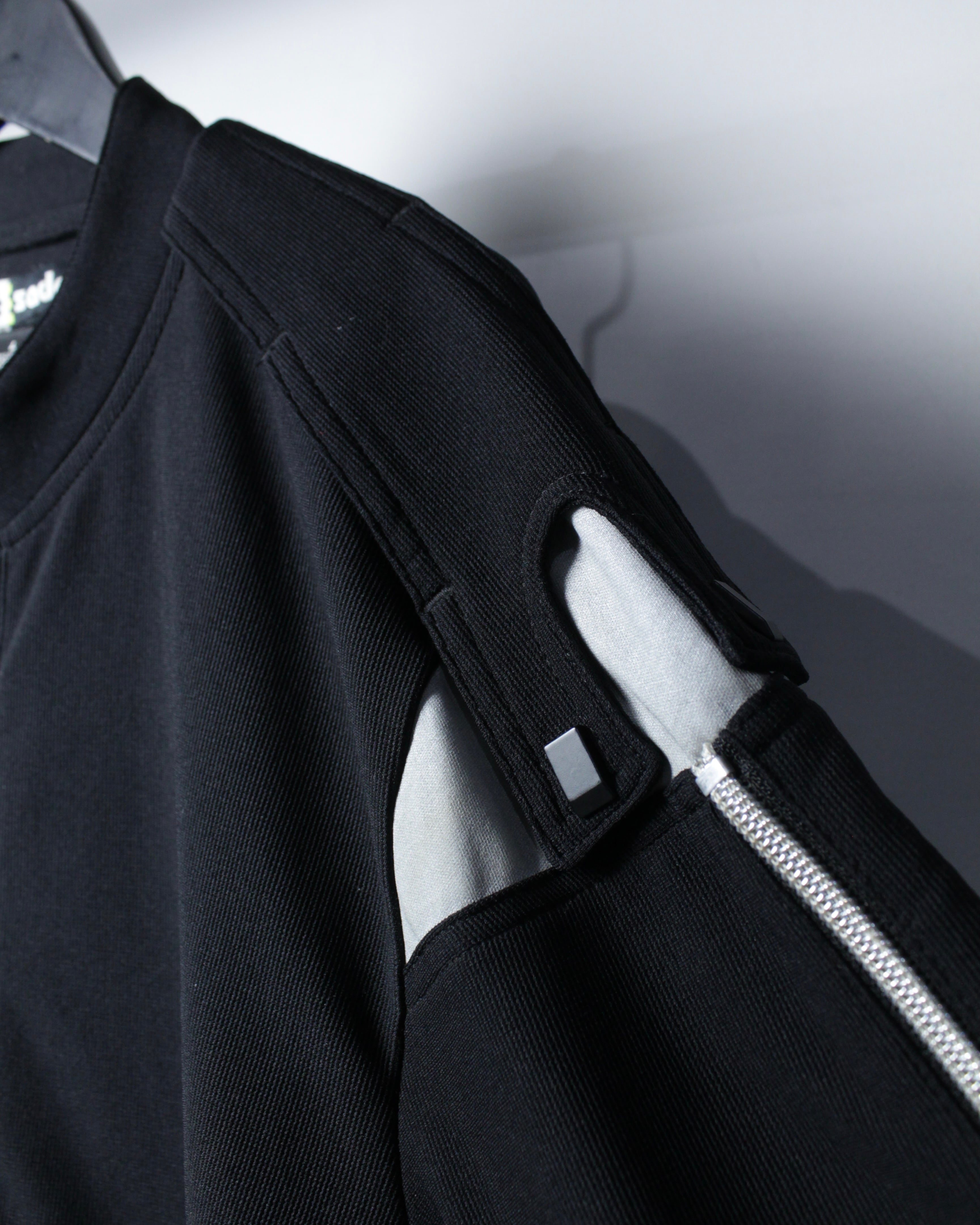 サラッと柔らかく特有の光沢を持つブラックのボディをベースに、胸には小ぶりのポケット、左肩にはエポレットのようなディテール、左アームにはジップが施された逸品、