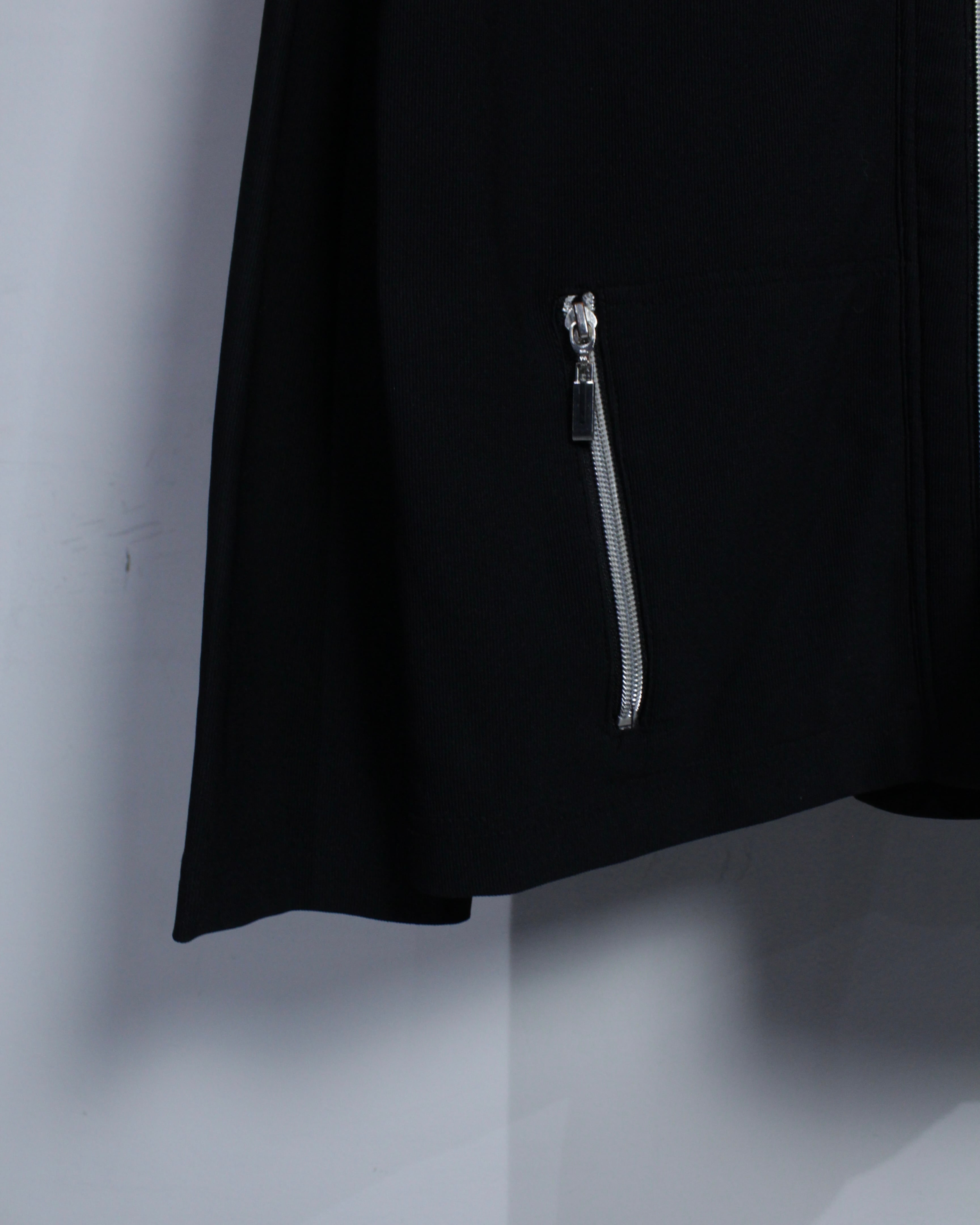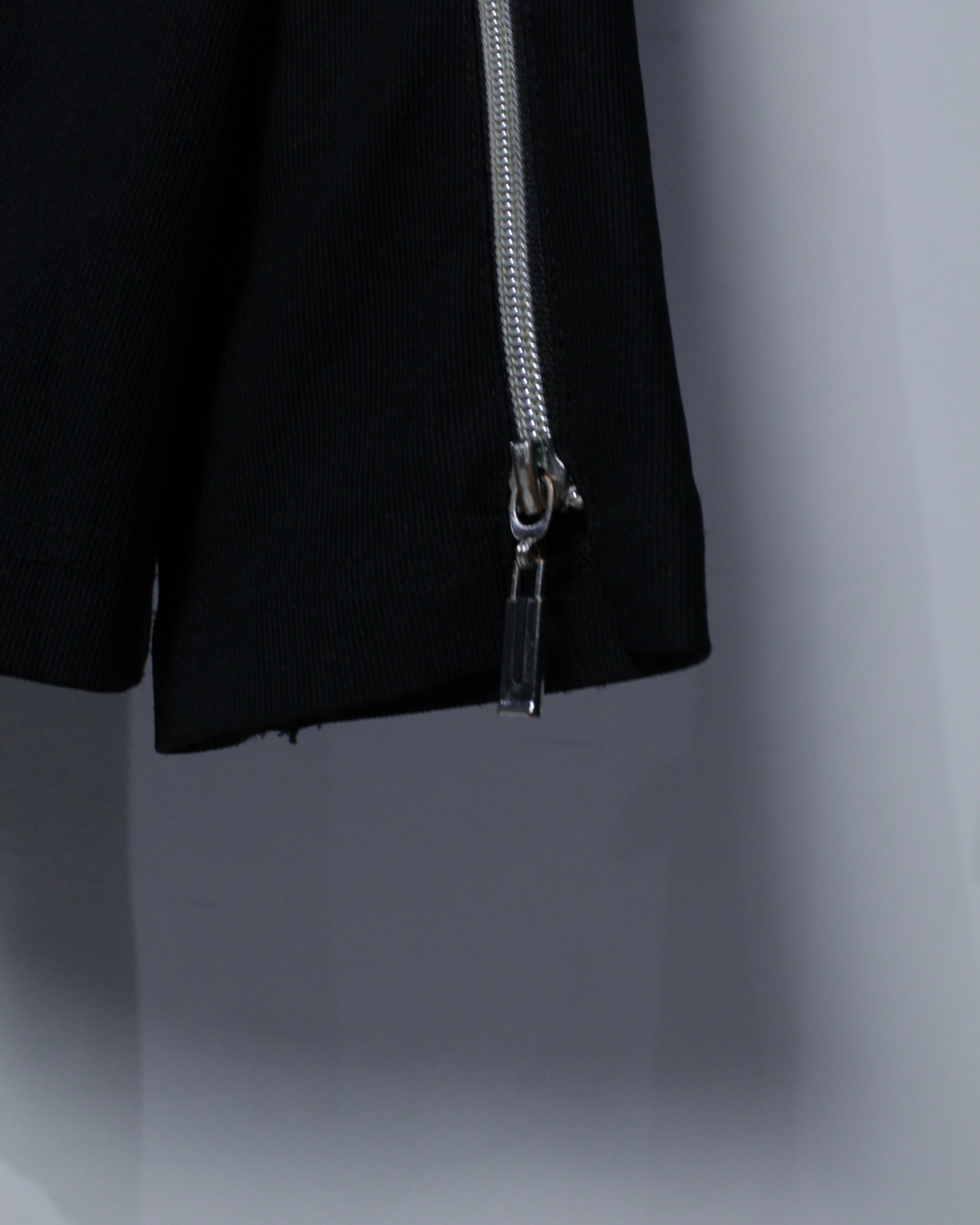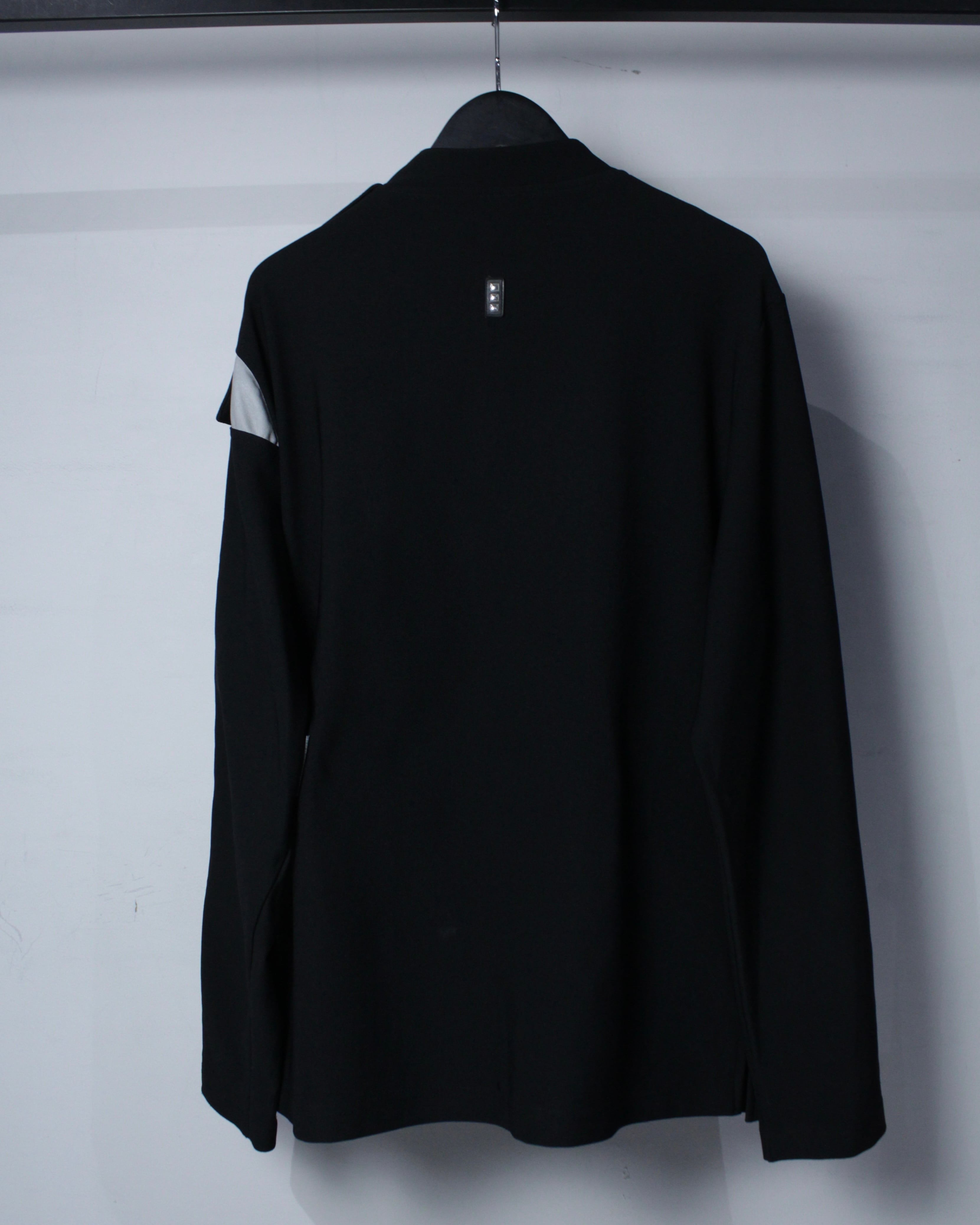 サラッと柔らかく特有の光沢を持つブラックのボディをベースに、胸には小ぶりのポケット、左肩にはエポレットのようなディテール、左アームにはジップが施された逸品、