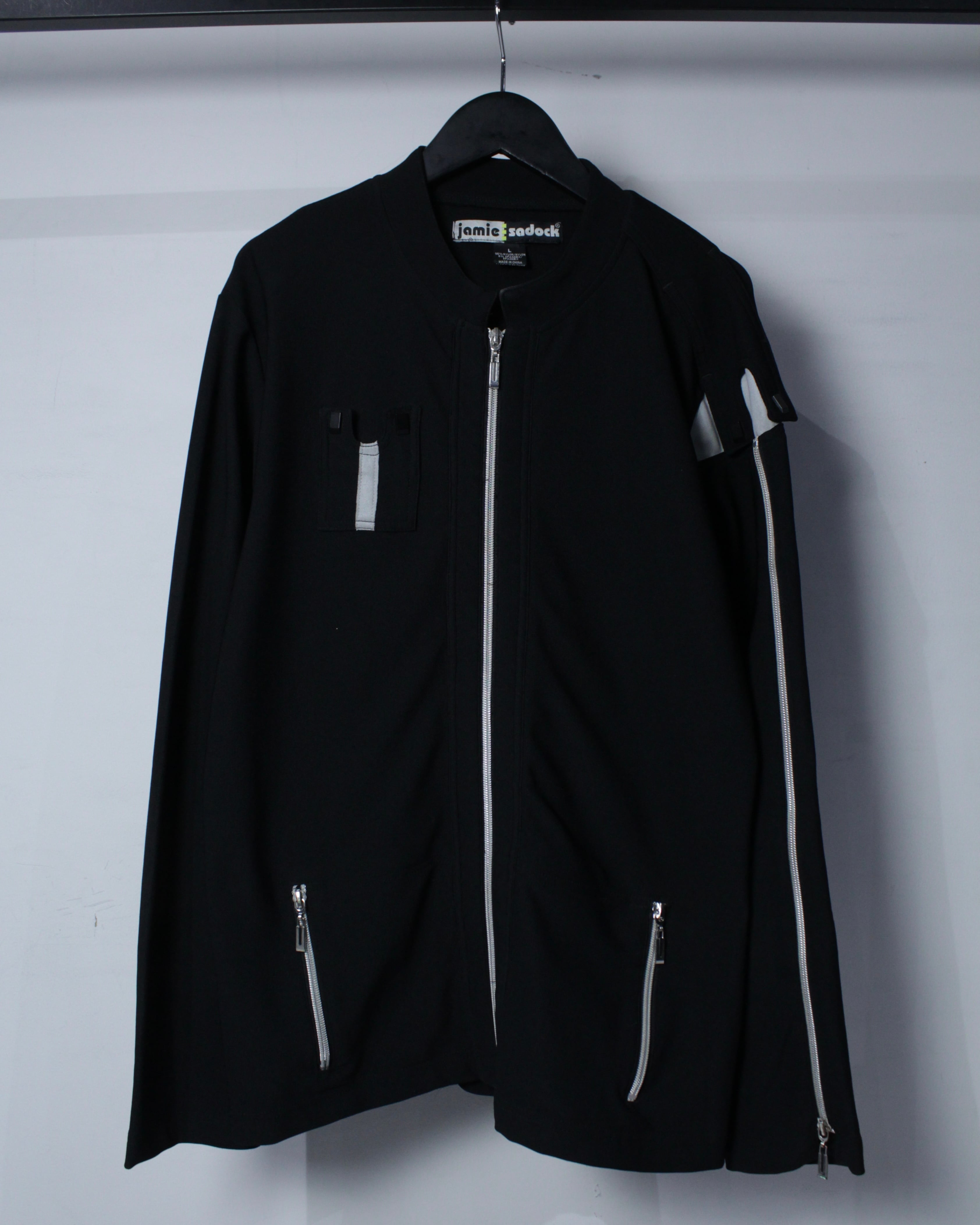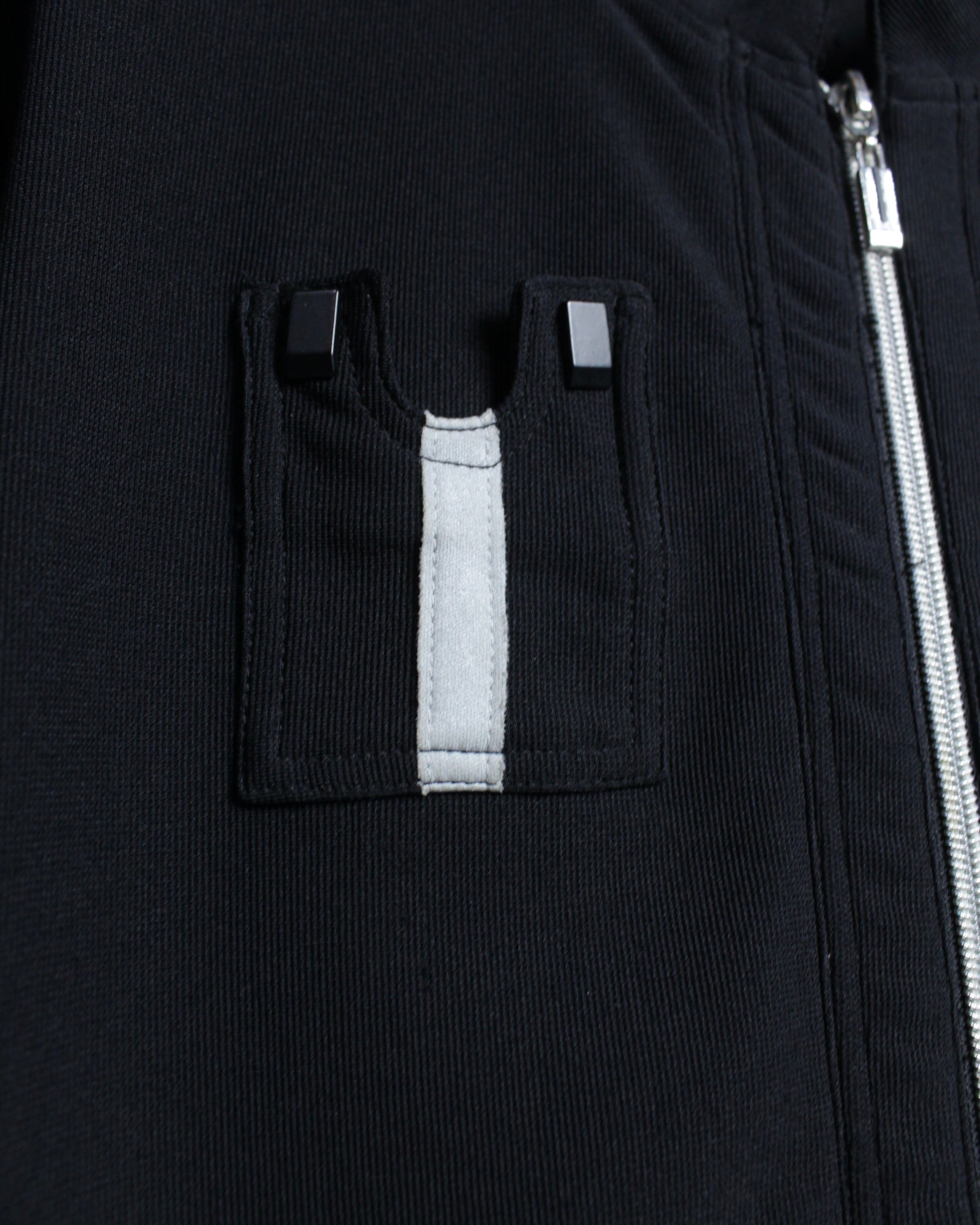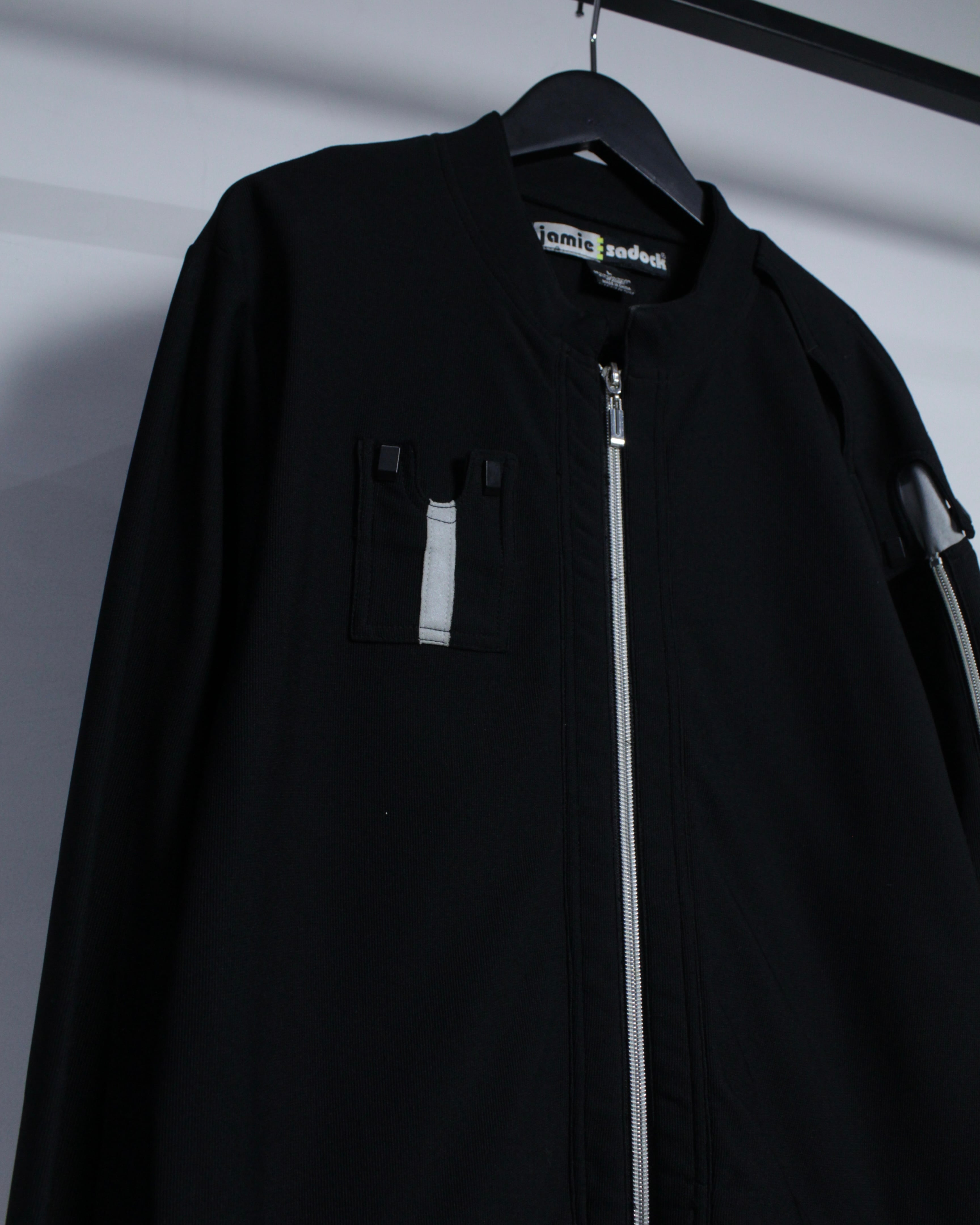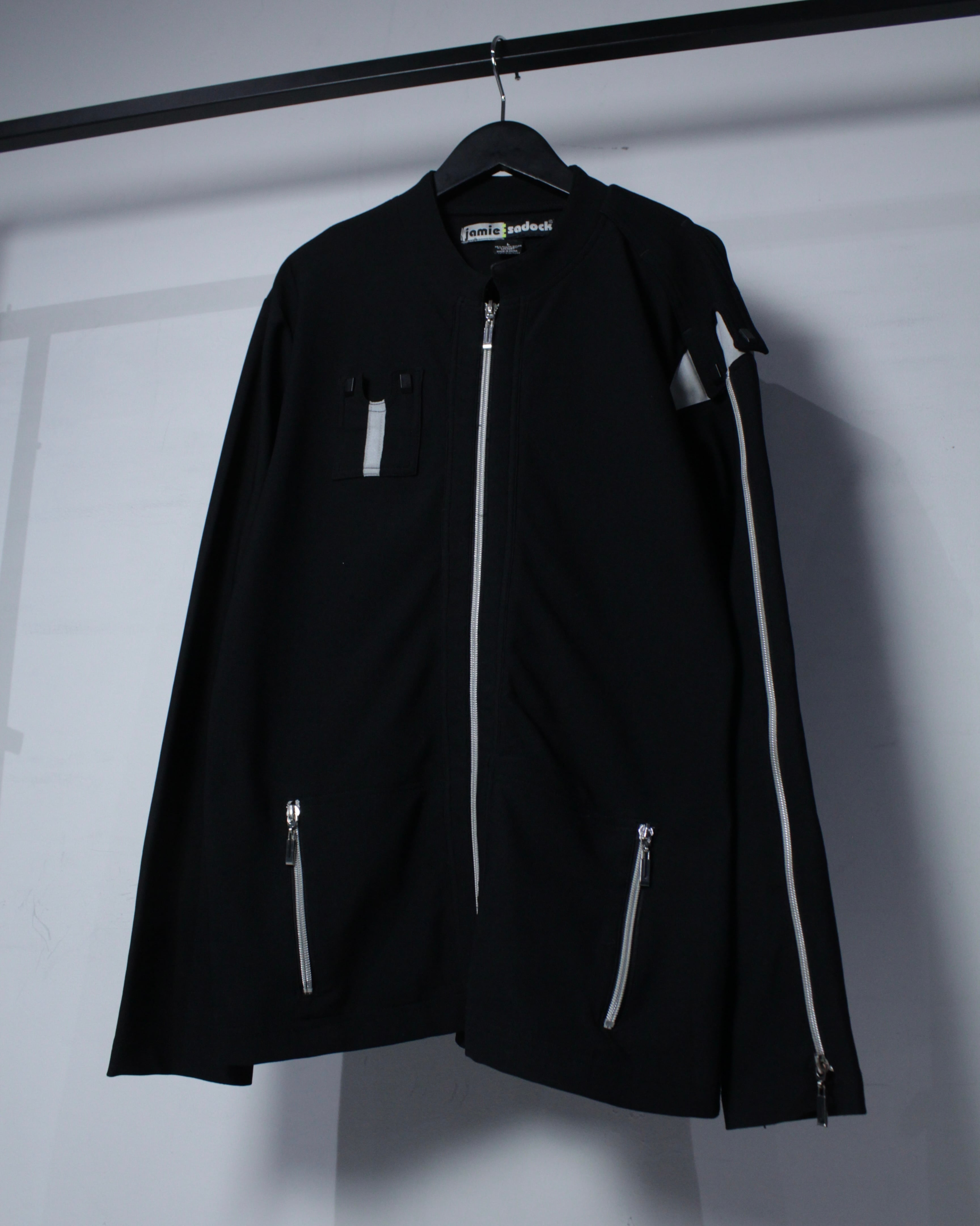サラッと柔らかく特有の光沢を持つブラックのボディをベースに、胸には小ぶりのポケット、左肩にはエポレットのようなディテール、左アームにはジップが施された逸品、