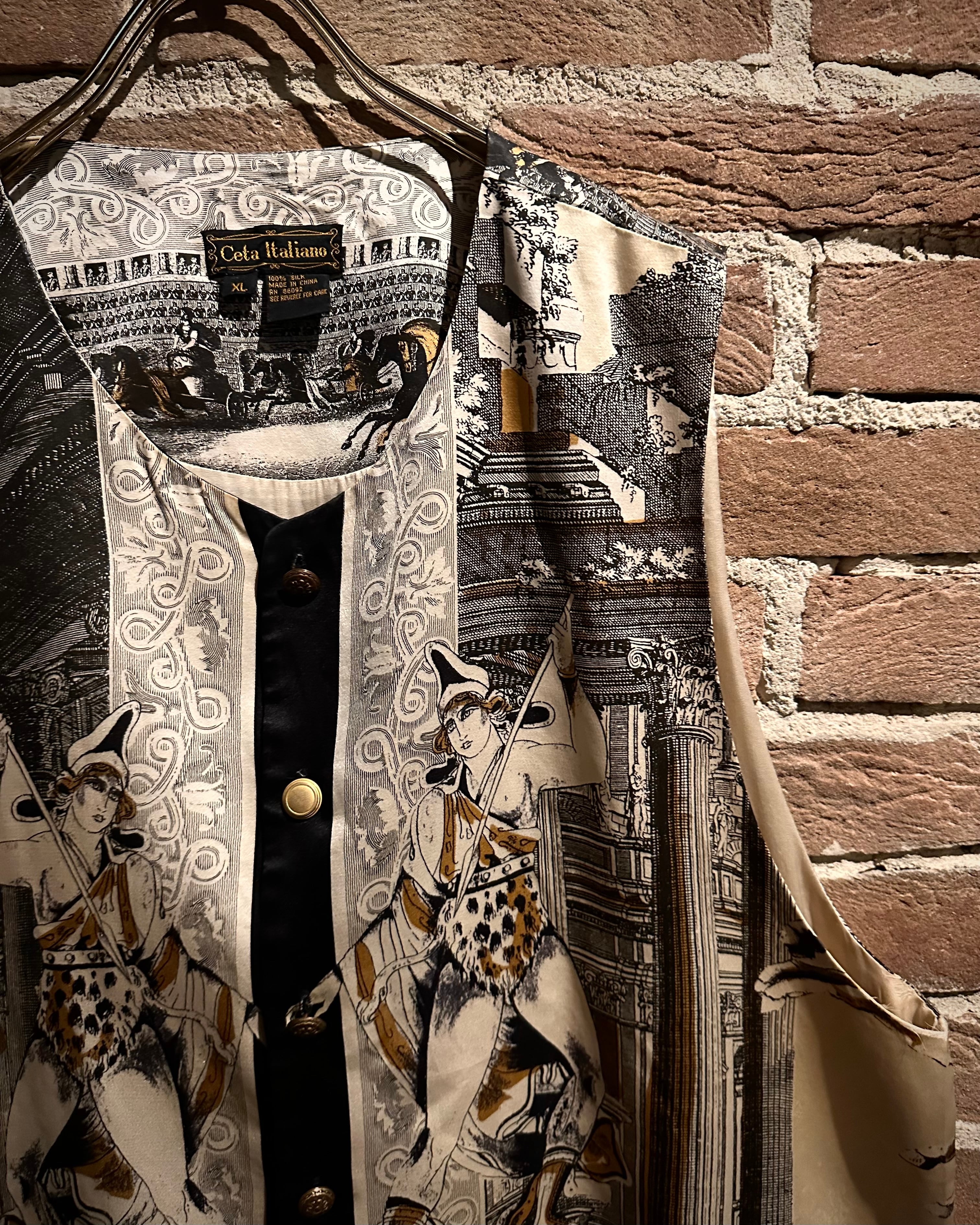 レトロかつラグジュアリーな空気感を纏った、総柄シルクベスト。