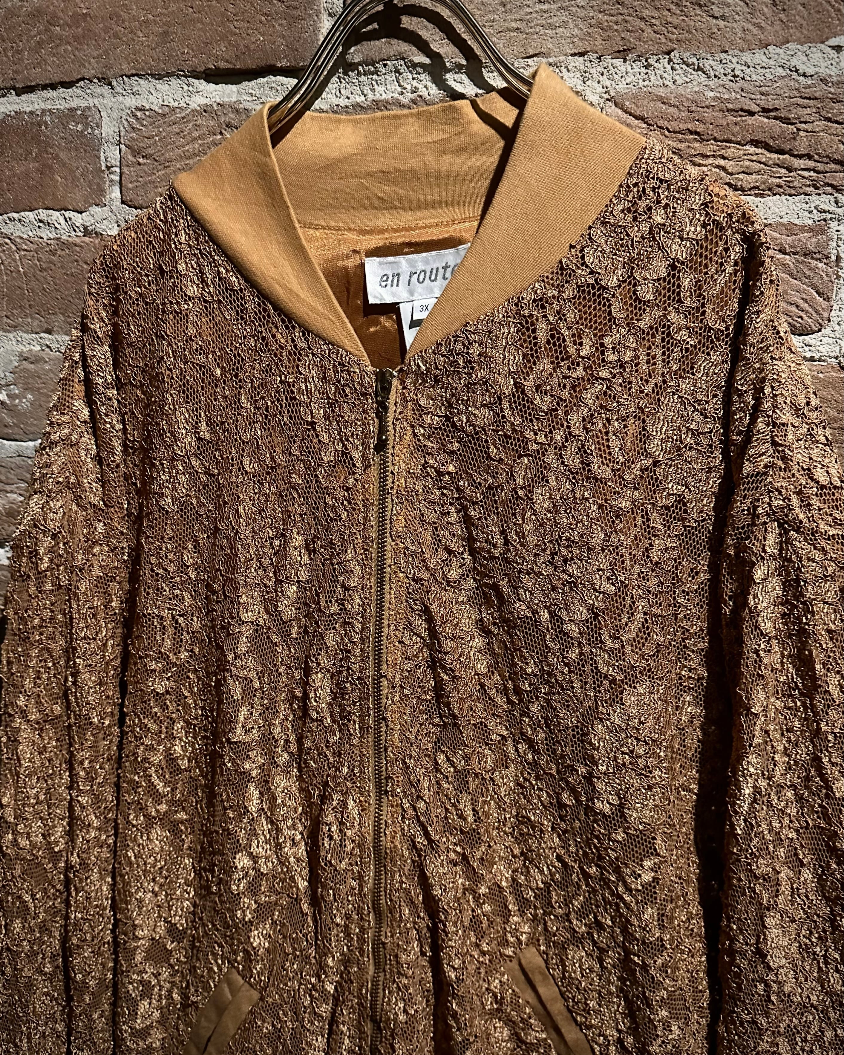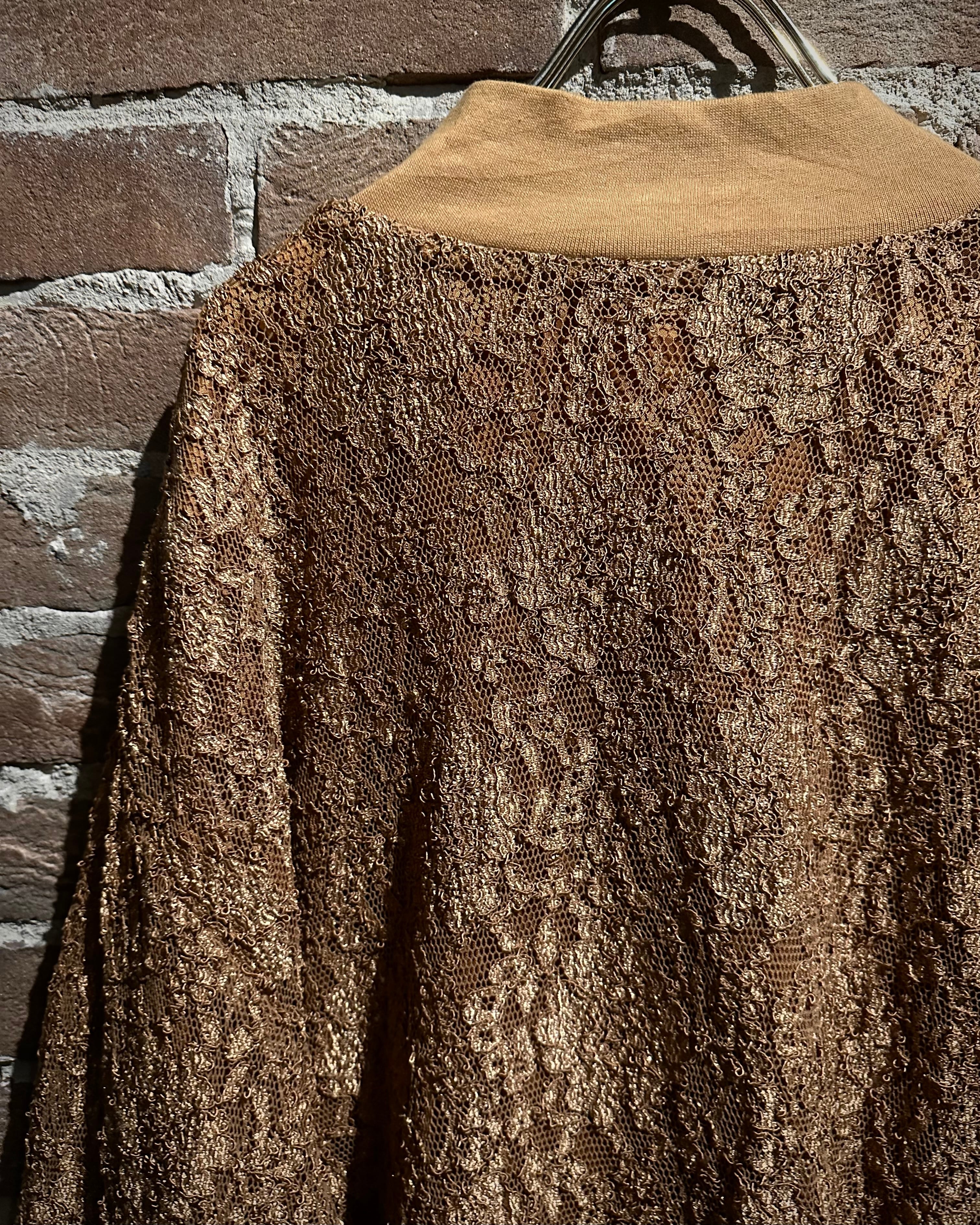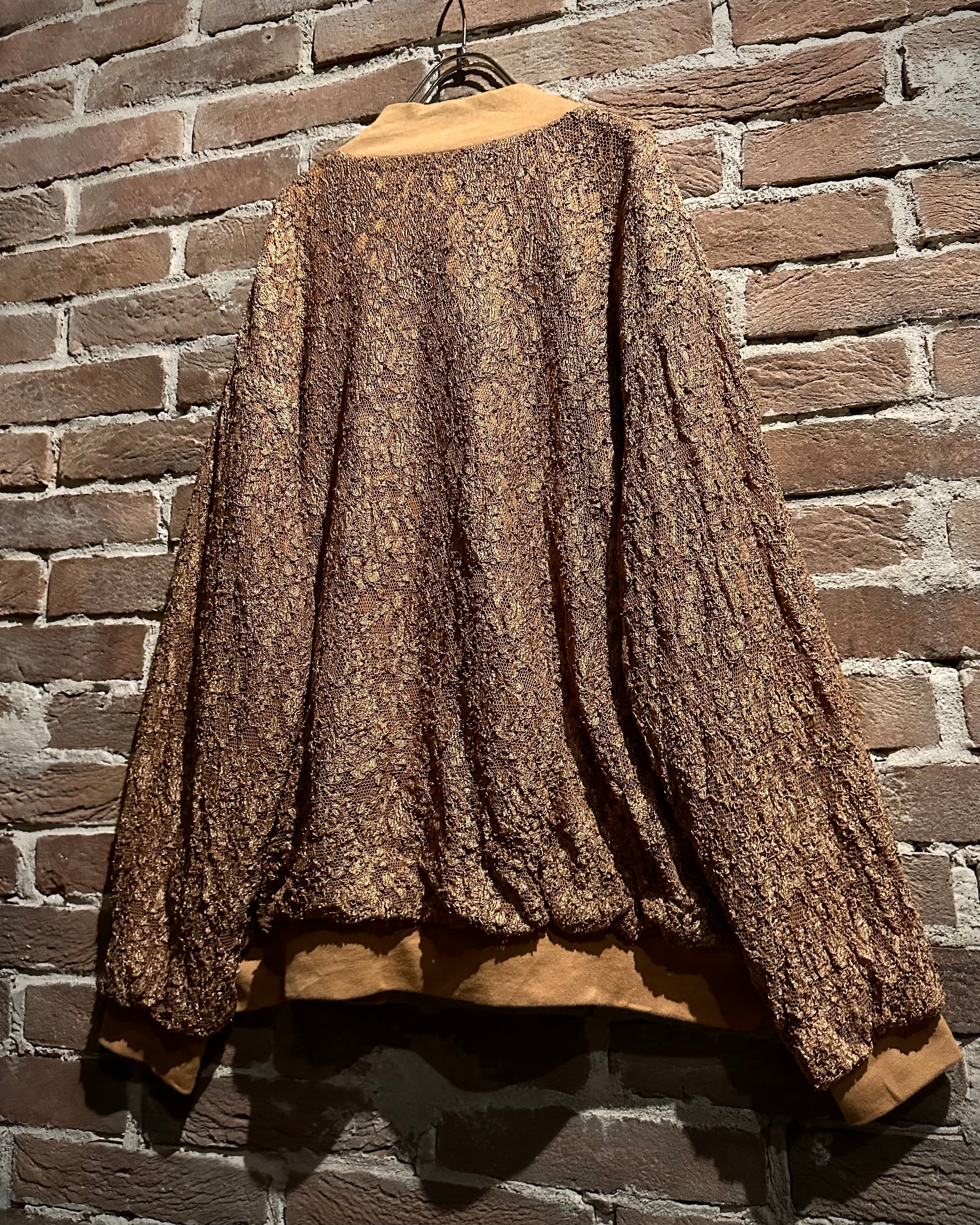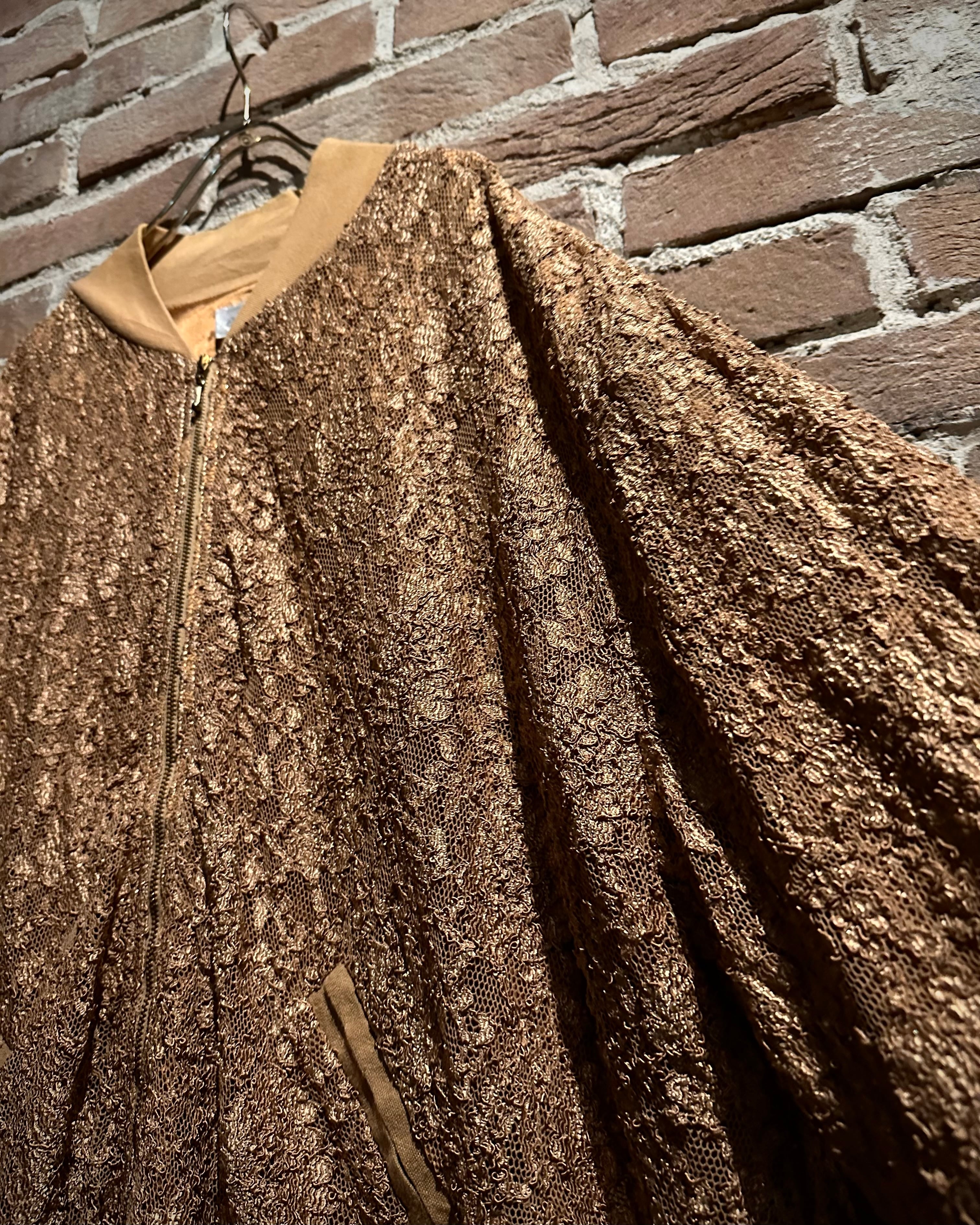 肌触りの良いゴールドの生地をベースに、花柄を載せた繊細なレース地を重ねたブルゾンジャケット。
